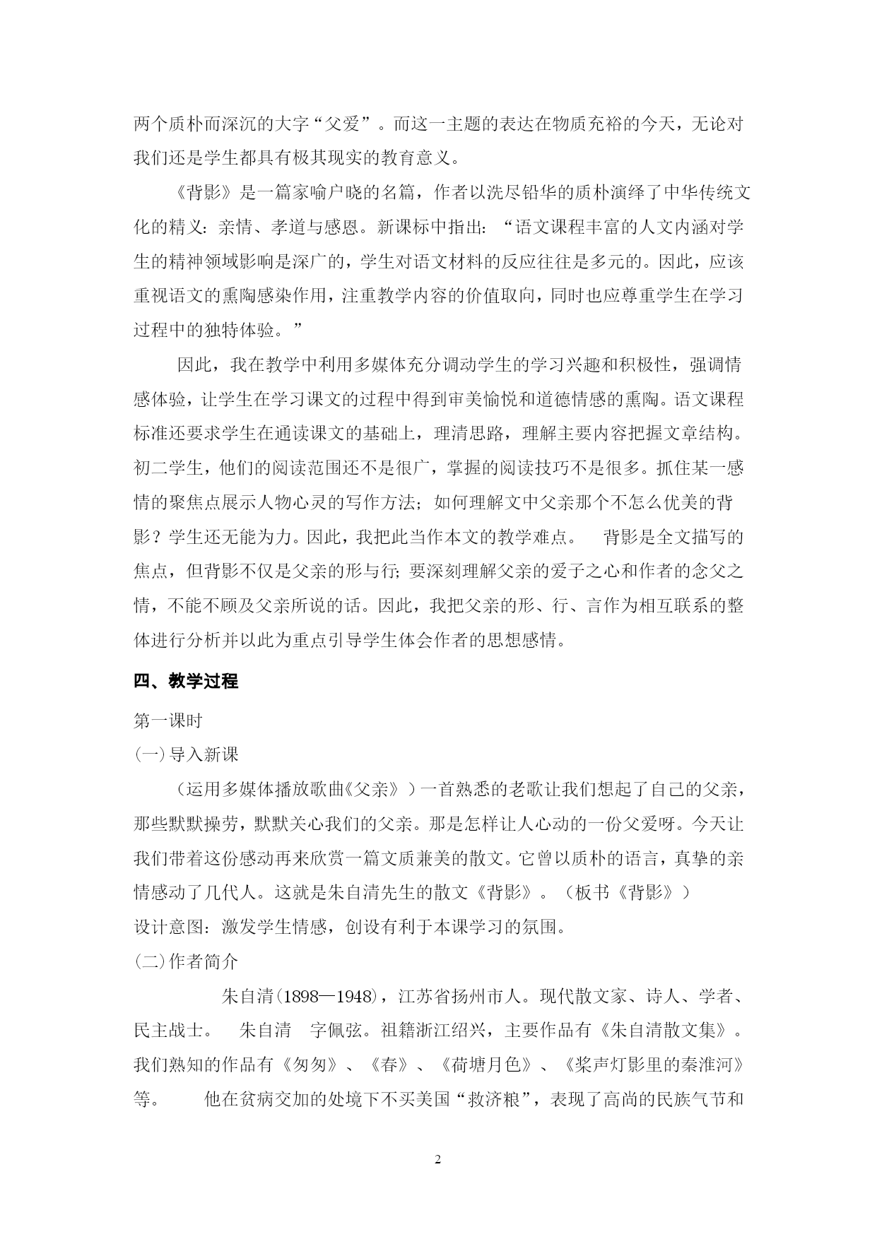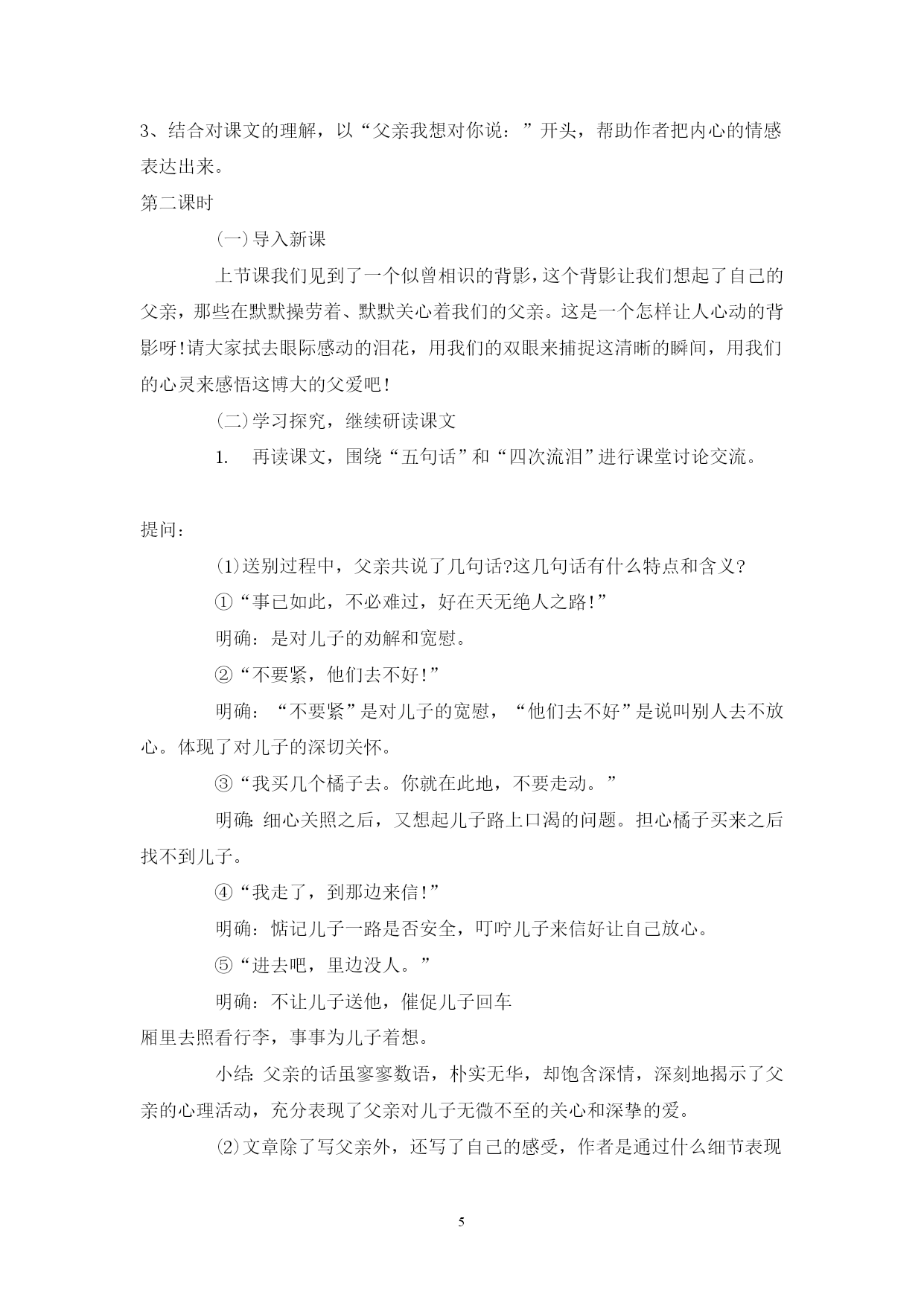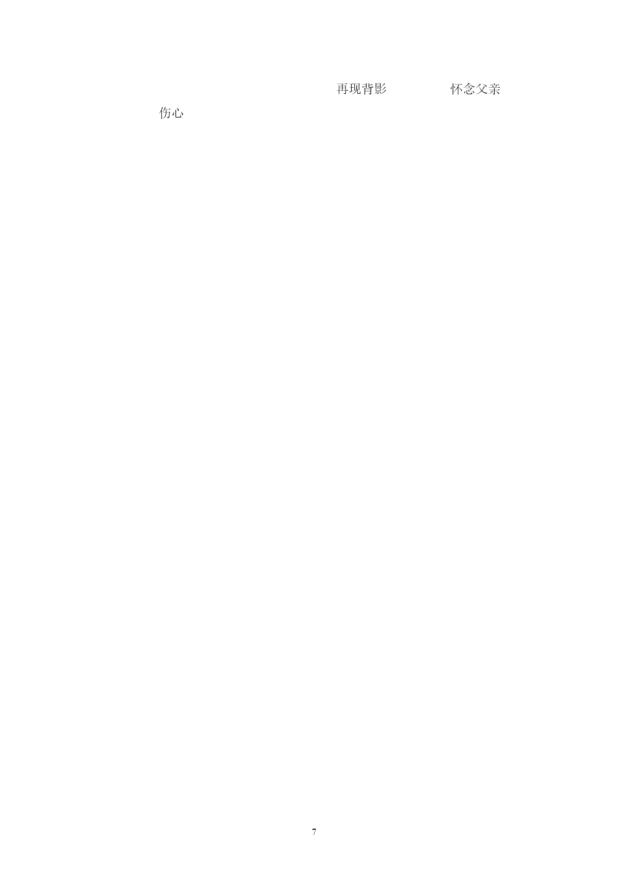 《背影》教学设计广安市前锋区虎城小学校张俊杰一、教学目标:知识目标:走近作者,认识生字、生词。抓住某一感情的聚焦点展示人物心灵的写作方法;散文的特点及散文的选材。能力目标:学习在平实的叙述、抒情中蕴藏着的极为精巧的构思;关键语句含义的理解。情感目标:,认真体会文中所表现的父子之间的深厚的感情,理解语文与家庭生活的关系。二、教学重点和难点:教学重点:背影是全文描写的焦点,但背影不仅是父亲的形与行;要深刻理解父亲的爱子之心和作者的念父之情,不能不顾及父亲所说的话。因此,我把父亲的形、行、言作为相互联系的整体进行分析并以此为重点引导学生体会作者的思想感情。教学难点:语文课程标准还要求学生在通读课文的基础上,理清思路,理解主要内容把握文章结构。初二学生,他们的阅读范围还不是很广,掌握的阅读技巧不是很多。抓住某一感情的聚焦点展示人物心灵的写作方法;如何理解文中父亲那个不怎么优美的背影?学生还无能为力。因此,我把此当作本文的教学难点。三、教学思路:这是朱自清先生写于1925年10月的一篇回忆性记叙散文。文章深刻的表现了父亲的爱子之心和作者的念父之情。背影是全文描写的焦点,也是叙事的线索。作者除了对背影作了笔酣墨畅的细致描写外,还以背影为中心,安排了许多精彩的衬托和铺垫。《背影》无论记人、叙事、抒情都十分平实,语言淳朴自然,毫无矫揉造作之处,却打动了几代读者的心。在一个平凡、朴素的背影上刻下了两个质朴而深沉的大字“父爱”。而这一主题的表达在物质充裕的今天,无论对我们还是学生都具有极其现实的教育意义。《背影》是一篇家喻户晓的名篇,作者以洗尽铅华的质朴演绎了中华传统文化的精义:亲情、孝道与感恩。新课标中指出:“语文课程丰富的人文内涵对学生的精神领域影响是深广的,学生对语文材料的反应往往是多元的。因此,应该重视语文的熏陶感染作用,注重教学内容的价值取向,同时也应尊重学生在学习过程中的独特体验。”因此,我在教学中利用多媒体充分调动学生的学习兴趣和积极性,强调情感体验,让学生在学习课文的过程中得到审美愉悦和道德情感的熏陶。语文课程标准还要求学生在通读课文的基础上,理清思路,理解主要内容把握文章结构。初二学生,他们的阅读范围还不是很广,掌握的阅读技巧不是很多。抓住某一感情的聚焦点展示人物心灵的写作方法;如何理解文中父亲那个不怎么优美的背影?学生还无能为力。因此,我把此当作本文的教学难点。背影是全文描写的焦点,但背影不仅是父亲的形与行;要深刻理解父亲的爱子之心和作者的念父之情,不能不顾及父亲所说的话。因此,我把父亲的形、行、言作为相互联系的整体进行分析并以此为重点引导学生体会作者的思想感情。四、教学过程第一课时(一)导入新课(运用多媒体播放歌曲《父亲》)一首熟悉的老歌让我们想起了自己的父亲,那些默默操劳,默默关心我们的父亲。那是怎样让人心动的一份父爱呀。今天让我们带着这份感动再来欣赏一篇文质兼美的散文。它曾以质朴的语言,真挚的亲情感动了几代人。这就是朱自清先生的散文《背影》。(板书《背影》)设计意图:激发学生情感,创设有利于本课学习的氛围。(二)作者简介朱自清(1898—1948),江苏省扬州市人。现代散文家、诗人、学者、民主战士。朱自清字佩弦。祖籍浙江绍兴,主要作品有《朱自清散文集》。我们熟知的作品有《匆匆》、《春》、《荷塘月色》、《桨声灯影里的秦淮河》等。他在贫病交加的处境下不买美国“救济粮”,表现了高尚的民族气节和爱国主义精神,为国人所尊敬。朱自清是毛泽东同志称颂的“表现我们民族的英雄气概的爱国知识分子,1928年出版了第一本散文集《背影》,成了近代文坛上著名的散文作家。(三)教师范读课文1、听录音朗读(选一段节奏舒缓情调感伤的音乐)要求:听准语音语调,扫清文字障碍。2、检查课前预习情况给加点的字注音(出示课件)奔丧差使狼藉簌簌妥贴踌躇迂蹒跚箸拭琐屑晶莹3、配乐朗读可以分为四个部分:1—3段、4—5段,6段,7段分别找不同的小组读。领会关键词句,体会感情。(四)整体感知,初步研读课文1.全体学生自由朗读课文,找出印象最深或者最感人的句子和场面,用自己的话描述出来。(四人一小组自由发言,说明被感动的理由,并互相描述,然后请小组代表发言。)例(1)父亲送别儿子时说的几句话。(2)父亲为儿子买橘子时的场面。(3)父亲信中的话。(4)我眼中看到的父亲的背影。请学生将这几处标出,并齐读,体会父子深情。2.讨论:通过写车站送别,表现了父子间什么样的感情?明确:本文通过写车站送别,表现了父亲对儿子深挚的爱,抒发了作者对父亲深切的思念。(这一道让学生自由发挥。只要说出中心内容即可,不必拘泥于标准答案。目的在于培养整体感知和概括能力)教学随笔:3.理解第二、三段在全文中的作用。提问:本文是通过写“我”与父亲在车站的离别来表现父亲的爱子之情的,为什么