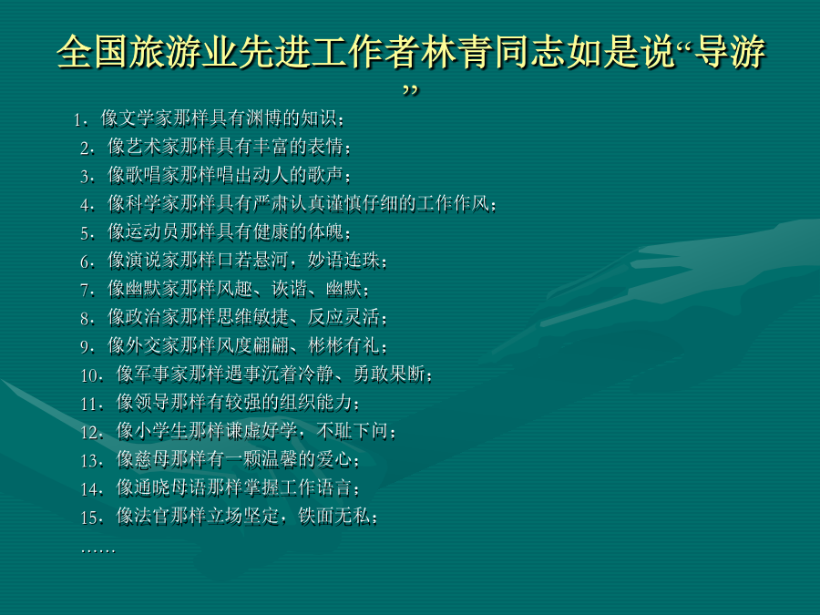 导游基础知识全国旅游业先进工作者林青同志如是说“导游”加入旅游吃苦受累摸爬滚打终日疲惫计调信息必须到位一日三餐时间不对屁大点事反复开会逢年过节值班应对一时一刻不敢离位各种报表让人崩溃陪同客户回回喝醉客户总嫌价格太贵临管执法还要索贿无暇顾家愧对长辈回到家里内疚惧内工资不高还要交税囊中羞涩见人惭愧青春身体已经耗废人生年华如此狼狈哎旅游人真的太累1.游客:导游的德行:脖子上吊个小证、肩上挎个小包、手里举个小旗,小样!导游:游客的德行:头上顶个帽子、胸前别个牌子、手里拿个杯子,样子!2.游客:导游就是“导购”,骗买东西收回扣!导游:游客就是“油客”,克死商家也没辙!3.游客:导游讲解像打抢,叽哩呱啦说的啥呀?!导游:游客牢骚像放炮,噼里啪啦有完没完?!4.游客:给的是牛奶的价钱,得到的是吃草般的服务,晕!导游:给的是牛奶般的服务,得到的是对待食草动物的评价,惨!5.游客:导游服务太一般,上帝看了也心寒!导游:天哪,上帝吃着俺看着,上帝坐着俺站着,上帝听着俺唱着,上帝睡了俺还忙乎着,上帝没醒俺就早早起来张罗着,没天理啦!6.游客:说的比唱的好听,油嘴!导游:坐着说话不腰疼,油条!7.游客:做人要厚道,别乱来!导游:说话要负责,别瞎说!第一章旅游和旅游业第二章中国旅游地理第三章中国历史文化常识第四章中国的宗教文化第五章中国的饮食文化第六章中国的风物特产第七章中国的古代建与园林筑与园林第八章中国的世界遗产及自然保护区、风景名胜区第一节旅游的概念、特征及分类第二节旅游的基本要素第三节旅游市场第四节旅游组织学习目标☆了解旅游的基本概念和旅游活动的起源与发展;☆认识旅游活动的类型;☆掌握旅游的基本要素;☆掌握重要的国际、国内旅游组织。一、旅游的概念世界旅游组织于1991年6月25日在加拿大召开了“旅游统计国际大会”,对旅游的概念进行了重新的界定:旅游是指:人们为了休闲、商务和其它目的,离开他们惯常的环境,到某些地方以及在某些地方停留,但连续不超过一年的活动。二、旅游的起源和发展(一)世界旅游的起源与发展(二)中国旅游的起源与发展(一)世界旅游的起源与发展1.古代旅行阶段(19世纪40年代以前)2.近代旅游阶段(1840年至第二次世界大战前)3.现代旅游阶段(第二次世界大战后)近代考古发现,某些相隔数万公里的两地出土的史前人类遗骨化石存在很多相同的遗传特征,为什么?原始人类在交通条件如此恶劣的情况下为什么仍然要不断的迁徙?[提问3]这种不断的为生存而奔波的迁徙能不能算旅游活动?为什么?迁徙、旅行、旅游三者的区别迁徙:是人们出于谋生的目的,或者出于自然原因(如气候、天灾等对生存环境的破坏),或者出于人为原因(如战争)的威胁而被迫离开定居地,在新的定居点定居下来,不再回到原来的定居点。旅行:离开常住地在外地短时间停留,其外出的目的可以是多种多样的。它是为完成某个动机的一般空间流动过程。旅游:是有动机内涵的,外出的目的是为了满足精神文化需求,是旅行和游览的统一体。有旅游必定有旅行,有旅行不一定有旅游。1.古代旅行和旅游人类最早的、真正意义上的旅行活动产生于奴隶社会.主要是商人开创了旅行的通道.但绝大部分活动不属于消遣和度假活动,而是出于易货经商的需要而自发开展的一种经济活动.在西方奴隶制社会中,一些富裕者远程旅行到埃及金字塔去刻他们的名字.西方封建社会,欧洲城市开始兴起,西方封建主对财富的追求,促进远航探险热潮。欧州宗教朝圣活动、温泉旅行、以教育或求知为目的的旅行活动.2.近代旅游阶段英国人托马斯·库克被称为“世界旅游业之父”。1841年7月5日,托马斯·库克利用包租火车的方式,组织540人从莱斯特到洛勃罗赫参加禁酒大会。1845年,托马斯·库克正式创建了世界上第一个旅行社———托马斯·库克旅行社,它被大多数学者认为是近代旅游业诞生的标志。1865年托马斯·库克相继在瑞士、美洲、非洲、亚洲设立分公司,成为当时世界上最大的一家旅游企业。1872年,该公司成功地组织了一次历时222天的9人环球旅游。3.现代旅游现代旅游是指第二次世界大战结束后,特别是20世纪60年代以来,日益普及于世界各地的社会化旅游活动。当今,现代旅游活动正在成为人类重要的社会、经济和文化现象。据世界旅游组织预测,到2020年,全球接待国际旅游者将达到16亿人次,国际旅游收入将达20000亿美元。(二)中国旅游的起源与发展1.中国古代的旅行和旅游2.中国近代旅游3.中国现代旅游1.中国古代旅行和旅游旅游类型:商人旅行、帝王巡游、官吏宦游、士人漫游、僧人云游、文史考察、科学考察等中国是世界旅行活动产生最早的国家之一。我国第一部诗歌总集《诗经》、古籍《山海经》和《史记》中