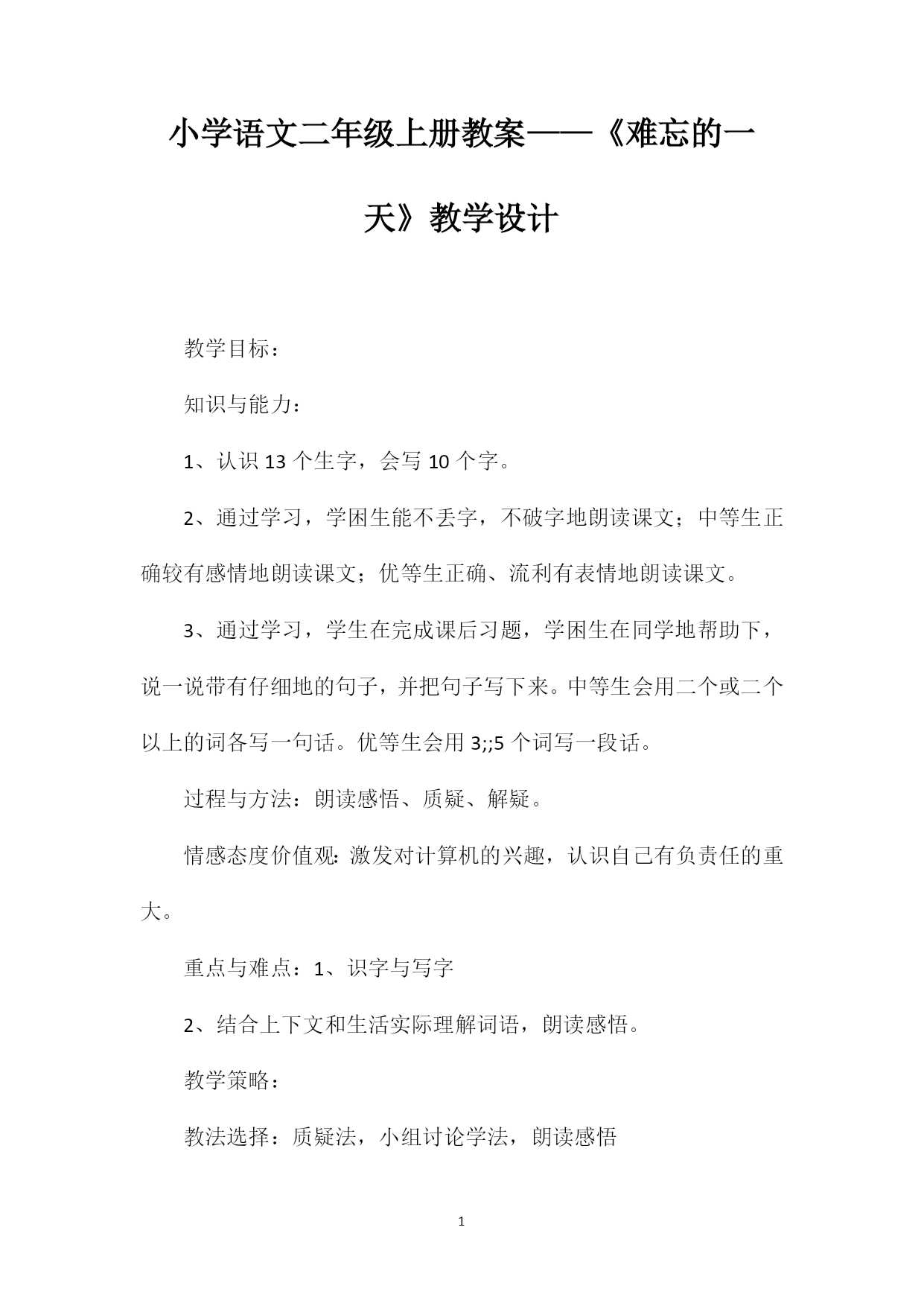 小学语文二年级上册教案——《难忘的一天》教学设计