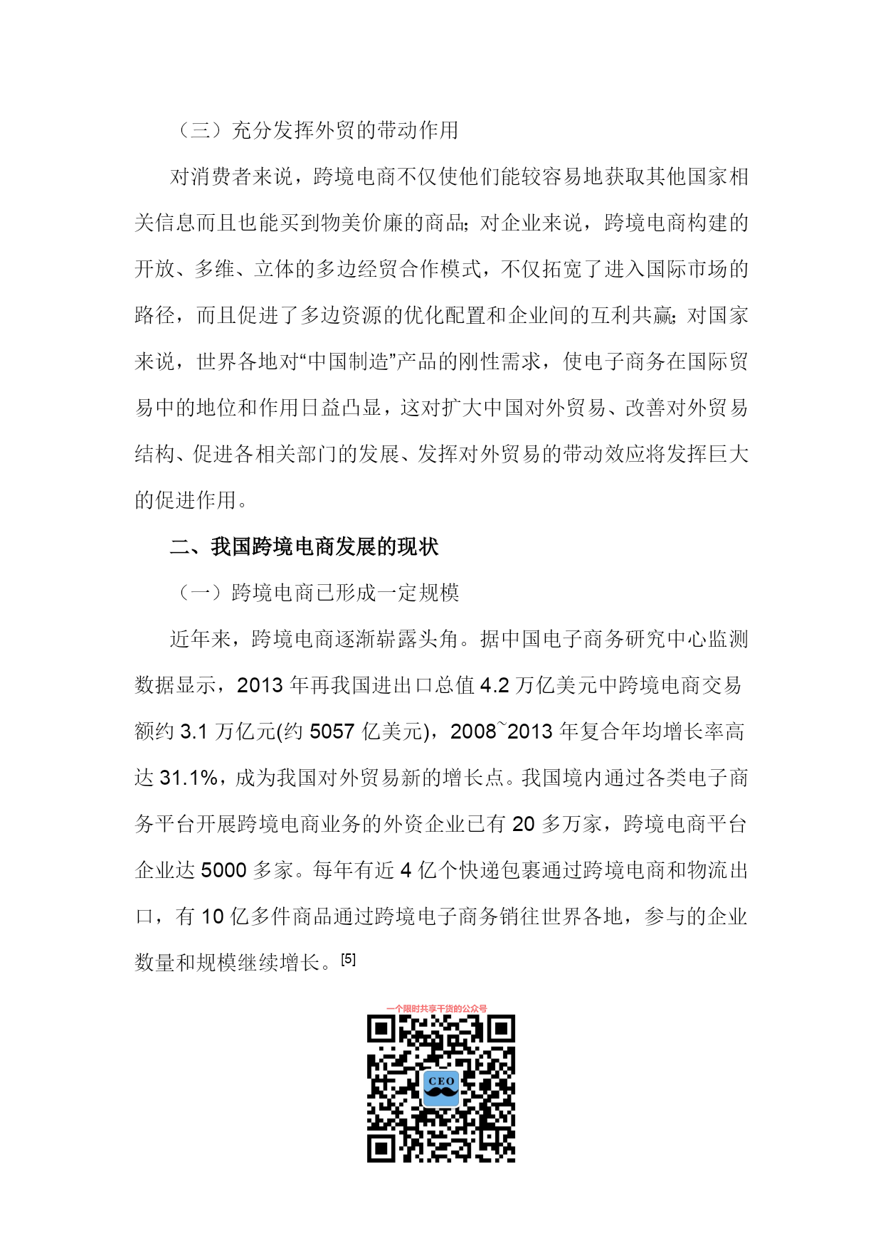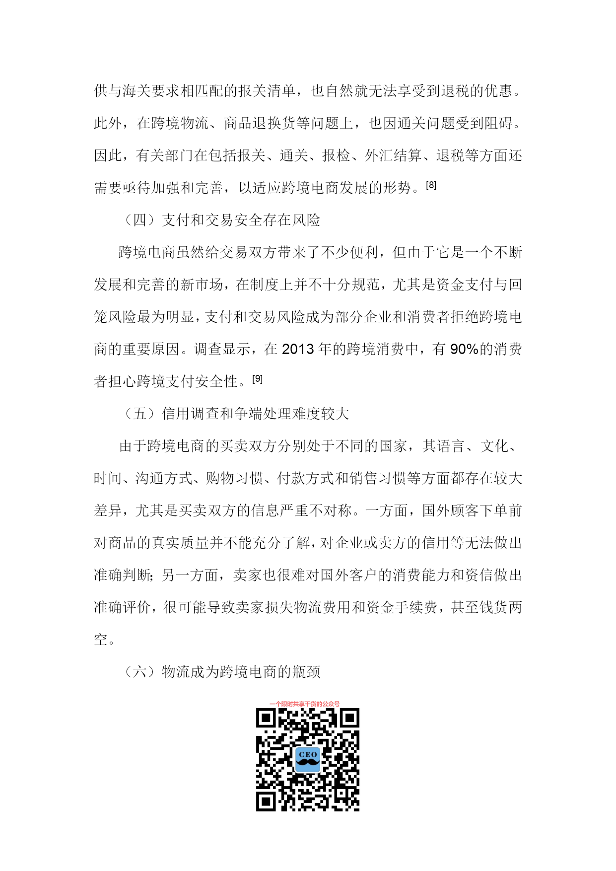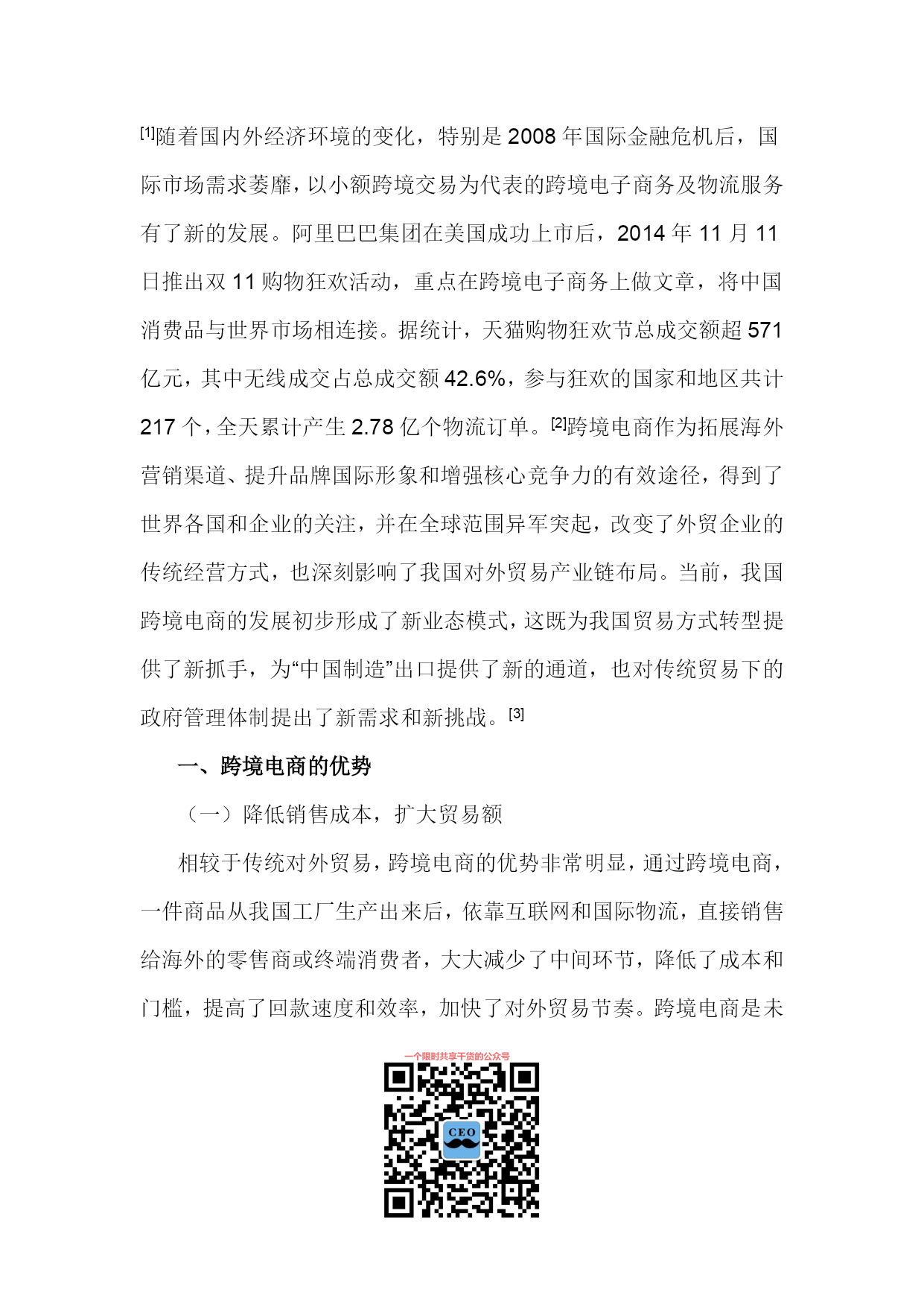 PAGE将跨境电商建成“中国制造”出口的新通道徐松,张艳艳(安徽财经大学国际经济贸易学院,安徽蚌埠233030)摘要:随着电子信息技术的不断发展和经济全球化的深入,跨境电商已成为中国企业拓展海外市场、提升品牌国际形象和增强核心竞争力的重要渠道。跨境电商改变了外贸企业的传统经营方式,影响了中国对外贸易产业链布局,在我国已初步形成了新的业态模式。无论其成长性、市场潜力和影响力,中国跨境电商服务已处于全球领先位置。但我国跨境电商发展还存在质量、产权、通关、支付、信用、物流和政策等瓶颈,应采取措施促进跨境电商发展,为我国外贸企业占领着未来竞争制高点、最终取得成功提供支持。关键词:跨境电商;跨境物流;中国制造;跨境通关;大数据中图分类号:文献标识码:A文章编号:1007-7685(2015)02-0000-00跨境电商(Cross-borderelectroniccommerce)指分属不同关境的交易双方,通过跨境电子商务平台达成交易、进行支付和结算,并通过跨境物流将交易的商品送达买方、完成跨境交易的一种国际贸易活动,是把传统国际贸易加以网络化、电子化的新型国际贸易方式。参考文献:[1]孟祥铭,汤倩慧.中国跨境贸易电子商务发展现状与对策分析[J].沈阳工业大学学报,2014(2):120-121.随着国内外经济环境的变化,特别是2008年国际金融危机后,国际市场需求萎靡,以小额跨境交易为代表的跨境电子商务及物流服务有了新的发展。阿里巴巴集团在美国成功上市后,2014年11月11日推出双11购物狂欢活动,重点在跨境电子商务上做文章,将中国消费品与世界市场相连接。据统计,天猫购物狂欢节总成交额超571亿元,其中无线成交占总成交额42.6%,参与狂欢的国家和地区共计217个,全天累计产生2.78亿个物流订单。[2]荆林波,梁春晓:中国电子商务服务业发展报告No.2[M].社会科学文献出版社,2013.20-25.跨境电商作为拓展海外营销渠道、提升品牌国际形象和增强核心竞争力的有效途径,得到了世界各国和企业的关注,并在全球范围异军突起,改变了外贸企业的传统经营方式,也深刻影响了我国对外贸易产业链布局。当前,我国跨境电商的发展初步形成了新业态模式,这既为我国贸易方式转型提供了新抓手,为“中国制造”出口提供了新的通道,也对传统贸易下的政府管理体制提出了新需求和新挑战。[3]鄂立彬.国际贸易新方式:跨境电子商务的最新研究[J].东北财经大学学报,2014(2).一、跨境电商的优势(一)降低销售成本,扩大贸易额相较于传统对外贸易,跨境电商的优势非常明显,通过跨境电商,一件商品从我国工厂生产出来后,依靠互联网和国际物流,直接销售给海外的零售商或终端消费者,大大减少了中间环节,降低了成本和门槛,提高了回款速度和效率,加快了对外贸易节奏。跨境电商是未来电商经济的发展重点,通过对全社会信息流、资金流、物流及劳动就业的巨大影响,实现人力、技术、生产与资本等社会资源的有效整合和优化配置,充分挖掘国际市场需求,带动企业出口的同时帮助企业获取更多的价值增值。众多生产厂家通过跨境电商将产品销往世界各地,不仅可实现销量的提升,很多品牌还可逐渐获得海外消费者认可。(二)提升产品附加值跨境电商可把我国最优质的商品通过互联网平台直销全球,促进了我国自主品牌的发展,提升了我国产品的附加值。我国因制造能力在全球具有较强的竞争优势而享有“世界工厂”美誉,但在发达国家产业升级和产业转移过程中,我国大量企业变为替国际品牌企业代工生产的代工(OEM)制造商,即使拥有成熟的加工制造能力,但在国际知名品牌光环的遮掩下,无法拥有自己的品牌,也很少为消费者所知。而跨境电商使这些代工企业有机会走上前台,直接面对消费者,并做大做强自有品牌,为“中国制造”掘金全球注入新动力。所以,跨境电商不仅可发挥中小企业的优势,还可帮助它们重塑国际产业链,促进其外贸出口方式转变,增强其国际竞争力。在外贸“新常态”下,跨境电商将助推“中国制造”扬帆海外,促进“中国制造”向“中国创造”、“中国想象”和“中国营销”转变。[4]程景伟.跨境电商成外贸新宠再造“中国制造”优势[N].中国新闻网,2014-10-27.(三)充分发挥外贸的带动作用对消费者来说,跨境电商不仅使他们能较容易地获取其他国家相关信息而且也能买到物美价廉的商品;对企业来说,跨境电商构建的开放、多维、立体的多边经贸合作模式,不仅拓宽了进入国际市场的路径,而且促进了多边资源的优化配置和企业间的互利共赢;对国家来说,世界各地对“中国制造”产品的刚性需求,使电子商务在国际贸易中的地位和作用日益凸显,这对扩大中国对外贸易、改善对外贸易结构、促进各相关部门的发展、发挥对外贸易的带动效应将发挥巨大的促进作用。二、我