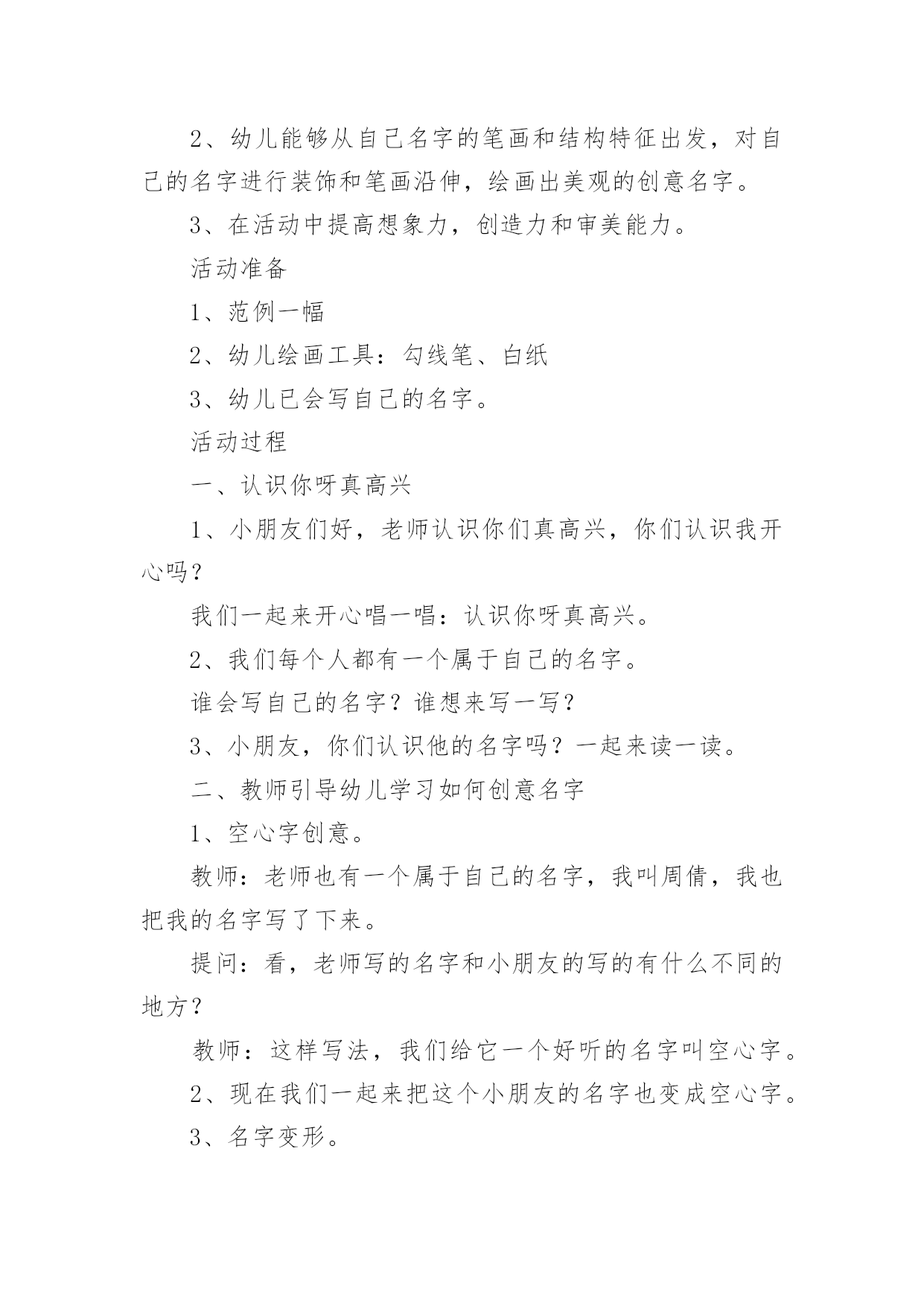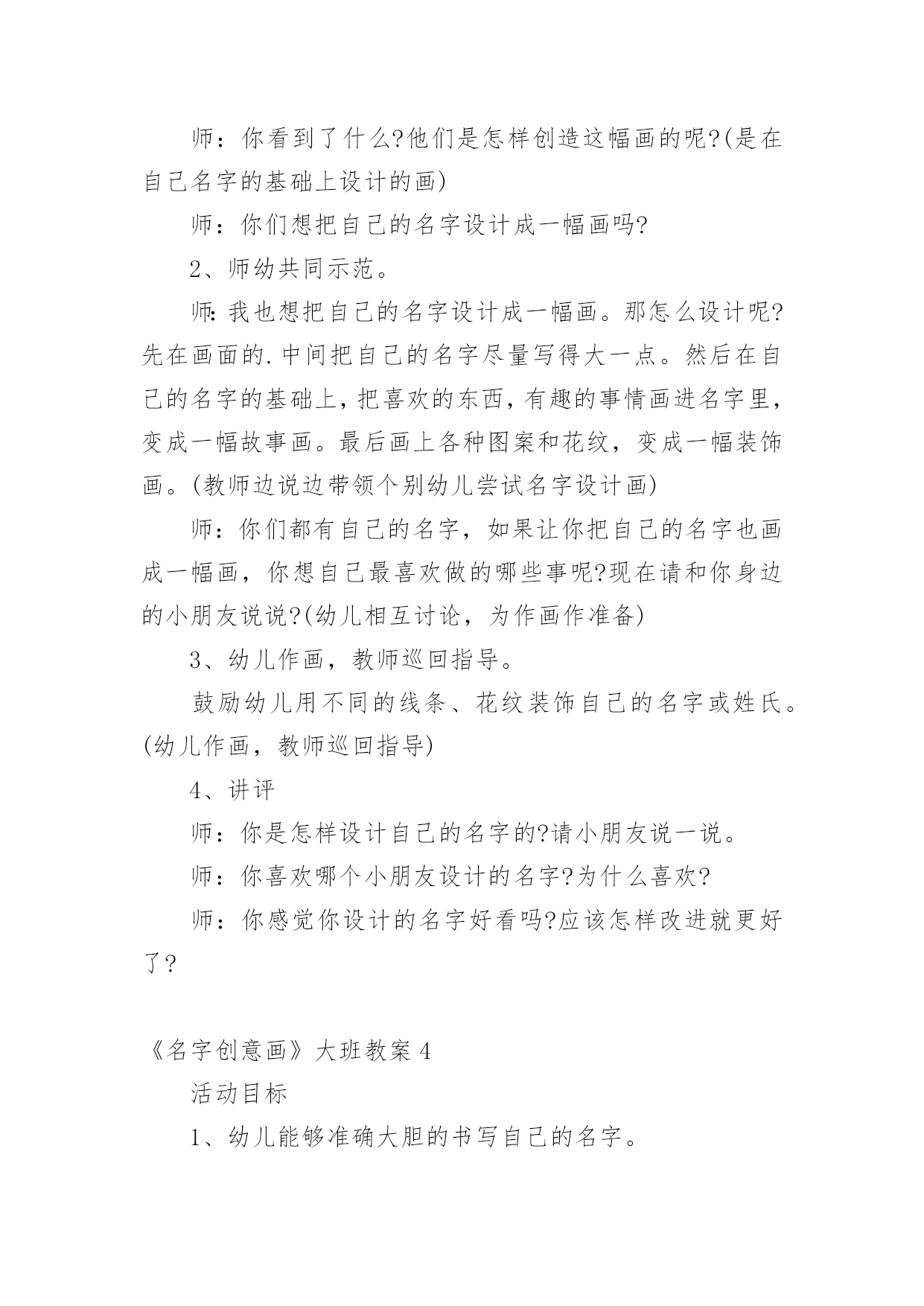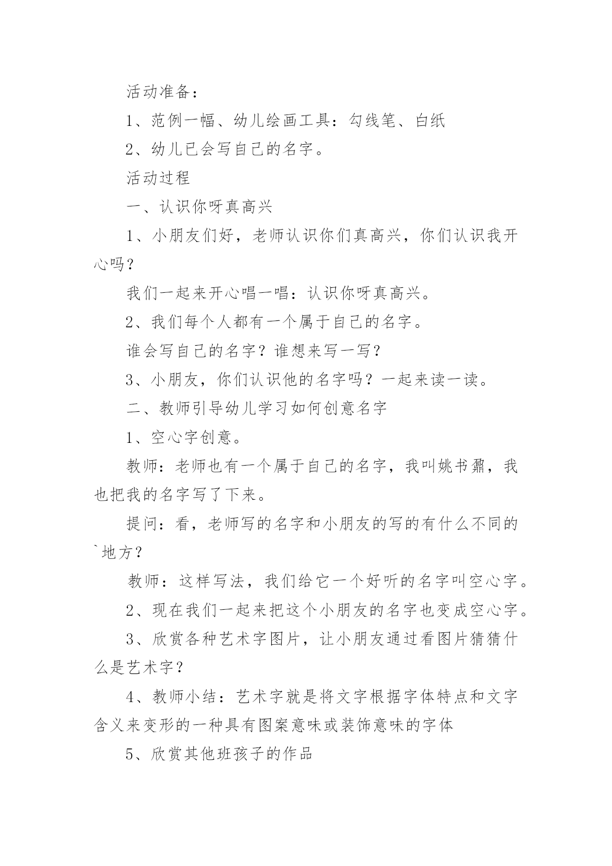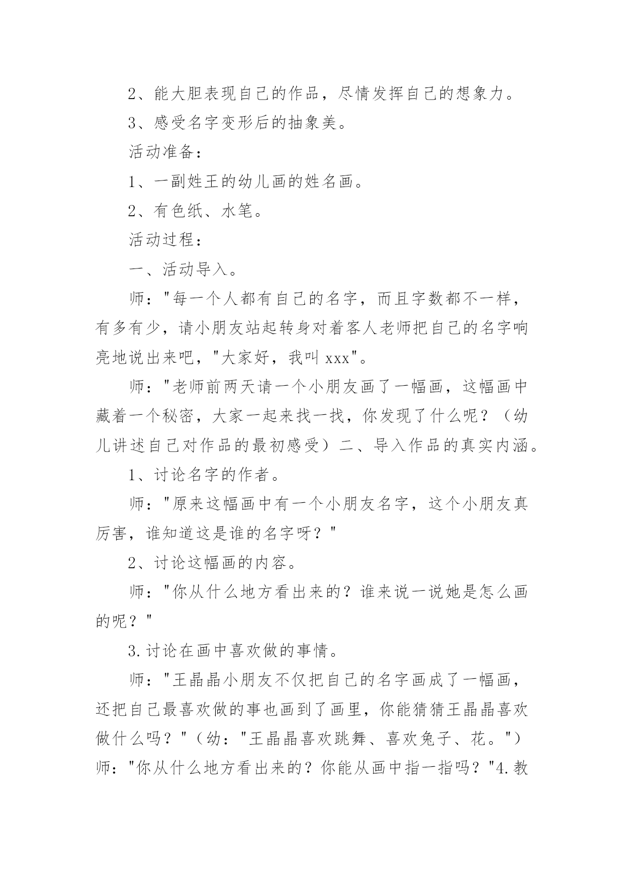 《名字创意画》大班教案作为一名教师,时常会需要准备好教案,借助教案可以让教学工作更科学化。教案应该怎么写才好呢?以下是小编为大家收集的《名字创意画》大班教案,欢迎大家借鉴与参考,希望对大家有所帮助。《名字创意画》大班教案1活动目标:1、体验装饰名字的乐趣,能大胆表现。2、尝试用图形、线条、颜色等对自己的名字进行装饰。活动准备:1、幼儿能够书写自己的名字;2、艺术家的装饰“字”几张,教师设计的名字画几张,图片制成电子白板课件;3、幼儿每人一份操作材料:绘画纸、勾线笔、油画棒、水彩笔等。活动过程:一、观察欣赏、激发兴趣。1、出示多幅汉字组成的装饰画,引出主题,激发幼儿兴趣。师:老师今天给小朋友带来了一些艺术家们美丽的图画,这些画有一些特别,请小朋友们仔细看一看,画里面都有什么?每幅画里面还藏着一个小秘密,你们能发现吗?教师根据幼儿回答,简单小结:原来每幅画里面都藏着一个字,这些艺术家们把我们的汉字变成了一幅美丽的图画呀!2、出示教师的名字装饰画,引导幼儿观察,激发幼儿想象和创作的欲望。师:老师也模仿这些艺术家们画了一幅美丽的图画,请你们猜猜我画的是什么内容?根据幼儿回答进行小结:原来是老师的名字,我把我的名字变成一幅漂亮的画了,这就是漂亮的名字画。二、介绍自己名字的意义师:谁愿意来向大家介绍一下自己的名字呢?知道爸爸妈妈为什么给你起这个名字吗?小结:我们每个人都有自己的名字,名字伴随着我们的一生,从一生下来,大人们就花了很大的心思为我们取一个好听的名字,希望小朋友以后有个幸福、快乐的生活。所以名字包含着大人们对小朋友的一种祝福、希望和深深的爱。三、拓展思维、激发创作欲望。1、出示班里一位小朋友的名字,你们能认出是哪个小朋友的名字吗?这位小朋友的名字画和我们平时写的名字有什么不同呢?”(幼儿自由回答)小结:(1)颜色丰富了,色彩的深浅搭配很美;(2)通过想象,字体里的点、横、竖、撇可以变换成其它物体或形状;(3)字体里添加了一些点、线条、图形的装饰。(4)装饰后的文字仍保留原来字体的基本结构。2、引导想象:小朋友,你想怎样来装饰自己的名字呢?请一个幼儿把自己的名字写出来,我们帮助他一起开动脑筋,用一些好看的图形来装饰他的名字吧!(在电子白板上演示)三、建立自信、激发创作。1、师:小朋友都学会写自己的名字了,今天我们也来开打扮自己的名字,让自己的名字变成一幅美丽的.图画吧。你如果已经有想法的可以把名字中的每个字都进行装饰,如果你觉得自己名字有些复杂,也可以选择你名字中最喜欢的那一个字进行装饰。2、幼儿创作,教师巡回指导。老师在巡回的过程中,给予恰当的建议,并不断地鼓励学生,“你的想法很好”,“我喜欢你设计的颜色”,“衬底很有创意”、“颜色搭配再鲜艳些会更好”。还不时地将有特色的作品介绍展示给大家,通过互相的交流,不断激发幼儿多方面地考虑设计方法。对个别不知怎么进行装饰的幼儿,教师可以用简单地提问来帮助他,如:你喜欢什么?你觉得可以把它画在名字的哪个地方?你觉得名字可以藏在什么地方?四、评价幼儿作品1、先画完的幼儿将名字画给同伴看一看,让他们猜一猜你的名字。2、把幼儿的名字画都挂起来展示,你们的画真漂亮,可是我想如果画上能闪闪发光就更漂亮了。老师给你们一人一颗小星星,请你把它贴到自己最喜欢的一幅名字画上。比比谁画上的小星星最多,名字最闪亮。3、通过幼儿最后的评价我们来找一找得到小星星最多的幼儿作品。师:谁来讲一讲自己为什么要把小星星送给这个小朋友。生:(说出自己最喜欢的部分)师:老师还发现有的小朋友的画上的小星星较少,谁愿意来为这个小朋友出出主意,让他的名字经过修改后也能受到别人的喜爱。生:(提出一些建议)活动延伸:把幼儿作品布置成主题墙“名字里的故事”,并在每幅作品旁边附上幼儿对作品的叙述。大班名字创意画教案,每个人的名字就是每个人的代号,我们每个人都有着属于自己的名字,如果让幼儿用自己的名字作画既可以让幼儿对自己名字的写法更加的熟悉也能增加幼儿对于绘画的兴趣。《名字创意画》大班教案2活动目标:1、幼儿能够准确大胆的书写自己的名字。2、幼儿能够从自己名字的笔画和结构特征出发,对自己的名字进行装饰和笔画沿伸,绘画出美观的创意名字。3、在活动中提高想象力,创造力和审美能力。活动准备:1、范例一幅、幼儿绘画工具:勾线笔、白纸2、幼儿已会写自己的名字。活动过程一、认识你呀真高兴1、小朋友们好,老师认识你们真高兴,你们认识我开心吗?我们一起来开心唱一唱:认识你呀真高兴。2、我们每个人都有一个属于自己的名字。谁会写自己的名字?谁想来写一写?3、小朋友,你们认识他的名字吗?一起来读一读。二、教师引导幼儿学习如何创意名字1、空心字创意。教师:老师也有一个属于自己的名字,我叫姚书鼐,我也把我的名字写了下来。提问:看,老师写的名字和小朋友的写的有什么