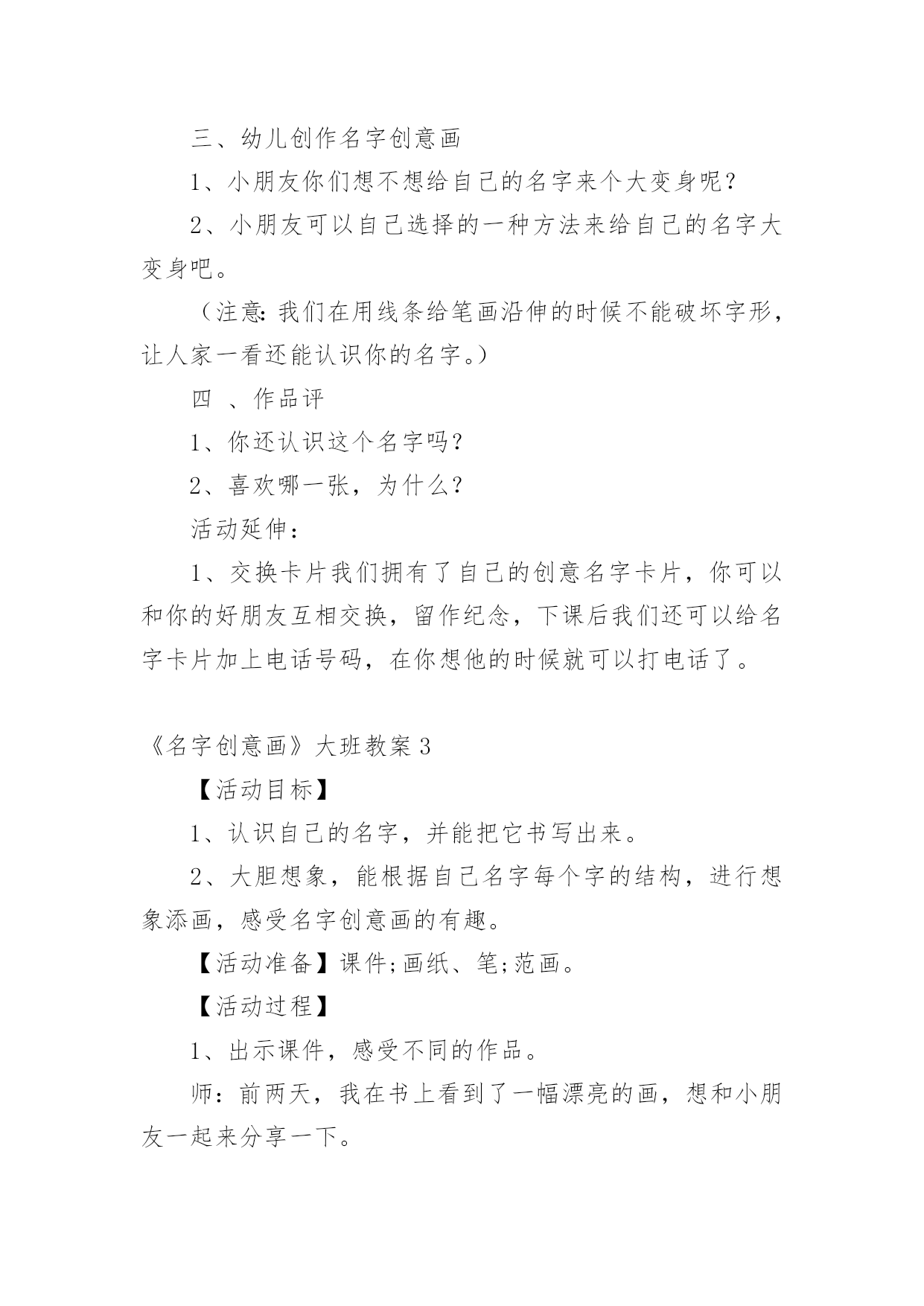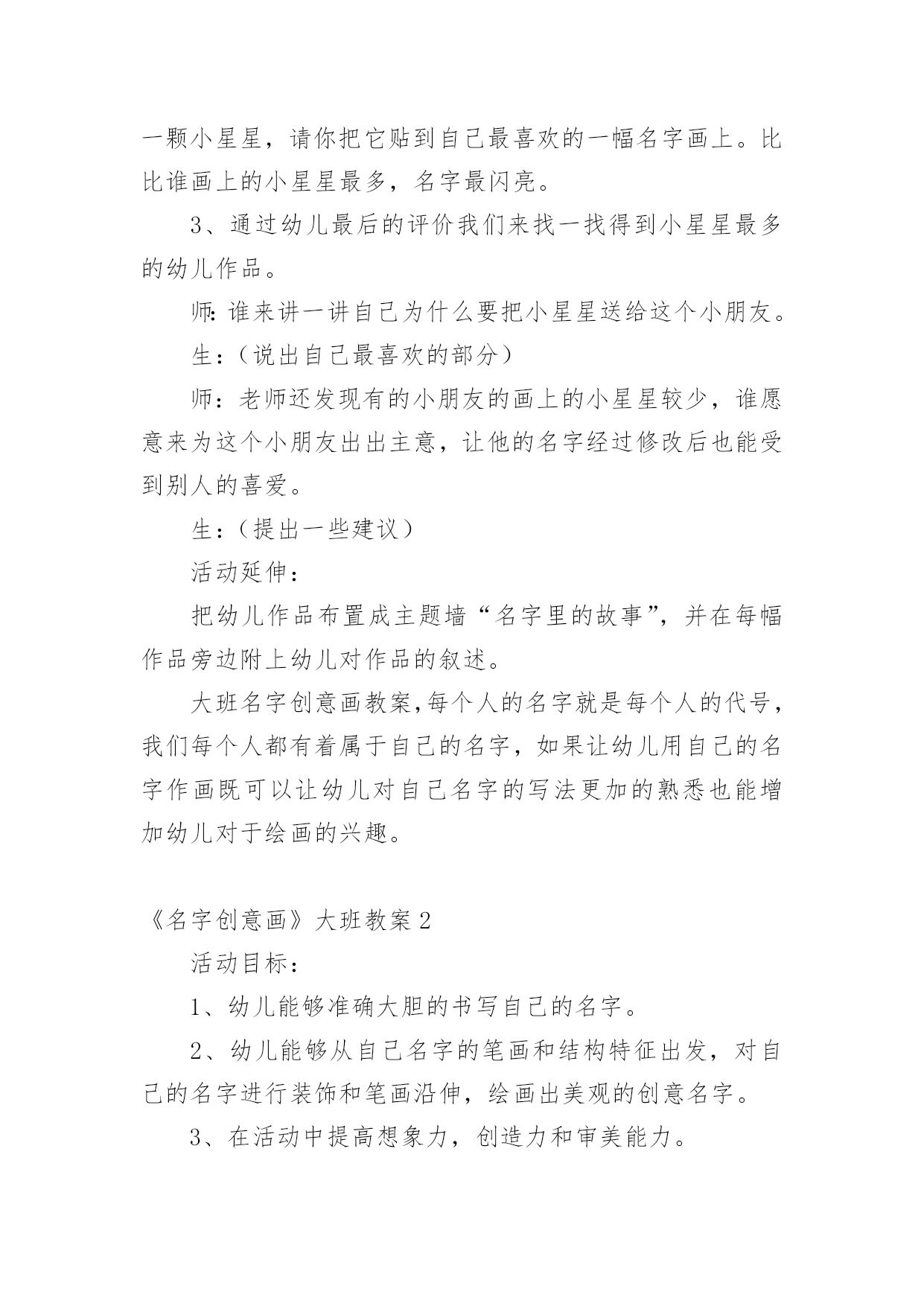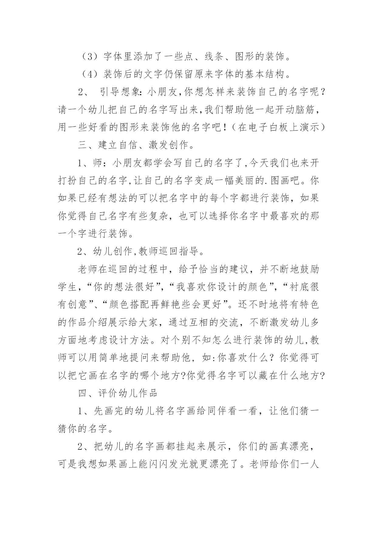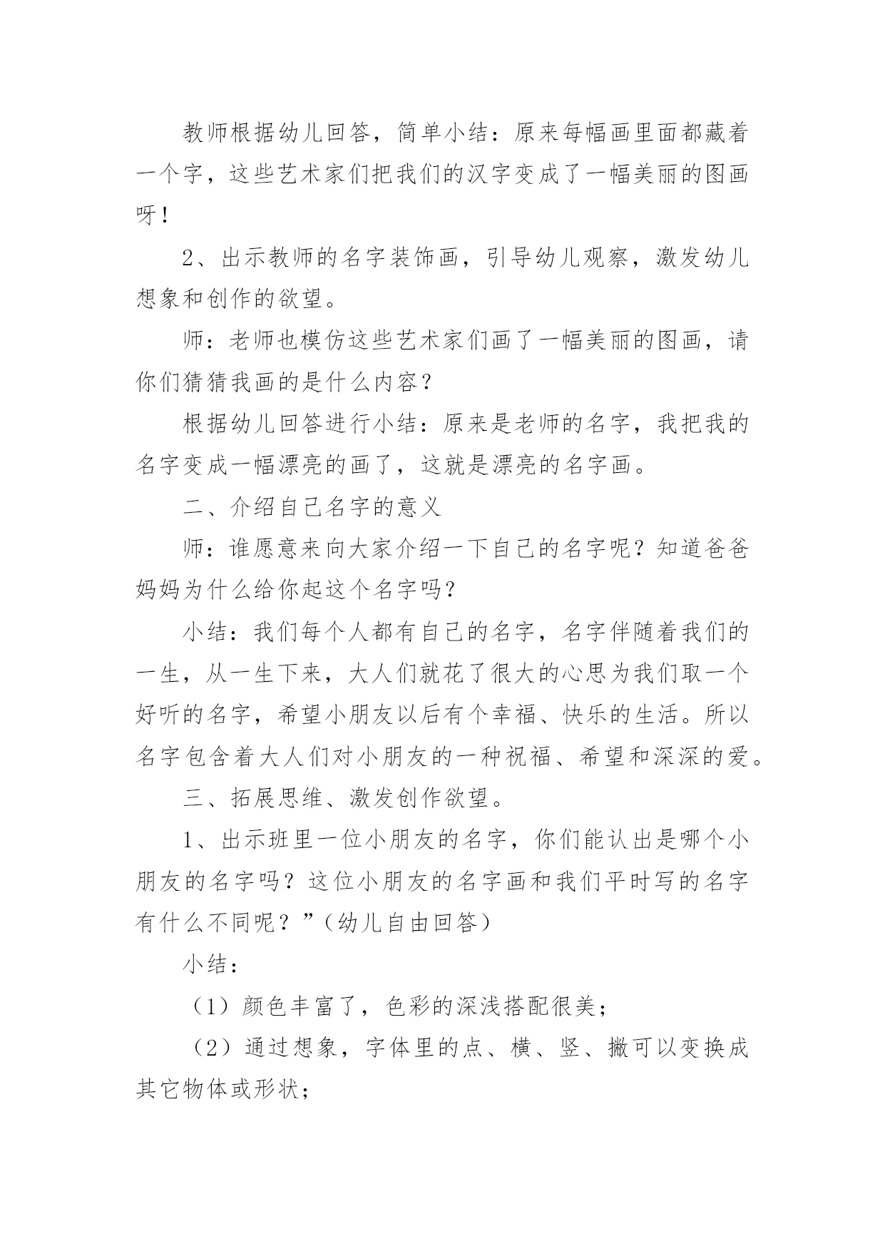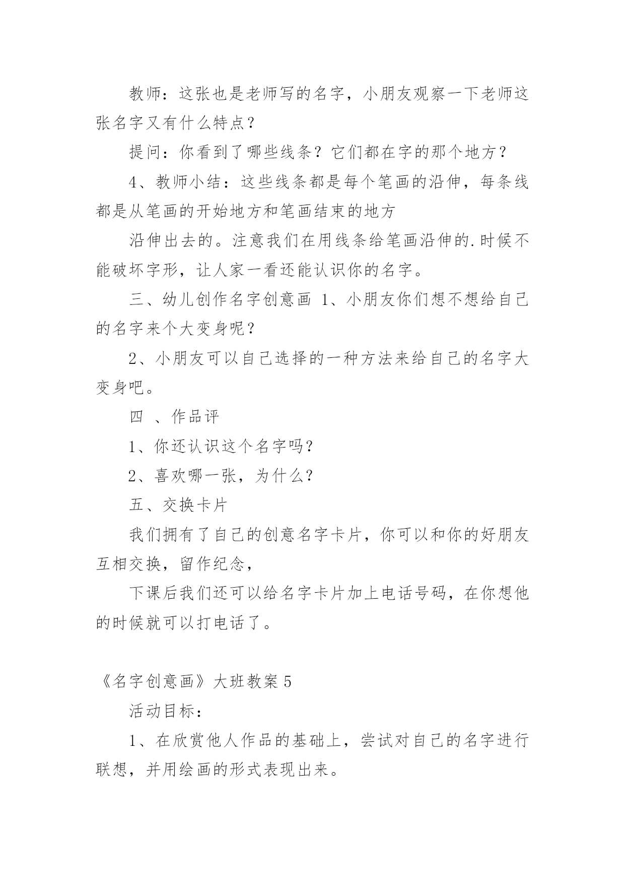 《名字创意画》大班教案作为一名教师,时常会需要准备好教案,借助教案可以让教学工作更科学化。教案应该怎么写才好呢?以下是小编为大家收集的《名字创意画》大班教案,欢迎大家借鉴与参考,希望对大家有所帮助。《名字创意画》大班教案1活动目标:1、体验装饰名字的乐趣,能大胆表现。2、尝试用图形、线条、颜色等对自己的名字进行装饰。活动准备:1、幼儿能够书写自己的名字;2、艺术家的装饰“字”几张,教师设计的名字画几张,图片制成电子白板课件;3、幼儿每人一份操作材料:绘画纸、勾线笔、油画棒、水彩笔等。活动过程:一、观察欣赏、激发兴趣。1、出示多幅汉字组成的装饰画,引出主题,激发幼儿兴趣。师:老师今天给小朋友带来了一些艺术家们美丽的图画,这些画有一些特别,请小朋友们仔细看一看,画里面都有什么?每幅画里面还藏着一个小秘密,你们能发现吗?教师根据幼儿回答,简单小结:原来每幅画里面都藏着一个字,这些艺术家们把我们的汉字变成了一幅美丽的图画呀!2、出示教师的名字装饰画,引导幼儿观察,激发幼儿想象和创作的欲望。师:老师也模仿这些艺术家们画了一幅美丽的图画,请你们猜猜我画的是什么内容?根据幼儿回答进行小结:原来是老师的名字,我把我的名字变成一幅漂亮的画了,这就是漂亮的名字画。二、介绍自己名字的意义师:谁愿意来向大家介绍一下自己的名字呢?知道爸爸妈妈为什么给你起这个名字吗?小结:我们每个人都有自己的名字,名字伴随着我们的一生,从一生下来,大人们就花了很大的心思为我们取一个好听的名字,希望小朋友以后有个幸福、快乐的生活。所以名字包含着大人们对小朋友的一种祝福、希望和深深的爱。三、拓展思维、激发创作欲望。1、出示班里一位小朋友的名字,你们能认出是哪个小朋友的名字吗?这位小朋友的名字画和我们平时写的名字有什么不同呢?”(幼儿自由回答)小结:(1)颜色丰富了,色彩的深浅搭配很美;(2)通过想象,字体里的点、横、竖、撇可以变换成其它物体或形状;(3)字体里添加了一些点、线条、图形的装饰。(4)装饰后的文字仍保留原来字体的基本结构。2、引导想象:小朋友,你想怎样来装饰自己的名字呢?请一个幼儿把自己的名字写出来,我们帮助他一起开动脑筋,用一些好看的图形来装饰他的名字吧!(在电子白板上演示)三、建立自信、激发创作。1、师:小朋友都学会写自己的名字了,今天我们也来开打扮自己的名字,让自己的名字变成一幅美丽的.图画吧。你如果已经有想法的可以把名字中的每个字都进行装饰,如果你觉得自己名字有些复杂,也可以选择你名字中最喜欢的那一个字进行装饰。2、幼儿创作,教师巡回指导。老师在巡回的过程中,给予恰当的建议,并不断地鼓励学生,“你的想法很好”,“我喜欢你设计的颜色”,“衬底很有创意”、“颜色搭配再鲜艳些会更好”。还不时地将有特色的作品介绍展示给大家,通过互相的交流,不断激发幼儿多方面地考虑设计方法。对个别不知怎么进行装饰的幼儿,教师可以用简单地提问来帮助他,如:你喜欢什么?你觉得可以把它画在名字的哪个地方?你觉得名字可以藏在什么地方?四、评价幼儿作品1、先画完的幼儿将名字画给同伴看一看,让他们猜一猜你的名字。2、把幼儿的名字画都挂起来展示,你们的画真漂亮,可是我想如果画上能闪闪发光就更漂亮了。老师给你们一人一颗小星星,请你把它贴到自己最喜欢的一幅名字画上。比比谁画上的小星星最多,名字最闪亮。3、通过幼儿最后的评价我们来找一找得到小星星最多的幼儿作品。师:谁来讲一讲自己为什么要把小星星送给这个小朋友。生:(说出自己最喜欢的部分)师:老师还发现有的小朋友的画上的小星星较少,谁愿意来为这个小朋友出出主意,让他的名字经过修改后也能受到别人的喜爱。生:(提出一些建议)活动延伸:把幼儿作品布置成主题墙“名字里的故事”,并在每幅作品旁边附上幼儿对作品的叙述。大班名字创意画教案,每个人的名字就是每个人的代号,我们每个人都有着属于自己的名字,如果让幼儿用自己的名字作画既可以让幼儿对自己名字的写法更加的熟悉也能增加幼儿对于绘画的兴趣。《名字创意画》大班教案2活动目标:1、幼儿能够准确大胆的书写自己的名字。2、幼儿能够从自己名字的笔画和结构特征出发,对自己的名字进行装饰和笔画沿伸,绘画出美观的创意名字。3、在活动中提高想象力,创造力和审美能力。活动准备:1、范例一幅、幼儿绘画工具:勾线笔、白纸2、幼儿已会写自己的名字。活动过程一、认识你呀真高兴1、小朋友们好,老师认识你们真高兴,你们认识我开心吗?我们一起来开心唱一唱:认识你呀真高兴。2、我们每个人都有一个属于自己的名字。谁会写自己的名字?谁想来写一写?3、小朋友,你们认识他的名字吗?一起来读一读。二、教师引导幼儿学习如何创意名字1、空心字创意。教师:老师也有一个属于自己的名字,我叫姚书鼐,我也把我的名字写了下来。提问:看,老师写的名字和小朋友的写的有什么