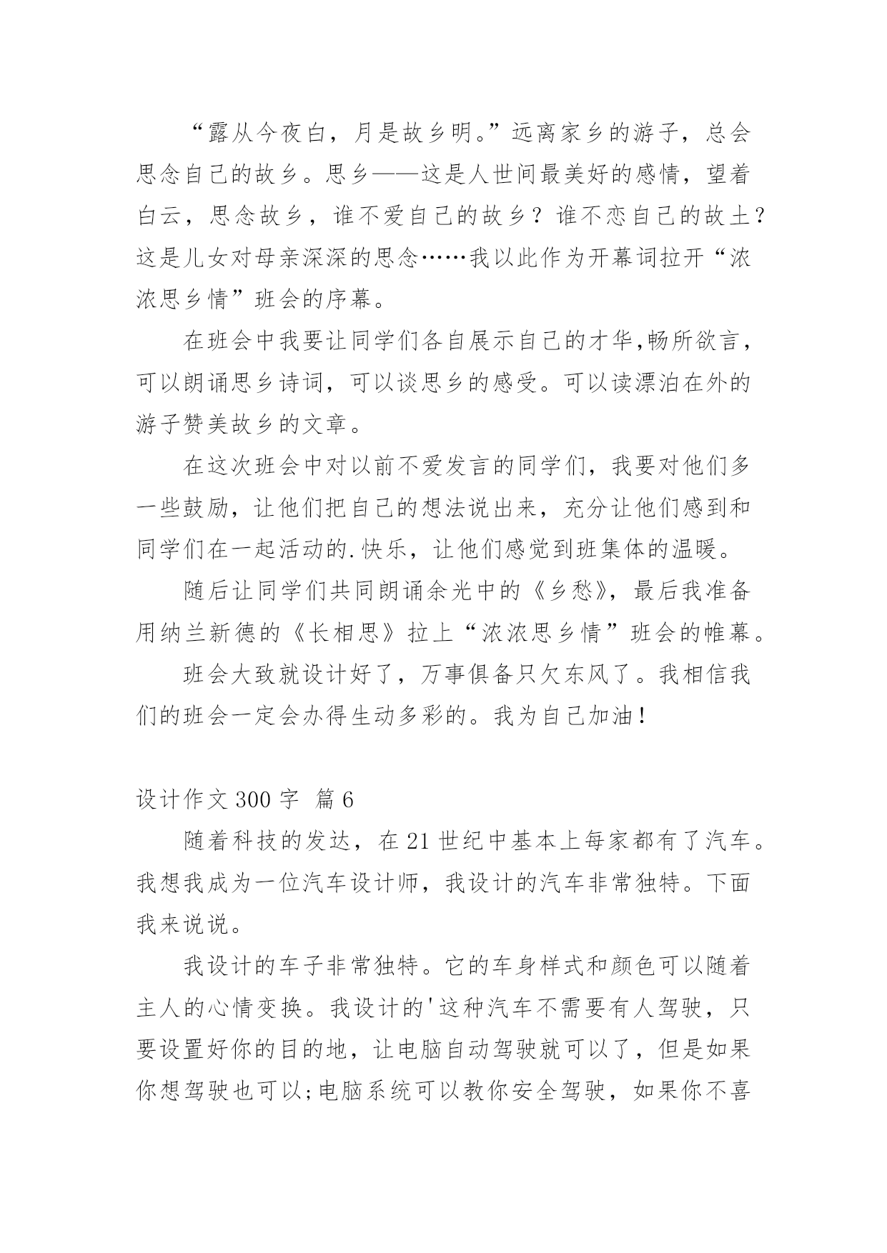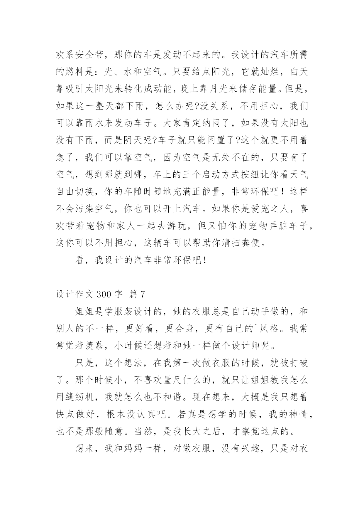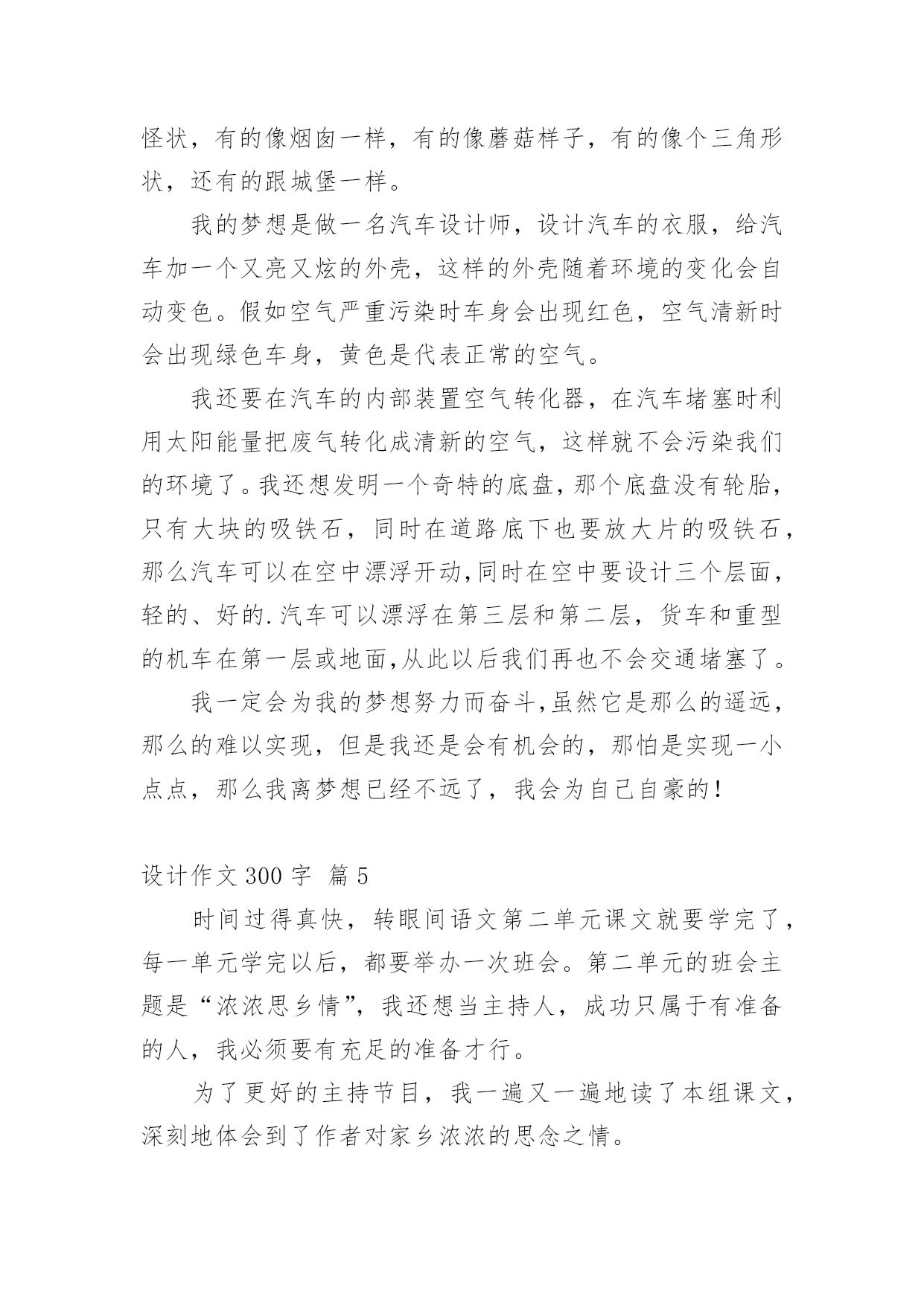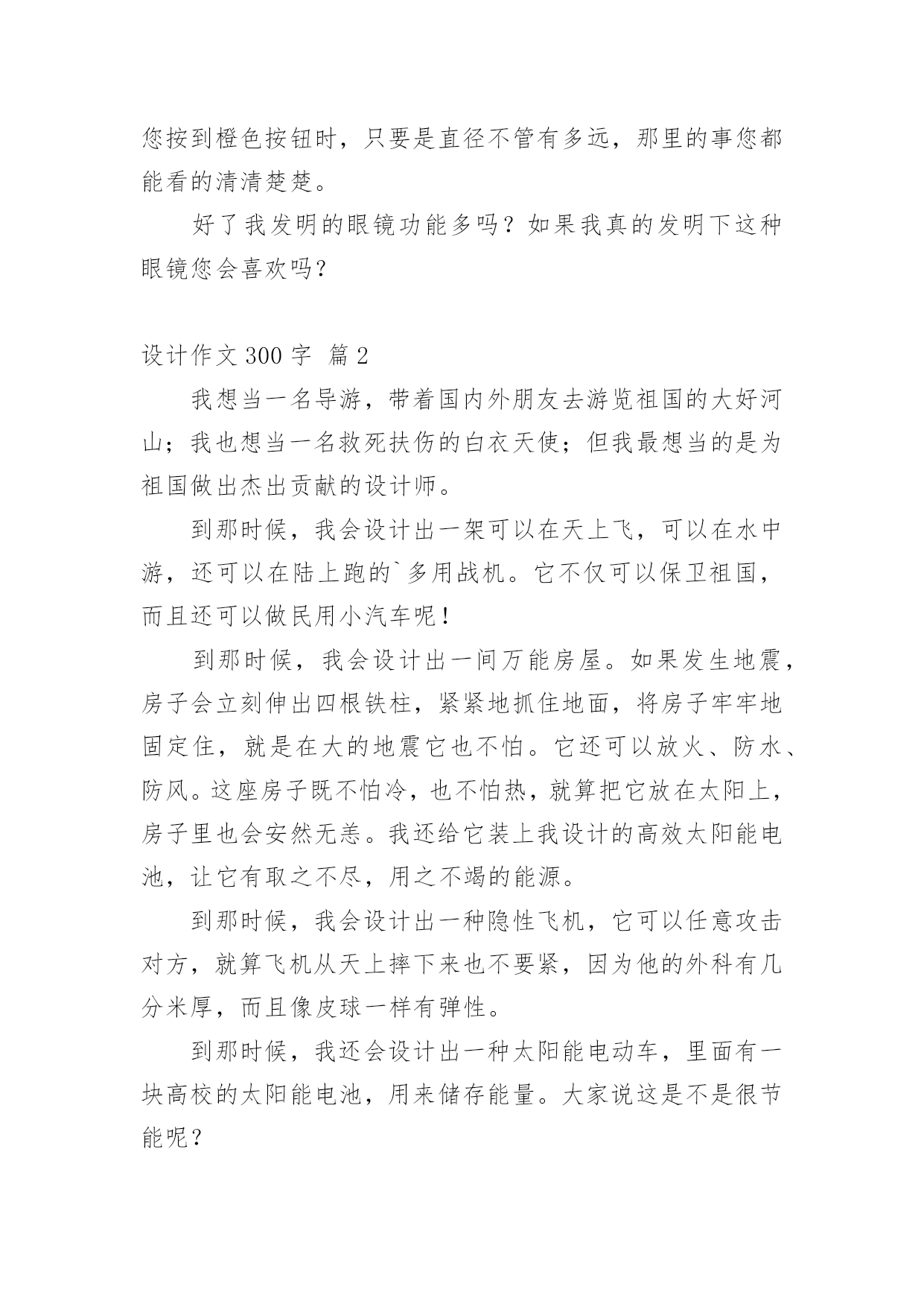设计作文300字设计作文300字集合(10篇)无论是在学校还是在社会中,大家都经常看到作文的身影吧,作文是经过人的思想考虑和语言组织,通过文字来表达一个主题意义的记叙方法。相信写作文是一个让许多人都头痛的问题,下面是小编帮大家整理的设计作文300字10篇,仅供参考,欢迎大家阅读。设计作文300字篇1假如我是二十一世纪的设计师,我会设计一种眼镜,说起眼镜大家肯定都见过。我设计的这种眼镜,还配带遥控器呢,遥控器上有红`黄`青`蓝`绿`橙,六个按钮,每个按钮都有不同的功能呢!大家在炎炎夏日,都回感觉到热,再这时只需要按一下红色按钮,眼镜顶上就会自动弹出,两个微型电风扇给你扇着清凉的'风美吧?如果眼镜近视度或远视度等。与您所需要的度数不匹配的话,你只需要按一下黄色按钮,然后说出你像要得度数就可以了;如果您的眼镜的被划了又用布擦不下的时候就按一下青色按钮,眼镜就会自动擦洗痕迹,擦完您再看一看就变的十分清晰了;当您识别不出钱是真还是假时,只需要按一下蓝色按钮时眼睛就会帮您识别是真还是假了;如果您找不到您的眼镜了,就按绿色按钮,眼镜就回发出电波输入到您的大脑中让您知道眼镜的正确所在位置;当您按到橙色按钮时,只要是直径不管有多远,那里的事您都能看的清清楚楚。好了我发明的眼镜功能多吗?如果我真的发明下这种眼镜您会喜欢吗?设计作文300字篇2我想当一名导游,带着国内外朋友去游览祖国的大好河山;我也想当一名救死扶伤的白衣天使;但我最想当的是为祖国做出杰出贡献的设计师。到那时候,我会设计出一架可以在天上飞,可以在水中游,还可以在陆上跑的`多用战机。它不仅可以保卫祖国,而且还可以做民用小汽车呢!到那时候,我会设计出一间万能房屋。如果发生地震,房子会立刻伸出四根铁柱,紧紧地抓住地面,将房子牢牢地固定住,就是在大的地震它也不怕。它还可以放火、防水、防风。这座房子既不怕冷,也不怕热,就算把它放在太阳上,房子里也会安然无恙。我还给它装上我设计的高效太阳能电池,让它有取之不尽,用之不竭的能源。到那时候,我会设计出一种隐性飞机,它可以任意攻击对方,就算飞机从天上摔下来也不要紧,因为他的外科有几分米厚,而且像皮球一样有弹性。到那时候,我还会设计出一种太阳能电动车,里面有一块高校的太阳能电池,用来储存能量。大家说这是不是很节能呢?……这就是我未来想设计的东西。虽然我现在还不是设计师,但我相信只要我努力,总有一天能实现我的梦想!设计作文300字篇3我的梦想是当一名设计师,我画的东西可多了,有飞机,有轮船,有汽车,还有房子,这4样东西我画得最多了,几百张不在话下。我画的东西都非常奇特,比如说一个飞机有三对机翼,汽车总共有三层,我画的最好的一张画是巨型汽车,这个汽车上面有餐厅,游泳池,甚至还有飞机场呢!除此之外,我还对机械特别感兴趣,有一次妈妈从她学校图书馆里借来了交通百科,我终于弄明白了汽车的发动机是怎么工作的。有一天,我买回来一个直升机,我非常喜欢,可是没用几天就坏了,我仔细地观察,突然发现在机翼高速旋转的`时候。总是左右摇摆,于是我把机翼往下一按,终于修好了,才过了一天,居然又坏了,我发现两个电动机的齿轮都太往上移了,怎么弄就是弄不下来,我甚至把一边的铝板都拆了都无济于事,突然,我把电动机往下一按,终于修好了,原来就怎么简单啊!希望我能成为一名设计师。设计作文300字篇4我以前很羡慕房屋设计师,他们可以把房子设计成奇形怪状,有的像烟囱一样,有的像蘑菇样子,有的像个三角形状,还有的跟城堡一样。我的梦想是做一名汽车设计师,设计汽车的衣服,给汽车加一个又亮又炫的外壳,这样的外壳随着环境的变化会自动变色。假如空气严重污染时车身会出现红色,空气清新时会出现绿色车身,黄色是代表正常的空气。我还要在汽车的内部装置空气转化器,在汽车堵塞时利用太阳能量把废气转化成清新的空气,这样就不会污染我们的环境了。我还想发明一个奇特的底盘,那个底盘没有轮胎,只有大块的吸铁石,同时在道路底下也要放大片的吸铁石,那么汽车可以在空中漂浮开动,同时在空中要设计三个层面,轻的、好的.汽车可以漂浮在第三层和第二层,货车和重型的机车在第一层或地面,从此以后我们再也不会交通堵塞了。我一定会为我的梦想努力而奋斗,虽然它是那么的遥远,那么的难以实现,但是我还是会有机会的,那怕是实现一小点点,那么我离梦想已经不远了,我会为自己自豪的!设计作文300字篇5时间过得真快,转眼间语文第二单元课文就要学完了,每一单元学完以后,都要举办一次班会。第二单元的班会主题是“浓浓思乡情”,我还想当主持人,成功只属于有准备的人,我必须要有充足的准备才行。为了更好的主持节目,我一遍又一遍地读了本组课文,深刻地体会到了作者对家乡浓浓的思念之情。“露从今夜白,月是故乡明。”远离家乡的游子,总会思念自己的故乡。思乡——这是人世间最美好的感情,