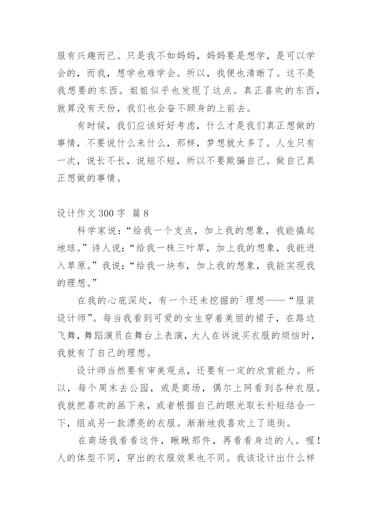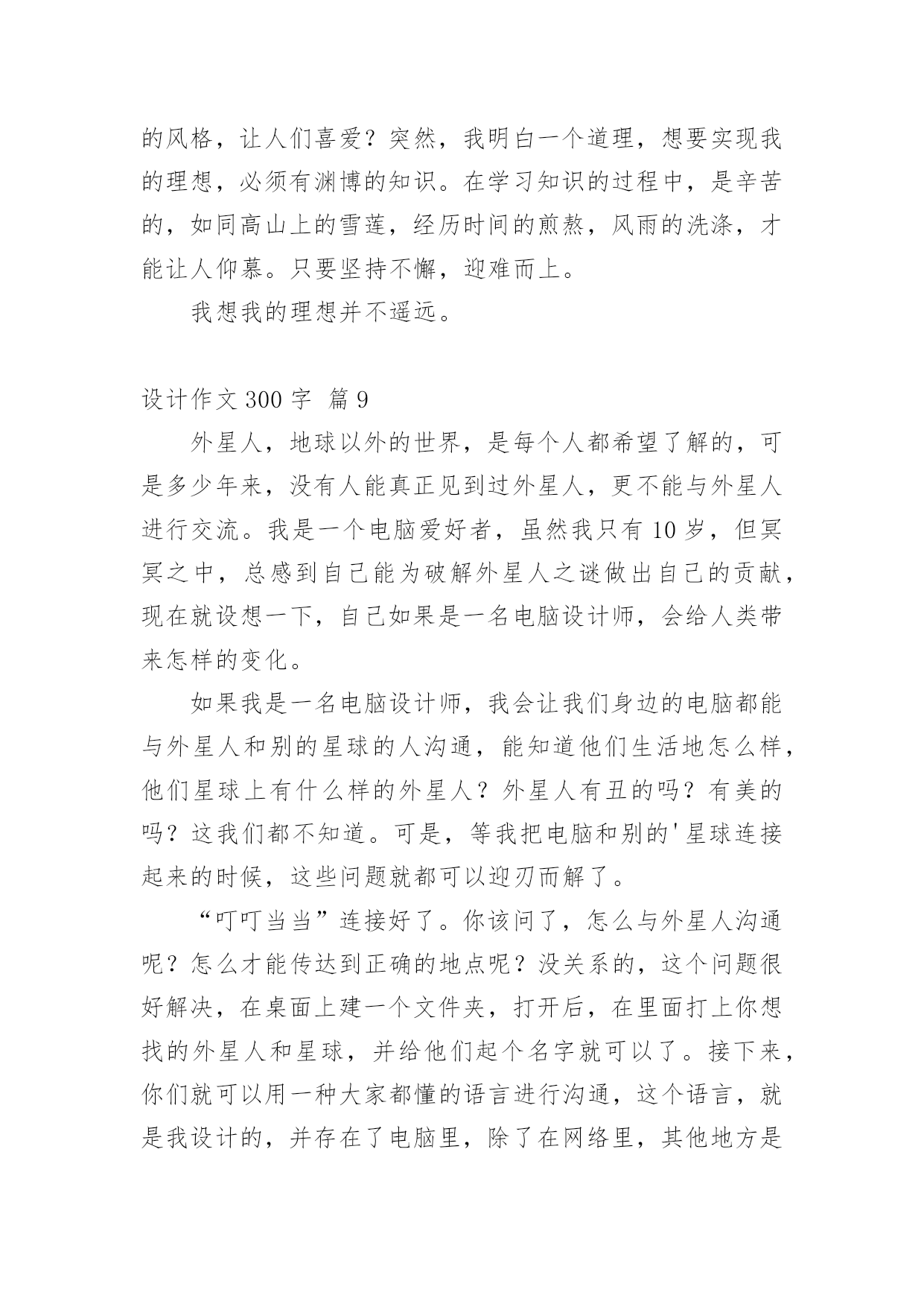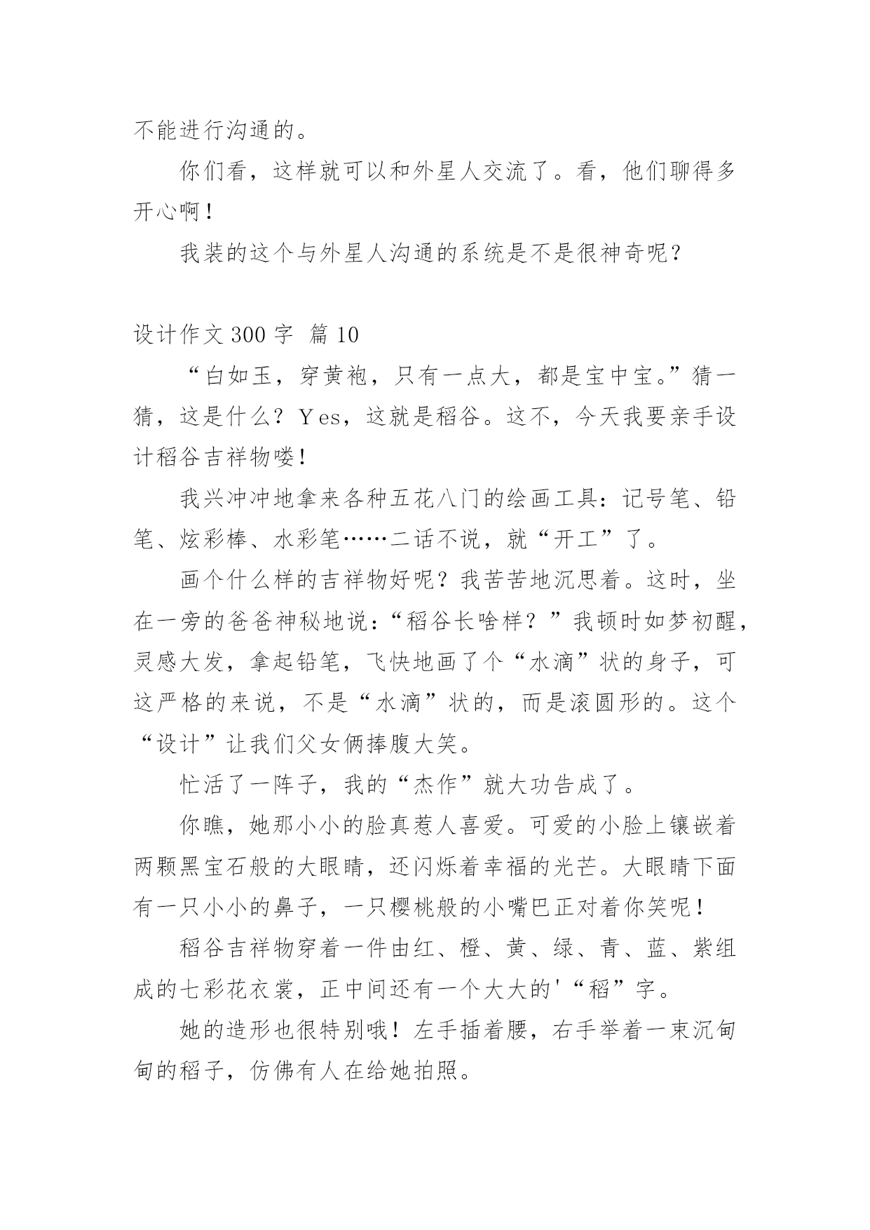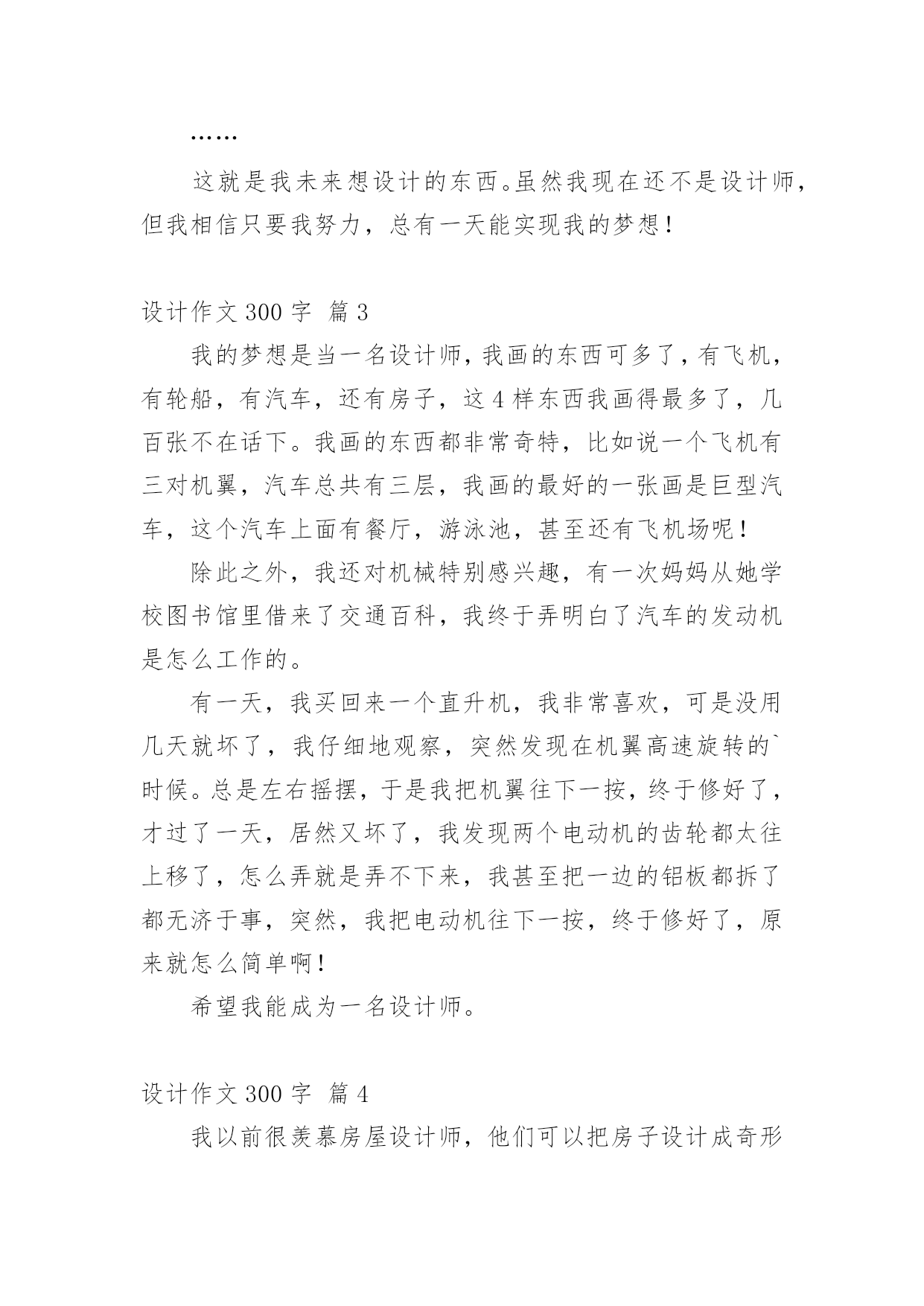 设计作文300字设计作文300字集合(10篇)无论是在学校还是在社会中,大家都经常看到作文的身影吧,作文是经过人的思想考虑和语言组织,通过文字来表达一个主题意义的记叙方法。相信写作文是一个让许多人都头痛的问题,下面是小编帮大家整理的设计作文300字10篇,仅供参考,欢迎大家阅读。设计作文300字篇1假如我是二十一世纪的设计师,我会设计一种眼镜,说起眼镜大家肯定都见过。我设计的这种眼镜,还配带遥控器呢,遥控器上有红`黄`青`蓝`绿`橙,六个按钮,每个按钮都有不同的功能呢!大家在炎炎夏日,都回感觉到热,再这时只需要按一下红色按钮,眼镜顶上就会自动弹出,两个微型电风扇给你扇着清凉的'风美吧?如果眼镜近视度或远视度等。与您所需要的度数不匹配的话,你只需要按一下黄色按钮,然后说出你像要得度数就可以了;如果您的眼镜的被划了又用布擦不下的时候就按一下青色按钮,眼镜就会自动擦洗痕迹,擦完您再看一看就变的十分清晰了;当您识别不出钱是真还是假时,只需要按一下蓝色按钮时眼睛就会帮您识别是真还是假了;如果您找不到您的眼镜了,就按绿色按钮,眼镜就回发出电波输入到您的大脑中让您知道眼镜的正确所在位置;当您按到橙色按钮时,只要是直径不管有多远,那里的事您都能看的清清楚楚。好了我发明的眼镜功能多吗?如果我真的发明下这种眼镜您会喜欢吗?设计作文300字篇2我想当一名导游,带着国内外朋友去游览祖国的大好河山;我也想当一名救死扶伤的白衣天使;但我最想当的是为祖国做出杰出贡献的设计师。到那时候,我会设计出一架可以在天上飞,可以在水中游,还可以在陆上跑的`多用战机。它不仅可以保卫祖国,而且还可以做民用小汽车呢!到那时候,我会设计出一间万能房屋。如果发生地震,房子会立刻伸出四根铁柱,紧紧地抓住地面,将房子牢牢地固定住,就是在大的地震它也不怕。它还可以放火、防水、防风。这座房子既不怕冷,也不怕热,就算把它放在太阳上,房子里也会安然无恙。我还给它装上我设计的高效太阳能电池,让它有取之不尽,用之不竭的能源。到那时候,我会设计出一种隐性飞机,它可以任意攻击对方,就算飞机从天上摔下来也不要紧,因为他的外科有几分米厚,而且像皮球一样有弹性。到那时候,我还会设计出一种太阳能电动车,里面有一块高校的太阳能电池,用来储存能量。大家说这是不是很节能呢?……这就是我未来想设计的东西。虽然我现在还不是设计师,但我相信只要我努力,总有一天能实现我的梦想!设计作文300字篇3我的梦想是当一名设计师,我画的东西可多了,有飞机,有轮船,有汽车,还有房子,这4样东西我画得最多了,几百张不在话下。我画的东西都非常奇特,比如说一个飞机有三对机翼,汽车总共有三层,我画的最好的一张画是巨型汽车,这个汽车上面有餐厅,游泳池,甚至还有飞机场呢!除此之外,我还对机械特别感兴趣,有一次妈妈从她学校图书馆里借来了交通百科,我终于弄明白了汽车的发动机是怎么工作的。有一天,我买回来一个直升机,我非常喜欢,可是没用几天就坏了,我仔细地观察,突然发现在机翼高速旋转的`时候。总是左右摇摆,于是我把机翼往下一按,终于修好了,才过了一天,居然又坏了,我发现两个电动机的齿轮都太往上移了,怎么弄就是弄不下来,我甚至把一边的铝板都拆了都无济于事,突然,我把电动机往下一按,终于修好了,原来就怎么简单啊!希望我能成为一名设计师。设计作文300字篇4我以前很羡慕房屋设计师,他们可以把房子设计成奇形怪状,有的像烟囱一样,有的像蘑菇样子,有的像个三角形状,还有的跟城堡一样。我的梦想是做一名汽车设计师,设计汽车的衣服,给汽车加一个又亮又炫的外壳,这样的外壳随着环境的变化会自动变色。假如空气严重污染时车身会出现红色,空气清新时会出现绿色车身,黄色是代表正常的空气。我还要在汽车的内部装置空气转化器,在汽车堵塞时利用太阳能量把废气转化成清新的空气,这样就不会污染我们的环境了。我还想发明一个奇特的底盘,那个底盘没有轮胎,只有大块的吸铁石,同时在道路底下也要放大片的吸铁石,那么汽车可以在空中漂浮开动,同时在空中要设计三个层面,轻的、好的.汽车可以漂浮在第三层和第二层,货车和重型的机车在第一层或地面,从此以后我们再也不会交通堵塞了。我一定会为我的梦想努力而奋斗,虽然它是那么的遥远,那么的难以实现,但是我还是会有机会的,那怕是实现一小点点,那么我离梦想已经不远了,我会为自己自豪的!设计作文300字篇5时间过得真快,转眼间语文第二单元课文就要学完了,每一单元学完以后,都要举办一次班会。第二单元的班会主题是“浓浓思乡情”,我还想当主持人,成功只属于有准备的人,我必须要有充足的准备才行。为了更好的主持节目,我一遍又一遍地读了本组课文,深刻地体会到了作者对家乡浓浓的思念之情。“露从今夜白,月是故乡明。”远离家乡的游子,总会思念自己的故乡。思乡——这是人世间最美好的感情,