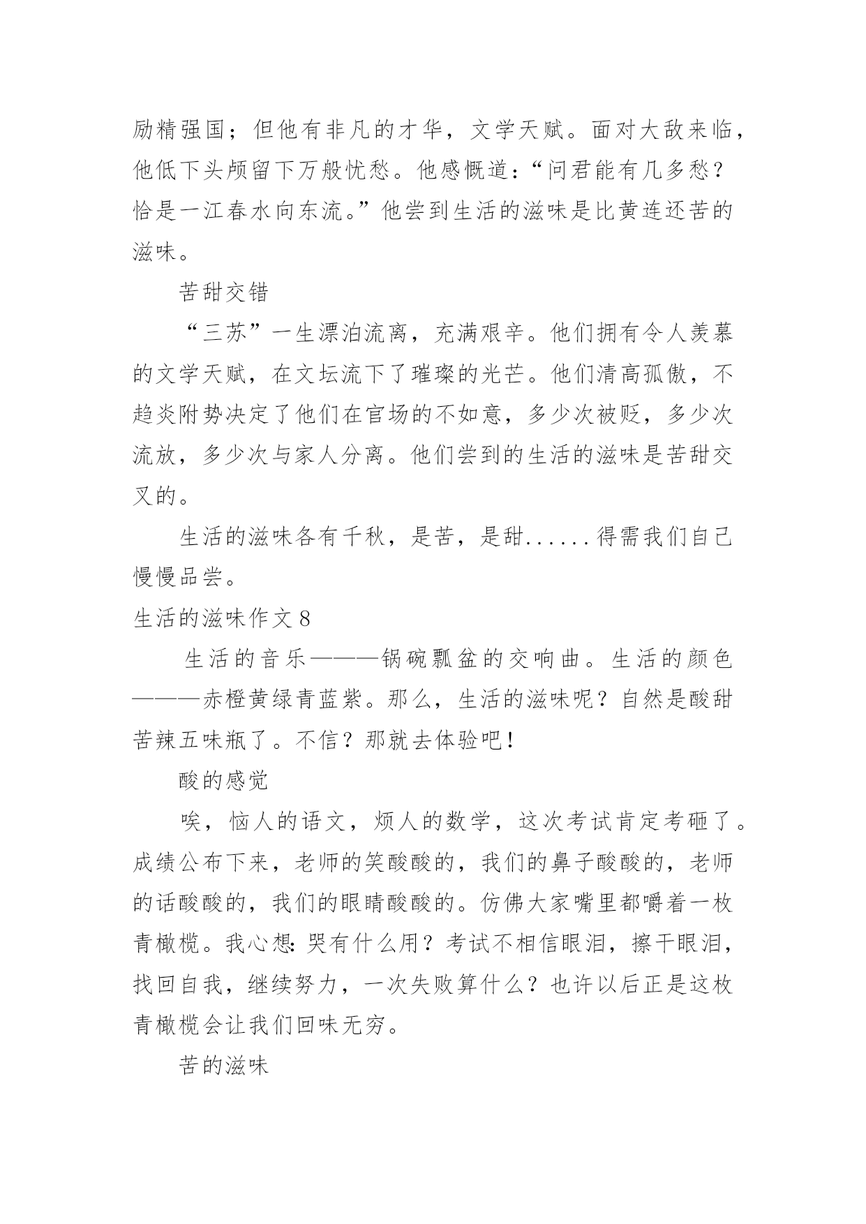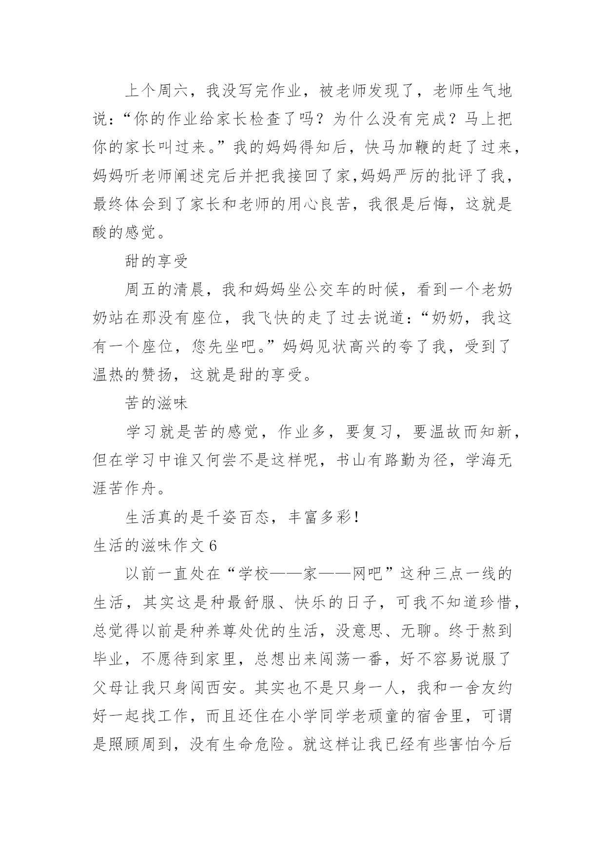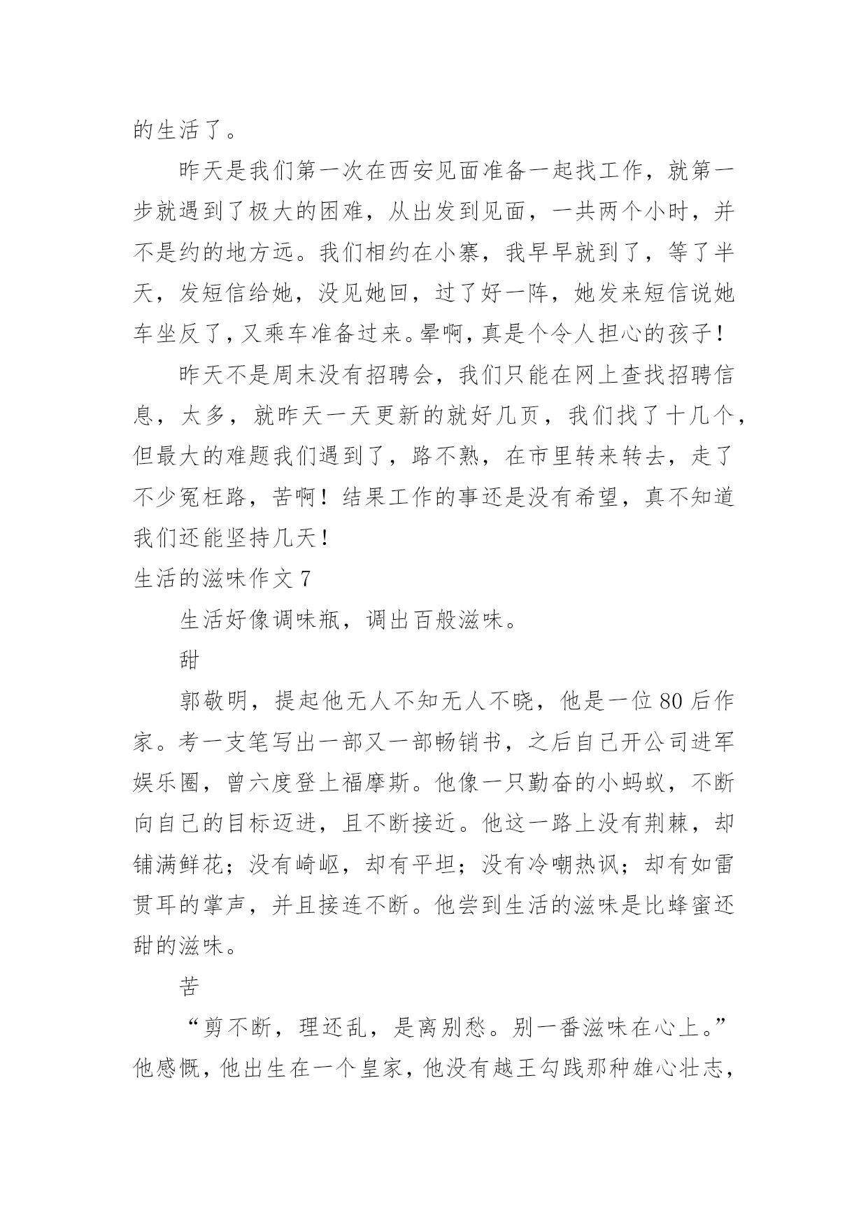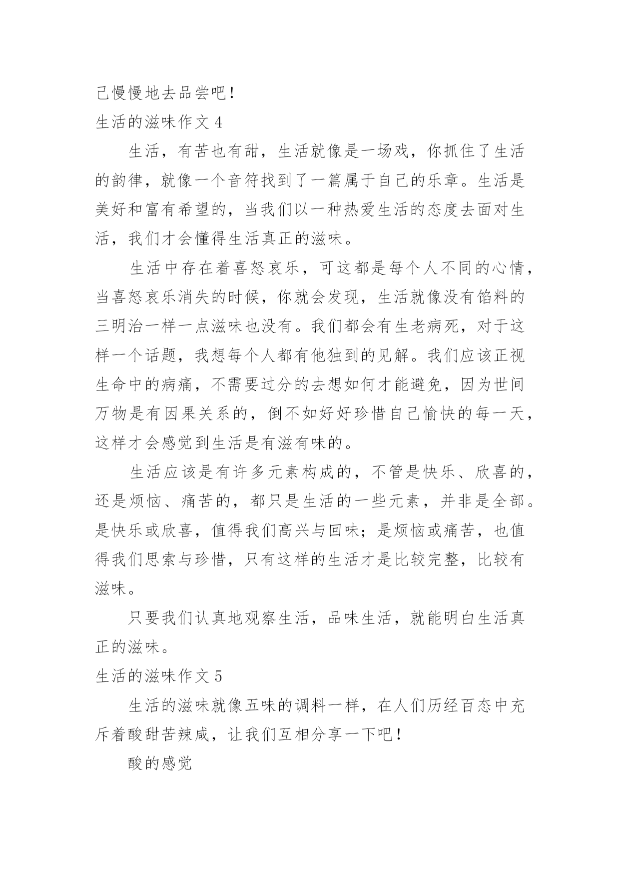 生活的滋味作文生活的滋味作文无论在学习、工作或是生活中,大家都经常接触到作文吧,写作文是培养人们的观察力、联想力、想象力、思考力和记忆力的重要手段。你知道作文怎样才能写的好吗?以下是小编为大家收集的生活的滋味作文,欢迎阅读,希望大家能够喜欢。生活的滋味作文1生活就如同一口大锅,里面可以有酸的、甜的、辣的、苦的。生活中少不了这些“调味品,”每一种都会给生活带来不一样的滋味。酸不知为什么,每一次看见他人受到表扬时,自己心中总会有一阵酸楚。别人告诉我,这是因为我好胜心强造成的。只有我自己知道这是一种无法轻易原谅自我而产生的。甜记得初次得到这种感觉是站在领奖台上,领着属于自己劳动成果,心里的那种喜悦给我的感觉,那样浓,那样甜,如蜜一样,让人心甜无比。辣记不起什么时候喜欢上了热辣辣的感觉。每当心情郁闷之时,太阳总给我最真实的热,最真实的辣,它贯穿我的全身,给我一种冰无法到达的境界。苦谁会说人生中只有幸福与甜蜜,随手一拾便可以拾起那人生中的苦。苦瓜带来的苦只是短暂的,而人生中的苦却像是不可揭开的伤痕,一揭开便是让人无法回头的苦于伤。苦是人生中无法避开的阻碍。我知道人生中,无可避免的是生活中的酸甜苦辣,每一个都是人生这口大锅的调味品。人生活着是为了更好的活,生活中少不了这些不同的滋味!生活的滋味作文2生活的滋味,有各种各样:比如苦(伤心)、甜(开心)、酸(心酸)、辣(烦燥)、咸(委屈)等等。每个滋味都可以代表不同的心情。而我今天要写的滋味是甜。那是一个阳光明媚的晴天,我记得是个星期天。我和爸爸妈妈都放假了,爸爸妈妈想带我去朱家角古镇游玩。于是我们带了一个旅行包,里面装着一些水和食物,来到了车站,坐上公交朱徐线,到了朱家角。因为我们是第一次来朱家角,我左看右看,就是找不到朱家角的入口在哪里,后来我们再三询问,终于知道朱家角的入口了。我们进了朱家角的门口,进了朱家角,妈妈的眼睛都亮了。只见古镇细细长长的街道两旁,都是卖东西的,有吃的、喝的、穿的、玩的,还有朱家角的地方特产。街道上人来人往,说着不同的方言,还有好多外国人,简直太热闹了。我们和妈妈一边逛,一边聊天,一边选择有没有想要的东西。今天妈妈的心情很好,给我买了一把剑,我特别高兴。我们还买了许许多多的东西,有扇子、项链,还有弹弓。爸爸说妈妈是个购物狂人,哈哈。我们拿着沉重的袋子回了家。今天真累啊,但是我心里很甜,因为这是属于我们全家的甜蜜时光。我多想每天都能这样,能够和爸爸妈妈甜甜蜜蜜的在一起啊!生活的滋味作文3生活就像一个调色盘,五彩缤纷的,也是一个调味盒,酸、甜、苦、辣,一应俱全。当我失落的时候,我的朋友就会传来一句句鼓励的话语,使我重新鼓起勇气来。这份真挚的友情令我十分感动,不禁鼻子酸酸的。也许,这就是生活中的酸吧!学习知识不但是课堂上的事情,我也可以在生活中学到知识。课外书就是我的第二位老师。遨游在书的海洋里,是最快乐的事了。除此之外,长辈们也是我的老师。他们懂得许多生活中的小常识,向他们多多讨教,就会有很大的收获。也许,这就是生活中的甜吧!岁月如梭,光阴如箭,一眨眼,我已经长大了,也该为家长干一些家务。当我拿起抹布、扫把、拖把时,才尝到了干家务的劳苦,也明白了妈妈的劳累。也许,这就是生活中的苦吧!以前我家有一套玻璃杯,但现在只剩下两只。哎,都是因为我贪玩,其他的杯子都被我摔碎了。现在回想起来,感觉吃了辣椒似的。也许,这就是生活中的辣吧!生活到底是什么滋味?还是请你自己慢慢地去品尝吧!生活的滋味作文4生活,有苦也有甜,生活就像是一场戏,你抓住了生活的韵律,就像一个音符找到了一篇属于自己的乐章。生活是美好和富有希望的,当我们以一种热爱生活的态度去面对生活,我们才会懂得生活真正的滋味。生活中存在着喜怒哀乐,可这都是每个人不同的心情,当喜怒哀乐消失的时候,你就会发现,生活就像没有馅料的三明治一样一点滋味也没有。我们都会有生老病死,对于这样一个话题,我想每个人都有他独到的见解。我们应该正视生命中的病痛,不需要过分的去想如何才能避免,因为世间万物是有因果关系的,倒不如好好珍惜自己愉快的每一天,这样才会感觉到生活是有滋有味的。生活应该是有许多元素构成的,不管是快乐、欣喜的,还是烦恼、痛苦的,都只是生活的一些元素,并非是全部。是快乐或欣喜,值得我们高兴与回味;是烦恼或痛苦,也值得我们思索与珍惜,只有这样的生活才是比较完整,比较有滋味。只要我们认真地观察生活,品味生活,就能明白生活真正的滋味。生活的滋味作文5生活的滋味就像五味的调料一样,在人们历经百态中充斥着酸甜苦辣咸,让我们互相分享一下吧!酸的感觉上个周六,我没写完作业,被老师发现了,老师生气地说:“你的作业给家长检查了吗?为什么没有完成?马上把你的家长叫过来。”我的妈妈得知后,快马加鞭的赶了过来,妈妈听老师阐述完后并把我接回了家,妈妈严厉的