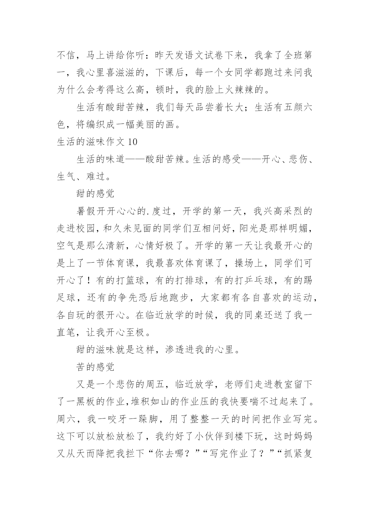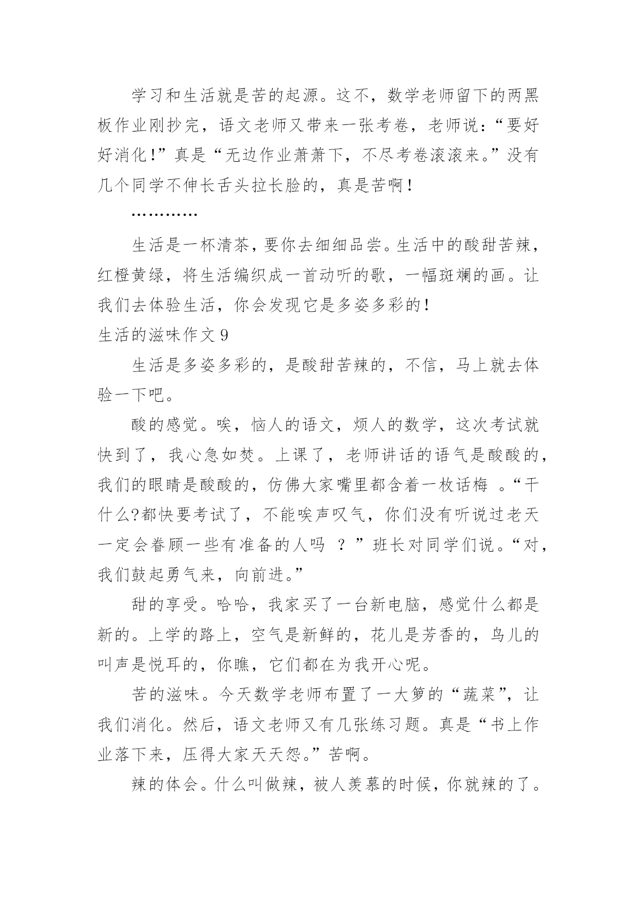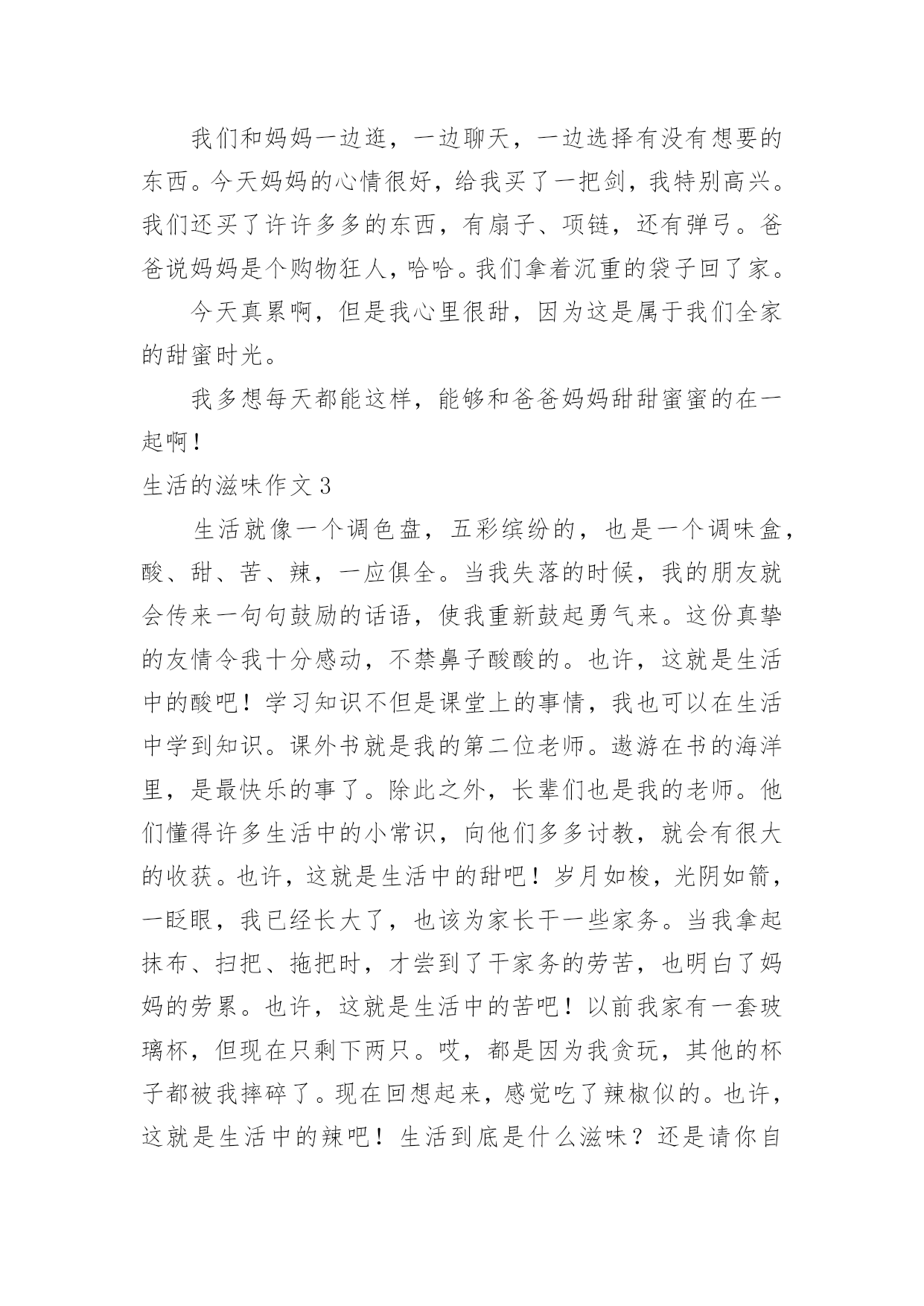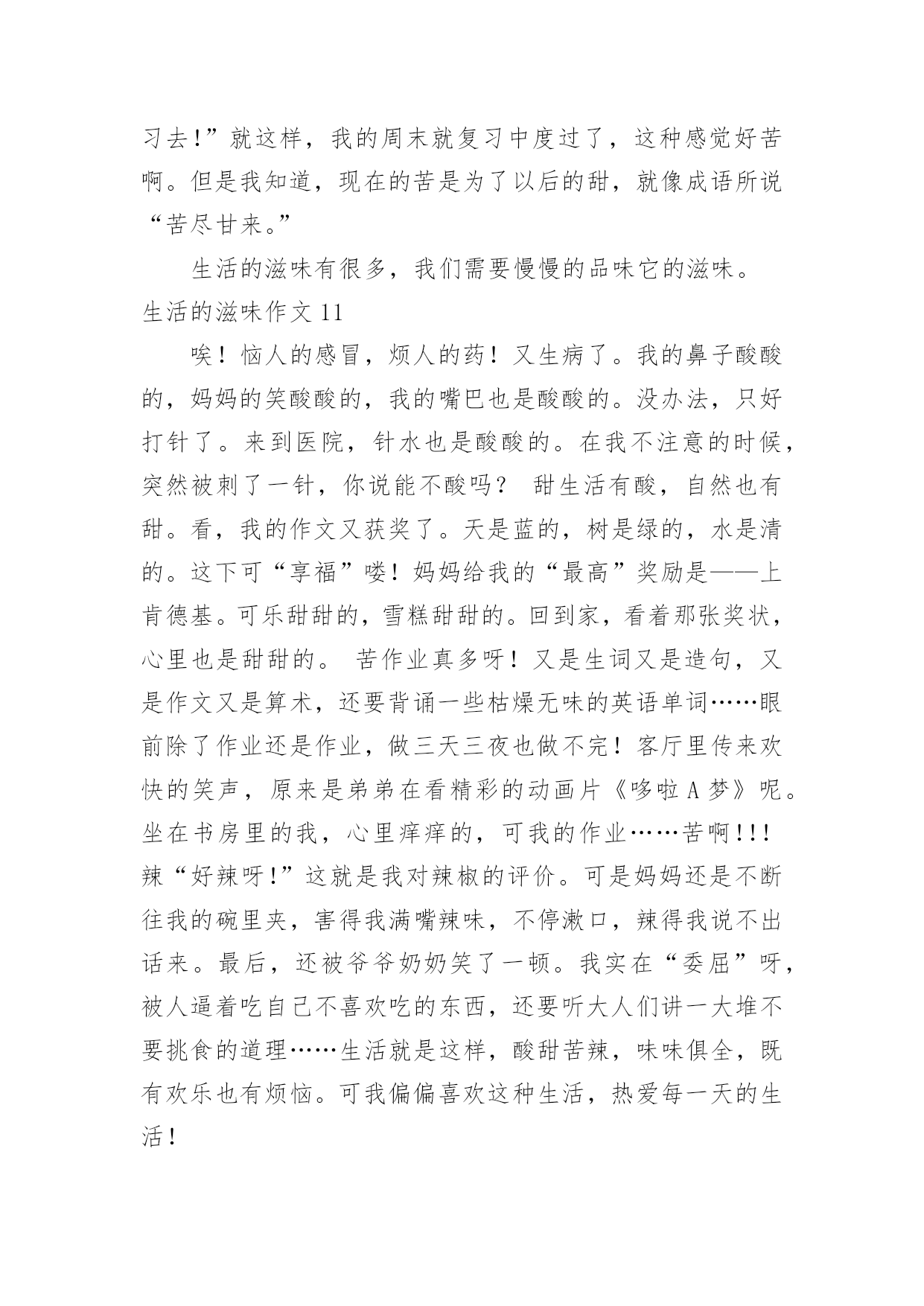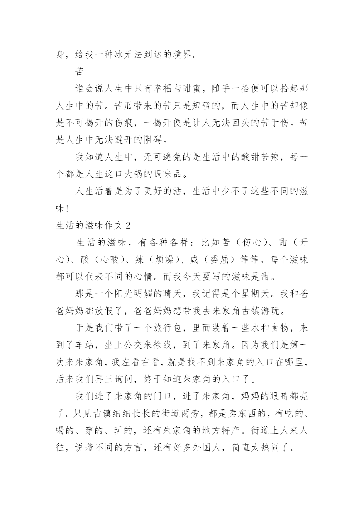 生活的滋味作文生活的滋味作文无论在学习、工作或是生活中,大家都经常接触到作文吧,写作文是培养人们的观察力、联想力、想象力、思考力和记忆力的重要手段。你知道作文怎样才能写的好吗?以下是小编为大家收集的生活的滋味作文,欢迎阅读,希望大家能够喜欢。生活的滋味作文1生活就如同一口大锅,里面可以有酸的、甜的、辣的、苦的。生活中少不了这些“调味品,”每一种都会给生活带来不一样的滋味。酸不知为什么,每一次看见他人受到表扬时,自己心中总会有一阵酸楚。别人告诉我,这是因为我好胜心强造成的。只有我自己知道这是一种无法轻易原谅自我而产生的。甜记得初次得到这种感觉是站在领奖台上,领着属于自己劳动成果,心里的那种喜悦给我的感觉,那样浓,那样甜,如蜜一样,让人心甜无比。辣记不起什么时候喜欢上了热辣辣的感觉。每当心情郁闷之时,太阳总给我最真实的热,最真实的辣,它贯穿我的全身,给我一种冰无法到达的境界。苦谁会说人生中只有幸福与甜蜜,随手一拾便可以拾起那人生中的苦。苦瓜带来的苦只是短暂的,而人生中的苦却像是不可揭开的伤痕,一揭开便是让人无法回头的苦于伤。苦是人生中无法避开的阻碍。我知道人生中,无可避免的是生活中的酸甜苦辣,每一个都是人生这口大锅的调味品。人生活着是为了更好的活,生活中少不了这些不同的滋味!生活的滋味作文2生活的滋味,有各种各样:比如苦(伤心)、甜(开心)、酸(心酸)、辣(烦燥)、咸(委屈)等等。每个滋味都可以代表不同的心情。而我今天要写的滋味是甜。那是一个阳光明媚的晴天,我记得是个星期天。我和爸爸妈妈都放假了,爸爸妈妈想带我去朱家角古镇游玩。于是我们带了一个旅行包,里面装着一些水和食物,来到了车站,坐上公交朱徐线,到了朱家角。因为我们是第一次来朱家角,我左看右看,就是找不到朱家角的入口在哪里,后来我们再三询问,终于知道朱家角的入口了。我们进了朱家角的门口,进了朱家角,妈妈的眼睛都亮了。只见古镇细细长长的街道两旁,都是卖东西的,有吃的、喝的、穿的、玩的,还有朱家角的地方特产。街道上人来人往,说着不同的方言,还有好多外国人,简直太热闹了。我们和妈妈一边逛,一边聊天,一边选择有没有想要的东西。今天妈妈的心情很好,给我买了一把剑,我特别高兴。我们还买了许许多多的东西,有扇子、项链,还有弹弓。爸爸说妈妈是个购物狂人,哈哈。我们拿着沉重的袋子回了家。今天真累啊,但是我心里很甜,因为这是属于我们全家的甜蜜时光。我多想每天都能这样,能够和爸爸妈妈甜甜蜜蜜的在一起啊!生活的滋味作文3生活就像一个调色盘,五彩缤纷的,也是一个调味盒,酸、甜、苦、辣,一应俱全。当我失落的时候,我的朋友就会传来一句句鼓励的话语,使我重新鼓起勇气来。这份真挚的友情令我十分感动,不禁鼻子酸酸的。也许,这就是生活中的酸吧!学习知识不但是课堂上的事情,我也可以在生活中学到知识。课外书就是我的第二位老师。遨游在书的海洋里,是最快乐的事了。除此之外,长辈们也是我的老师。他们懂得许多生活中的小常识,向他们多多讨教,就会有很大的收获。也许,这就是生活中的甜吧!岁月如梭,光阴如箭,一眨眼,我已经长大了,也该为家长干一些家务。当我拿起抹布、扫把、拖把时,才尝到了干家务的劳苦,也明白了妈妈的劳累。也许,这就是生活中的苦吧!以前我家有一套玻璃杯,但现在只剩下两只。哎,都是因为我贪玩,其他的杯子都被我摔碎了。现在回想起来,感觉吃了辣椒似的。也许,这就是生活中的辣吧!生活到底是什么滋味?还是请你自己慢慢地去品尝吧!生活的滋味作文4生活,有苦也有甜,生活就像是一场戏,你抓住了生活的韵律,就像一个音符找到了一篇属于自己的乐章。生活是美好和富有希望的,当我们以一种热爱生活的态度去面对生活,我们才会懂得生活真正的滋味。生活中存在着喜怒哀乐,可这都是每个人不同的心情,当喜怒哀乐消失的时候,你就会发现,生活就像没有馅料的三明治一样一点滋味也没有。我们都会有生老病死,对于这样一个话题,我想每个人都有他独到的见解。我们应该正视生命中的病痛,不需要过分的去想如何才能避免,因为世间万物是有因果关系的,倒不如好好珍惜自己愉快的每一天,这样才会感觉到生活是有滋有味的。生活应该是有许多元素构成的,不管是快乐、欣喜的,还是烦恼、痛苦的,都只是生活的一些元素,并非是全部。是快乐或欣喜,值得我们高兴与回味;是烦恼或痛苦,也值得我们思索与珍惜,只有这样的生活才是比较完整,比较有滋味。只要我们认真地观察生活,品味生活,就能明白生活真正的滋味。生活的滋味作文5生活的滋味就像五味的调料一样,在人们历经百态中充斥着酸甜苦辣咸,让我们互相分享一下吧!酸的感觉上个周六,我没写完作业,被老师发现了,老师生气地说:“你的作业给家长检查了吗?为什么没有完成?马上把你的家长叫过来。”我的妈妈得知后,快马加鞭的赶了过来,妈妈听老师阐述完后并把我接回了家,妈妈严厉的