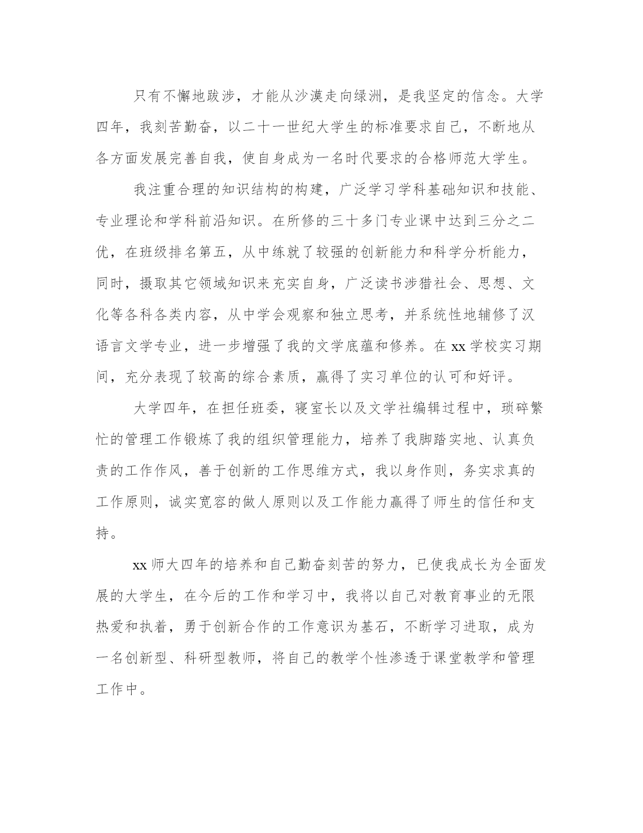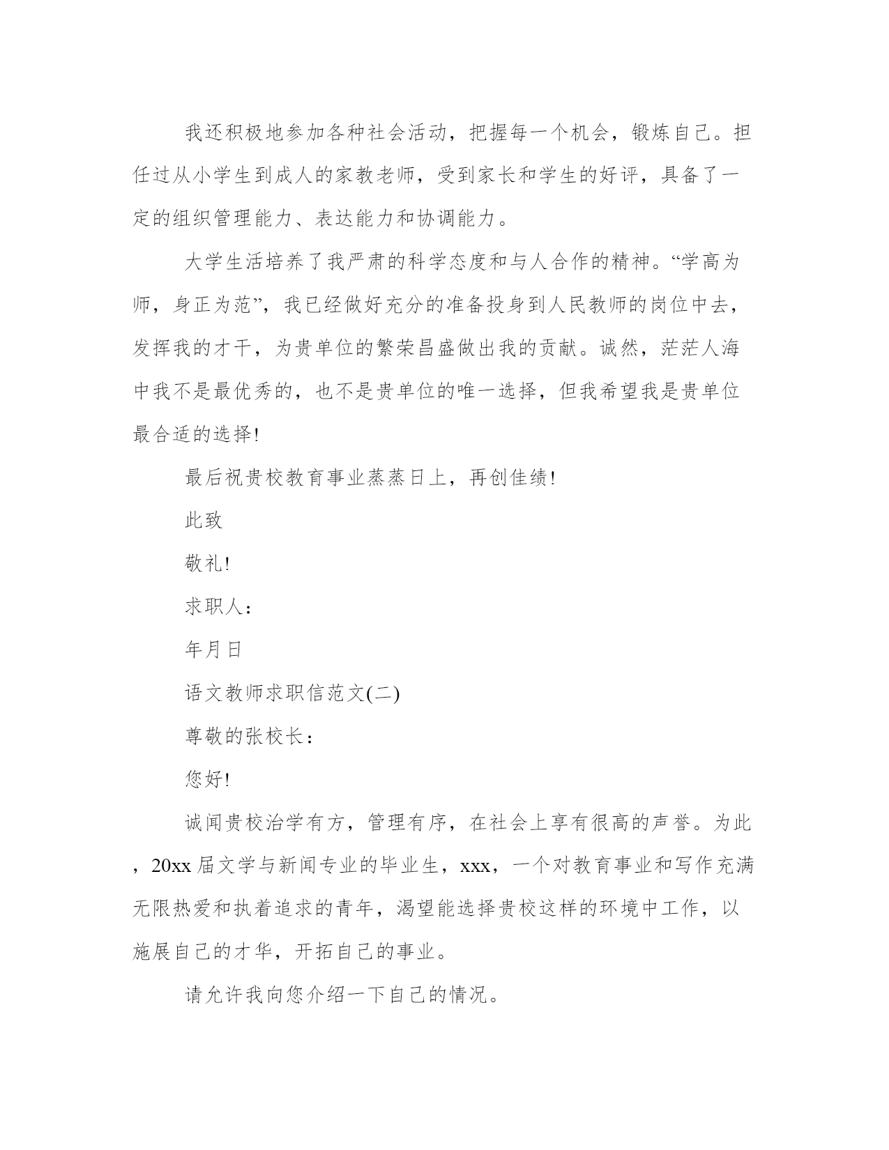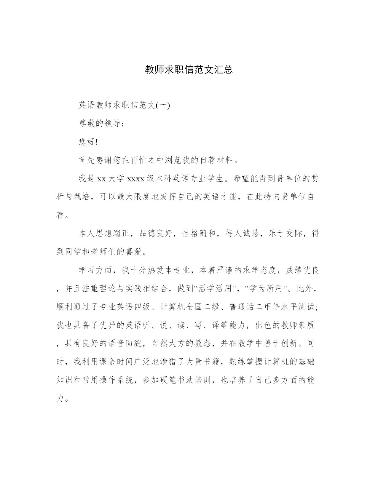 教师求职信范文汇总英语教师求职信范文(一)尊敬的领导:您好!首先感谢您在百忙之中浏览我的自荐材料。我是xx大学xxxx级本科英语专业学生。希望能得到贵单位的赏析与栽培,可以最大限度地发挥自己的英语才能,在此特向贵单位自荐。本人思想端正,品德良好,性格随和,待人诚恳,乐于交际,得到同学和老师们的喜爱。学习方面,我十分热爱本专业,本着严谨的求学态度,成绩优良,并且注重理论与实践相结合,做到“活学活用”,“学为所用”。此外,顺利通过了专业英语四级、计算机全国二级、普通话二甲等水平测试;我也具备了优异的英语听、说、读、写、译等能力,出色的教师素质,具有良好的语音面貌,自然大方的教态,并在教学中善于创新。同时,我利用课余时间广泛地涉猎了大量书籍,熟练掌握计算机的基础知识和常用操作系统,参加硬笔书法培训,也培养了自己多方面的能力。我还积极地参加各种社会活动,把握每一个机会,锻炼自己。担任过从小学生到成人的家教老师,受到家长和学生的好评,具备了一定的组织管理能力、表达能力和协调能力。大学生活培养了我严肃的科学态度和与人合作的精神。“学高为师,身正为范”,我已经做好充分的准备投身到人民教师的岗位中去,发挥我的才干,为贵单位的繁荣昌盛做出我的贡献。诚然,茫茫人海中我不是最优秀的,也不是贵单位的唯一选择,但我希望我是贵单位最合适的选择!最后祝贵校教育事业蒸蒸日上,再创佳绩!此致敬礼!求职人:年月日语文教师求职信范文(二)尊敬的张校长:您好!诚闻贵校治学有方,管理有序,在社会上享有很高的声誉。为此,20xx届文学与新闻专业的毕业生,xxx,一个对教育事业和写作充满无限热爱和执着追求的青年,渴望能选择贵校这样的环境中工作,以施展自己的才华,开拓自己的事业。请允许我向您介绍一下自己的情况。只有不懈地跋涉,才能从沙漠走向绿洲,是我坚定的信念。大学四年,我刻苦勤奋,以二十一世纪大学生的标准要求自己,不断地从各方面发展完善自我,使自身成为一名时代要求的合格师范大学生。我注重合理的知识结构的构建,广泛学习学科基础知识和技能、专业理论和学科前沿知识。在所修的三十多门专业课中达到三分之二优,在班级排名第五,从中练就了较强的创新能力和科学分析能力,同时,摄取其它领域知识来充实自身,广泛读书涉猎社会、思想、文化等各科各类内容,从中学会观察和独立思考,并系统性地辅修了汉语言文学专业,进一步增强了我的文学底蕴和修养。在xx学校实习期间,充分表现了较高的综合素质,赢得了实习单位的认可和好评。大学四年,在担任班委,寝室长以及文学社编辑过程中,琐碎繁忙的管理工作锻炼了我的组织管理能力,培养了我脚踏实地、认真负责的工作作风,善于创新的工作思维方式,我以身作则,务实求真的工作原则,诚实宽容的做人原则以及工作能力赢得了师生的信任和支持。xx师大四年的培养和自己勤奋刻苦的努力,已使我成长为全面发展的大学生,在今后的工作和学习中,我将以自己对教育事业的无限热爱和执着,勇于创新合作的工作意识为基石,不断学习进取,成为一名创新型、科研型教师,将自己的教学个性渗透于课堂教学和管理工作中。我坚信无悔于贵校的选择,希望您能给我一个机会,我有信心、有能力证明:您将无悔于对我的选择!此致敬礼!求职人:年月日小学数学教师求职信范文(三)尊敬的校领导:您好!首先,向您辛勤的工作致以深深的敬意!同时,也非常感谢您在百忙之中阅读我的求职信。从贵校公布的招聘信息中了解到,贵校需招聘小学数学教师,我感觉我的条件和能力符合该职位的要求,为此,我特向贵校申请这一职位。我是2014年应届毕业生,在校学习应用心理学专业。在四年的大学生活中,我十分珍惜在校的学习时间,不断从各方面完善自己。学习上,我始终以认真刻苦的态度对待所学课程,并获得相应的专业奖学金,同时我还自觉利用课余时间努力学习专业外知识,顺利通过大学英语四六级考试,计算机二级考试,取得心理咨询师三级资格证。两年的学生会工作经历让我学会到合作与沟通的重要性,大大提高了我的问题解决能力。大学生活的学习与锻炼,给我仅是初步的经验积累,对于迈向社会远远不够,但我相信自己积极的工作热情以及认真好学的态度可以弥补暂时的不足。同时,作为一名师范专业的学生,为了以后能成为一名合格出色的教师,我努力学习教育学、教育心理学等相关教育课程,为以后从事教育工作积累相关的理论知识。在大四实习中,一个月的讲台锻炼深刻让我领悟到教师工作的苦与甜,课堂上的讲授,与学生的沟通互动让我积累了一定的教学经验。这让我相信自己有能力胜任小学的教学工作。此外,作为一名心理学专业的学生,我也相信我的专业知识素养和能力对于辅导学生心理和生活有一定的优势。毕业在即,我已做好各方面的准备,我愿意以极大的热情和责任心投入到教师工作中去。我是个