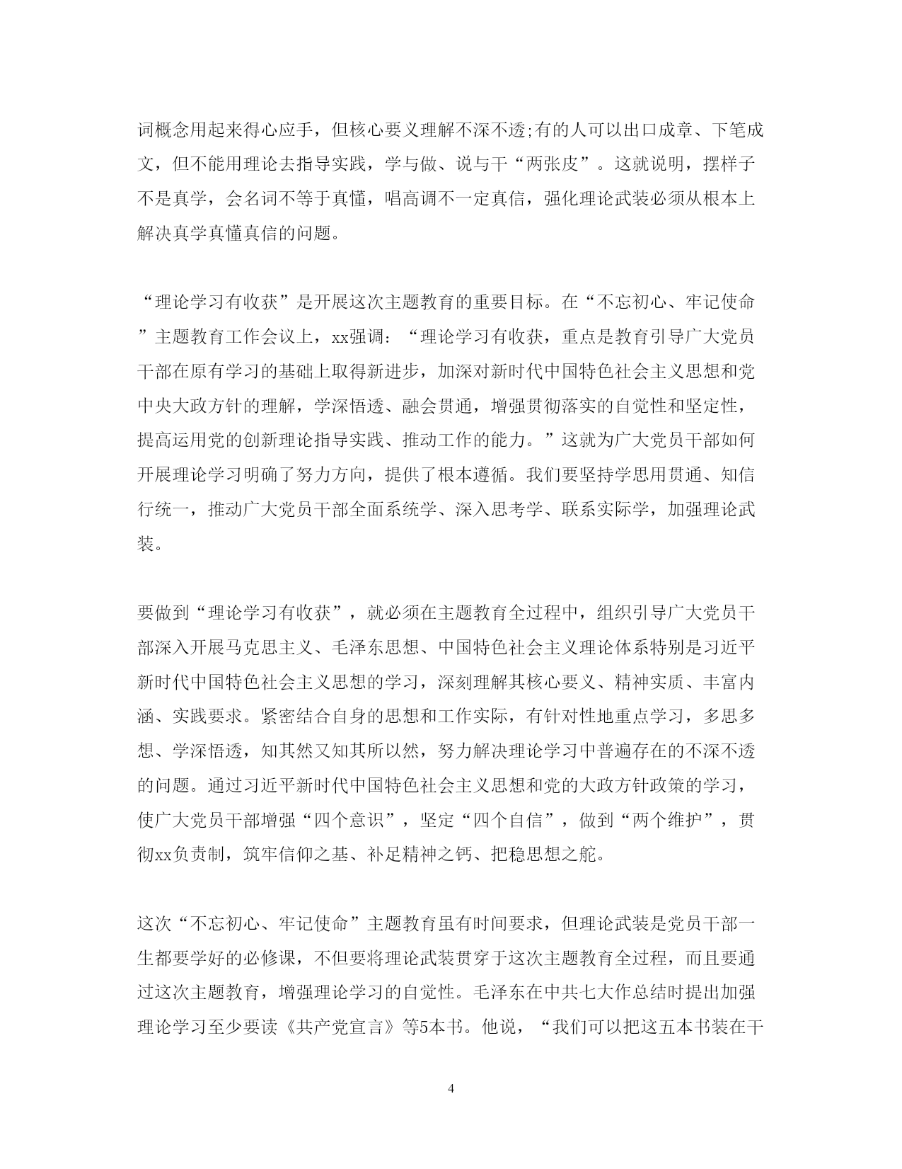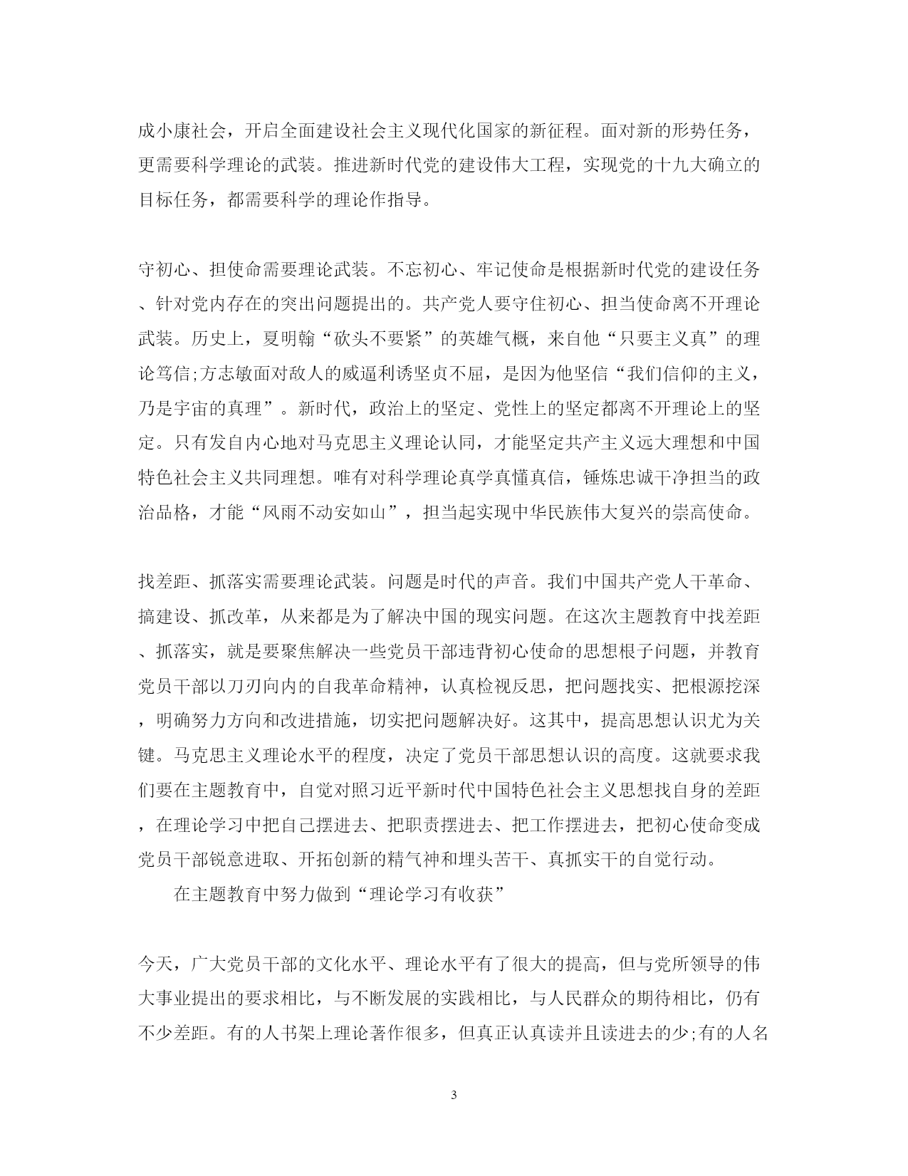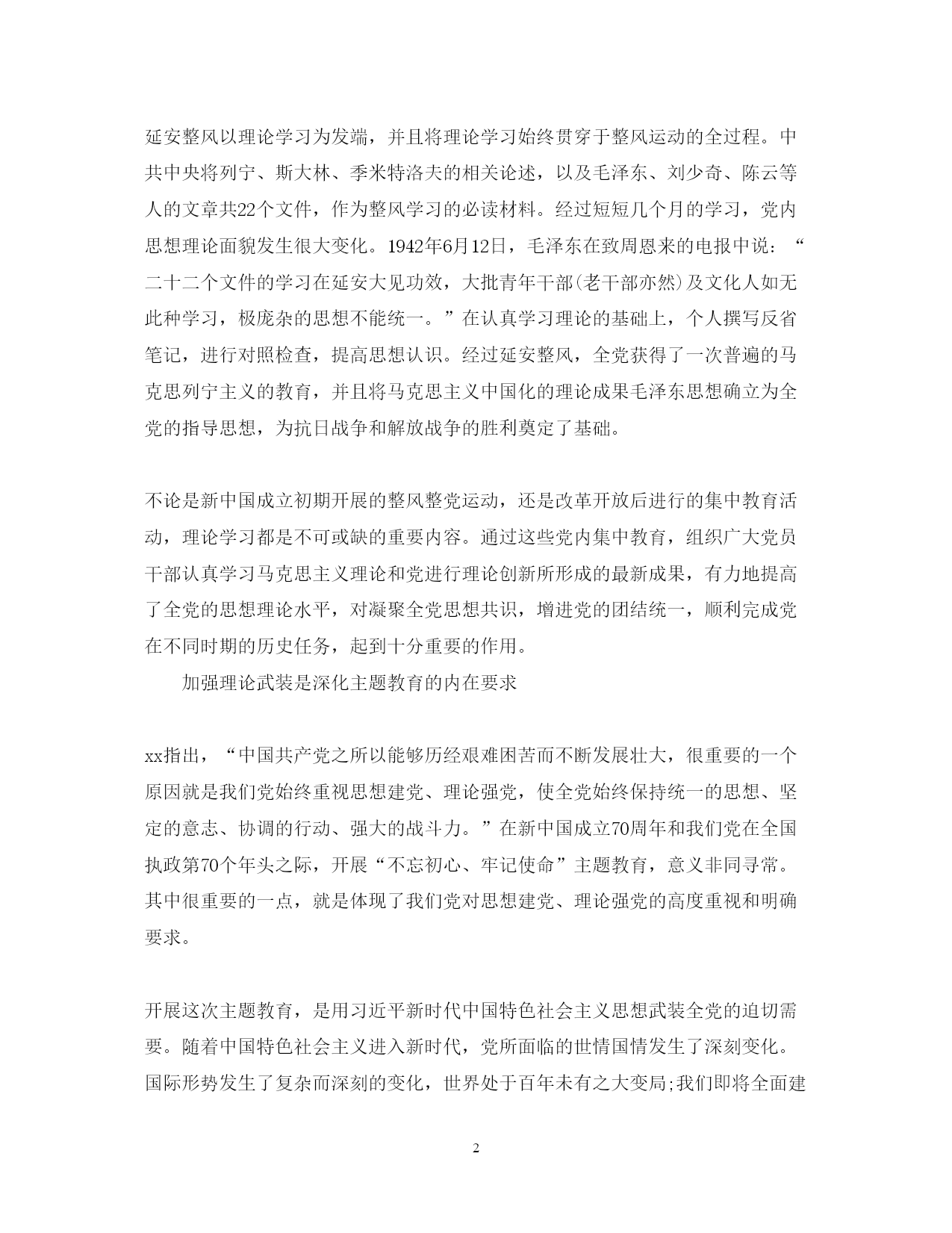 此资料由网络收集而来,如有侵权请告知上传者立即删除。资料共分享,我们负责传递知识。PAGEPAGE5开展理论武装是教育的成功之道掌握马克思主义理论的深度,决定着思维视野的广度、政治敏感的程度、思想境界的高度。因此,这次开展的“不忘初心、牢记使命”主题教育,把“理论学习有收获”作为具体目标之一。这就要求我们必须将强化理论武装贯穿主题教育始终,聚焦解决影响广大党员干部“守初心、担使命,找差距、抓落实”的思想根源问题,筑牢实现“两个一百年”奋斗目标的共同思想基础。重视理论武装是开展党内教育的成功之道我们党历来十分重视理论武装工作。早在1920xx年12月的古田会议上,毛泽东就指出“红军党内最迫切的问题,要算是教育问题,为了红军的健全与扩大,为了斗争任务之能够负荷,都要从党内教育做起”“有计划地进行党内教育,纠正过去无计划的听其自然的状态,是党的重要任务之一”。后来,又明确将“马克思列宁主义的研究”规定为教育党员材料。用马克思主义理论武装广大党员,是我们党开展党内教育的一个优良传统,也是检视党内教育是否取得成效的一条重要标准。抗日战争时期我们党之所以迅速发展壮大,与理论武装工作取得重要成效密不可分。在1938年10月的中共六届六中全会上,毛泽东提醒全党:“指导一个伟大的革命运动的政党,如果没有革命理论,没有历史知识,没有对于实际运动的深刻的了解,要取得胜利是不可能的。”在党中央的号召下,延安和各个抗日根据地党员干部掀起了理论学习的热潮,广大党员干部特别是高级干部的理论水平有了很大提高。延安整风可以说是我们党历史上开展的第一个集中教育,反对主观主义以整顿学风、反对宗派主义以整顿党风、反对党八股以整顿文风是这次集中教育的主题。延安整风以理论学习为发端,并且将理论学习始终贯穿于整风运动的全过程。中共中央将列宁、斯大林、季米特洛夫的相关论述,以及毛泽东、刘少奇、陈云等人的文章共22个文件,作为整风学习的必读材料。经过短短几个月的学习,党内思想理论面貌发生很大变化。1942年6月12日,毛泽东在致周恩来的电报中说:“二十二个文件的学习在延安大见功效,大批青年干部(老干部亦然)及文化人如无此种学习,极庞杂的思想不能统一。”在认真学习理论的基础上,个人撰写反省笔记,进行对照检查,提高思想认识。经过延安整风,全党获得了一次普遍的马克思列宁主义的教育,并且将马克思主义中国化的理论成果毛泽东思想确立为全党的指导思想,为抗日战争和解放战争的胜利奠定了基础。不论是新中国成立初期开展的整风整党运动,还是改革开放后进行的集中教育活动,理论学习都是不可或缺的重要内容。通过这些党内集中教育,组织广大党员干部认真学习马克思主义理论和党进行理论创新所形成的最新成果,有力地提高了全党的思想理论水平,对凝聚全党思想共识,增进党的团结统一,顺利完成党在不同时期的历史任务,起到十分重要的作用。加强理论武装是深化主题教育的内在要求xx指出,“中国共产党之所以能够历经艰难困苦而不断发展壮大,很重要的一个原因就是我们党始终重视思想建党、理论强党,使全党始终保持统一的思想、坚定的意志、协调的行动、强大的战斗力。”在新中国成立70周年和我们党在全国执政第70个年头之际,开展“不忘初心、牢记使命”主题教育,意义非同寻常。其中很重要的一点,就是体现了我们党对思想建党、理论强党的高度重视和明确要求。开展这次主题教育,是用习近平新时代中国特色社会主义思想武装全党的迫切需要。随着中国特色社会主义进入新时代,党所面临的世情国情发生了深刻变化。国际形势发生了复杂而深刻的变化,世界处于百年未有之大变局;我们即将全面建成小康社会,开启全面建设社会主义现代化国家的新征程。面对新的形势任务,更需要科学理论的武装。推进新时代党的建设伟大工程,实现党的十九大确立的目标任务,都需要科学的理论作指导。守初心、担使命需要理论武装。不忘初心、牢记使命是根据新时代党的建设任务、针对党内存在的突出问题提出的。共产党人要守住初心、担当使命离不开理论武装。历史上,夏明翰“砍头不要紧”的英雄气概,来自他“只要主义真”的理论笃信;方志敏面对敌人的威逼利诱坚贞不屈,是因为他坚信“我们信仰的主义,乃是宇宙的真理”。新时代,政治上的坚定、党性上的坚定都离不开理论上的坚定。只有发自内心地对马克思主义理论认同,才能坚定共产主义远大理想和中国特色社会主义共同理想。唯有对科学理论真学真懂真信,锤炼忠诚干净担当的政治品格,才能“风雨不动安如山”,担当起实现中华民族伟大复兴的崇高使命。找差距、抓落实需要理论武装。问题是时代的声音。我们中国共产党人干革命、搞建设、抓改革,从来都是为了解决中国的现实问题。在这次主题教育中找差距、抓落实,就是要聚焦解决一些党员干部违背初心使命的思想根子问题,并教育党员干部以刀刃