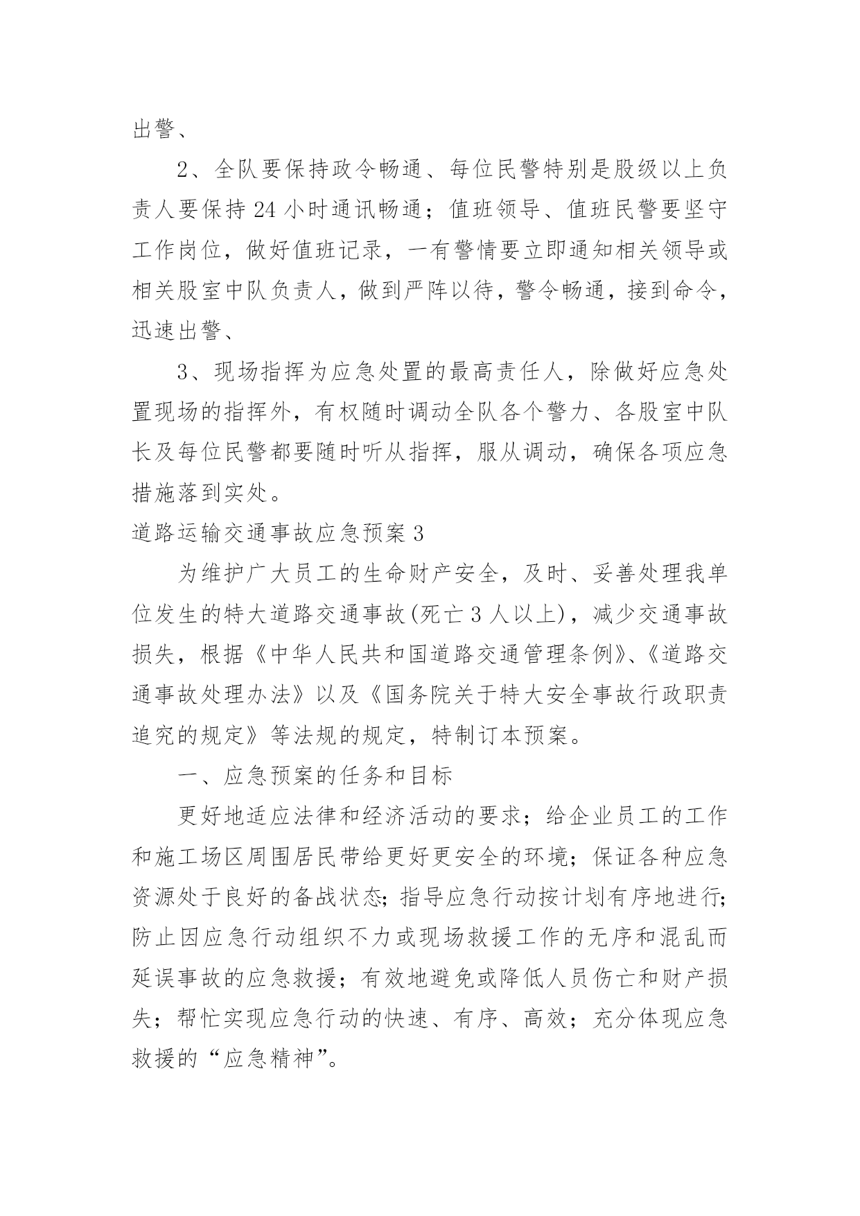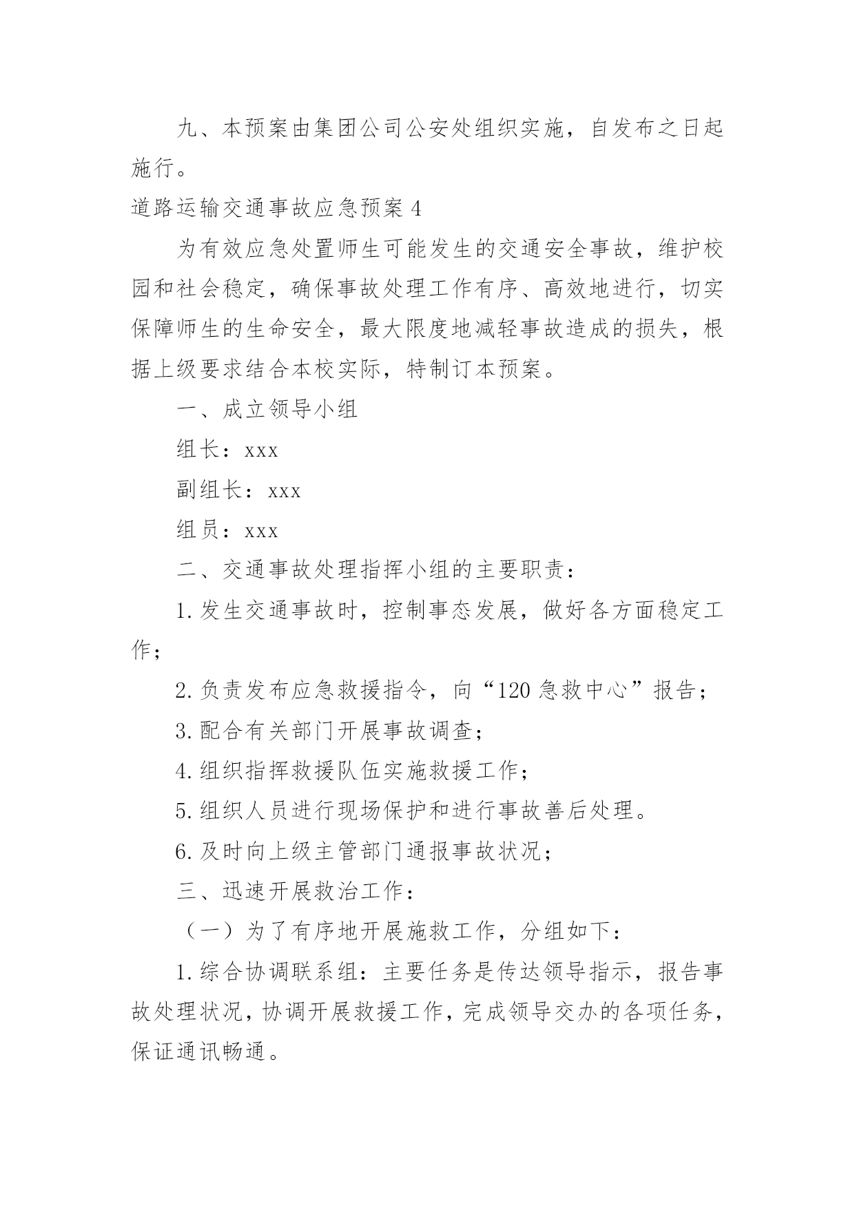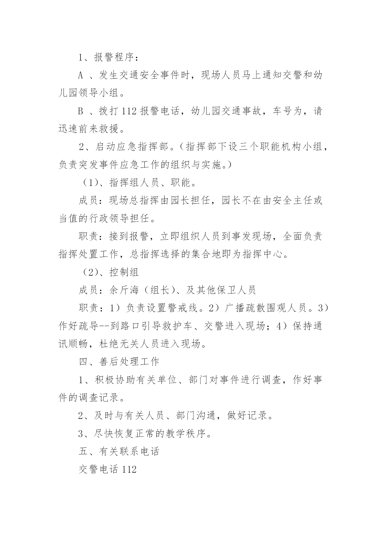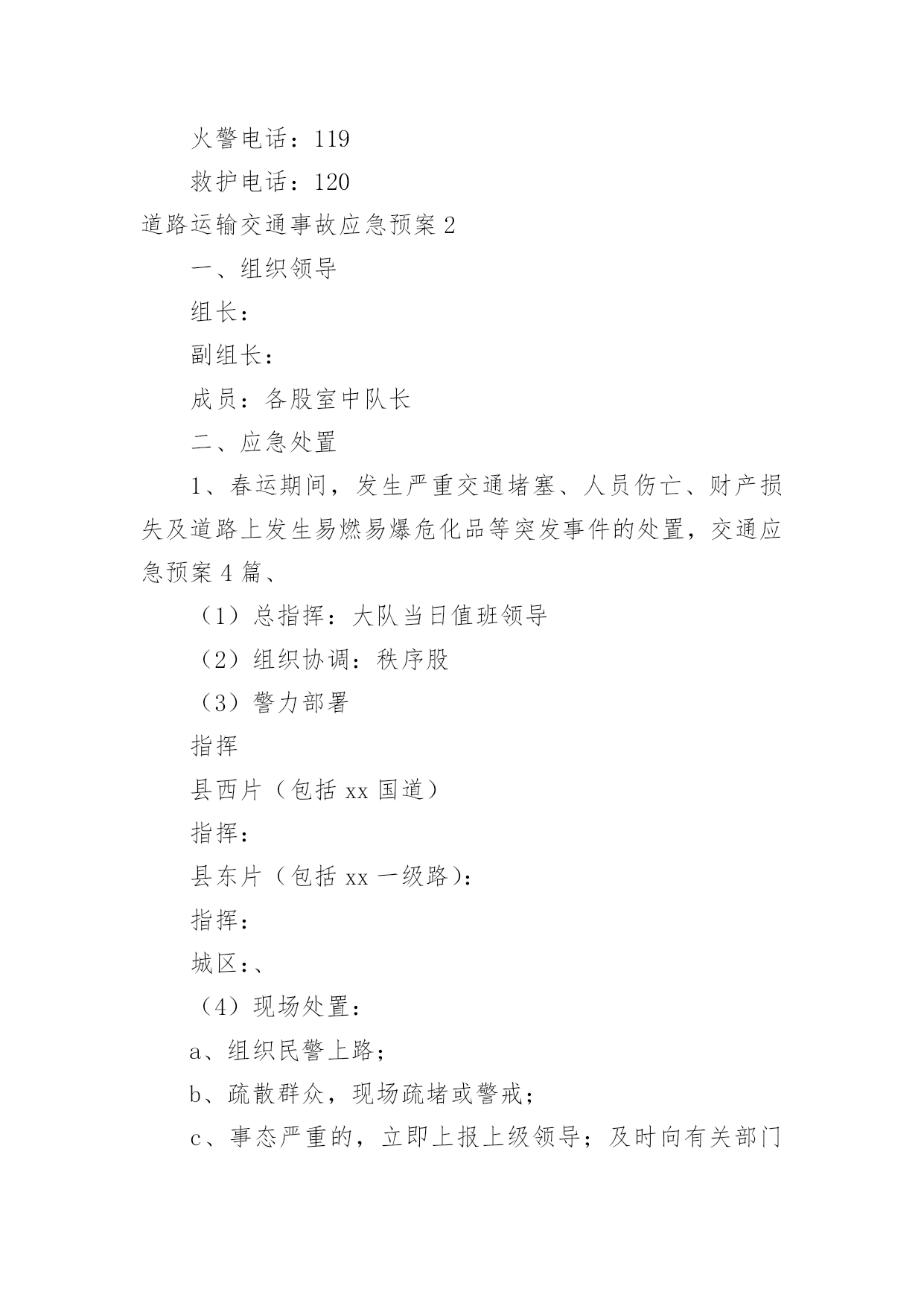 道路运输交通事故应急预案道路运输交通事故应急预案在平凡的学习、工作、生活中,难免会发生一些不在自己预料之中的事件,为了控制事故的发展势态,可能需要提前进行应急预案编制工作。你知道什么样的应急预案才能切实地帮助到我们吗?以下是小编收集整理的道路运输交通事故应急预案,供大家参考借鉴,希望可以帮助到有需要的朋友。道路运输交通事故应急预案1一、制定本预案的目的、依据。为确保幼儿园的安全和稳定,有效地处置突发事件,建立统一指挥,职责明确,运转有序,反应迅速、处置有力的'应急处置体系,最大限度降低事件的危害,维护和保障我园教育、教学工作的正常进行。二、设立应急工作领导小组。遵照安全管理的要求,设立乐乐幼儿园成立应急工作领导小组,名单如下:组长:朱宝珍(园长)副组长:卢艳(副园长)组员:柳萍徐静邱盼邱桂香领导小组职责:负责指挥协调突发事件应急工作。三、实施方案1、报警程序:A、发生交通安全事件时,现场人员马上通知交警和幼儿园领导小组。B、拨打112报警电话,幼儿园交通事故,车号为,请迅速前来救援。2、启动应急指挥部。(指挥部下设三个职能机构小组,负责突发事件应急工作的组织与实施。)(1)、指挥组人员、职能。成员:现场总指挥由园长担任,园长不在由安全主任或当值的行政领导担任。职责:接到报警,立即组织人员到事发现场,全面负责指挥处置工作,总指挥选择的集合地即为指挥中心。(2)、控制组成员:余斤海(组长)、及其他保卫人员职责:1)负责设置警戒线。2)广播疏散围观人员。3)作好疏导--到路口引导救护车、交警进入现场;4)保持通讯顺畅,杜绝无关人员进入现场。四、善后处理工作1、积极协助有关单位、部门对事件进行调查,作好事件的调查记录。2、及时与有关人员、部门沟通,做好记录。3、尽快恢复正常的教学秩序。五、有关联系电话交警电话112火警电话:119救护电话:120道路运输交通事故应急预案2一、组织领导组长:副组长:成员:各股室中队长二、应急处置1、春运期间,发生严重交通堵塞、人员伤亡、财产损失及道路上发生易燃易爆危化品等突发事件的处置,交通应急预案4篇、(1)总指挥:大队当日值班领导(2)组织协调:秩序股(3)警力部署指挥县西片(包括xx国道)指挥:县东片(包括xx一级路):指挥:城区:、(4)现场处置:a、组织民警上路;b、疏散群众,现场疏堵或警戒;c、事态严重的,立即上报上级领导;及时向有关部门汇报;d、控制嫌疑人及时移交派出所、刑侦或治安部门、发生放射性或危化品泄漏的,应配制必要防护用品,并及时报告消防、安检等专业管理部门、1、重特大或群死群伤恶性交通事故的'处置、(1)总指挥:xx(2)组织协调:事故股(3)警力部署:a、县西片(包括xx国道):以巡警一队、xx中队、xx中队、xx中队为主;b、县东片(包括xx一级路):以xx中队、巡警二队为主、c、城区:以城区中队及队机关业务科室(包括办公室、业务股、宣教股)为主、(4)现场处置:a、抢救伤员,保护财产;b、保护现场,疏导交通,控制肇事人;c、根据现场实际情况,采取交通管制,必要时采取临时封路措施、d、情况紧急、事态严重的要及时向上级有关领导报告,并立即通告相关部门、三、要求:1、各股室中队及全体民警要高度警惕,随时准备投入紧急状态,要提前配备警用设备或防护设备,接到命令随时出警、2、全队要保持政令畅通、每位民警特别是股级以上负责人要保持24小时通讯畅通;值班领导、值班民警要坚守工作岗位,做好值班记录,一有警情要立即通知相关领导或相关股室中队负责人,做到严阵以待,警令畅通,接到命令,迅速出警、3、现场指挥为应急处置的最高责任人,除做好应急处置现场的指挥外,有权随时调动全队各个警力、各股室中队长及每位民警都要随时听从指挥,服从调动,确保各项应急措施落到实处。道路运输交通事故应急预案3为维护广大员工的生命财产安全,及时、妥善处理我单位发生的特大道路交通事故(死亡3人以上),减少交通事故损失,根据《中华人民共和国道路交通管理条例》、《道路交通事故处理办法》以及《国务院关于特大安全事故行政职责追究的规定》等法规的规定,特制订本预案。一、应急预案的任务和目标更好地适应法律和经济活动的要求;给企业员工的工作和施工场区周围居民带给更好更安全的环境;保证各种应急资源处于良好的备战状态;指导应急行动按计划有序地进行;防止因应急行动组织不力或现场救援工作的无序和混乱而延误事故的应急救援;有效地避免或降低人员伤亡和财产损失;帮忙实现应急行动的快速、有序、高效;充分体现应急救援的“应急精神”。二、组织领导成立集团公司交通安全事故应急救援领导小组,由集团公司总经理任组长,集团公司分管副总经理、工会主席、公安处处长任副组长,公安处、安质部、工程部、工会生产保护部的负责同志为成员。领导小组在当地党委、政府统一领导下,指