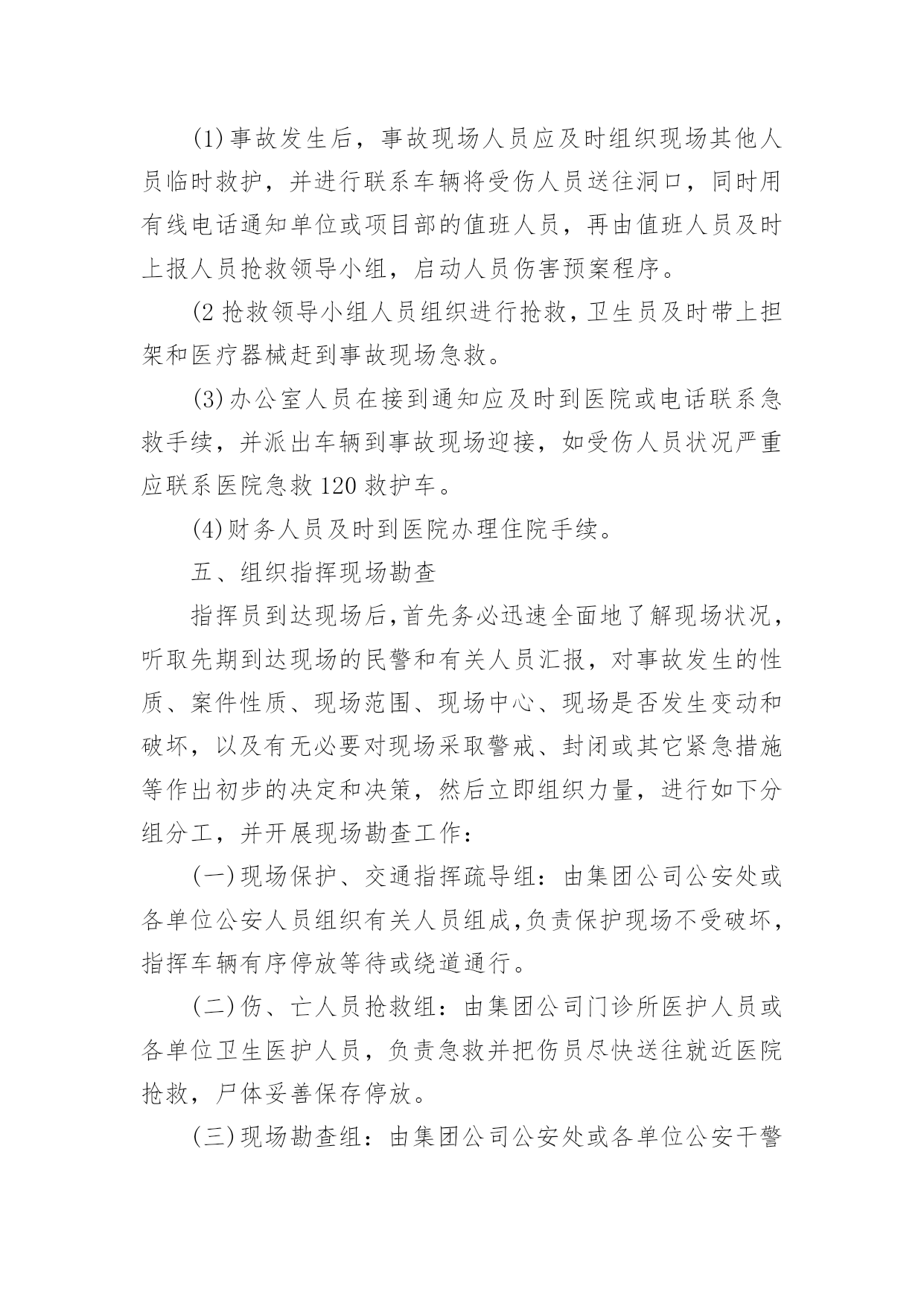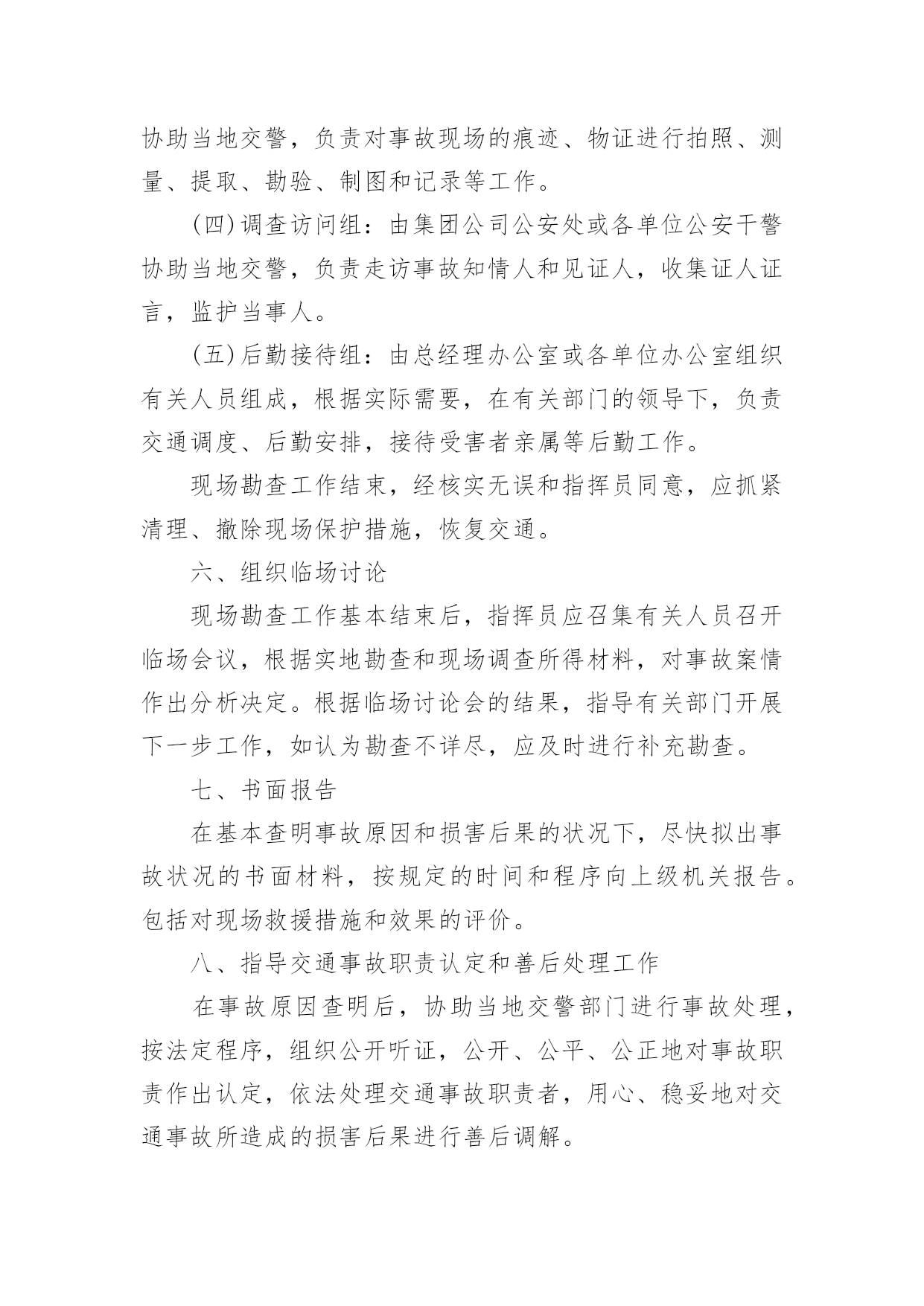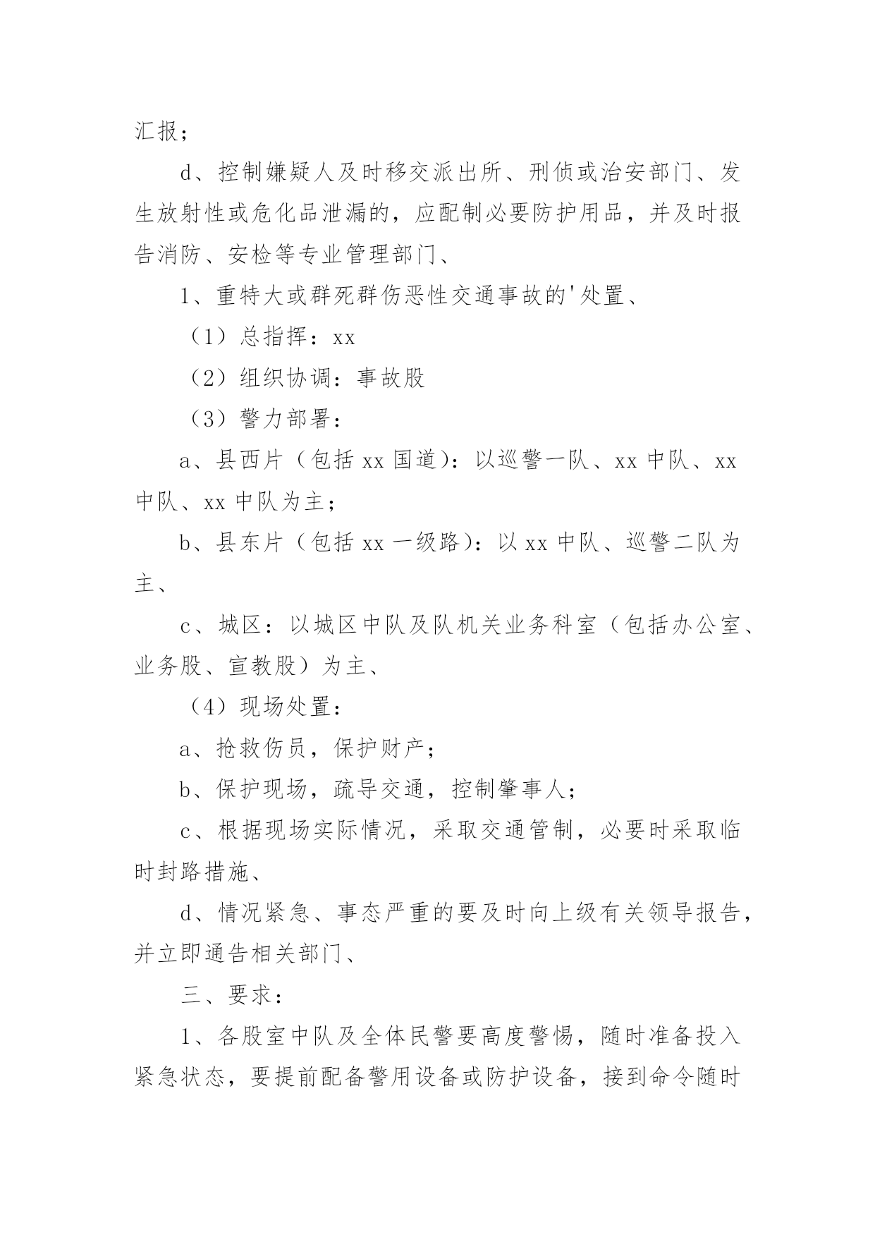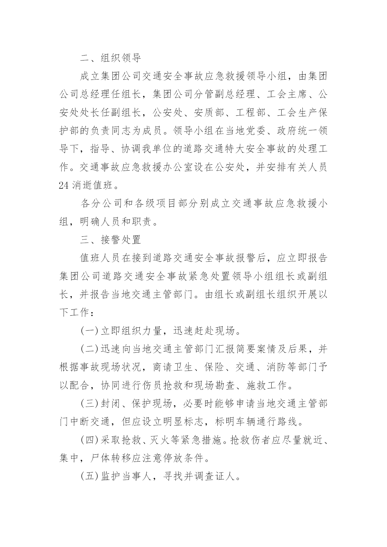 道路运输交通事故应急预案道路运输交通事故应急预案在平凡的学习、工作、生活中,难免会发生一些不在自己预料之中的事件,为了控制事故的发展势态,可能需要提前进行应急预案编制工作。你知道什么样的应急预案才能切实地帮助到我们吗?以下是小编收集整理的道路运输交通事故应急预案,供大家参考借鉴,希望可以帮助到有需要的朋友。道路运输交通事故应急预案1一、制定本预案的目的、依据。为确保幼儿园的安全和稳定,有效地处置突发事件,建立统一指挥,职责明确,运转有序,反应迅速、处置有力的'应急处置体系,最大限度降低事件的危害,维护和保障我园教育、教学工作的正常进行。二、设立应急工作领导小组。遵照安全管理的要求,设立乐乐幼儿园成立应急工作领导小组,名单如下:组长:朱宝珍(园长)副组长:卢艳(副园长)组员:柳萍徐静邱盼邱桂香领导小组职责:负责指挥协调突发事件应急工作。三、实施方案1、报警程序:A、发生交通安全事件时,现场人员马上通知交警和幼儿园领导小组。B、拨打112报警电话,幼儿园交通事故,车号为,请迅速前来救援。2、启动应急指挥部。(指挥部下设三个职能机构小组,负责突发事件应急工作的组织与实施。)(1)、指挥组人员、职能。成员:现场总指挥由园长担任,园长不在由安全主任或当值的行政领导担任。职责:接到报警,立即组织人员到事发现场,全面负责指挥处置工作,总指挥选择的集合地即为指挥中心。(2)、控制组成员:余斤海(组长)、及其他保卫人员职责:1)负责设置警戒线。2)广播疏散围观人员。3)作好疏导--到路口引导救护车、交警进入现场;4)保持通讯顺畅,杜绝无关人员进入现场。四、善后处理工作1、积极协助有关单位、部门对事件进行调查,作好事件的调查记录。2、及时与有关人员、部门沟通,做好记录。3、尽快恢复正常的教学秩序。五、有关联系电话交警电话112火警电话:119救护电话:120道路运输交通事故应急预案2一、组织领导组长:副组长:成员:各股室中队长二、应急处置1、春运期间,发生严重交通堵塞、人员伤亡、财产损失及道路上发生易燃易爆危化品等突发事件的处置,交通应急预案4篇、(1)总指挥:大队当日值班领导(2)组织协调:秩序股(3)警力部署指挥县西片(包括xx国道)指挥:县东片(包括xx一级路):指挥:城区:、(4)现场处置:a、组织民警上路;b、疏散群众,现场疏堵或警戒;c、事态严重的,立即上报上级领导;及时向有关部门汇报;d、控制嫌疑人及时移交派出所、刑侦或治安部门、发生放射性或危化品泄漏的,应配制必要防护用品,并及时报告消防、安检等专业管理部门、1、重特大或群死群伤恶性交通事故的'处置、(1)总指挥:xx(2)组织协调:事故股(3)警力部署:a、县西片(包括xx国道):以巡警一队、xx中队、xx中队、xx中队为主;b、县东片(包括xx一级路):以xx中队、巡警二队为主、c、城区:以城区中队及队机关业务科室(包括办公室、业务股、宣教股)为主、(4)现场处置:a、抢救伤员,保护财产;b、保护现场,疏导交通,控制肇事人;c、根据现场实际情况,采取交通管制,必要时采取临时封路措施、d、情况紧急、事态严重的要及时向上级有关领导报告,并立即通告相关部门、三、要求:1、各股室中队及全体民警要高度警惕,随时准备投入紧急状态,要提前配备警用设备或防护设备,接到命令随时出警、2、全队要保持政令畅通、每位民警特别是股级以上负责人要保持24小时通讯畅通;值班领导、值班民警要坚守工作岗位,做好值班记录,一有警情要立即通知相关领导或相关股室中队负责人,做到严阵以待,警令畅通,接到命令,迅速出警、3、现场指挥为应急处置的最高责任人,除做好应急处置现场的指挥外,有权随时调动全队各个警力、各股室中队长及每位民警都要随时听从指挥,服从调动,确保各项应急措施落到实处。道路运输交通事故应急预案3为维护广大员工的生命财产安全,及时、妥善处理我单位发生的特大道路交通事故(死亡3人以上),减少交通事故损失,根据《中华人民共和国道路交通管理条例》、《道路交通事故处理办法》以及《国务院关于特大安全事故行政职责追究的规定》等法规的规定,特制订本预案。一、应急预案的任务和目标更好地适应法律和经济活动的要求;给企业员工的工作和施工场区周围居民带给更好更安全的环境;保证各种应急资源处于良好的备战状态;指导应急行动按计划有序地进行;防止因应急行动组织不力或现场救援工作的无序和混乱而延误事故的应急救援;有效地避免或降低人员伤亡和财产损失;帮忙实现应急行动的快速、有序、高效;充分体现应急救援的“应急精神”。二、组织领导成立集团公司交通安全事故应急救援领导小组,由集团公司总经理任组长,集团公司分管副总经理、工会主席、公安处处长任副组长,公安处、安质部、工程部、工会生产保护部的负责同志为成员。领导小组在当地党委、政府统一领导下,指