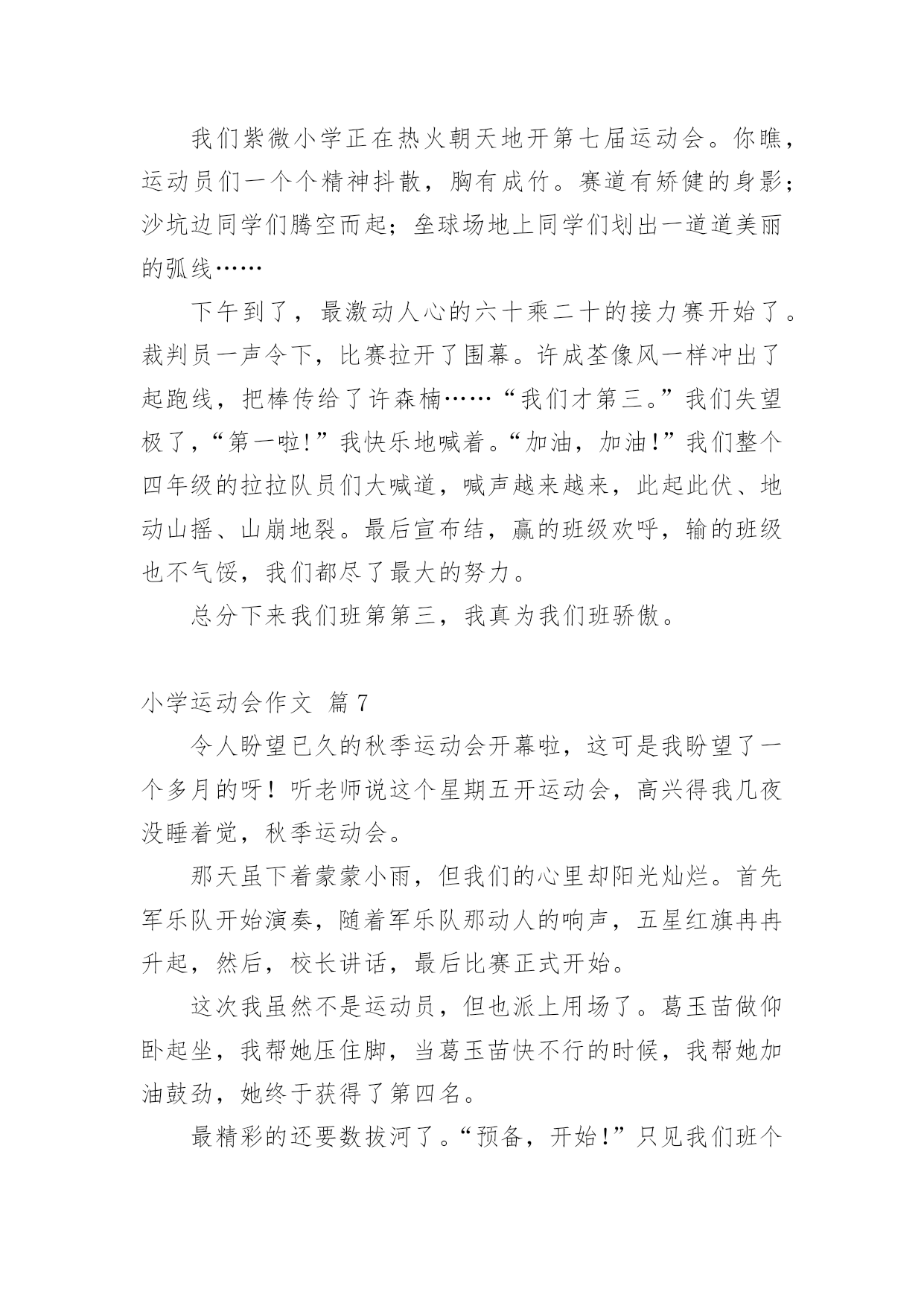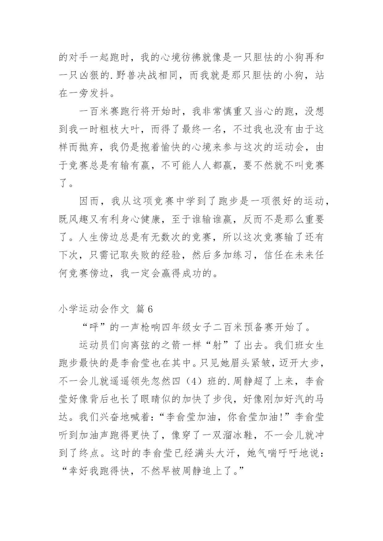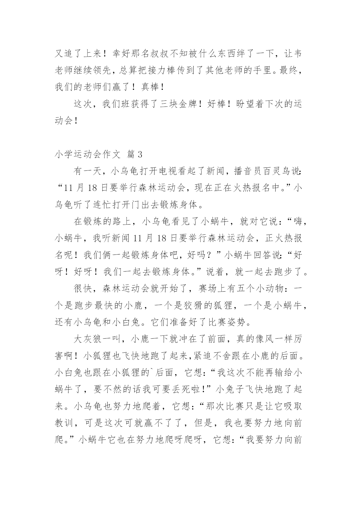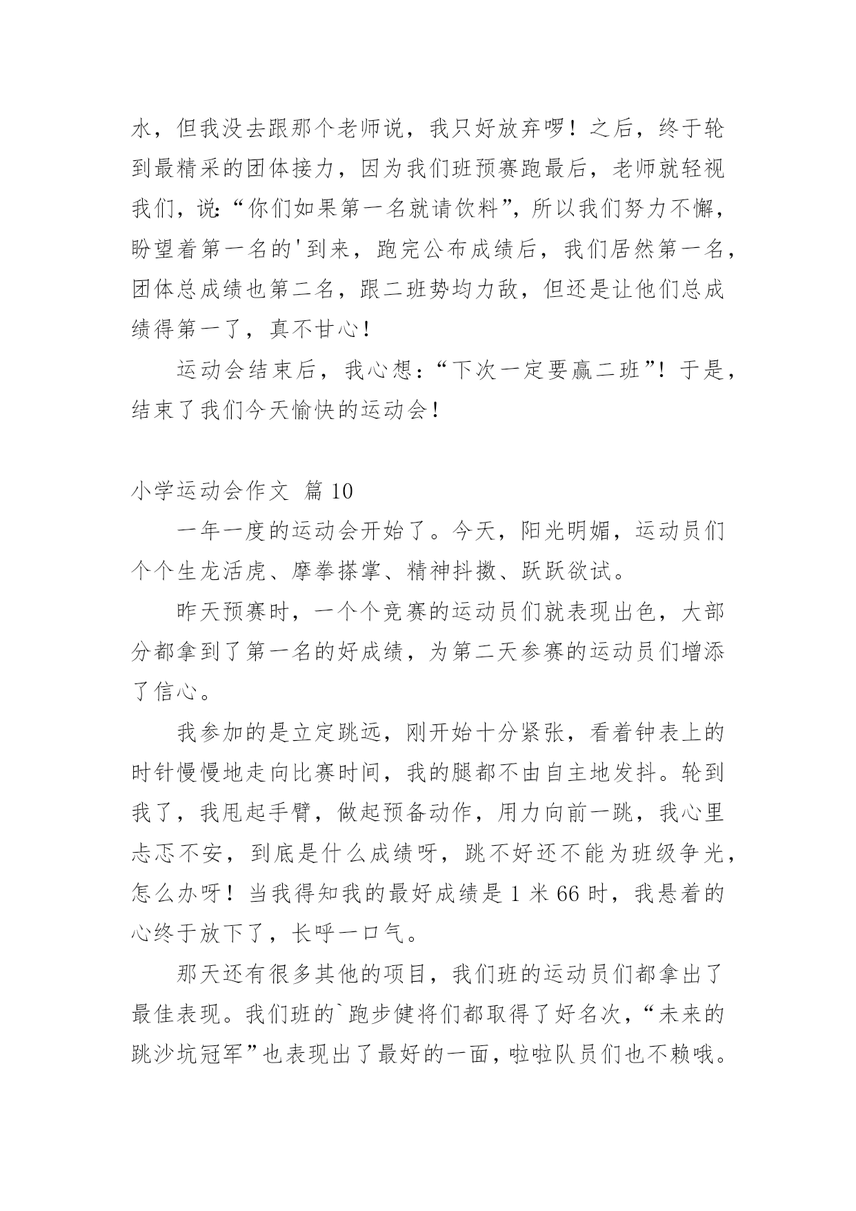 小学运动会作文(精华)小学运动会作文在平平淡淡的学习、工作、生活中,大家都有写作文的经历,对作文很是熟悉吧,借助作文人们可以实现文化交流的目的。那么,怎么去写作文呢?下面是小编帮大家整理的小学运动会作文10篇,欢迎大家分享。小学运动会作文篇1今天是十月二十八日,是本校的运动大会,我相信今天一定会是一个热闹精采的好日子,开幕的时间到了,操场旁挤满人山人海的观众,我的心理涌起满满的自信,坚信自己今天一定会有出色的表现。我第一个上场的活动是个人赛跑,哇!听到“赛跑”我的身体就会起鸡皮疙瘩,因为赛跑是我最不拿手的项目。“唉!就全力以赴吧!”我在心中暗暗为自己加油打气,枪声一响,我立刻勇往直前,朝终点飞奔,根本不顾虑其他同组的.同学,只管往前。最后,没想到我竟然拿到奖牌,这是我第一次拿奖牌啊!真是太令人兴奋啦!到了中午,全班在休息区吃午餐,一边吃一边聊每个人的辉煌战绩。转眼班级趣味竞赛又要上场了,这次我们的趣味竞赛是需要同组队员的团结合作,每个人都要尽力旋转前进,还要在中点咬颗糖果,糖果被埋在面粉堆里,所以一回到交棒区,不但人人头昏脑胀,每人的脸上还沾满面粉,活像一堆小丑,真是好笑啊!运动会接近尾声了,大家虽然精疲力尽,但是脸上都布满快乐的笑容,每人都有各自的好成绩,我也获得破天荒第一次的赛跑“铜牌”,这次的运动会一定会深深留在我的脑海里。小学运动会作文篇2星期五下午,我们举行了运动会。运动会的项目有跳远、200米跑步、100米跑步、50米跑步、50×10接力、投沙包等。首先是开幕式,我们分成了几个队伍出场,分别是跳绳队、羽毛球队、乒乓球队、击剑队、跆拳道队、踢毽子队、篮球队和足球队。我是跳绳队的,便在候场时走到了队伍里。轮到我们出场的时候,我们便奋力跳绳,尽量把自己最好的.一面展示给大家。我渐渐觉得有些体力不支了,但看到大家都在努力,我身体里的热血都在沸腾!我想:我一定要努力,大家都很辛苦,我不能那么容易被击垮!总算是坚持下来了,我一屁股坐在了草坪上,可真是筋疲力尽了!接着是表演队的表演,她们跳的舞可真好看!这次还有一场家校接力赛,由学校的老师组成一队,家长组成一队接力,首先是一名体育老师,他跑得真快!那名家长追不上了。传着传着,就变成韦老师跑了,韦老师奋力地跑着,几乎使出了全身的力气,把那名强壮的叔叔甩掉了。眼看只剩两米就可以到下一名老师那里了,那名强壮的叔叔又追了上来!幸好那名叔叔不知被什么东西绊了一下,让韦老师继续领先,总算把接力棒传到了其他老师的手里。最终,我们的老师们赢了!真棒!这次,我们班获得了三块金牌!好棒!盼望着下次的运动会!小学运动会作文篇3有一天,小乌龟打开电视看起了新闻,播音员百灵鸟说:“11月18日要举行森林运动会,现在正在火热报名中。”小乌龟听了连忙打开门出去锻炼身体。在锻炼的路上,小乌龟看见了小蜗牛,就对它说:“嗨,小蜗牛,我听新闻11月18日要举行森林运动会,正火热报名呢!我们俩一起锻炼身体吧,好吗?”小蜗牛回答说:“好呀!好呀!我们一起去锻炼身体。”说着,就一起去跑步了。很快,森林运动会就开始了,赛场上有五个小动物:一个是跑步最快的小鹿,一个是狡猾的狐狸,一个是小蜗牛,还有小乌龟和小白兔。它们准备好了比赛姿势。大灰狼一叫,小鹿一下就冲在了前面,真的像风一样厉害啊!小狐狸也飞快地跑了起来,紧追不舍跟在小鹿的后面。小白兔也跟在小狐狸的`后面,它想:“我这次不能再输给小蜗牛了,要不然的话我可要丢死啦!”小兔子飞快地跑了起来。小乌龟也努力地爬着,它想:“那次比赛只是让它吸取教训,可是这次可就赢不了了,但是,我也要努力地向前爬。”小蜗牛它也在努力地爬呀爬呀,它想:“我要努力向前爬呀,就算得不了第一名、第二名、第三名,我也要努力。”前三名小动物已经评选出来了,第一名是小鹿,第二名是小狐狸,第三名是小白兔,三个小动物捧着奖牌高高兴兴地回家了。百灵鸟说:“下面我们再看看小乌龟和小蜗牛的比赛吧。”小乌龟慢慢吞吞地爬到了终点。小乌龟说:“好累呀,赶紧回家吃饭吧,要不然的话我可是太累太累了。”小乌龟回到家后,吃完饭就睡觉了。小蜗牛到了晚上才爬到了终点,它的家长说:“孩子,我送你一个大拥抱。”小蜗牛最后和家长高高兴兴地回家了。小学运动会作文篇4当校园那高高的旗杆轻轻地揭开了夜的面纱,彩云用双手托起那轮金色的太阳时,一年一度的'运动会开始了。我们戴着头巾,穿着班服,踏着整齐的步伐,缓缓地步入了操场。我们班经过主席台前喊起了口号:三(3)三(3),绝不一般,齐心协力,勇夺桂冠!接着绕着操场整齐有序地走了一圈,然后回到了指定的位置上。当校长宣布运动会开幕时,全场顿时沸腾起来,瞬间想起了雷鸣般的掌声。退场、休息后,比赛正式拉开了序幕。项目一个接一个的有序进行着。接力赛终于开始了,只听一声令下:预备,跑!只见一个身影脱颖而出,她就是