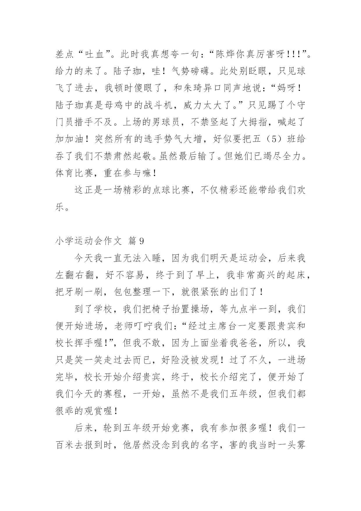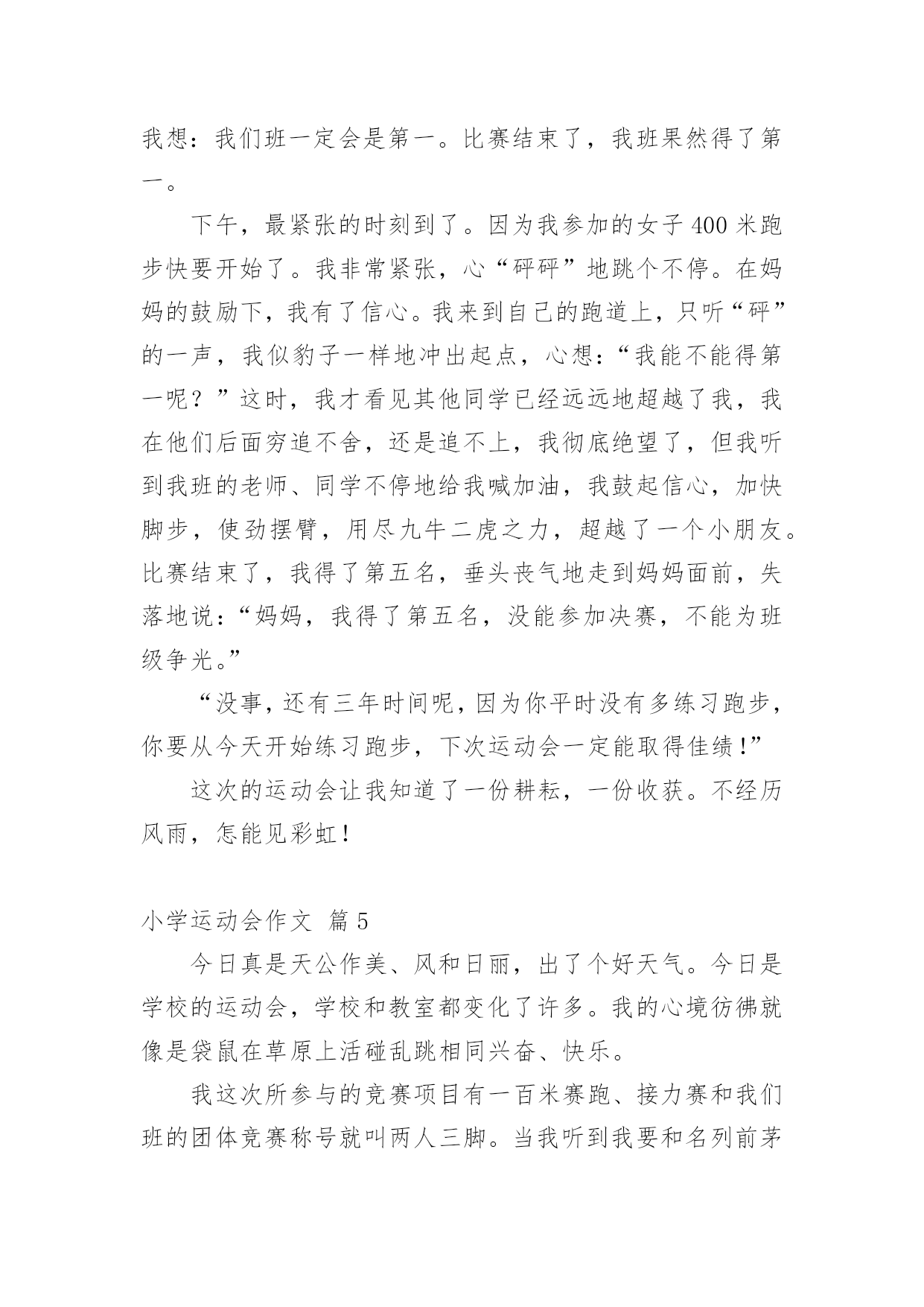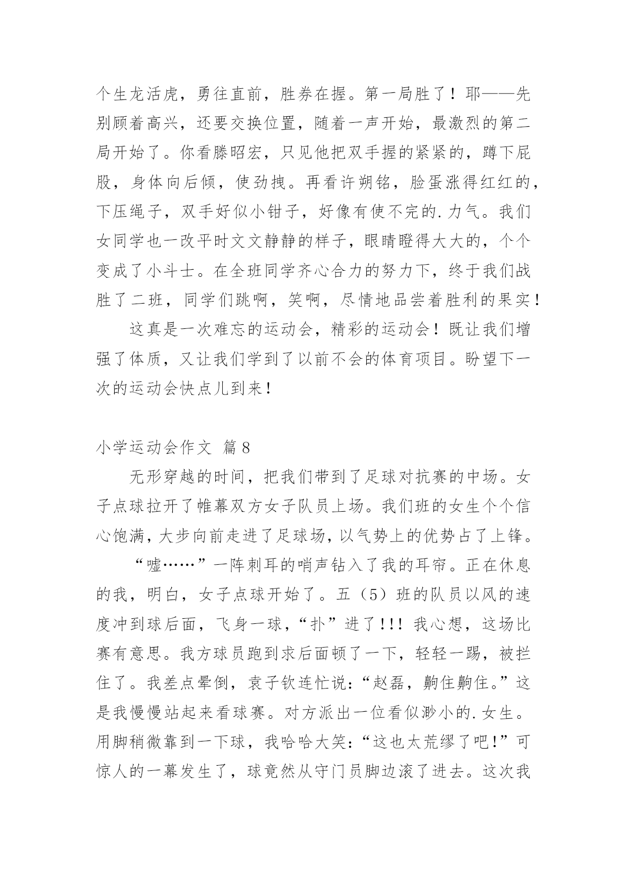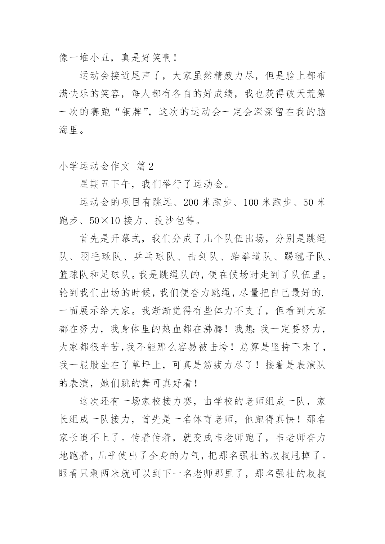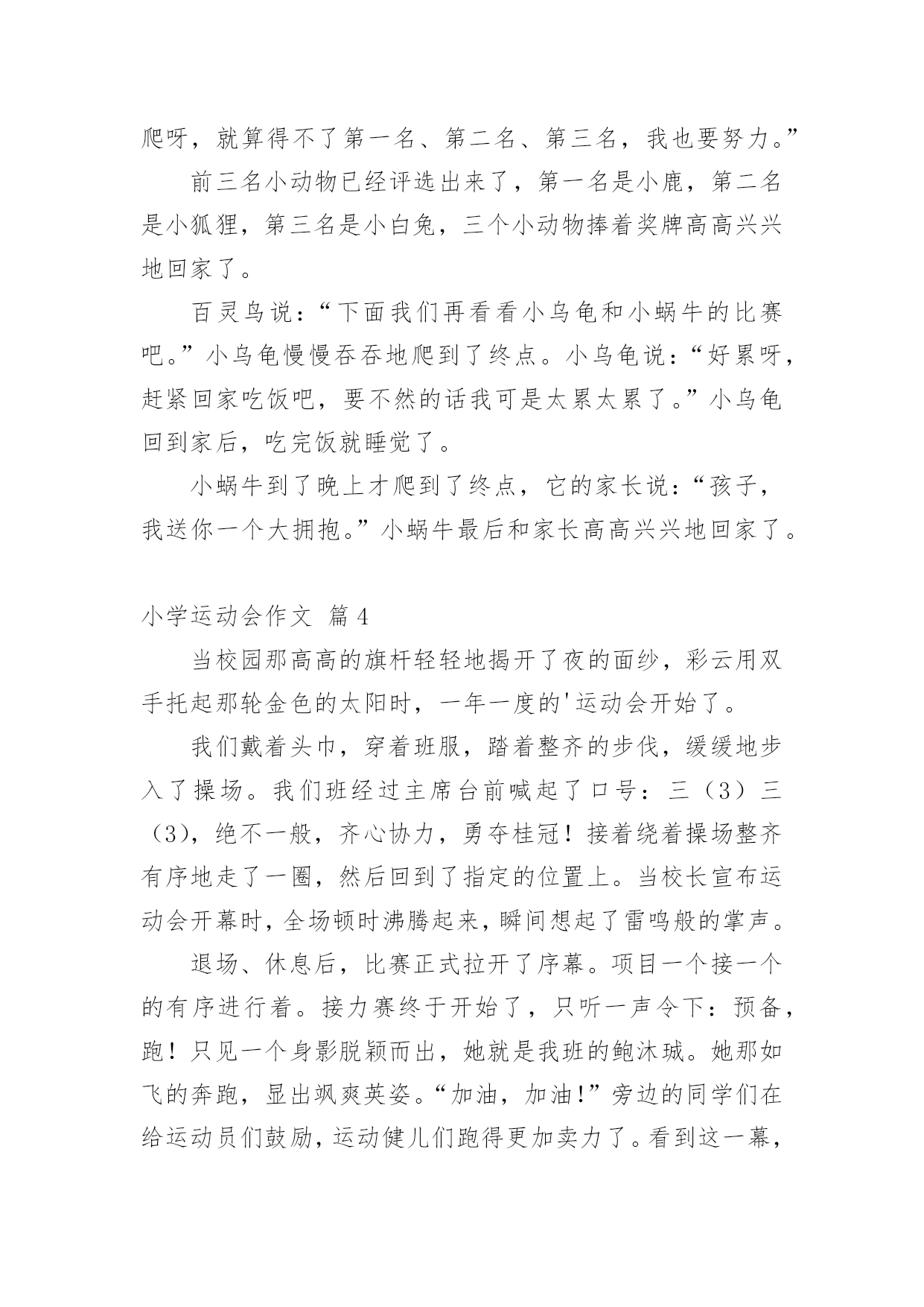 小学运动会作文(精华)小学运动会作文在平平淡淡的学习、工作、生活中,大家都有写作文的经历,对作文很是熟悉吧,借助作文人们可以实现文化交流的目的。那么,怎么去写作文呢?下面是小编帮大家整理的小学运动会作文10篇,欢迎大家分享。小学运动会作文篇1今天是十月二十八日,是本校的运动大会,我相信今天一定会是一个热闹精采的好日子,开幕的时间到了,操场旁挤满人山人海的观众,我的心理涌起满满的自信,坚信自己今天一定会有出色的表现。我第一个上场的活动是个人赛跑,哇!听到“赛跑”我的身体就会起鸡皮疙瘩,因为赛跑是我最不拿手的项目。“唉!就全力以赴吧!”我在心中暗暗为自己加油打气,枪声一响,我立刻勇往直前,朝终点飞奔,根本不顾虑其他同组的.同学,只管往前。最后,没想到我竟然拿到奖牌,这是我第一次拿奖牌啊!真是太令人兴奋啦!到了中午,全班在休息区吃午餐,一边吃一边聊每个人的辉煌战绩。转眼班级趣味竞赛又要上场了,这次我们的趣味竞赛是需要同组队员的团结合作,每个人都要尽力旋转前进,还要在中点咬颗糖果,糖果被埋在面粉堆里,所以一回到交棒区,不但人人头昏脑胀,每人的脸上还沾满面粉,活像一堆小丑,真是好笑啊!运动会接近尾声了,大家虽然精疲力尽,但是脸上都布满快乐的笑容,每人都有各自的好成绩,我也获得破天荒第一次的赛跑“铜牌”,这次的运动会一定会深深留在我的脑海里。小学运动会作文篇2星期五下午,我们举行了运动会。运动会的项目有跳远、200米跑步、100米跑步、50米跑步、50×10接力、投沙包等。首先是开幕式,我们分成了几个队伍出场,分别是跳绳队、羽毛球队、乒乓球队、击剑队、跆拳道队、踢毽子队、篮球队和足球队。我是跳绳队的,便在候场时走到了队伍里。轮到我们出场的时候,我们便奋力跳绳,尽量把自己最好的.一面展示给大家。我渐渐觉得有些体力不支了,但看到大家都在努力,我身体里的热血都在沸腾!我想:我一定要努力,大家都很辛苦,我不能那么容易被击垮!总算是坚持下来了,我一屁股坐在了草坪上,可真是筋疲力尽了!接着是表演队的表演,她们跳的舞可真好看!这次还有一场家校接力赛,由学校的老师组成一队,家长组成一队接力,首先是一名体育老师,他跑得真快!那名家长追不上了。传着传着,就变成韦老师跑了,韦老师奋力地跑着,几乎使出了全身的力气,把那名强壮的叔叔甩掉了。眼看只剩两米就可以到下一名老师那里了,那名强壮的叔叔又追了上来!幸好那名叔叔不知被什么东西绊了一下,让韦老师继续领先,总算把接力棒传到了其他老师的手里。最终,我们的老师们赢了!真棒!这次,我们班获得了三块金牌!好棒!盼望着下次的运动会!小学运动会作文篇3有一天,小乌龟打开电视看起了新闻,播音员百灵鸟说:“11月18日要举行森林运动会,现在正在火热报名中。”小乌龟听了连忙打开门出去锻炼身体。在锻炼的路上,小乌龟看见了小蜗牛,就对它说:“嗨,小蜗牛,我听新闻11月18日要举行森林运动会,正火热报名呢!我们俩一起锻炼身体吧,好吗?”小蜗牛回答说:“好呀!好呀!我们一起去锻炼身体。”说着,就一起去跑步了。很快,森林运动会就开始了,赛场上有五个小动物:一个是跑步最快的小鹿,一个是狡猾的狐狸,一个是小蜗牛,还有小乌龟和小白兔。它们准备好了比赛姿势。大灰狼一叫,小鹿一下就冲在了前面,真的像风一样厉害啊!小狐狸也飞快地跑了起来,紧追不舍跟在小鹿的后面。小白兔也跟在小狐狸的`后面,它想:“我这次不能再输给小蜗牛了,要不然的话我可要丢死啦!”小兔子飞快地跑了起来。小乌龟也努力地爬着,它想:“那次比赛只是让它吸取教训,可是这次可就赢不了了,但是,我也要努力地向前爬。”小蜗牛它也在努力地爬呀爬呀,它想:“我要努力向前爬呀,就算得不了第一名、第二名、第三名,我也要努力。”前三名小动物已经评选出来了,第一名是小鹿,第二名是小狐狸,第三名是小白兔,三个小动物捧着奖牌高高兴兴地回家了。百灵鸟说:“下面我们再看看小乌龟和小蜗牛的比赛吧。”小乌龟慢慢吞吞地爬到了终点。小乌龟说:“好累呀,赶紧回家吃饭吧,要不然的话我可是太累太累了。”小乌龟回到家后,吃完饭就睡觉了。小蜗牛到了晚上才爬到了终点,它的家长说:“孩子,我送你一个大拥抱。”小蜗牛最后和家长高高兴兴地回家了。小学运动会作文篇4当校园那高高的旗杆轻轻地揭开了夜的面纱,彩云用双手托起那轮金色的太阳时,一年一度的'运动会开始了。我们戴着头巾,穿着班服,踏着整齐的步伐,缓缓地步入了操场。我们班经过主席台前喊起了口号:三(3)三(3),绝不一般,齐心协力,勇夺桂冠!接着绕着操场整齐有序地走了一圈,然后回到了指定的位置上。当校长宣布运动会开幕时,全场顿时沸腾起来,瞬间想起了雷鸣般的掌声。退场、休息后,比赛正式拉开了序幕。项目一个接一个的有序进行着。接力赛终于开始了,只听一声令下:预备,跑!只见一个身影脱颖而出,她就是