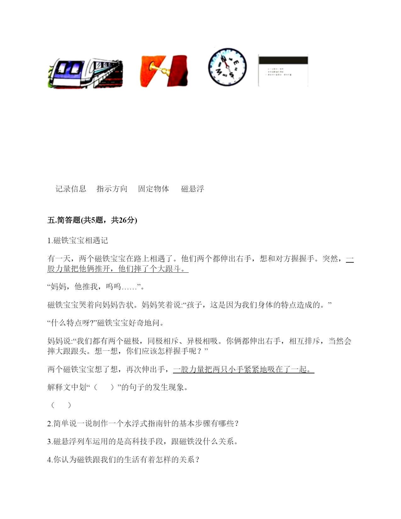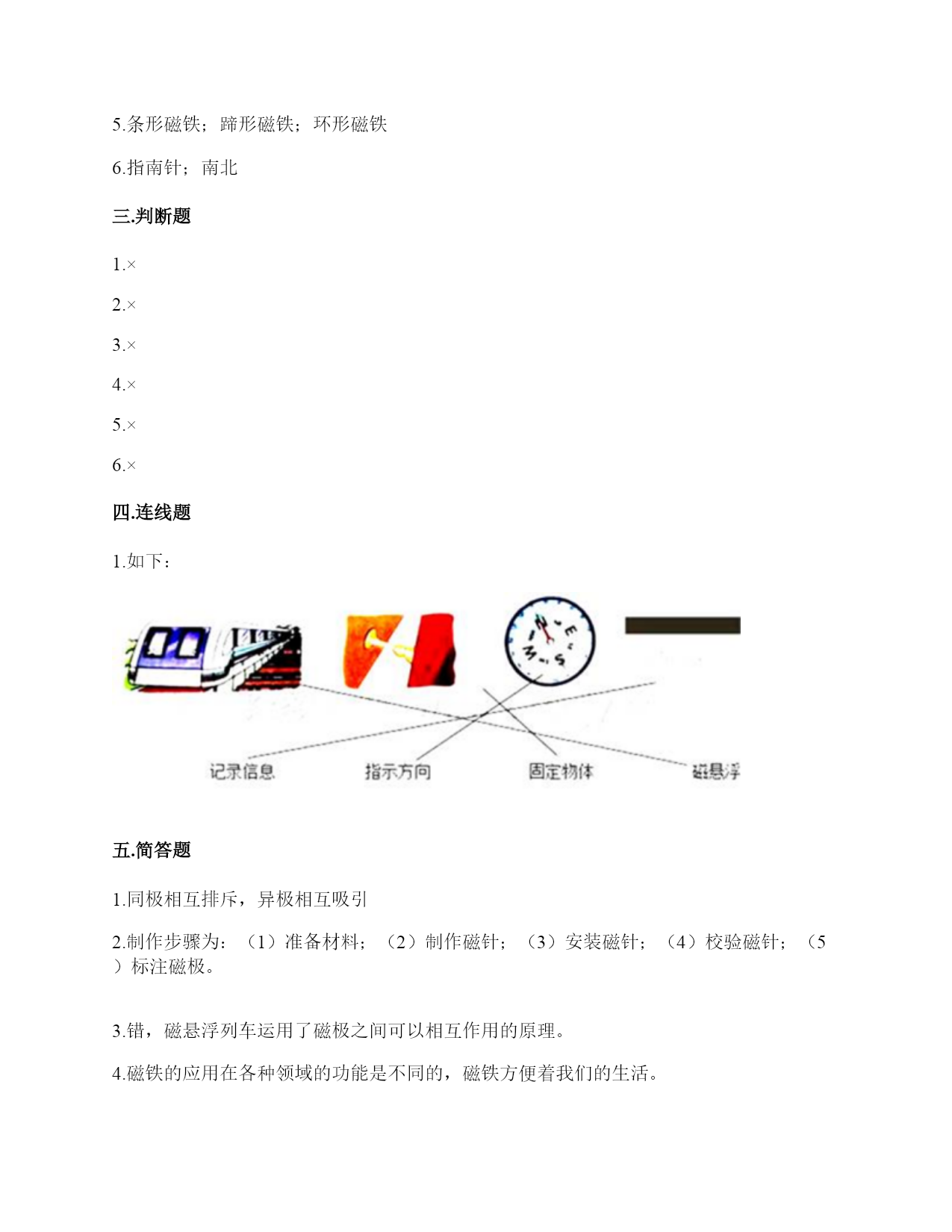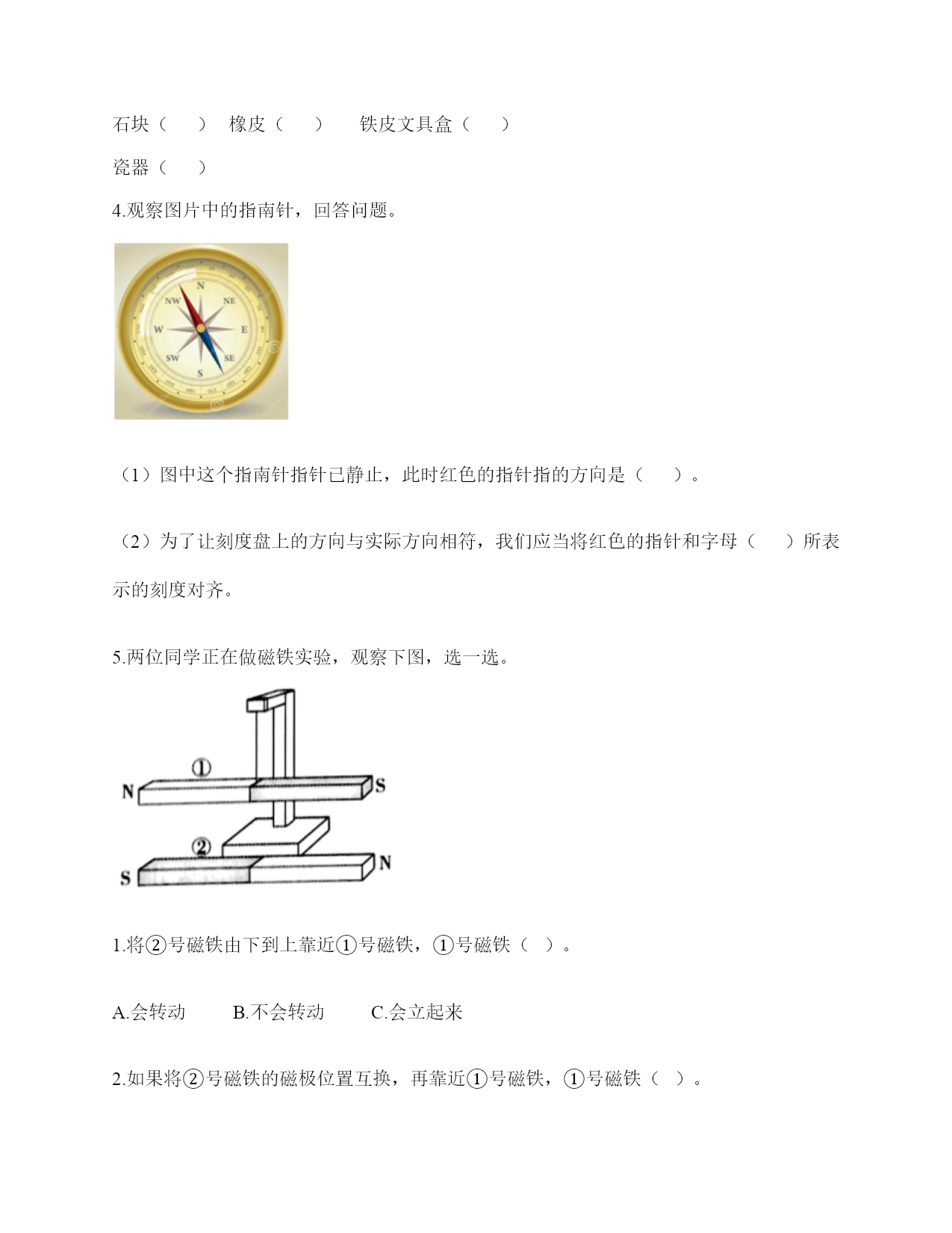 小学科学《磁铁》练习题一.选择题(共6题,共12分)1.下列物品利用的原理与磁悬浮列车相同的是()。A.B.C.2.下列物体中,()不能被磁铁吸引。A.B.C.3.将一颗小钢珠放在磁力非常强的条形磁铁的中间,松开手,小钢珠会()A.掉下来B.滚向一端C.不动4.下面的材料中,不适合用来制作水浮式指南针的是()。A.灯芯草B.金属薄片C.吹塑纸5.下列是水浮式指南针的是()。A.B.C.6.将下列物体与指南针放在一起,不会影响指南针正确指示方向的是()。A.铁钉B.蹄形磁铁C.塑料尺二.填空题(共6题,共26分)1.我国古代四大发明之一是应用磁铁可以指示方向的性质制成的,它是()。2.磁铁上()的部分叫磁极,磁铁有两个磁极。指北的磁极叫北极(用字母()表示),指南的磁极叫南极(用字母()表示)。3.磁铁从形状上看可以分为()磁铁、蹄形磁铁、()磁铁、()磁铁等等。4.磁铁磁性最强的地方是()。5.磁铁有不同的外形,常见的有()、()、和()。6.()是我国古代四大发明之一,它是根据磁铁能够指示()的特点制成的。三.判断题(共6题,共12分)1.将两块磁铁的磁极相互靠近,它们之间的相互作用有两种情况。()2.磁带中并没有磁铁。()3.无论距离多远,磁铁都可以吸引铁制小车。()4.磁铁都有两个磁极,S极和南极。()5.隔着水是不能使小车动起来的。()6.条形磁铁磁力最大是中间位置。()四.连线题(共1题,共4分)1.请将生活中的物品与对应的磁铁的作用连线。记录信息指示方向固定物体磁悬浮五.简答题(共5题,共26分)1.磁铁宝宝相遇记有一天,两个磁铁宝宝在路上相遇了。他们两个都伸出右手,想和对方握握手。突然,一股力量把他俩推开,他们摔了个大跟斗。“妈妈,他推我,呜呜……”。磁铁宝宝哭着向妈妈告状。妈妈笑着说:“孩子,这是因为我们身体的特点造成的。”“什么特点呀?”磁铁宝宝好奇地问。妈妈说:“我们都有两个磁极,同极相斥、异极相吸。你俩都伸出右手,相互排斥,当然会摔大跟跟头。想一想,你们应该怎样握手呢?”两个磁铁宝宝想了想,再次伸出手,一股力量把两只小手紧紧地吸在了一起。解释文中划“()”的句子的发生现象。()2.简单说一说制作一个水浮式指南针的基本步骤有哪些?3.磁悬浮列车运用的是高科技手段,跟磁铁没什么关系。4.你认为磁铁跟我们的生活有着怎样的关系?5.在制作水浮式指南针时,为什么要用磁铁摩擦钢针?六.综合题(共5题,共32分)1.制作水浮式指南针所用的材料都有什么作用?把相应的序号填在右图中。①让磁针浮在水面,自由转动②确定方向,进而确定磁针的南北极③指示南北2.下列哪些物体含有磁铁?把含有磁铁的物体圈出来。3.下列物体哪些能被磁铁吸引?请在后面的括号里打上“√”纸片()铅笔()磁铁()图钉()回形针()小刀()小木块()布片()玻璃杯()铁钉()塑料小尺()铁锅()石块()橡皮()铁皮文具盒()瓷器()4.观察图片中的指南针,回答问题。(1)图中这个指南针指针已静止,此时红色的指针指的方向是()。(2)为了让刻度盘上的方向与实际方向相符,我们应当将红色的指针和字母()所表示的刻度对齐。5.两位同学正在做磁铁实验,观察下图,选一选。1.将②号磁铁由下到上靠近①号磁铁,①号磁铁()。A.会转动B.不会转动C.会立起来2.如果将②号磁铁的磁极位置互换,再靠近①号磁铁,①号磁铁()。A.会转动B.不会转动C.会立起来3.如果用蹄形磁铁的N极靠近①号磁铁的N极两块磁铁之间会相互()。A.吸引B.排斥4.从以上现象我们知道磁铁磁极间的相互作用规律是()。A.同极相吸,异极相斥B.同极相斥,异极相吸C.相同形状的磁铁相互排斥,不同形状的磁铁相互吸引参考答案一.选择题1.A2.B3.B4.A5.C6.C二.填空题1.指南针2.磁力最强;N;S3.条形;环形;球形4.磁极5.条形磁铁;蹄形磁铁;环形磁铁6.指南针;南北三.判断题1.×2.×3.×4.×5.×6.×四.连线题1.如下:五.简答题1.同极相互排斥,异极相互吸引2.制作步骤为:(1)准备材料;(2)制作磁针;(3)安装磁针;(4)校验磁针;(5)标注磁极。3.错,磁悬浮列车运用了磁极之间可以相互作用的原理。4.磁铁的应用在各种领域的功能是不同的,磁铁方便着我们的生活。5.为了让本来没有磁性的钢针变得有磁性。六.综合题1.②③①2.如下:3.磁铁(√)图钉(√)回形针(√)小刀(√)铁钉(√)铁锅(√)铁皮文具盒(√)4.(1)北;(2)N5.B;A;B;B