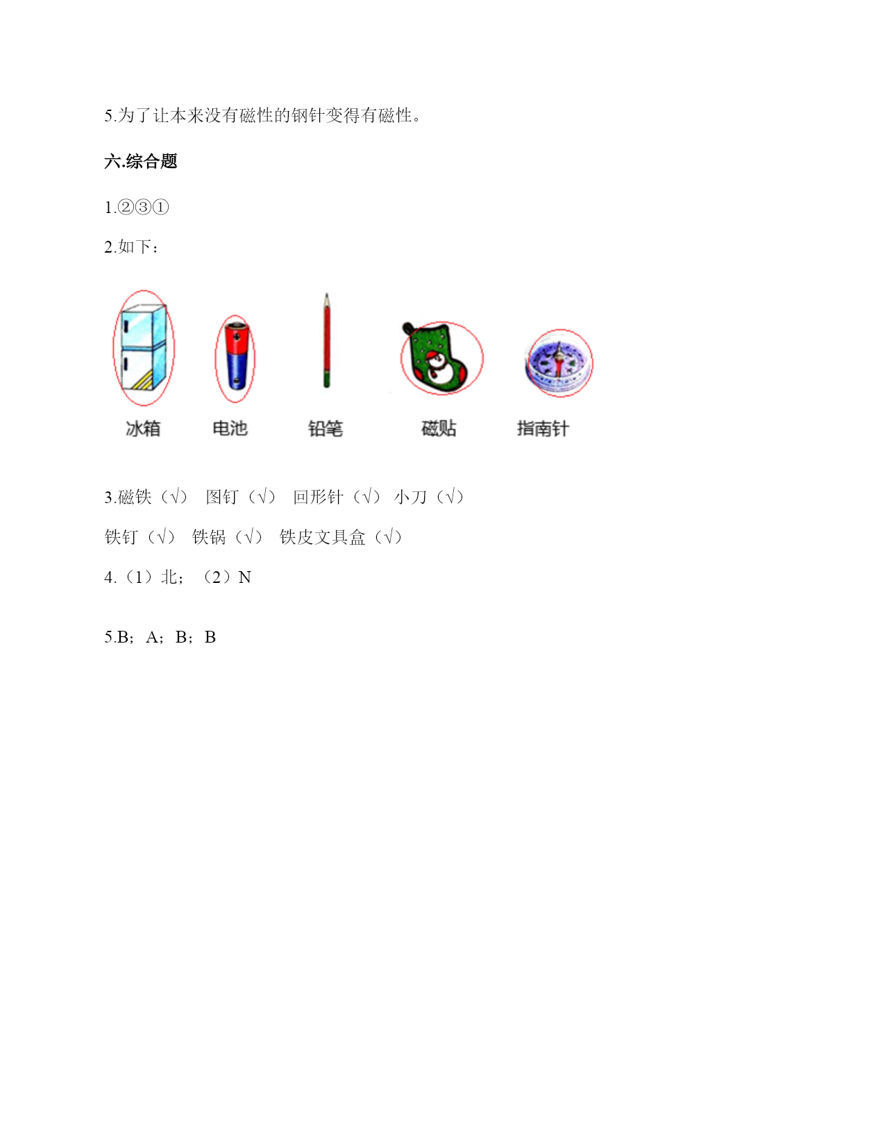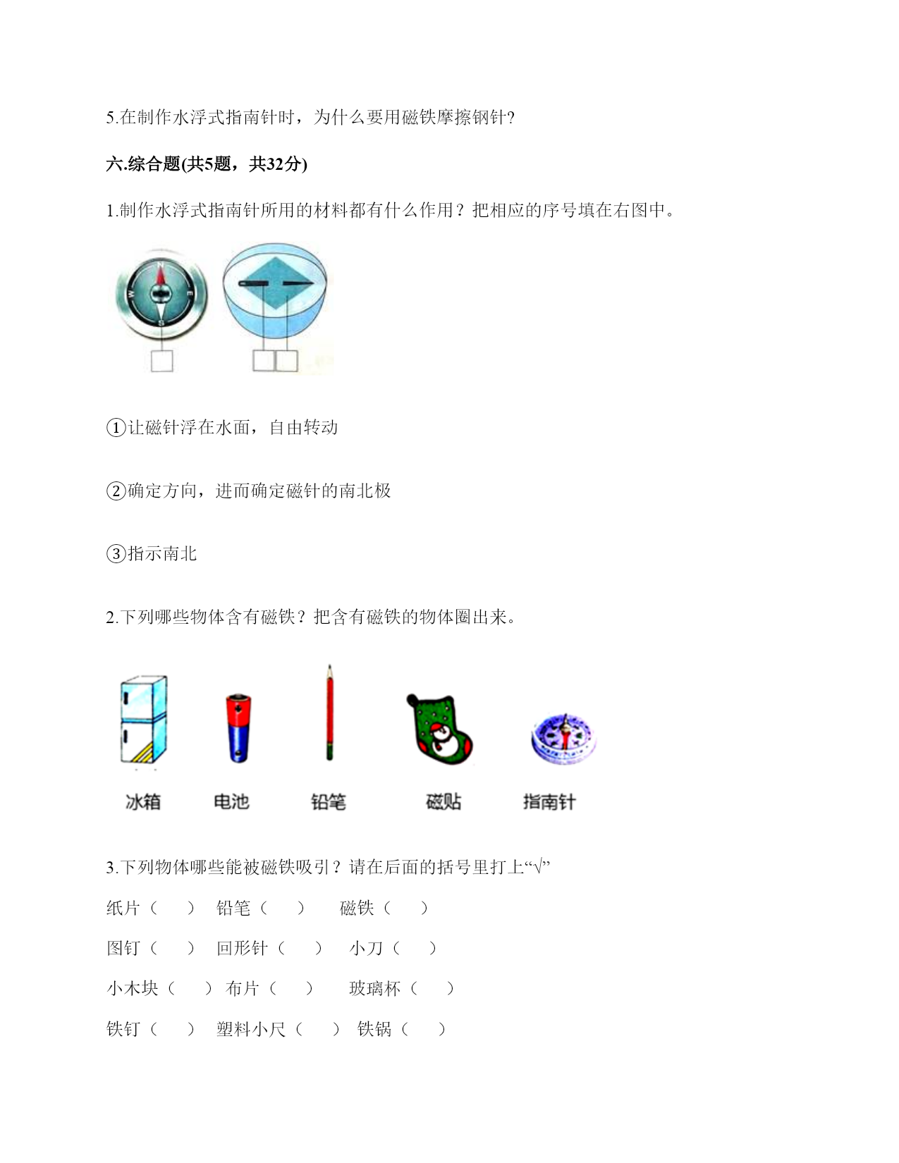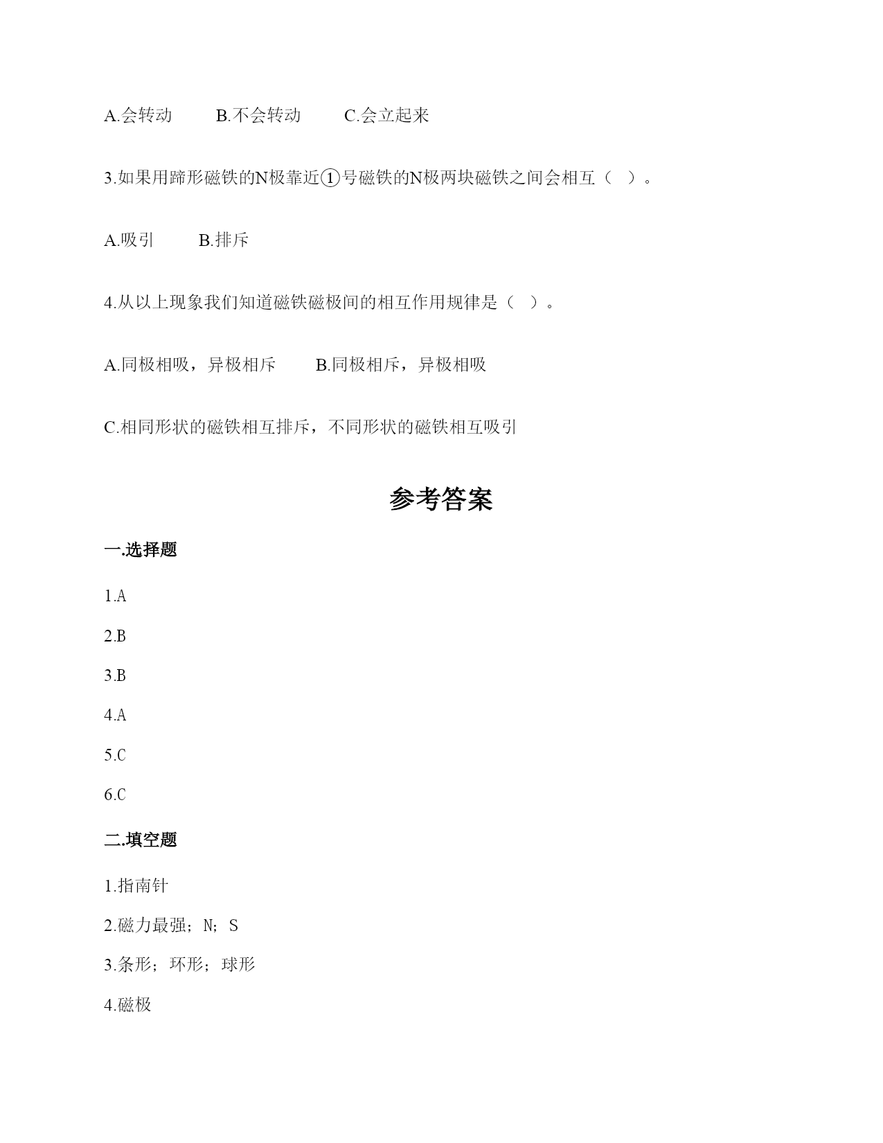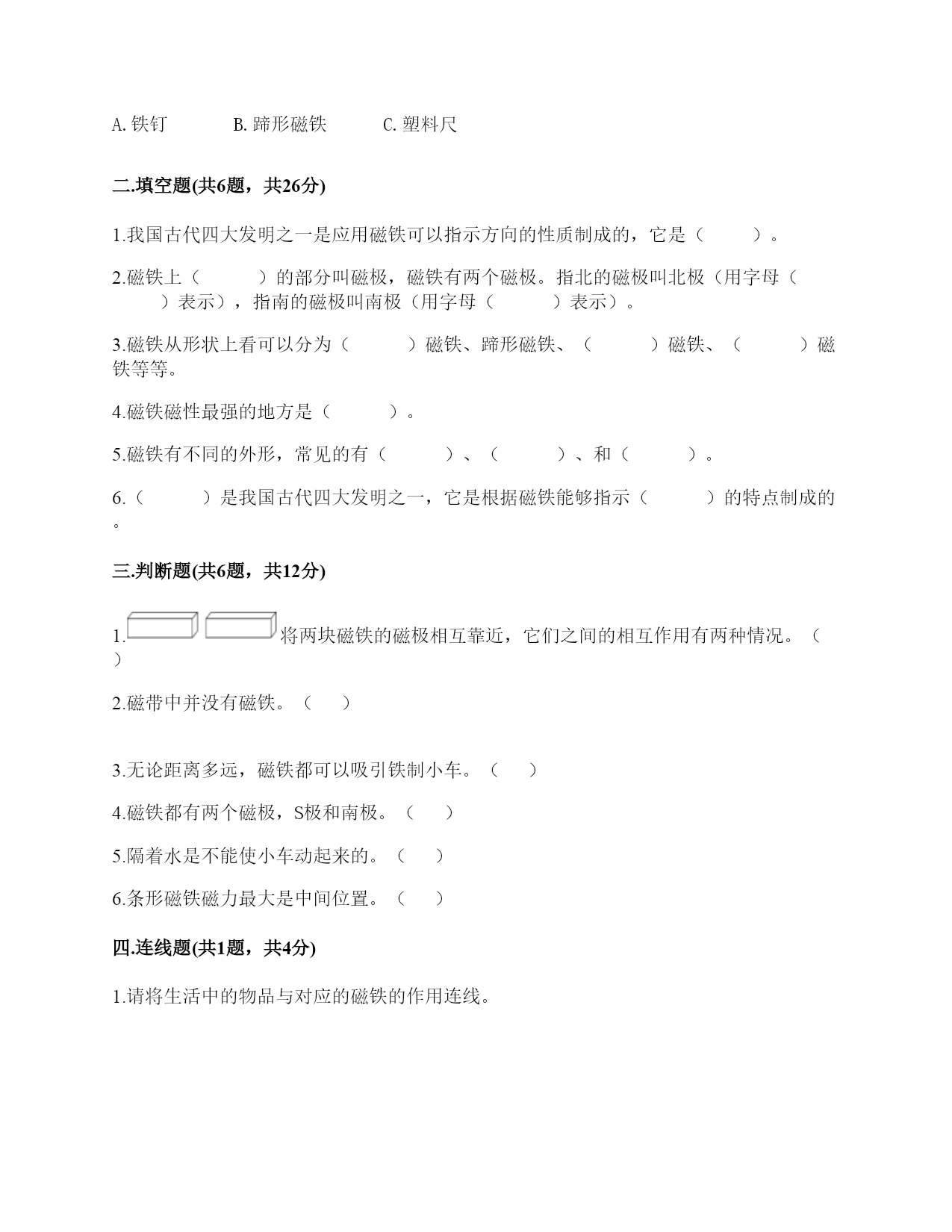 小学科学《磁铁》练习题一.选择题(共6题,共12分)1.下列物品利用的原理与磁悬浮列车相同的是()。A.B.C.2.下列物体中,()不能被磁铁吸引。A.B.C.3.将一颗小钢珠放在磁力非常强的条形磁铁的中间,松开手,小钢珠会()A.掉下来B.滚向一端C.不动4.下面的材料中,不适合用来制作水浮式指南针的是()。A.灯芯草B.金属薄片C.吹塑纸5.下列是水浮式指南针的是()。A.B.C.6.将下列物体与指南针放在一起,不会影响指南针正确指示方向的是()。A.铁钉B.蹄形磁铁C.塑料尺二.填空题(共6题,共26分)1.我国古代四大发明之一是应用磁铁可以指示方向的性质制成的,它是()。2.磁铁上()的部分叫磁极,磁铁有两个磁极。指北的磁极叫北极(用字母()表示),指南的磁极叫南极(用字母()表示)。3.磁铁从形状上看可以分为()磁铁、蹄形磁铁、()磁铁、()磁铁等等。4.磁铁磁性最强的地方是()。5.磁铁有不同的外形,常见的有()、()、和()。6.()是我国古代四大发明之一,它是根据磁铁能够指示()的特点制成的。三.判断题(共6题,共12分)1.将两块磁铁的磁极相互靠近,它们之间的相互作用有两种情况。()2.磁带中并没有磁铁。()3.无论距离多远,磁铁都可以吸引铁制小车。()4.磁铁都有两个磁极,S极和南极。()5.隔着水是不能使小车动起来的。()6.条形磁铁磁力最大是中间位置。()四.连线题(共1题,共4分)1.请将生活中的物品与对应的磁铁的作用连线。记录信息指示方向固定物体磁悬浮五.简答题(共5题,共26分)1.磁铁宝宝相遇记有一天,两个磁铁宝宝在路上相遇了。他们两个都伸出右手,想和对方握握手。突然,一股力量把他俩推开,他们摔了个大跟斗。“妈妈,他推我,呜呜……”。磁铁宝宝哭着向妈妈告状。妈妈笑着说:“孩子,这是因为我们身体的特点造成的。”“什么特点呀?”磁铁宝宝好奇地问。妈妈说:“我们都有两个磁极,同极相斥、异极相吸。你俩都伸出右手,相互排斥,当然会摔大跟跟头。想一想,你们应该怎样握手呢?”两个磁铁宝宝想了想,再次伸出手,一股力量把两只小手紧紧地吸在了一起。解释文中划“()”的句子的发生现象。()2.简单说一说制作一个水浮式指南针的基本步骤有哪些?3.磁悬浮列车运用的是高科技手段,跟磁铁没什么关系。4.你认为磁铁跟我们的生活有着怎样的关系?5.在制作水浮式指南针时,为什么要用磁铁摩擦钢针?六.综合题(共5题,共32分)1.制作水浮式指南针所用的材料都有什么作用?把相应的序号填在右图中。①让磁针浮在水面,自由转动②确定方向,进而确定磁针的南北极③指示南北2.下列哪些物体含有磁铁?把含有磁铁的物体圈出来。3.下列物体哪些能被磁铁吸引?请在后面的括号里打上“√”纸片()铅笔()磁铁()图钉()回形针()小刀()小木块()布片()玻璃杯()铁钉()塑料小尺()铁锅()石块()橡皮()铁皮文具盒()瓷器()4.观察图片中的指南针,回答问题。(1)图中这个指南针指针已静止,此时红色的指针指的方向是()。(2)为了让刻度盘上的方向与实际方向相符,我们应当将红色的指针和字母()所表示的刻度对齐。5.两位同学正在做磁铁实验,观察下图,选一选。1.将②号磁铁由下到上靠近①号磁铁,①号磁铁()。A.会转动B.不会转动C.会立起来2.如果将②号磁铁的磁极位置互换,再靠近①号磁铁,①号磁铁()。A.会转动B.不会转动C.会立起来3.如果用蹄形磁铁的N极靠近①号磁铁的N极两块磁铁之间会相互()。A.吸引B.排斥4.从以上现象我们知道磁铁磁极间的相互作用规律是()。A.同极相吸,异极相斥B.同极相斥,异极相吸C.相同形状的磁铁相互排斥,不同形状的磁铁相互吸引参考答案一.选择题1.A2.B3.B4.A5.C6.C二.填空题1.指南针2.磁力最强;N;S3.条形;环形;球形4.磁极5.条形磁铁;蹄形磁铁;环形磁铁6.指南针;南北三.判断题1.×2.×3.×4.×5.×6.×四.连线题1.如下:五.简答题1.同极相互排斥,异极相互吸引2.制作步骤为:(1)准备材料;(2)制作磁针;(3)安装磁针;(4)校验磁针;(5)标注磁极。3.错,磁悬浮列车运用了磁极之间可以相互作用的原理。4.磁铁的应用在各种领域的功能是不同的,磁铁方便着我们的生活。5.为了让本来没有磁性的钢针变得有磁性。六.综合题1.②③①2.如下:3.磁铁(√)图钉(√)回形针(√)小刀(√)铁钉(√)铁锅(√)铁皮文具盒(√)4.(1)北;(2)N5.B;A;B;B