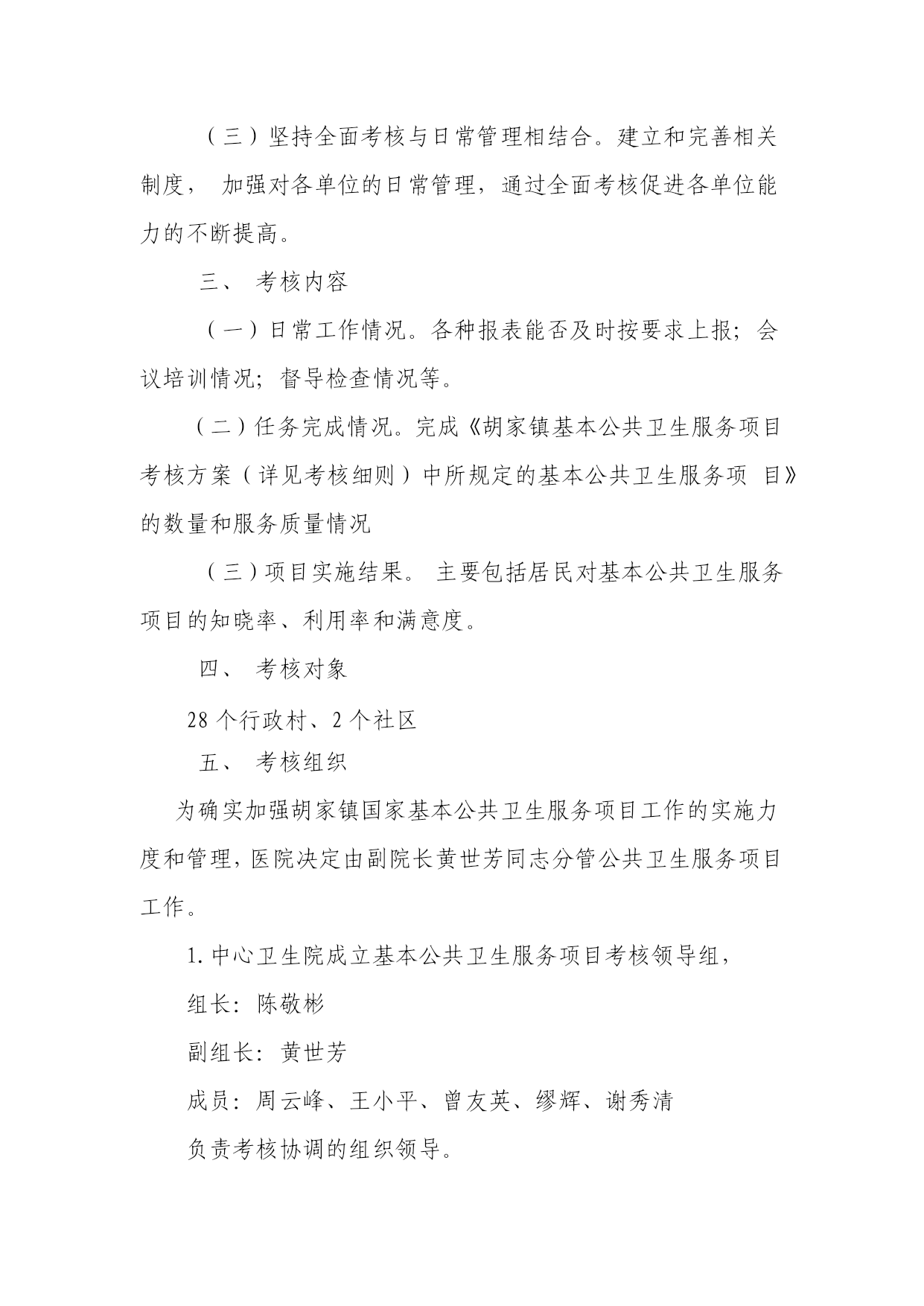 2015年胡家镇基本公共卫生服务项目考核方案为加强对全镇基本公共卫生服务的管理,保证基本公共卫生服务的公平性及可行性,推动全镇基本公共卫生工作的持续健康发展,根据《国家基本公共卫生服务规范》(2011年版)、《中医药健康管理服务技术规范(2013年版)》服务要求和《隆昌县卫生局关于印发2015年基本公共卫生服务项目考核办法》的要求,同时结合2015年4月22日四川省国家基本公共卫生服务均等化指导中心对我院国家基本公共卫生服务项目工作2014年省级绩效考核情况,特制定本考核方案。一、考核目的逐步建立健全全镇基本公共卫生工作考核制度,指导和督促全镇认真履行基本公共卫生服务职能,规范其服务机构服务行为,提高服务质量,充分发挥资金使用效益,保障城乡居民获得基本公共卫生服务,促进基本公共卫生服务逐步均等化。二、考核原则(一)坚持科学、合理、有效。根据基本公共卫生服务的有关要求,结合我县实际,科学合理地制定考核的具体内容、标准和政策措施,有效地开展考核工作。(二)坚持客观、真实、公平、公正。公开考核程序、内容、标准,考核过程要坚持实事求是,考核结果要客观反映出基本公共卫生服务的落实情况。(三)坚持全面考核与日常管理相结合。建立和完善相关制度,加强对各单位的日常管理,通过全面考核促进各单位能力的不断提高。三、考核内容(一)日常工作情况。各种报表能否及时按要求上报;会议培训情况;督导检查情况等。(二)任务完成情况。完成《胡家镇基本公共卫生服务项目考核方案(详见考核细则)中所规定的基本公共卫生服务项目》的数量和服务质量情况(三)项目实施结果。主要包括居民对基本公共卫生服务项目的知晓率、利用率和满意度。四、考核对象28个行政村、2个社区五、考核组织为确实加强胡家镇国家基本公共卫生服务项目工作的实施力度和管理,医院决定由副院长黄世芳同志分管公共卫生服务项目工作。1.中心卫生院成立基本公共卫生服务项目考核领导组,组长:陈敬彬副组长:黄世芳成员:周云峰、王小平、曾友英、缪辉、谢秀清负责考核协调的组织领导。2.成立基本公共卫生服务考核组组长:黄世芳副组长:周云峰成员:洪艳、曾惠、王慧敏、杨欢、张四一、刘玲、郑艳、李晓敏、黄艳负责对基本公共卫生服务项目工作的具体实施及日常工作的监督考核。按照考核标准对各村卫生室及社区逐一考核。六、考核方法(一)现场检查。实地检查居民健康档案、健康教育材料种类、宣传栏的数量、预防接种、0-6岁儿童健康管理、妇幼保健、老年健康管理、慢病管理、重症精神病管理、传染病和突发公共卫生事件报告和处置、卫生协管、老年人和儿童中医药健康管理的资料和管理情况及相关实物。(二)查阅资料。检查相关资料的填写情况,是否准确、整洁、完整,检查相关账目、相关登记、记录、统计报表、电脑录入等情况。(三)居民调查。采取入户调查、现场谈话、问卷调查、电话调查等形式了解居民享受基本公共卫生服务的情况、满意度、相关知识的知晓率。考核每年进行两次,7月底完成半年考核、次年的元月底完成年终考核。七、组织管理(一)提高认识。各村(社区)要充分认真落实基本公共卫生服务项目工作的重要性,高度重视基本公共卫生服务项目的考核工作,促进乡村卫生室基本公共卫生服务项目的落实。(二)严肃考核纪律。各被考核单位严禁编造篡改考核资料,欺上瞒下。考核组成员严禁借考核之机“吃、拿、卡、要”,弄虚作假,违者报医院院委会处理。(三)加强宣传,接受社会监督。各村(社区)要加强对基本公共卫生服务的宣传,不断提高群众对基本公共卫生服务项目的知晓率和利用率,并自觉接受社会和群众的监督。八、考核结果运用绩效考核结果与项目补助资金拨付挂钩,作为中心卫生院核拨基本公共卫生服务项目补助资金的重要依据;对绩效考核成绩突出的予以通报表扬,并给予一定奖励。(一)居民健康档案要求真实、完整、规范且具有连续性,不应该存在逻辑上的错误,并须相应完成电子档案的录入。健康档案以4元/份核算,年终按实际完成档案的份数计算基本公共卫生服务补助经费的发放。完成档案数的计算完成档案数=抽查表1统计的档案合格率Χ2015年常住居民数-抽查表1统计的档案不真实率Χ2015年常住居民数2.抽查表1中统计的档案合格率低于95%的,须在11月底前将档案完善,保证合格率达到100%,健康档案的补助经费按考核时所计算的档案完成数计放,同时不再做为次年基本公共卫生服务项目工作的参与卫生室;剩余档案由医院聘请他人完成。(二)重点人群档案中的各种随访均须真实,按规范要求随访,表册填写完善、规范,电子信息与纸制信息一致。重点人群管理以6元/人核算,年终按实际管理人数计算基本公共卫生服务中重点人群的经费补助。重点人群管理数的计算重点人管理数=抽查统计出的规范管理率Χ年度
