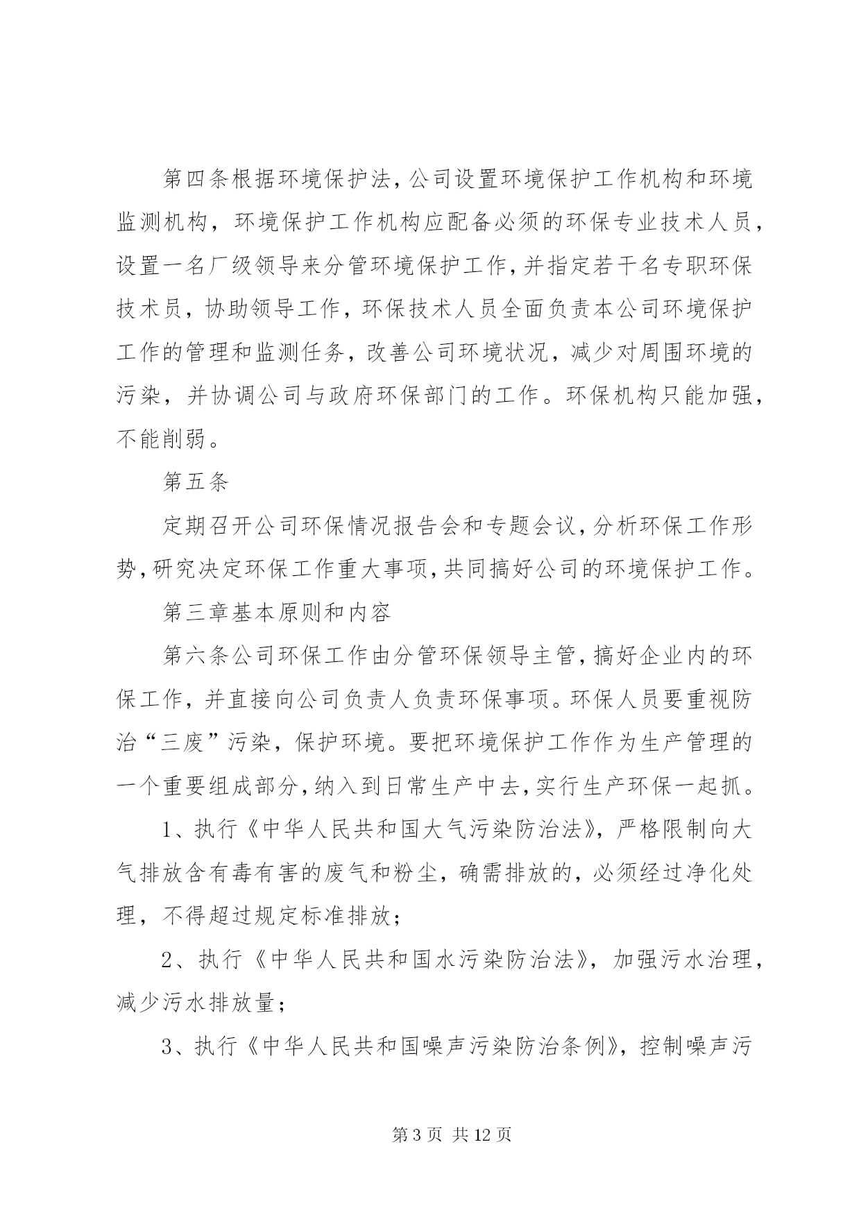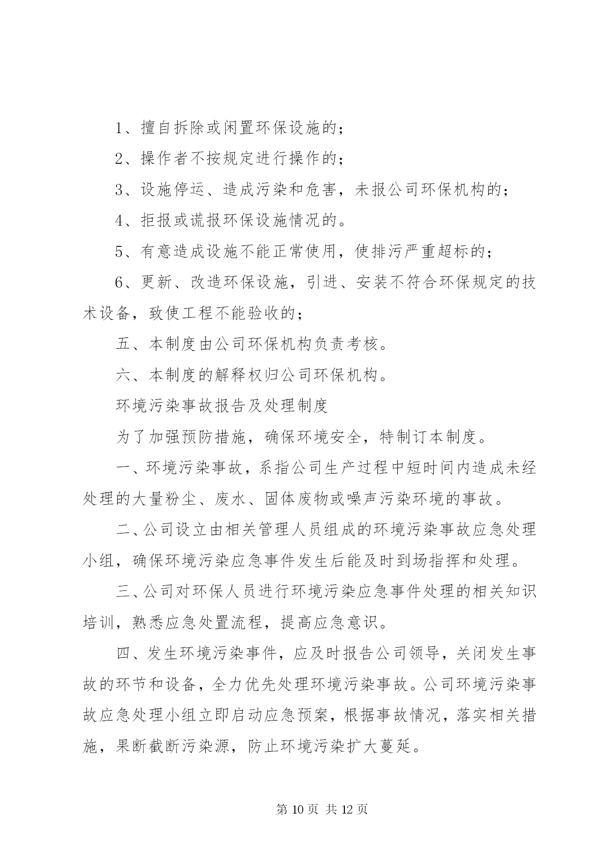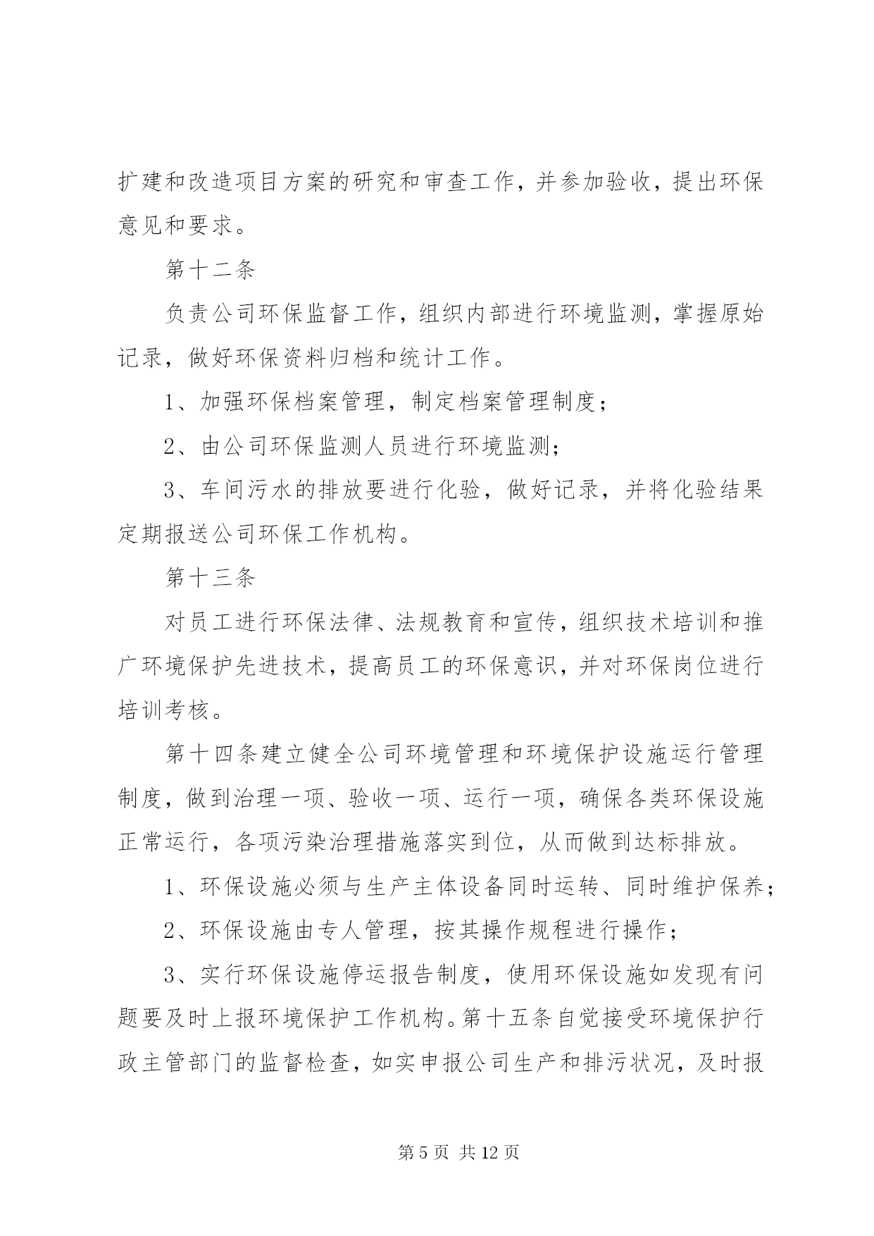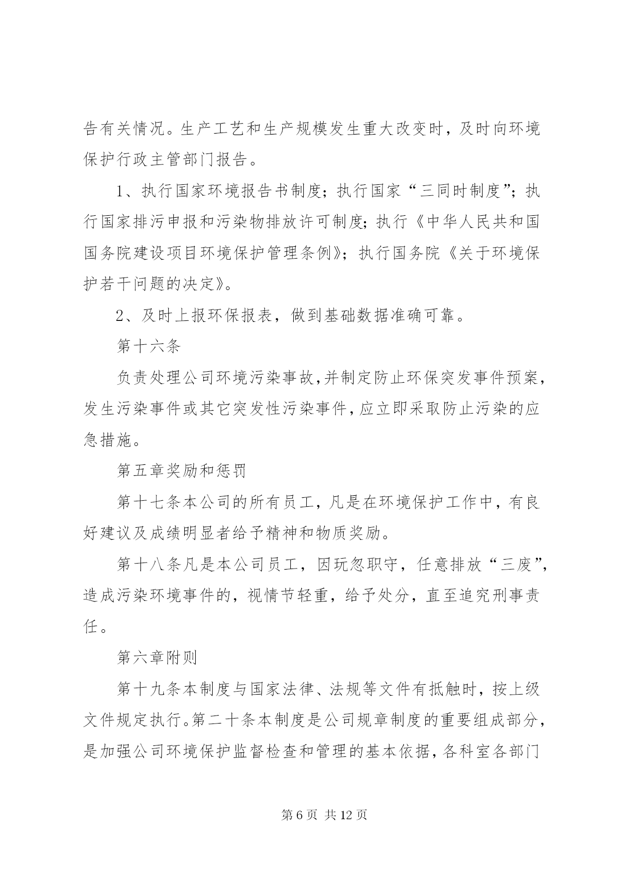 第PAGE\*Arabic\*MERGEFORMAT12页共NUMPAGES\*MERGEFORMAT12页公司环保管理制度企业环保管理制度XX省xxxx有限公司年7月1日2016目录企业环保管理制度第一章总则第二章组织结构第三章基本原则和内容第四章环保机构职责第五章奖励与惩罚第六章附则附件:1、环境保护统计工作管理制度2、环境保护档案管理制度3、环保设施运行管理制度4、环境污染事故报告及处理制度5、公司环境卫生管理制度为了防止环境污染和生态平衡的破坏,确保生产不致对周围环境造成有害的影响,为员工营造适宜工作和生活的环境,保障群众的健康,促进企业经济的发展,适应社会发展的需要,根据《中华人民共和国环境保护管理制度》,结合公司环境保护工作的实际情况,特制定本制度。第一章总则第一条公司的建设和生产应依法保护环境,自觉遵守国家和地方政府环境保护的法律、法规,并依法保护公司的合法权益。公司在生产发展中坚决贯彻环境保护这一基本国策,坚持预防为主、防治结合的方针,坚持保护资源与控制损害相结合、统筹规划、专项治理、突出重点、分步实施、谁污染谁治理的原则,坚持公司与环境保护协调发展,坚持走可持续发展道路,实现环境和生产同步规划、同时实施、同步发展。第二条公司环境保护管理主要任务是。宣传和执行环境保护法律法规及有关规定,充分、合理地利用各种资源、能源,控制和消除污染,积极推进清洁生产,发展循环经济,生产工艺清洁化、公司管理制度化、促进公司与生态环境和谐发展,创造良好的工作生活环境,使公司的经济活动能尽量减少对周围生态环境的污染。第三条保护环境人人有责,公司实行环境保护目标责任制。公司每位员工享有在清洁环境中工作和生活的权力,也有保护环境和国家资源的义务。第二章组织结构第四条根据环境保护法,公司设置环境保护工作机构和环境监测机构,环境保护工作机构应配备必须的环保专业技术人员,设置一名厂级领导来分管环境保护工作,并指定若干名专职环保技术员,协助领导工作,环保技术人员全面负责本公司环境保护工作的管理和监测任务,改善公司环境状况,减少对周围环境的污染,并协调公司与政府环保部门的工作。环保机构只能加强,不能削弱。第五条定期召开公司环保情况报告会和专题会议,分析环保工作形势,研究决定环保工作重大事项,共同搞好公司的环境保护工作。第三章基本原则和内容第六条公司环保工作由分管环保领导主管,搞好企业内的环保工作,并直接向公司负责人负责环保事项。环保人员要重视防治“三废”污染,保护环境。要把环境保护工作作为生产管理的一个重要组成部分,纳入到日常生产中去,实行生产环保一起抓。1、执行《中华人民共和国大气污染防治法》,严格限制向大气排放含有毒有害的废气和粉尘,确需排放的,必须经过净化处理,不得超过规定标准排放;2、执行《中华人民共和国水污染防治法》,加强污水治理,减少污水排放量;3、执行《中华人民共和国噪声污染防治条例》,控制噪声污染。第七条环境保护工作关系到周边环境和每个职工的身体健康及公司生产发展,公司员工必须严格执行环境保护工作制度,任何违反环保工作制度,造成事故者,必根据事故程度追究责任。第八条坚持“谁污染,谁治理”的原则,积极做好废水、粉尘、废渣和噪声的污染治理,所有造成环境污染和其它公害的都必须提出治理规划,落实治理资金,有计划、有步骤地实施污染治理,公司在财力、物力、人力方面应及时给予安排解决。凡新建、扩建、改造项目中的“三废”治理和综合利用工作所需资金、设备材料,必须同时列入计划,切实予以保证,在施工过程中不得以任何理由为借口排挤“三废”治理和综合利用工程的资金、设备、材料和人力等。第九条对环保设施、设备等要认真管理,落实专人管理,定期检查、维修,保证设备、设施完好,运转率达到考核指标要求,并确保备品备药的正常储备量。第四章环保机构职责第十条在公司分管领导负责下,认真贯彻执行国家、上级主管部门的有关环保方针、政策和法规,负责公司环境保护,资源综合利用的规划和计划的制定、组织实施及环保工作的管理和监测等。第十一条监督检查公司执行“三废”治理的情况,参加新建、扩建和改造项目方案的研究和审查工作,并参加验收,提出环保意见和要求。第十二条负责公司环保监督工作,组织内部进行环境监测,掌握原始记录,做好环保资料归档和统计工作。1、加强环保档案管理,制定档案管理制度;2、由公司环保监测人员进行环境监测;3、车间污水的排放要进行化验,做好记录,并将化验结果定期报送公司环保工作机构。第十三条对员工进行环保法律、法规教育和宣传,组织技术培训和推广环境保护先进技术,提高员工的环保意识,并对环保岗位进行培训考核。第十四条建立健全公司环境管理和环境保护设施运行管理制度,做到治理一项、验收一项、运行一项,确保各类环保设施正常运行,各项污染治理措施落实到位