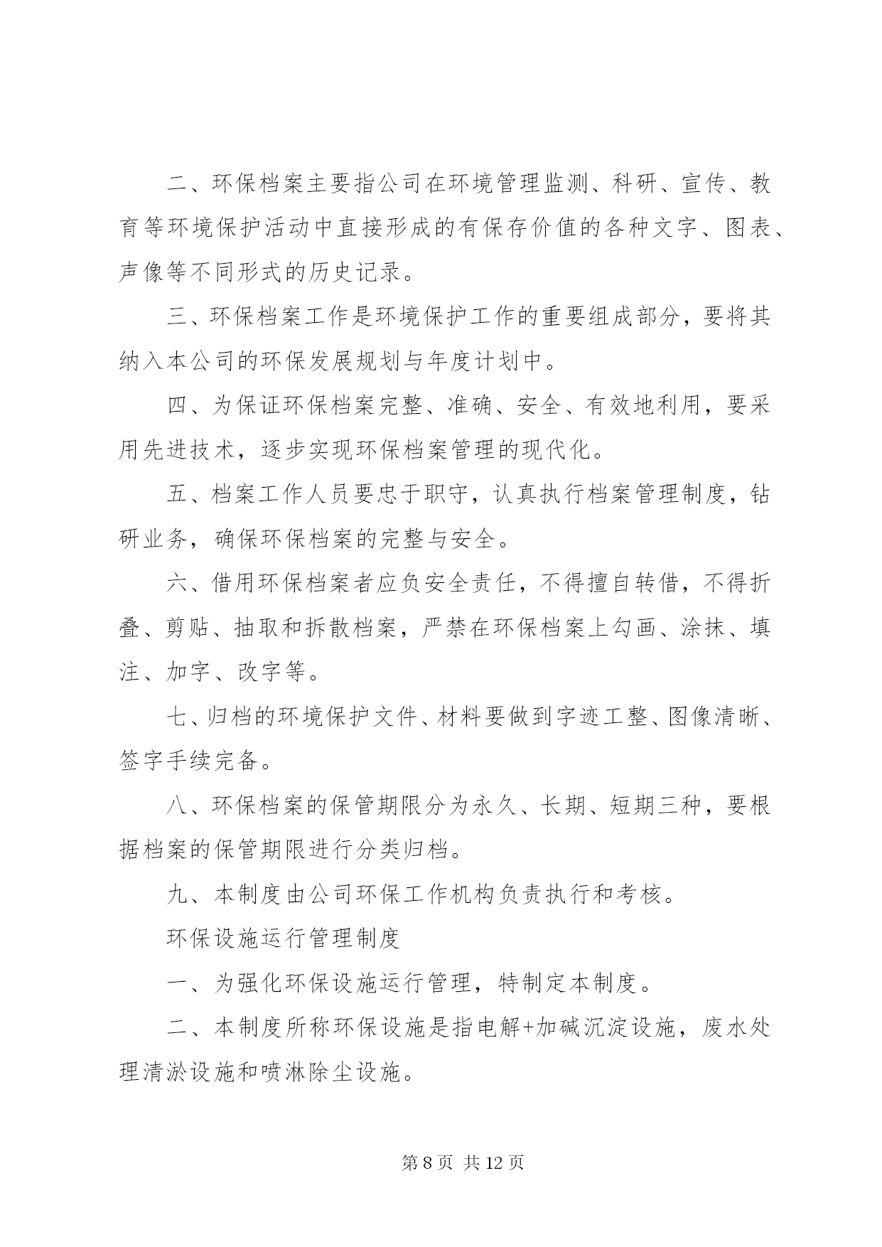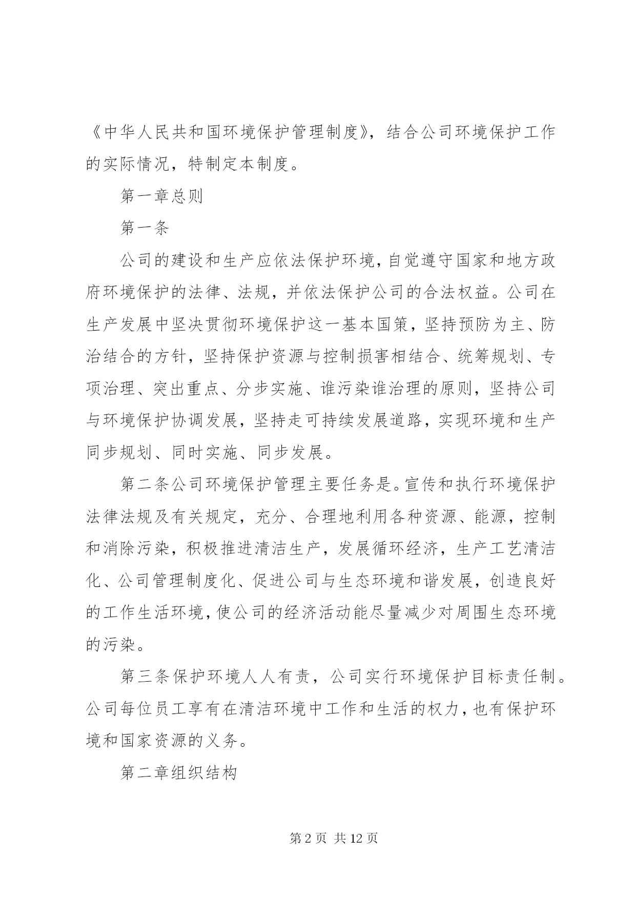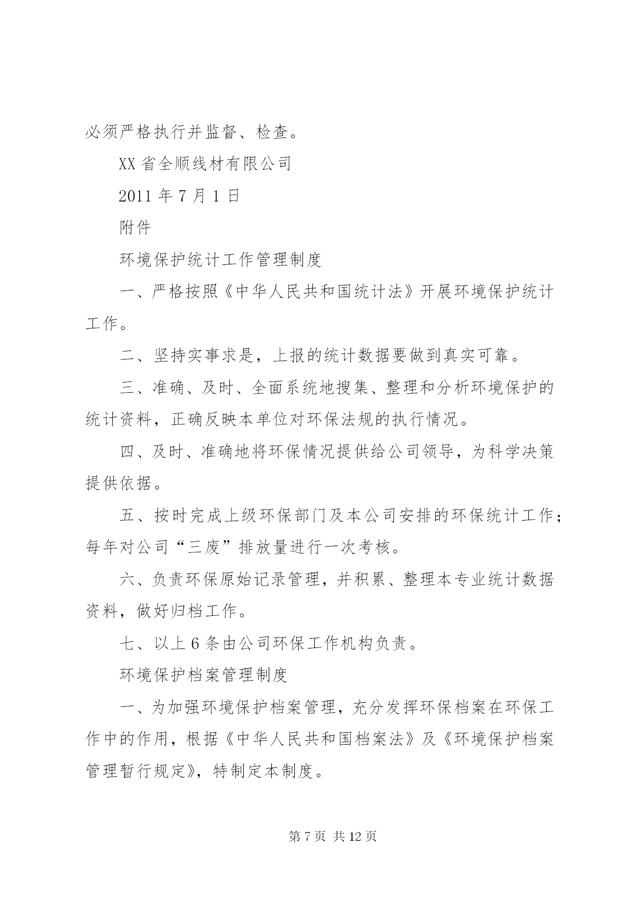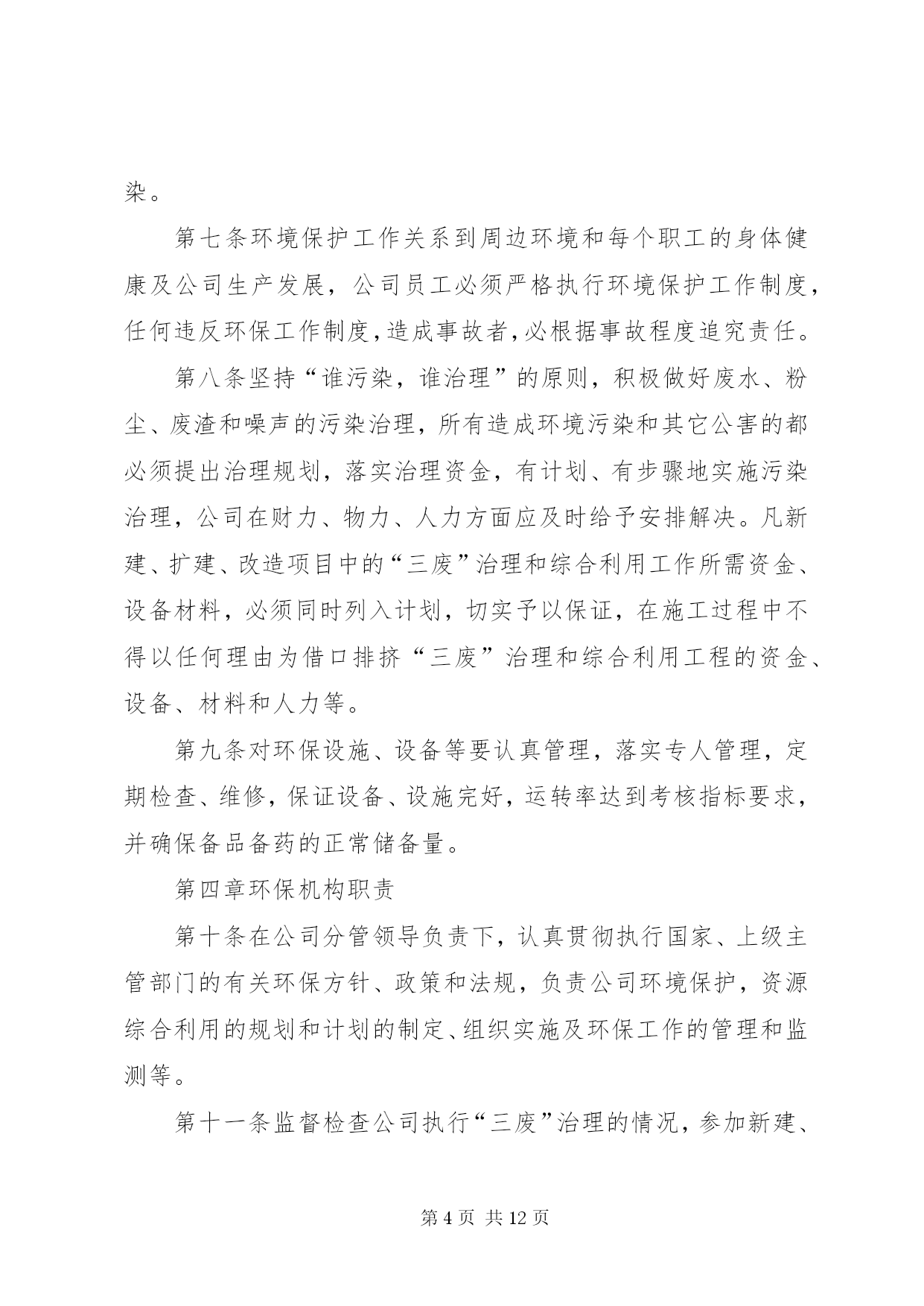 第PAGE\*Arabic\*MERGEFORMAT12页共NUMPAGES\*MERGEFORMAT12页公司环保管理制度企业环保管理制度XX省xxxx有限公司年7月1日2016目录企业环保管理制度第一章总则第二章组织结构第三章基本原则和内容第四章环保机构职责第五章奖励与惩罚第六章附则附件:1、环境保护统计工作管理制度2、环境保护档案管理制度3、环保设施运行管理制度4、环境污染事故报告及处理制度5、公司环境卫生管理制度为了防止环境污染和生态平衡的破坏,确保生产不致对周围环境造成有害的影响,为员工营造适宜工作和生活的环境,保障群众的健康,促进企业经济的发展,适应社会发展的需要,根据《中华人民共和国环境保护管理制度》,结合公司环境保护工作的实际情况,特制定本制度。第一章总则第一条公司的建设和生产应依法保护环境,自觉遵守国家和地方政府环境保护的法律、法规,并依法保护公司的合法权益。公司在生产发展中坚决贯彻环境保护这一基本国策,坚持预防为主、防治结合的方针,坚持保护资源与控制损害相结合、统筹规划、专项治理、突出重点、分步实施、谁污染谁治理的原则,坚持公司与环境保护协调发展,坚持走可持续发展道路,实现环境和生产同步规划、同时实施、同步发展。第二条公司环境保护管理主要任务是。宣传和执行环境保护法律法规及有关规定,充分、合理地利用各种资源、能源,控制和消除污染,积极推进清洁生产,发展循环经济,生产工艺清洁化、公司管理制度化、促进公司与生态环境和谐发展,创造良好的工作生活环境,使公司的经济活动能尽量减少对周围生态环境的污染。第三条保护环境人人有责,公司实行环境保护目标责任制。公司每位员工享有在清洁环境中工作和生活的权力,也有保护环境和国家资源的义务。第二章组织结构第四条根据环境保护法,公司设置环境保护工作机构和环境监测机构,环境保护工作机构应配备必须的环保专业技术人员,设置一名厂级领导来分管环境保护工作,并指定若干名专职环保技术员,协助领导工作,环保技术人员全面负责本公司环境保护工作的管理和监测任务,改善公司环境状况,减少对周围环境的污染,并协调公司与政府环保部门的工作。环保机构只能加强,不能削弱。第五条定期召开公司环保情况报告会和专题会议,分析环保工作形势,研究决定环保工作重大事项,共同搞好公司的环境保护工作。第三章基本原则和内容第六条公司环保工作由分管环保领导主管,搞好企业内的环保工作,并直接向公司负责人负责环保事项。环保人员要重视防治“三废”污染,保护环境。要把环境保护工作作为生产管理的一个重要组成部分,纳入到日常生产中去,实行生产环保一起抓。1、执行《中华人民共和国大气污染防治法》,严格限制向大气排放含有毒有害的废气和粉尘,确需排放的,必须经过净化处理,不得超过规定标准排放;2、执行《中华人民共和国水污染防治法》,加强污水治理,减少污水排放量;3、执行《中华人民共和国噪声污染防治条例》,控制噪声污染。第七条环境保护工作关系到周边环境和每个职工的身体健康及公司生产发展,公司员工必须严格执行环境保护工作制度,任何违反环保工作制度,造成事故者,必根据事故程度追究责任。第八条坚持“谁污染,谁治理”的原则,积极做好废水、粉尘、废渣和噪声的污染治理,所有造成环境污染和其它公害的都必须提出治理规划,落实治理资金,有计划、有步骤地实施污染治理,公司在财力、物力、人力方面应及时给予安排解决。凡新建、扩建、改造项目中的“三废”治理和综合利用工作所需资金、设备材料,必须同时列入计划,切实予以保证,在施工过程中不得以任何理由为借口排挤“三废”治理和综合利用工程的资金、设备、材料和人力等。第九条对环保设施、设备等要认真管理,落实专人管理,定期检查、维修,保证设备、设施完好,运转率达到考核指标要求,并确保备品备药的正常储备量。第四章环保机构职责第十条在公司分管领导负责下,认真贯彻执行国家、上级主管部门的有关环保方针、政策和法规,负责公司环境保护,资源综合利用的规划和计划的制定、组织实施及环保工作的管理和监测等。第十一条监督检查公司执行“三废”治理的情况,参加新建、扩建和改造项目方案的研究和审查工作,并参加验收,提出环保意见和要求。第十二条负责公司环保监督工作,组织内部进行环境监测,掌握原始记录,做好环保资料归档和统计工作。1、加强环保档案管理,制定档案管理制度;2、由公司环保监测人员进行环境监测;3、车间污水的排放要进行化验,做好记录,并将化验结果定期报送公司环保工作机构。第十三条对员工进行环保法律、法规教育和宣传,组织技术培训和推广环境保护先进技术,提高员工的环保意识,并对环保岗位进行培训考核。第十四条建立健全公司环境管理和环境保护设施运行管理制度,做到治理一项、验收一项、运行一项,确保各类环保设施正常运行,各项污染治理措施落实到位