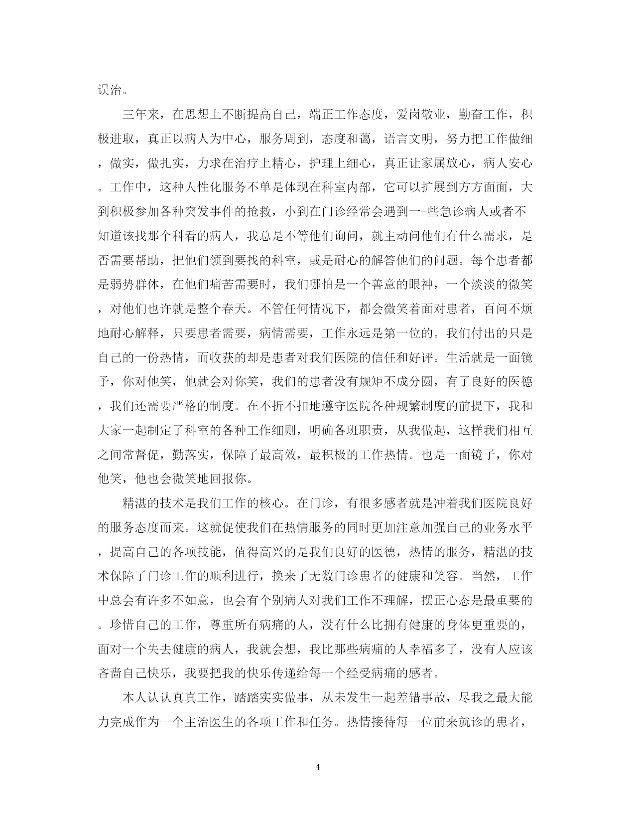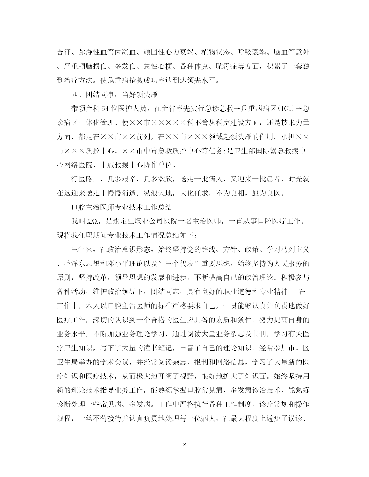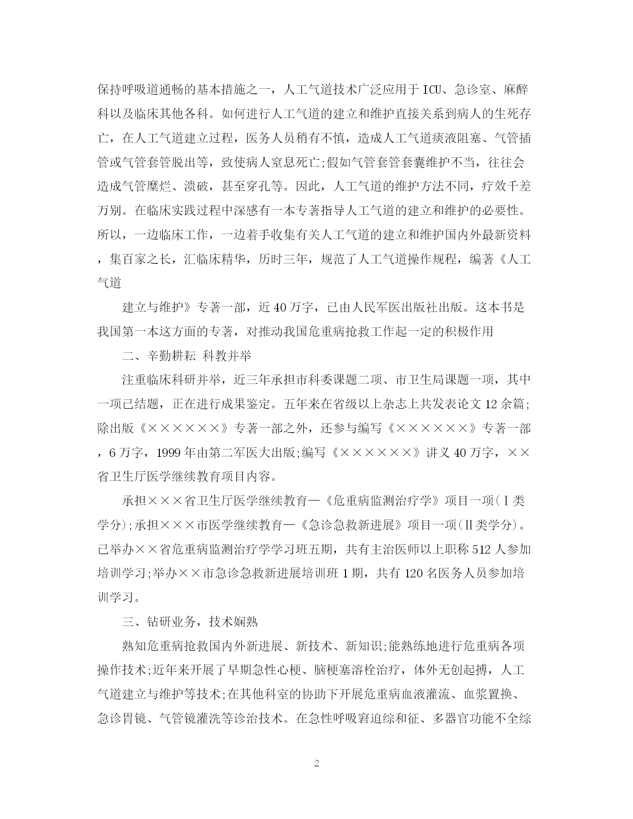 此资料由网络收集而来,如有侵权请告知上传者立即删除。资料共分享,我们负责传递知识。PAGEPAGE5医师专业技术工作总结医师的责任是重大的,他们的技术更是工作的关键,下面是小编搜集整理的医师专业技术工作总结,欢迎阅读。医院副主任医师专业技术工作总结男,××××年×月××日生,××××年7月毕业于××医学院医疗系,×××年×月5日被评为副主任医师职称,现在××市×××医院×××科工作,任××科主任,专长危重病医学。人生尚有梦,勤学日不辍。临床如履冰,求索无寒暑。“几度风雨,几度春秋”,自从一九七六年开始学医,学习工作,工作学习,转眼之间已历时26年。26年前怀着对医学的好奇和神秘感,开始踏上学医的漫漫长路,通过一年的跟师学习,“悬壶”行医于僻静乡村。2年后因父亲被癌症夺去了生命,深感自己知识贫乏,热切希望深造。恰逢恢复高考,一边行医,一边复习,于一九七九年九月进入温州医学院学习。通过五年的勤奋学习、系统训练,扎实地掌握了医学基本知识、基本理论、基本技能,于八四年以全校第四名的优异成绩毕业,带着医学生的梦幻,怀着对医学的虔诚,踏上“如临深渊,如履薄冰”的临床工作一线。毕业以后从事危重病抢救工作,危重病医学是一门年轻的学科,直到二十世纪七十年代初才象其他专业一样,登上医学神圣的殿堂。这门学科有许多还没有开垦的“处女地”。本人在危重病医学领域里摸石子过河,不断求索,通过多年的临床实践,积累了一些临床经验,尤其在人工气道建立与维护、机械通气、感染、急性呼吸窘迫综和征、顽固性心力衰竭、心肺复苏、脑血栓溶栓、DIC、各种顽固性休克等方面有一定的创新。被评为副主任医师以来,最近五年的工作、科研、著作等情况如下:一、人工气道创新所在“於无路处创出路,於有路处辟新路。”人工气道的建立和维护是危重病抢救主要方法之一,也是围手术期麻醉病人保持呼吸道通畅的基本措施之一,人工气道技术广泛应用于ICU、急诊室、麻醉科以及临床其他各科。如何进行人工气道的建立和维护直接关系到病人的生死存亡,在人工气道建立过程,医务人员稍有不慎,造成人工气道痰液阻塞、气管插管或气管套管脱出等,致使病人窒息死亡;假如气管套管套囊维护不当,往往会造成气管糜烂、溃破,甚至穿孔等。因此,人工气道的维护方法不同,疗效千差万别。在临床实践过程中深感有一本专著指导人工气道的建立和维护的必要性。所以,一边临床工作,一边着手收集有关人工气道的建立和维护国内外最新资料,集百家之长,汇临床精华,历时三年,规范了人工气道操作规程,编著《人工气道建立与维护》专著一部,近40万字,已由人民军医出版社出版。这本书是我国第一本这方面的专著,对推动我国危重病抢救工作起一定的积极作用二、辛勤耕耘科教并举注重临床科研并举,近三年承担市科委课题二项、市卫生局课题一项,其中一项已结题,正在进行成果鉴定。五年来在省级以上杂志上共发表论文12余篇;除出版《××××××》专著一部之外,还参与编写《××××××》专著一部,6万字,1999年由第二军医大出版;编写《××××××》讲义40万字,××省卫生厅医学继续教育项目内容。承担×××省卫生厅医学继续教育—《危重病监测治疗学》项目一项(Ⅰ类学分);承担×××市医学继续教育—《急诊急救新进展》项目一项(Ⅱ类学分)。已举办××省危重病监测治疗学学习班五期,共有主治医师以上职称512人参加培训学习;举办××市急诊急救新进展培训班1期,共有120名医务人员参加培训学习。三、钻研业务,技术娴熟熟知危重病抢救国内外新进展、新技术、新知识;能熟练地进行危重病各项操作技术;近年来开展了早期急性心梗、脑梗塞溶栓治疗,体外无创起搏,人工气道建立与维护等技术;在其他科室的协助下开展危重病血液灌流、血浆置换、急诊胃镜、气管镜灌洗等诊治技术。在急性呼吸窘迫综和征、多器官功能不全综合征、弥漫性血管内凝血、顽固性心力衰竭、植物状态、呼吸衰竭、脑血管意外、严重颅脑损伤、多发伤、急性心梗、各种休克、脓毒症等方面,积累了一套独到治疗方法。使危重病抢救成功率达到达领先水平。四、团结同事,当好领头雁带领全科54位医护人员,在全省率先实行急诊急救→危重病病区(ICU)→急诊病区一体化管理。使××市×××××科不管从科室建设方面,还是技术力量方面,都走在××市××前列,在××市×××领域起领头雁的作用。承担××市×××质控中心、××市中毒急救质控中心等任务;是卫生部国际紧急救援中心网络医院、中旅救援中心协作单位。行医路上,几多艰辛,几多欢欣,送走一批病人,又迎来一批患者,时光就在这迎来送走中慢慢消逝。纵浪天地,大化任求,不为良相,愿为良医。口腔主治医师专业技术工作总结我叫XXX,是永定庄煤业公司医院一名主治医师,一直从事口腔医疗工作。现将我任职期间专业技术工