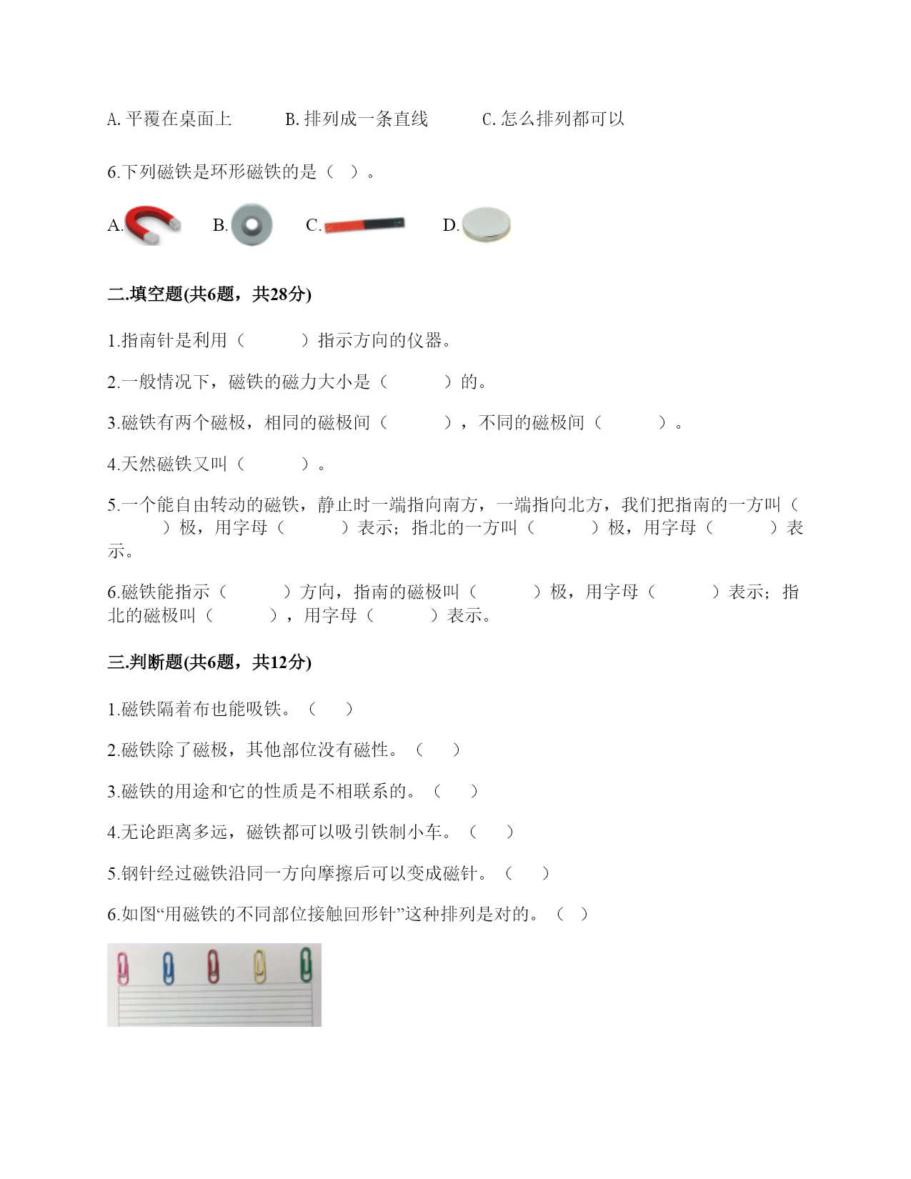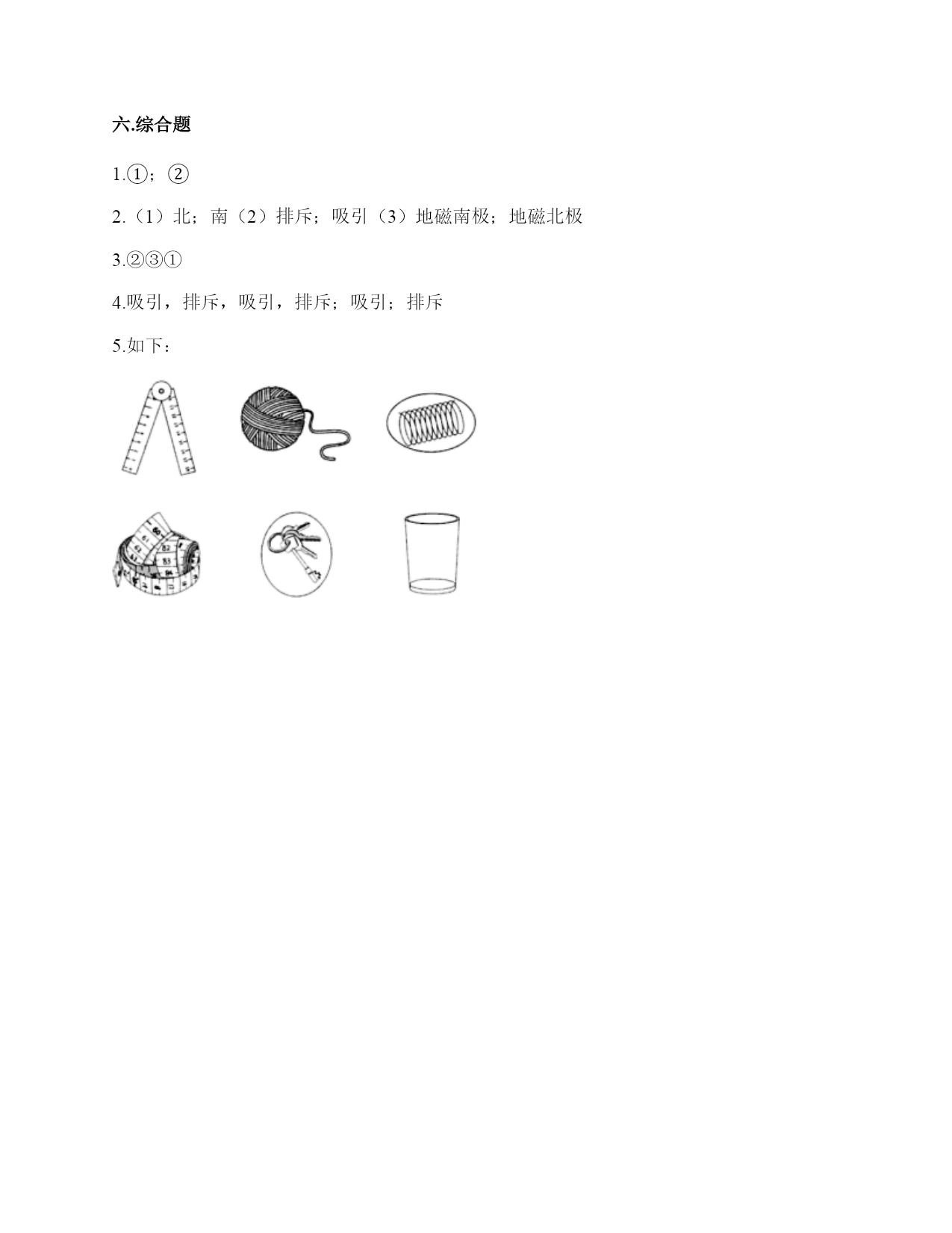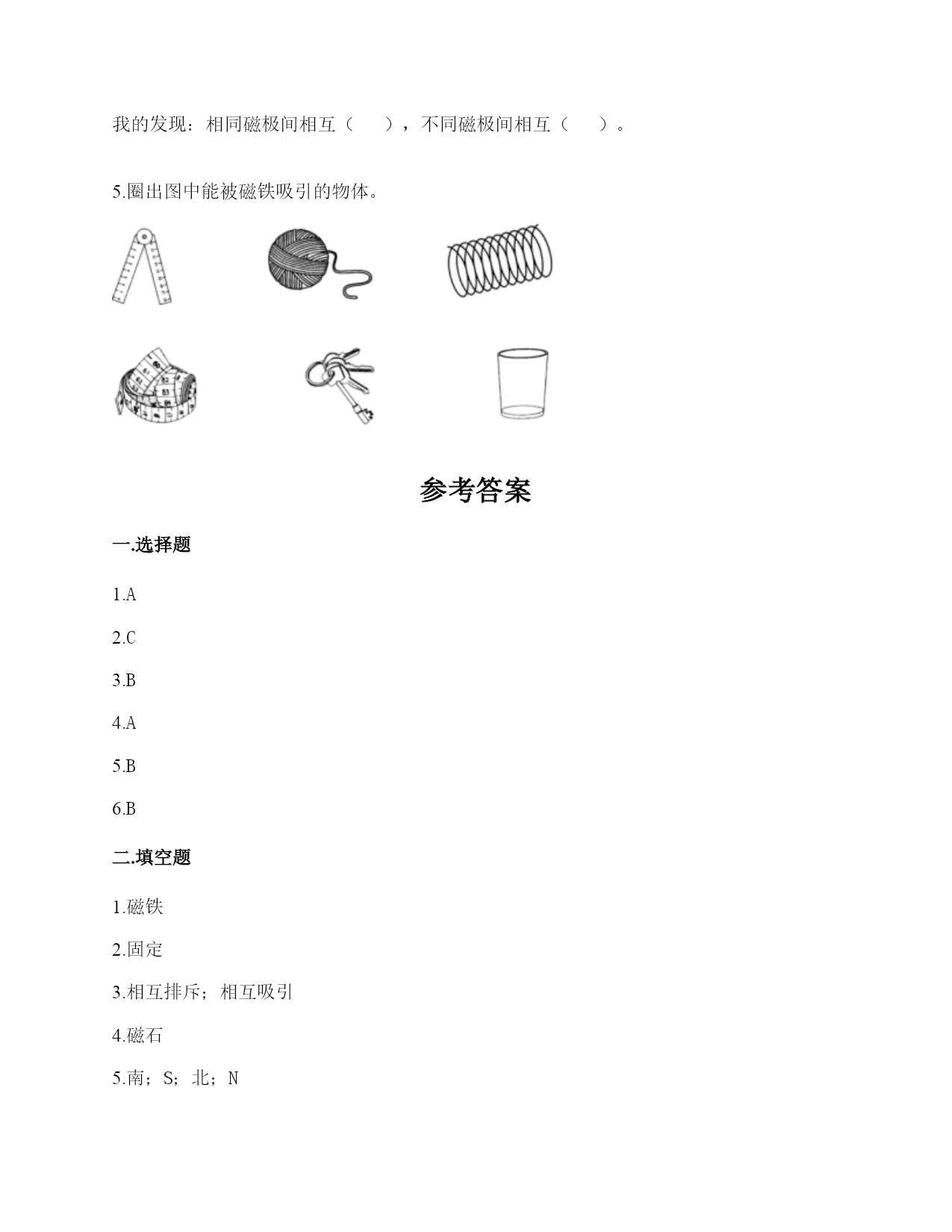 小学科学《磁铁》练习题一.选择题(共6题,共12分)1.指南针的外壳所用的材质不可能是()。A.铁B.铜C.塑料2.有三辆小车,车上放着磁铁或铁块。当它们靠近时,会出现如下图所示的运行状态,可以判断出以下情况不可能的是()A.甲是铁块,乙和丙是磁铁B.甲和乙是磁铁,丙是铁块C.甲和乙是铁块,丙是磁铁3.现在很多门都会装上门吸,门吸利用的是磁铁磁极间()的性质。A.同极相互排斥B.异极相互吸引C.异极相互排斥4.下面的材料中,不适合用来制作水浮式指南针的是()。A.灯芯草B.金属薄片C.吹塑纸5.在做“用磁铁的不同部位接触回形针”的实验时回形针一定要()。A.平覆在桌面上B.排列成一条直线C.怎么排列都可以6.下列磁铁是环形磁铁的是()。A.B.C.D.二.填空题(共6题,共28分)1.指南针是利用()指示方向的仪器。2.一般情况下,磁铁的磁力大小是()的。3.磁铁有两个磁极,相同的磁极间(),不同的磁极间()。4.天然磁铁又叫()。5.一个能自由转动的磁铁,静止时一端指向南方,一端指向北方,我们把指南的一方叫()极,用字母()表示;指北的一方叫()极,用字母()表示。6.磁铁能指示()方向,指南的磁极叫()极,用字母()表示;指北的磁极叫(),用字母()表示。三.判断题(共6题,共12分)1.磁铁隔着布也能吸铁。()2.磁铁除了磁极,其他部位没有磁性。()3.磁铁的用途和它的性质是不相联系的。()4.无论距离多远,磁铁都可以吸引铁制小车。()5.钢针经过磁铁沿同一方向摩擦后可以变成磁针。()6.如图“用磁铁的不同部位接触回形针”这种排列是对的。()四.连线题(共1题,共4分)1.把下列事物和应用磁铁的原理用线连起来。五.简答题(共5题,共29分)1.写出三个磁铁在生活中应用的实例。2.磁铁宝宝相遇记有一天,两个磁铁宝宝在路上相遇了。他们两个都伸出右手,想和对方握握手。突然,一股力量把他俩推开,他们摔了个大跟斗。“妈妈,他推我,呜呜……”。磁铁宝宝哭着向妈妈告状。妈妈笑着说:“孩子,这是因为我们身体的特点造成的。”“什么特点呀?”磁铁宝宝好奇地问。妈妈说:“我们都有两个磁极,同极相斥、异极相吸。你俩都伸出右手,相互排斥,当然会摔大跟跟头。想一想,你们应该怎样握手呢?”两个磁铁宝宝想了想,再次伸出手,一股力量把两只小手紧紧地吸在了一起。解释文中划“()”的句子的发生现象。()3.奶奶缝衣服时,不小心把针掉到地上了,你打算用什么办法帮奶奶找针?4.磁悬浮列车运用的是高科技手段,跟磁铁没什么关系。5.制作水浮式指南针时,我们是用摩擦过的钢针去吸引其他钢针来测试它有没有磁性的。可以用磁铁来测试吗?如果可以,哪种方法更好?如果不可以,为什么?六.综合题(共5题,共32分)1.有一块没有标明磁极的磁铁,两位同学用红蓝磁铁进行实验。请你根据图中两位同学说的话来判断磁极。(填序号)2.阅读并完成填空。磁铁为什么能指示南北方向我们知道,水平悬挂的条形磁铁静止后总是能够指示南北方向。指南针就是利用磁铁的这个特点制成的。那么,磁铁为什么能够指示方向呢?原来,地球本身就是一个巨大的磁体,也有两个磁极,分别称为地磁南极、地磁北极。地磁南极在地球的北极附近,而地磁北极在地球的南极附近。由于磁铁具有同极相斥、异极相吸的特点,所以指南针的南极会指向地磁北极,也就是指向地球的南端。(1)地磁的南极在地球的()极附近,而地磁北极在地球的()极附近。(2)磁铁具有同极相互()、异极互相()的特点。(3)地球有两个磁极分别是()、()。3.制作水浮式指南针所用的材料都有什么作用?把相应的序号填在右图中。①让磁针浮在水面,自由转动②确定方向,进而确定磁针的南北极③指示南北4.填一填磁极间的相互作用,并回答下面的问题。我的发现:相同磁极间相互(),不同磁极间相互()。5.圈出图中能被磁铁吸引的物体。参考答案一.选择题1.A2.C3.B4.A5.B6.B二.填空题1.磁铁2.固定3.相互排斥;相互吸引4.磁石5.南;S;北;N6.南北;南;S;北;N三.判断题1.√2.×3.×4.×5.×6.√四.连线题1.如下:五.简答题1.用指南针在野外辨别方向;用扬声器扩大声音;磁悬浮列车。2.同极相互排斥,异极相互吸引3.可以利用磁铁找针。4.错,磁悬浮列车运用了磁极之间可以相互作用的原理。5.可以。用钢针测试更好,因为更方便快捷。六.综合题1.①;②2.(1)北;南(2)排斥;吸引(3)地磁南极;地磁北极3.②③①4.吸引,排斥,吸引,排斥;吸引;排斥5.如下: