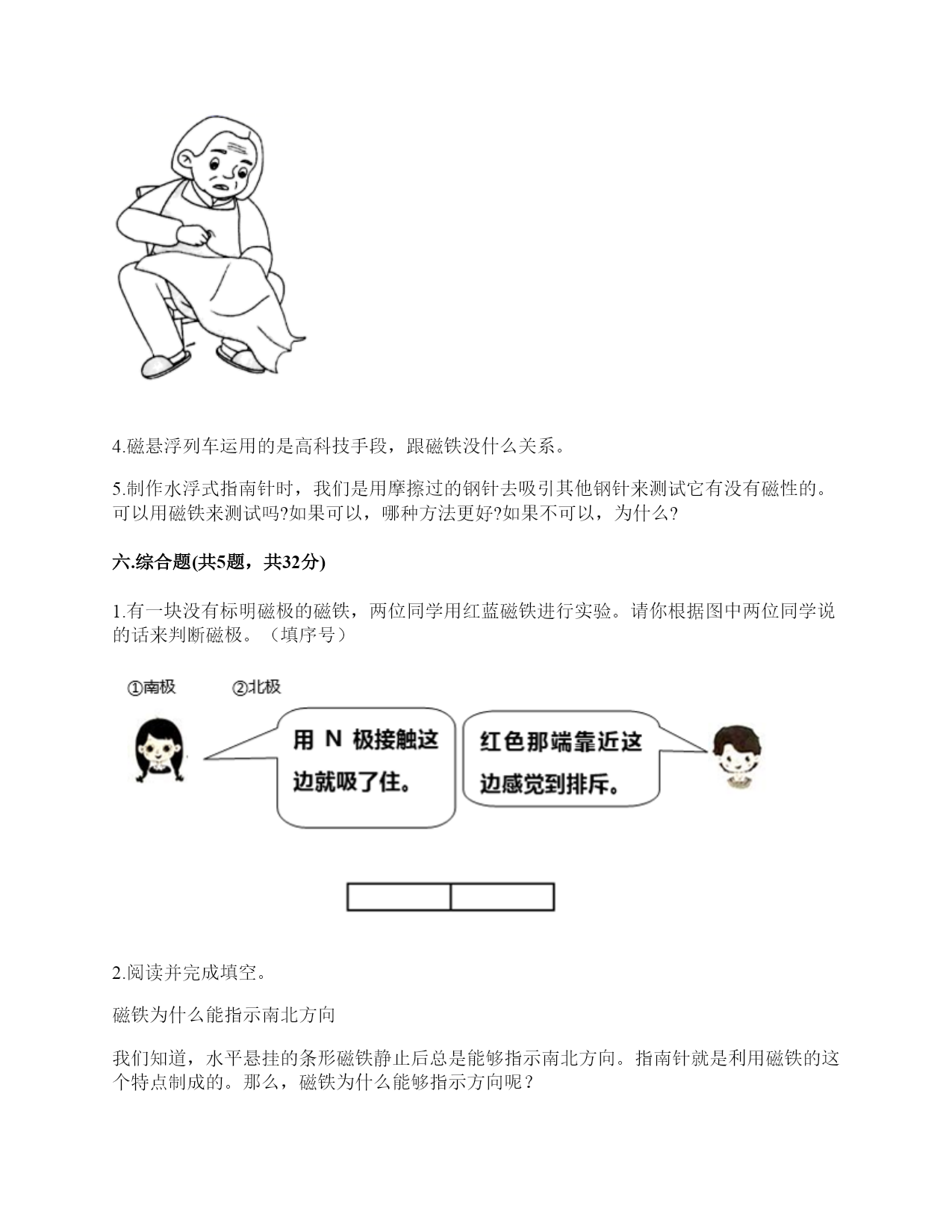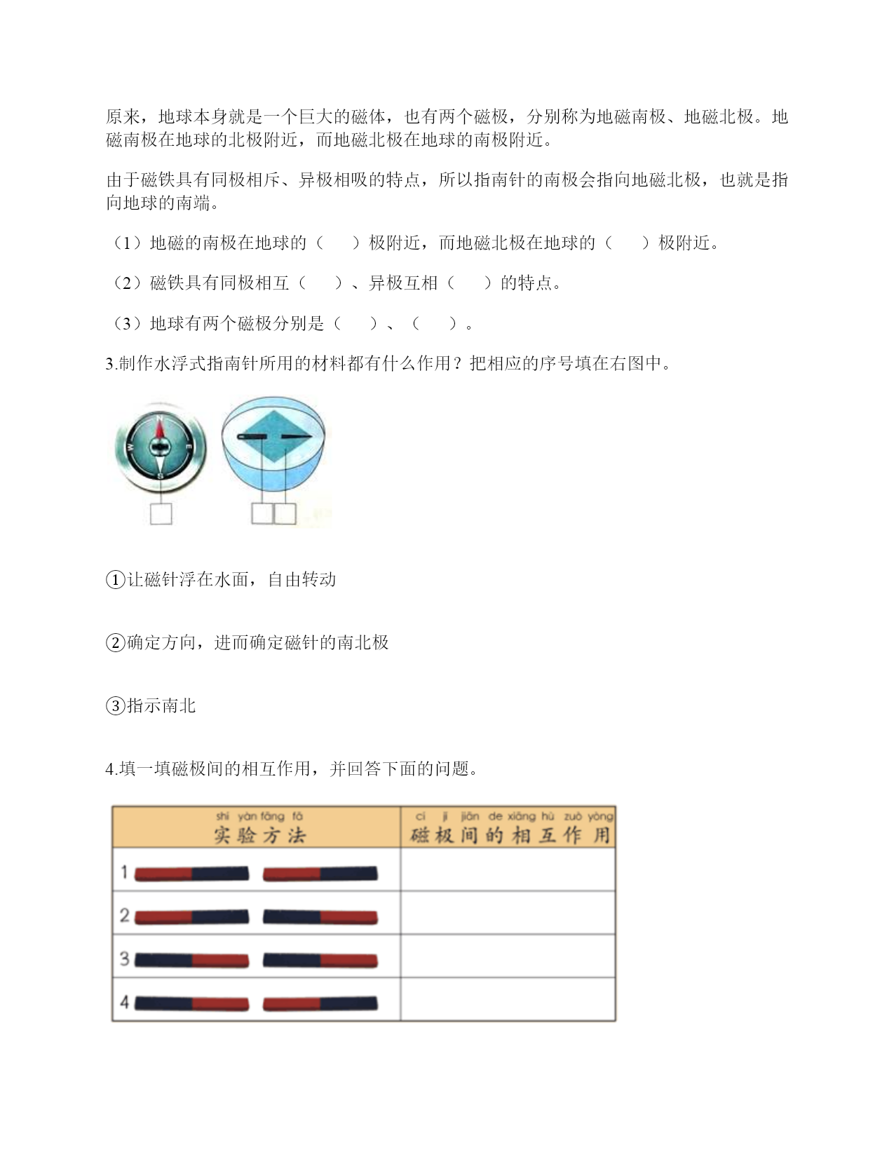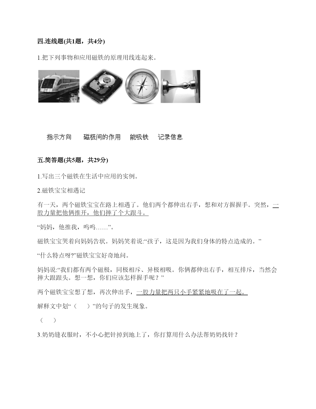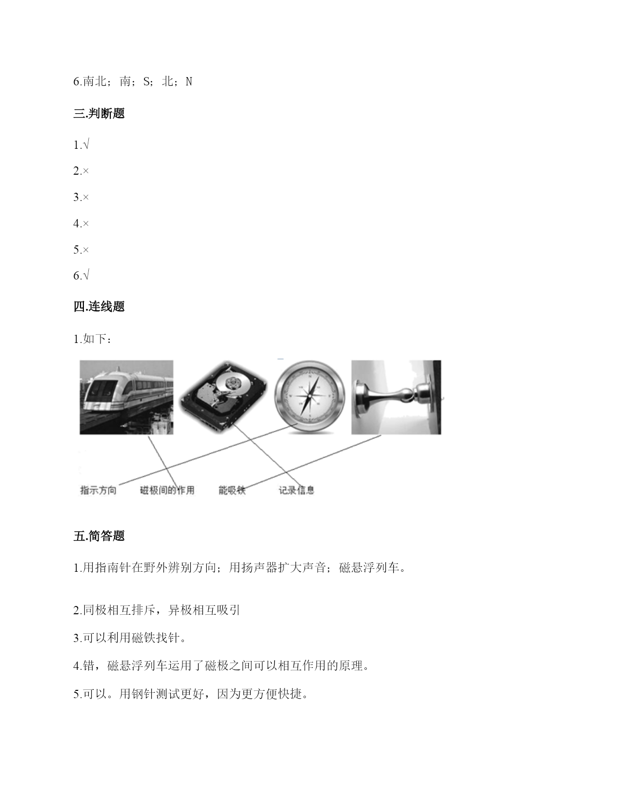 小学科学《磁铁》练习题一.选择题(共6题,共12分)1.指南针的外壳所用的材质不可能是()。A.铁B.铜C.塑料2.有三辆小车,车上放着磁铁或铁块。当它们靠近时,会出现如下图所示的运行状态,可以判断出以下情况不可能的是()A.甲是铁块,乙和丙是磁铁B.甲和乙是磁铁,丙是铁块C.甲和乙是铁块,丙是磁铁3.现在很多门都会装上门吸,门吸利用的是磁铁磁极间()的性质。A.同极相互排斥B.异极相互吸引C.异极相互排斥4.下面的材料中,不适合用来制作水浮式指南针的是()。A.灯芯草B.金属薄片C.吹塑纸5.在做“用磁铁的不同部位接触回形针”的实验时回形针一定要()。A.平覆在桌面上B.排列成一条直线C.怎么排列都可以6.下列磁铁是环形磁铁的是()。A.B.C.D.二.填空题(共6题,共28分)1.指南针是利用()指示方向的仪器。2.一般情况下,磁铁的磁力大小是()的。3.磁铁有两个磁极,相同的磁极间(),不同的磁极间()。4.天然磁铁又叫()。5.一个能自由转动的磁铁,静止时一端指向南方,一端指向北方,我们把指南的一方叫()极,用字母()表示;指北的一方叫()极,用字母()表示。6.磁铁能指示()方向,指南的磁极叫()极,用字母()表示;指北的磁极叫(),用字母()表示。三.判断题(共6题,共12分)1.磁铁隔着布也能吸铁。()2.磁铁除了磁极,其他部位没有磁性。()3.磁铁的用途和它的性质是不相联系的。()4.无论距离多远,磁铁都可以吸引铁制小车。()5.钢针经过磁铁沿同一方向摩擦后可以变成磁针。()6.如图“用磁铁的不同部位接触回形针”这种排列是对的。()四.连线题(共1题,共4分)1.把下列事物和应用磁铁的原理用线连起来。五.简答题(共5题,共29分)1.写出三个磁铁在生活中应用的实例。2.磁铁宝宝相遇记有一天,两个磁铁宝宝在路上相遇了。他们两个都伸出右手,想和对方握握手。突然,一股力量把他俩推开,他们摔了个大跟斗。“妈妈,他推我,呜呜……”。磁铁宝宝哭着向妈妈告状。妈妈笑着说:“孩子,这是因为我们身体的特点造成的。”“什么特点呀?”磁铁宝宝好奇地问。妈妈说:“我们都有两个磁极,同极相斥、异极相吸。你俩都伸出右手,相互排斥,当然会摔大跟跟头。想一想,你们应该怎样握手呢?”两个磁铁宝宝想了想,再次伸出手,一股力量把两只小手紧紧地吸在了一起。解释文中划“()”的句子的发生现象。()3.奶奶缝衣服时,不小心把针掉到地上了,你打算用什么办法帮奶奶找针?4.磁悬浮列车运用的是高科技手段,跟磁铁没什么关系。5.制作水浮式指南针时,我们是用摩擦过的钢针去吸引其他钢针来测试它有没有磁性的。可以用磁铁来测试吗?如果可以,哪种方法更好?如果不可以,为什么?六.综合题(共5题,共32分)1.有一块没有标明磁极的磁铁,两位同学用红蓝磁铁进行实验。请你根据图中两位同学说的话来判断磁极。(填序号)2.阅读并完成填空。磁铁为什么能指示南北方向我们知道,水平悬挂的条形磁铁静止后总是能够指示南北方向。指南针就是利用磁铁的这个特点制成的。那么,磁铁为什么能够指示方向呢?原来,地球本身就是一个巨大的磁体,也有两个磁极,分别称为地磁南极、地磁北极。地磁南极在地球的北极附近,而地磁北极在地球的南极附近。由于磁铁具有同极相斥、异极相吸的特点,所以指南针的南极会指向地磁北极,也就是指向地球的南端。(1)地磁的南极在地球的()极附近,而地磁北极在地球的()极附近。(2)磁铁具有同极相互()、异极互相()的特点。(3)地球有两个磁极分别是()、()。3.制作水浮式指南针所用的材料都有什么作用?把相应的序号填在右图中。①让磁针浮在水面,自由转动②确定方向,进而确定磁针的南北极③指示南北4.填一填磁极间的相互作用,并回答下面的问题。我的发现:相同磁极间相互(),不同磁极间相互()。5.圈出图中能被磁铁吸引的物体。参考答案一.选择题1.A2.C3.B4.A5.B6.B二.填空题1.磁铁2.固定3.相互排斥;相互吸引4.磁石5.南;S;北;N6.南北;南;S;北;N三.判断题1.√2.×3.×4.×5.×6.√四.连线题1.如下:五.简答题1.用指南针在野外辨别方向;用扬声器扩大声音;磁悬浮列车。2.同极相互排斥,异极相互吸引3.可以利用磁铁找针。4.错,磁悬浮列车运用了磁极之间可以相互作用的原理。5.可以。用钢针测试更好,因为更方便快捷。六.综合题1.①;②2.(1)北;南(2)排斥;吸引(3)地磁南极;地磁北极3.②③①4.吸引,排斥,吸引,排斥;吸引;排斥5.如下: