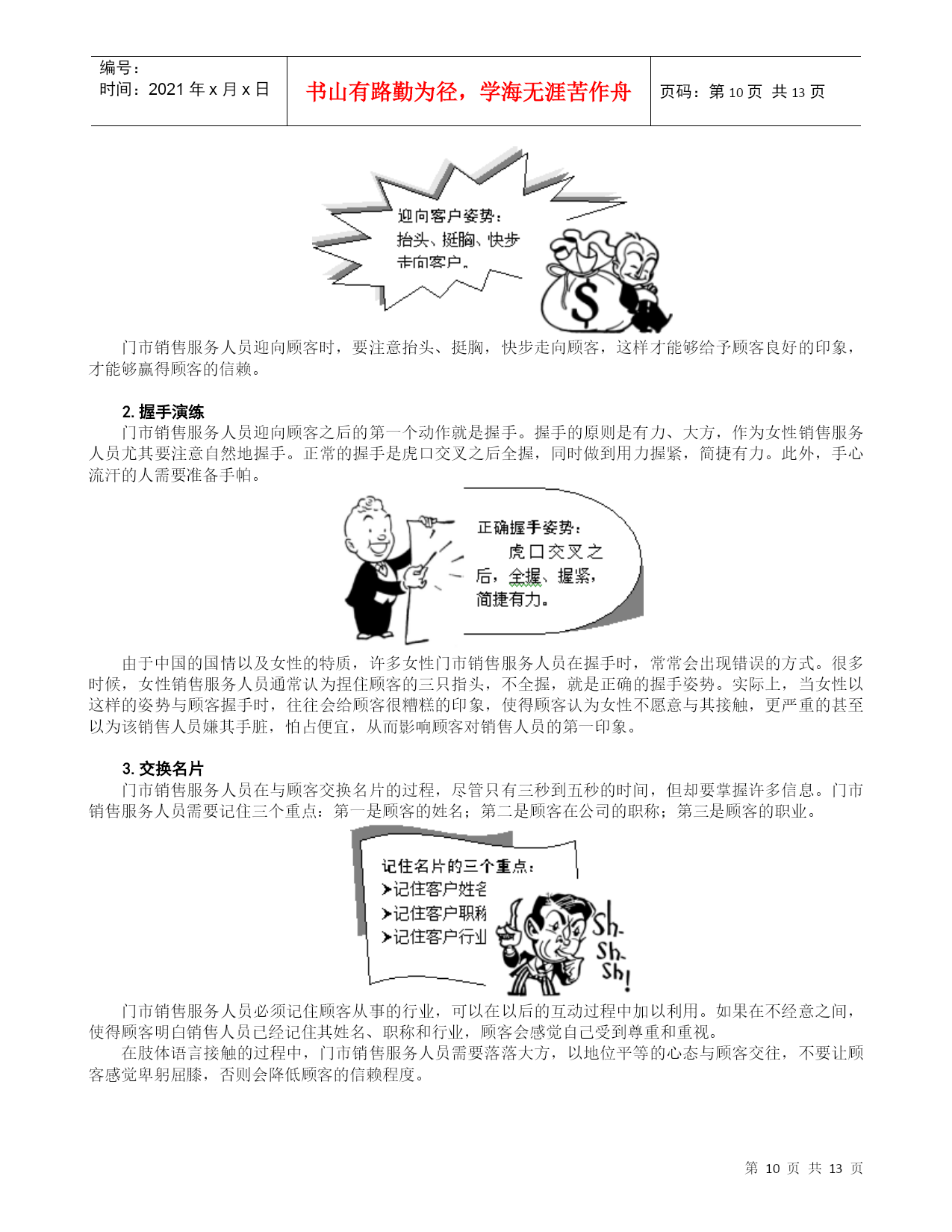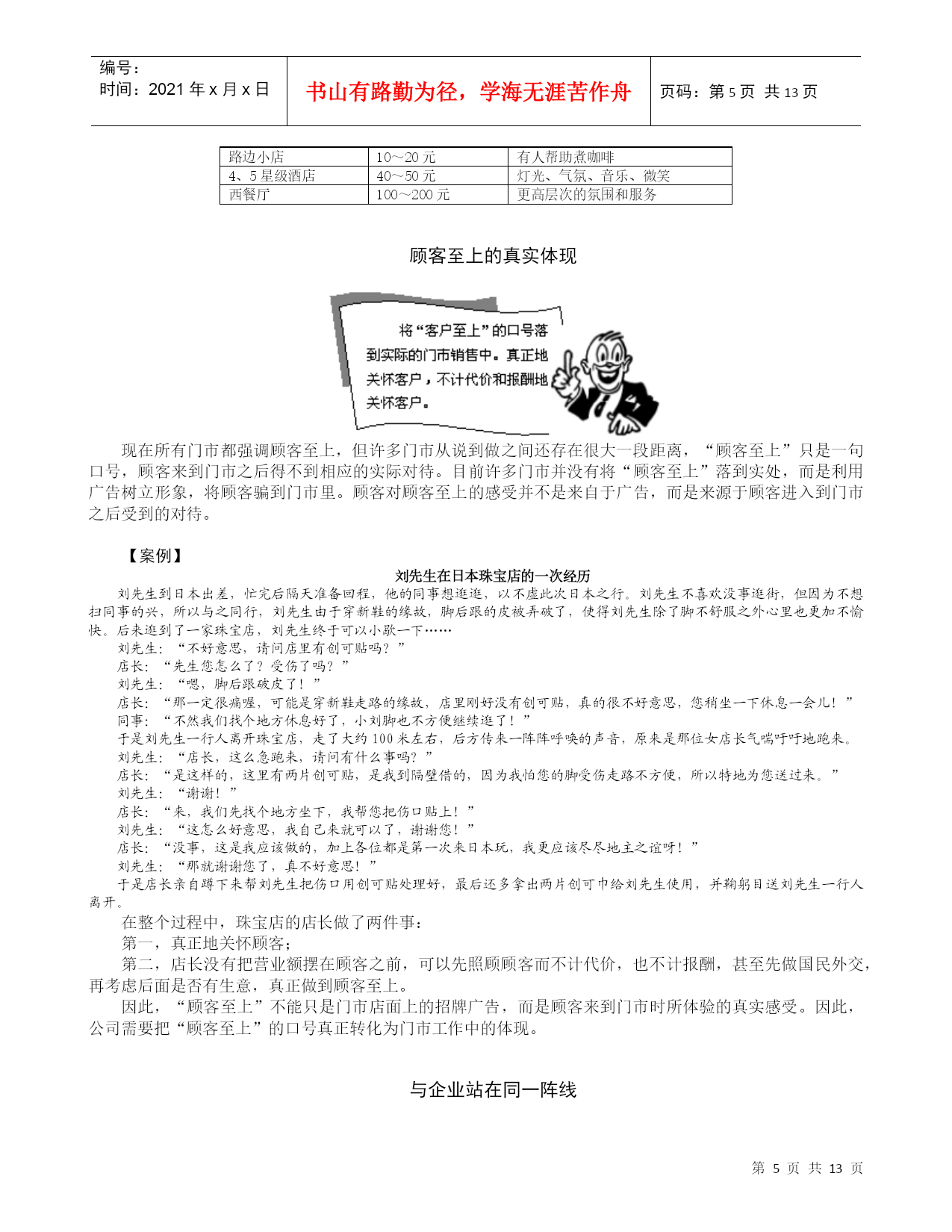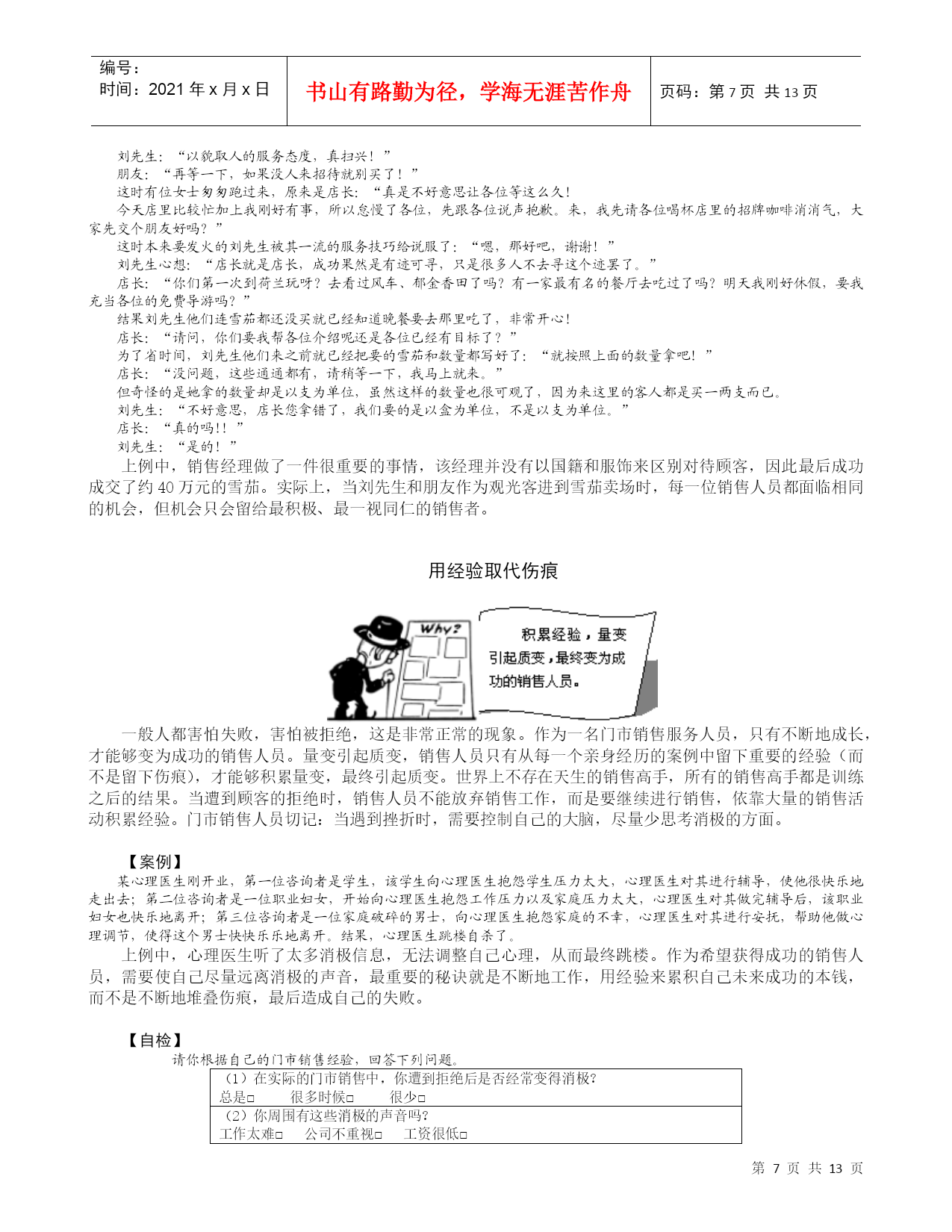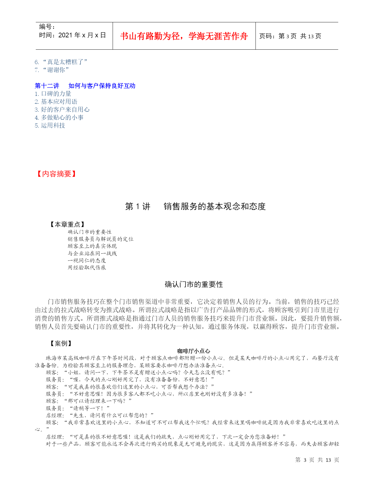 编号:时间:2021年x月x日书山有路勤为径,学海无涯苦作舟页码:第PAGE13页共NUMPAGES13页第PAGE\*MERGEFORMAT13页共NUMPAGES\*MERGEFORMAT13页《门市销售服务技巧》培训讲义(节选)【出版单位】北京大学出版社【课程名称】门市销售服务技巧【课程编号】G15【所属体系】营销类【主讲专家】刘涛【内含产品】课程12讲VCD光盘6张,文字教材1套【全套定价】600元【课程目录】第一讲门市销售服务技巧的观念和态度1.确认门市的重要性2.销售人员还同时是解说员3.客户至上的真实体现4.与企业站在同一阵线5.一视同仁的态度6.用经验取代伤痕第二讲创造亲切热情的开始1.用微笑建立桥梁2.有自信的肢体接触3.运用赞美的力量第三讲商谈的六项原则1.用肯定型语言来取代否定型语言2.用请求型语言来取代命令型语言3.用问句表示对客户的尊重4.拒绝时以对不起和请求型的话语同时并用5.不下断语,让客户自己做决定6.清楚自己的职权第四讲开场的技巧1.新的产品2.专案或计划3.惟一性4.重要的诱因5.简单明了6.制造热销的气氛第五讲激发购买欲望的技巧1.基本认知与观念2.用“如同”来取代“少买”3.运用第三者的影响力4.运用比较表或比较演示5.运用人性的弱点第六讲询问技巧的六个原则1.问题表的设计与运用2.不连续发问3.从客户回答中整理客户需求4.先询问容易的问题5.促进购买的询问方式6.询问客户关心的事情第七讲促成的技巧1.基本认知与心态2.替客户做决定3.有限数量或者期限4.推销今天买5.假设式结束法6.邀请式结束法7.法兰克结束法8.门把法第八讲处理反对问题的技巧1.基本认知与心态2.接受、认同和赞美3.化反对问题为卖点4.要有信心,不要敷衍5.以退为进6.回飞棒技巧第九讲处理客户不满的六步骤1.聆听不满2.做笔记3.分析原因4.敲定与转达决策5.追踪电话6.自我反省第十讲如何处理价格问题1.主事者的态度2.价格异议处理及注意事项3.具体的价格异议第十一讲最佳的道歉方式1.道歉的基本认知2.“对不起”3.“我向你道歉”4.“真的很抱歉”5.心里想:“谁管你呀”6.“真是太糟糕了”7.“谢谢你”第十二讲如何与客户保持良好互动1.口碑的力量2.基本应对用语3.好的客户来自用心4.多做贴心的小事5.运用科技【内容摘要】第1讲销售服务的基本观念和态度【本章重点】确认门市的重要性销售服务员与解说员的定位顾客至上的真实体现与企业站在同一战线一视同仁的态度用经验取代伤痕确认门市的重要性门市销售服务技巧在整个门市销售渠道中非常重要,它决定着销售人员的行为。当前,销售的技巧已经由过去的拉式战略转变为推式战略。所谓拉式战略是指以广告打产品品牌的形式,将顾客吸引到门市里进行消费的销售方式。所谓推式战略是指通过门市人员的销售服务技巧来提升门市营业额。因此,要提升销售额,销售人员首先要确认门市的重要性,并将其转化为一种认知,通过服务体现,以赢得顾客,提升门市营业额。【案例】咖啡厅小点心珠海市某高级咖啡厅在下午茶时间段,对于顾客点咖啡都附赠一份小点心。但是某天咖啡厅的小点心用完了,而餐厅没有准备备份。为检验其顾客至上的服务理念,某顾客要求咖啡厅想办法准备点心。顾客:“小姐,请问一下,下午茶不是有赠送小点心吗?今天怎么没有呢?”服务员:“喔,今天的点心刚好用完了,没有准备备份,不好意思!”顾客:“可是我真的很喜欢你们这里的小点心,可否帮我想个办法?”服务员:“不好意思喔!因为很多客人都不吃小点心,所以店里也刚好没有多准备!”顾客:“那可以请经理来一下吗?”服务员:“请稍等一下!”店经理:“先生,请问有什么可以帮您的?”顾客:“我非常喜欢这里的小点心,不知道可不可以帮我这个忙呢?我经常来这里喝咖啡就是因为我非常喜欢吃这里的点心。”店经理:“可是真的很不好意思喔!这是我们的疏失,点心刚好用完了,下次一定会为您准备好!”对于一些产品,顾客可能永远不会再次进行购买的现象是无可避免的现实,这是因为赢得顾客并不容易,而失去顾客却轻而易举。上例中,服务员和经理没能够区分出小点心与老顾客的轻重,没有注意到让一位下午的客人没有小点心是非常不好的事情。在该案例中,门市销售人员要注意三个问题:第一,买一份饼来留住一位老顾客的心并不是一件困难的事情;第二,门市的库存不足未被及时发现;第三,如果门市经理与服务人员的回答相同,那么,根本体现不了门市经理的价值所在。心中的认知会决定行为,真正确认门市的重要性,对于门市销售人员非常重要。门市销售人员只有确认门市工作的重要性,门市工作才能做好;如果门市销售人员没有确认其重要