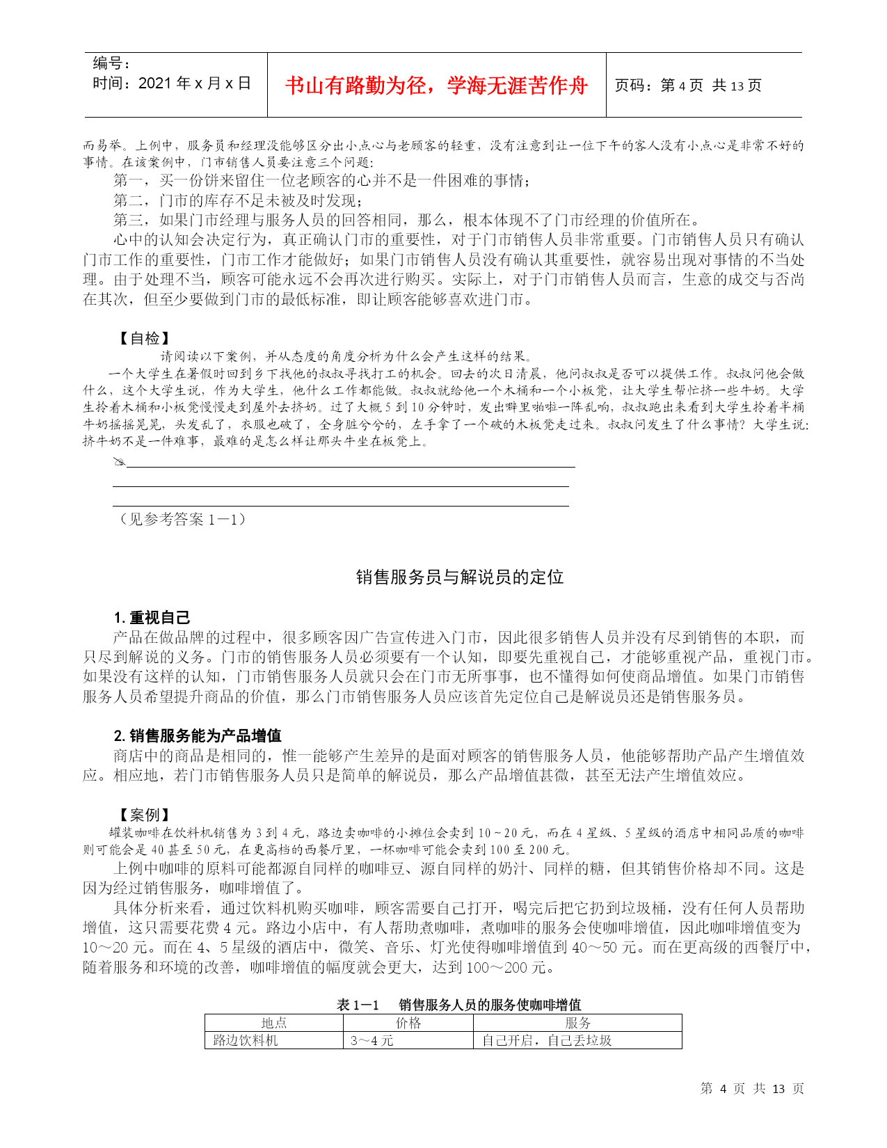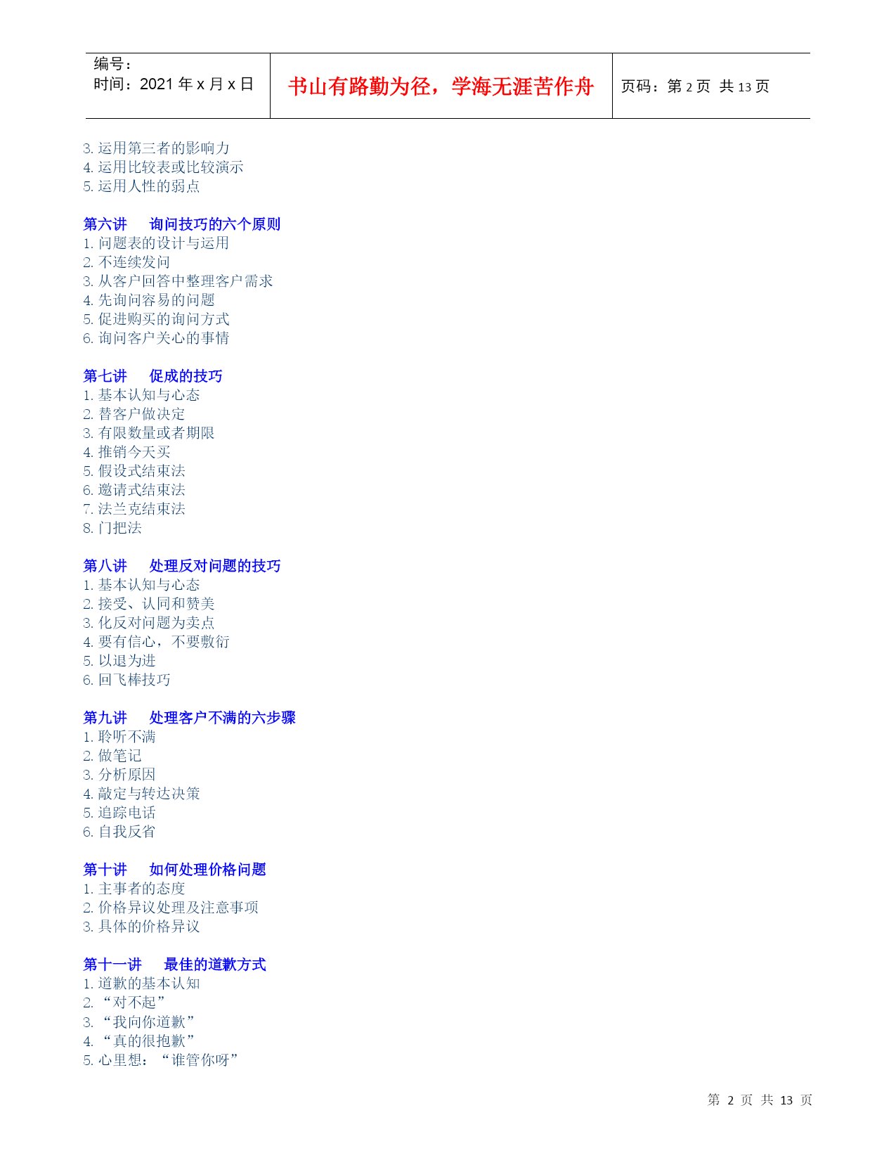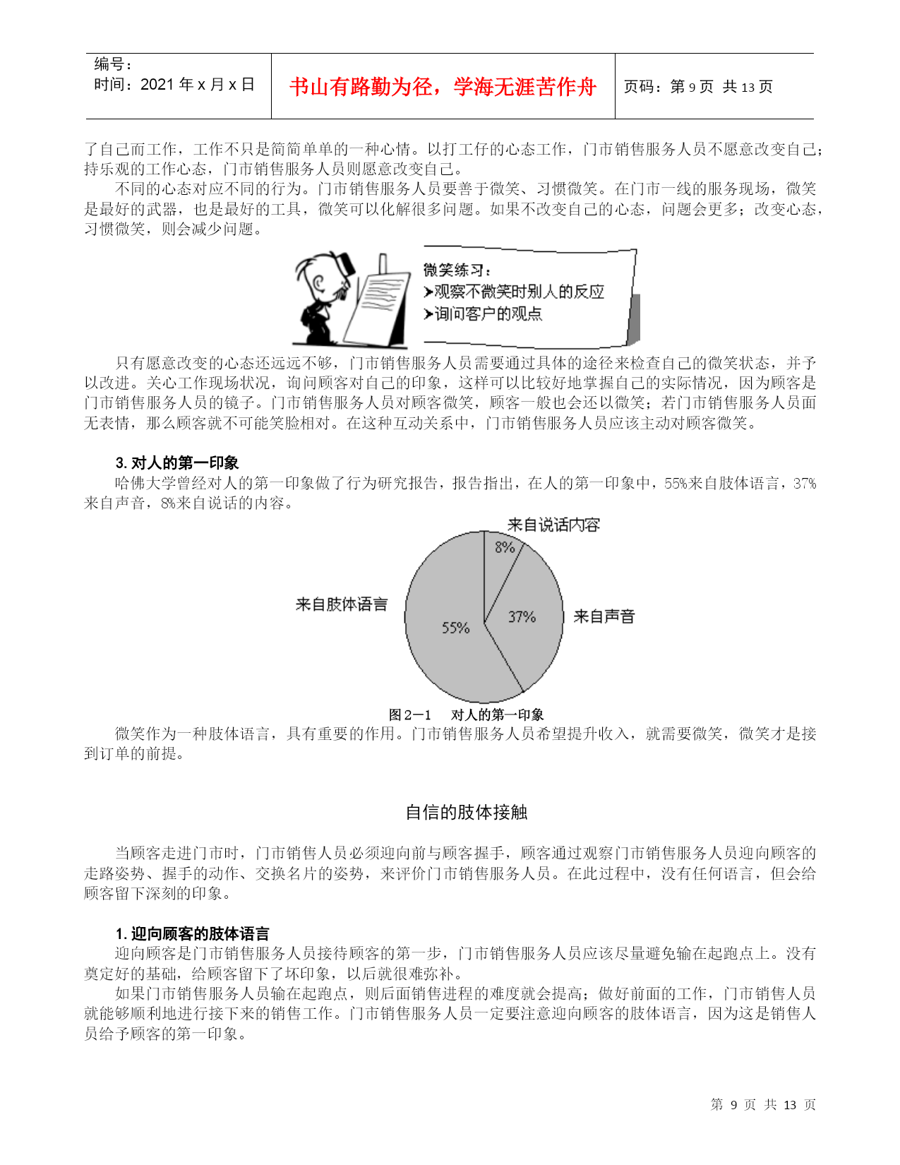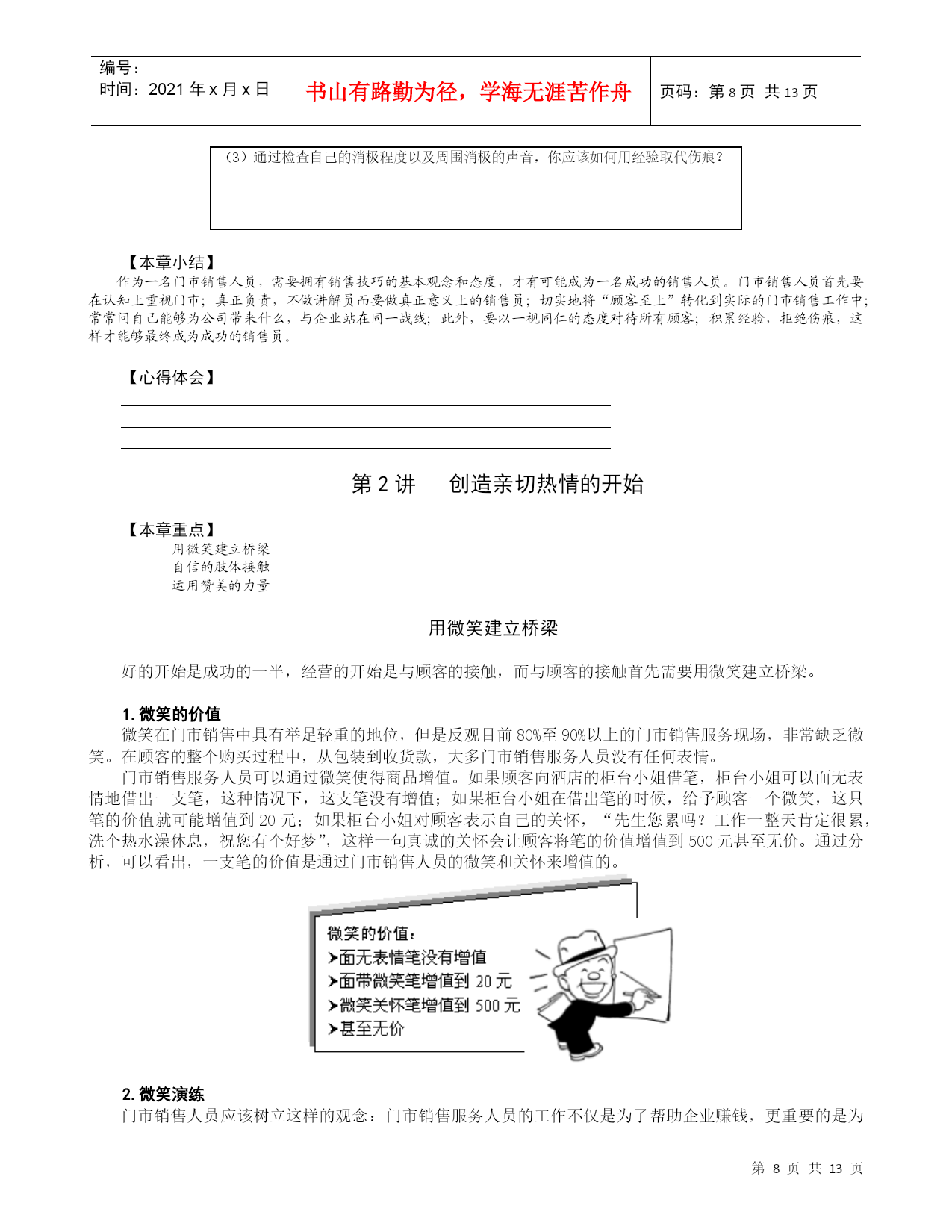 编号:时间:2021年x月x日书山有路勤为径,学海无涯苦作舟页码:第PAGE13页共NUMPAGES13页第PAGE\*MERGEFORMAT13页共NUMPAGES\*MERGEFORMAT13页《门市销售服务技巧》培训讲义(节选)【出版单位】北京大学出版社【课程名称】门市销售服务技巧【课程编号】G15【所属体系】营销类【主讲专家】刘涛【内含产品】课程12讲VCD光盘6张,文字教材1套【全套定价】600元【课程目录】第一讲门市销售服务技巧的观念和态度1.确认门市的重要性2.销售人员还同时是解说员3.客户至上的真实体现4.与企业站在同一阵线5.一视同仁的态度6.用经验取代伤痕第二讲创造亲切热情的开始1.用微笑建立桥梁2.有自信的肢体接触3.运用赞美的力量第三讲商谈的六项原则1.用肯定型语言来取代否定型语言2.用请求型语言来取代命令型语言3.用问句表示对客户的尊重4.拒绝时以对不起和请求型的话语同时并用5.不下断语,让客户自己做决定6.清楚自己的职权第四讲开场的技巧1.新的产品2.专案或计划3.惟一性4.重要的诱因5.简单明了6.制造热销的气氛第五讲激发购买欲望的技巧1.基本认知与观念2.用“如同”来取代“少买”3.运用第三者的影响力4.运用比较表或比较演示5.运用人性的弱点第六讲询问技巧的六个原则1.问题表的设计与运用2.不连续发问3.从客户回答中整理客户需求4.先询问容易的问题5.促进购买的询问方式6.询问客户关心的事情第七讲促成的技巧1.基本认知与心态2.替客户做决定3.有限数量或者期限4.推销今天买5.假设式结束法6.邀请式结束法7.法兰克结束法8.门把法第八讲处理反对问题的技巧1.基本认知与心态2.接受、认同和赞美3.化反对问题为卖点4.要有信心,不要敷衍5.以退为进6.回飞棒技巧第九讲处理客户不满的六步骤1.聆听不满2.做笔记3.分析原因4.敲定与转达决策5.追踪电话6.自我反省第十讲如何处理价格问题1.主事者的态度2.价格异议处理及注意事项3.具体的价格异议第十一讲最佳的道歉方式1.道歉的基本认知2.“对不起”3.“我向你道歉”4.“真的很抱歉”5.心里想:“谁管你呀”6.“真是太糟糕了”7.“谢谢你”第十二讲如何与客户保持良好互动1.口碑的力量2.基本应对用语3.好的客户来自用心4.多做贴心的小事5.运用科技【内容摘要】第1讲销售服务的基本观念和态度【本章重点】确认门市的重要性销售服务员与解说员的定位顾客至上的真实体现与企业站在同一战线一视同仁的态度用经验取代伤痕确认门市的重要性门市销售服务技巧在整个门市销售渠道中非常重要,它决定着销售人员的行为。当前,销售的技巧已经由过去的拉式战略转变为推式战略。所谓拉式战略是指以广告打产品品牌的形式,将顾客吸引到门市里进行消费的销售方式。所谓推式战略是指通过门市人员的销售服务技巧来提升门市营业额。因此,要提升销售额,销售人员首先要确认门市的重要性,并将其转化为一种认知,通过服务体现,以赢得顾客,提升门市营业额。【案例】咖啡厅小点心珠海市某高级咖啡厅在下午茶时间段,对于顾客点咖啡都附赠一份小点心。但是某天咖啡厅的小点心用完了,而餐厅没有准备备份。为检验其顾客至上的服务理念,某顾客要求咖啡厅想办法准备点心。顾客:“小姐,请问一下,下午茶不是有赠送小点心吗?今天怎么没有呢?”服务员:“喔,今天的点心刚好用完了,没有准备备份,不好意思!”顾客:“可是我真的很喜欢你们这里的小点心,可否帮我想个办法?”服务员:“不好意思喔!因为很多客人都不吃小点心,所以店里也刚好没有多准备!”顾客:“那可以请经理来一下吗?”服务员:“请稍等一下!”店经理:“先生,请问有什么可以帮您的?”顾客:“我非常喜欢这里的小点心,不知道可不可以帮我这个忙呢?我经常来这里喝咖啡就是因为我非常喜欢吃这里的点心。”店经理:“可是真的很不好意思喔!这是我们的疏失,点心刚好用完了,下次一定会为您准备好!”对于一些产品,顾客可能永远不会再次进行购买的现象是无可避免的现实,这是因为赢得顾客并不容易,而失去顾客却轻而易举。上例中,服务员和经理没能够区分出小点心与老顾客的轻重,没有注意到让一位下午的客人没有小点心是非常不好的事情。在该案例中,门市销售人员要注意三个问题:第一,买一份饼来留住一位老顾客的心并不是一件困难的事情;第二,门市的库存不足未被及时发现;第三,如果门市经理与服务人员的回答相同,那么,根本体现不了门市经理的价值所在。心中的认知会决定行为,真正确认门市的重要性,对于门市销售人员非常重要。门市销售人员只有确认门市工作的重要性,门市工作才能做好;如果门市销售人员没有确认其重要