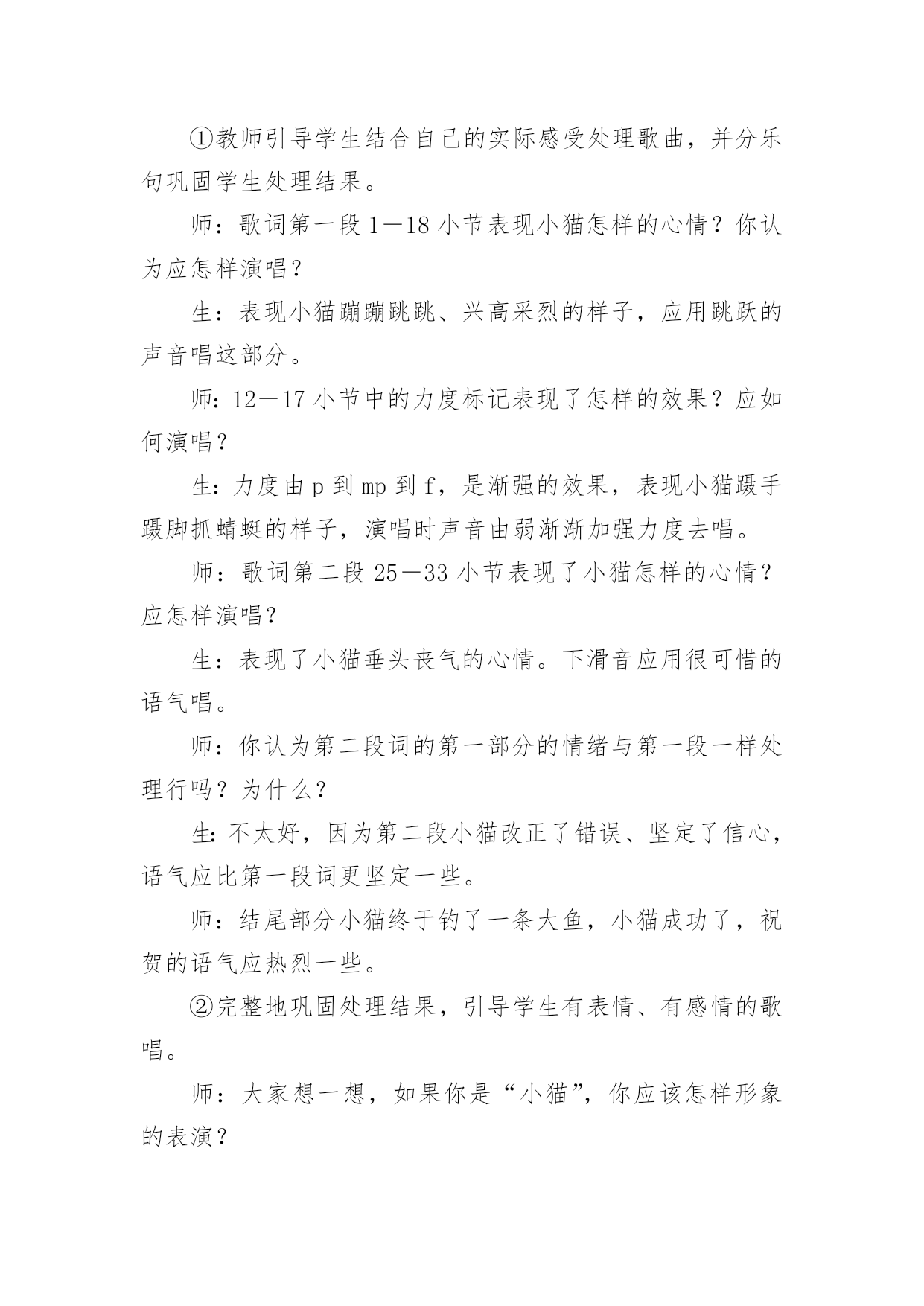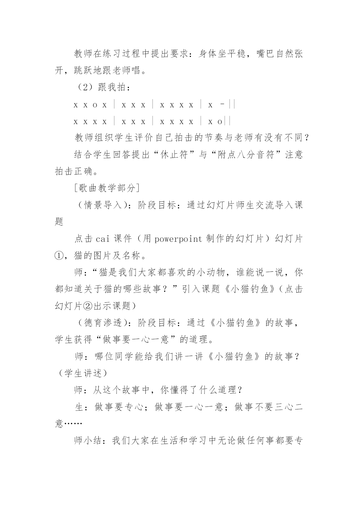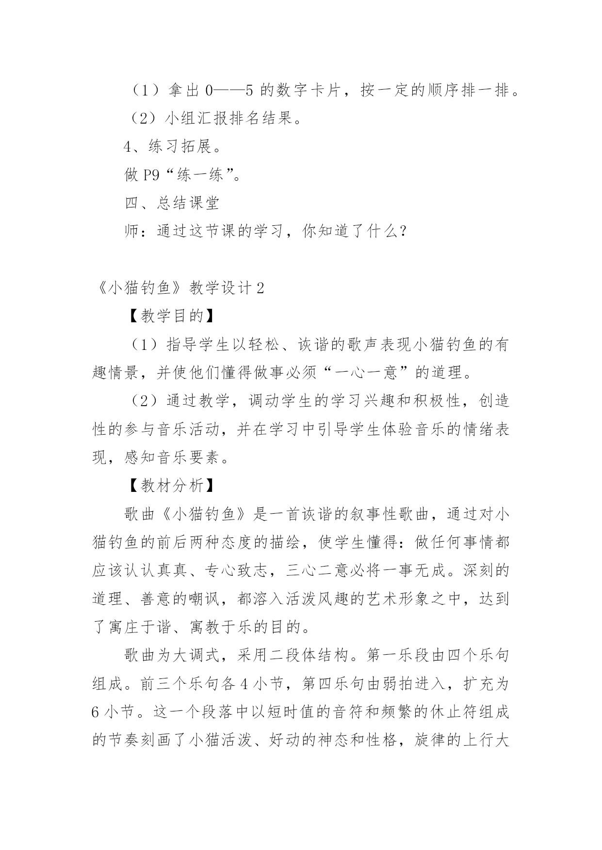 《小猫钓鱼》教学设计《小猫钓鱼》教学设计11篇作为一位杰出的教职工,时常需要用到教学设计,教学设计是对学业业绩问题的解决措施进行策划的过程。那么问题来了,教学设计应该怎么写?下面是小编精心整理的《小猫钓鱼》教学设计,欢迎阅读,希望大家能够喜欢。《小猫钓鱼》教学设计1教学内容:北师大教材一年级(上)P8—9。教学目标:1、知识技能:在预习活动中理解和体验“0”表示的意义,学会写“0”。在认识“0”的过程中,体会数学与生活的联系。2、情感态度:培养学生观察、思考以及与同伴交流的良好习惯。预习策略分析:本课时的主要内容是0的含义和0的书写。通过预习,让学生理解从有到无的变化过程,让学生自己动手,直观形象的体会到“没有”可以用0表示,从而提升学生对0的认识。学生在收集资料的同时,进行0的书写。预习设计:1、孩子跟家长玩“摘苹果的游戏”。家长说苹果数让孩子取,从而让孩子体验0的意义。2、通过找资料,了解“0”的发展史。3、让孩子在生活中找什么地方用到0,让孩子感受0不仅表示一个数,还可以表示起点和分界线等不同的含义。4、统计数量,让孩子自己尝试书写0。教学预案:一、创设情境,兴趣导入。师:前面我们已经认识了1——5这几个数了,下面老师出示卡片,请看卡片上是几就拍几下手掌。二、探究新知,发现问题。1、初步感知“0”的含义。师:昨天跟父母玩摘苹果游戏时,树上一个苹果也没有了,怎么表示呢?请你自己想一个表示的方法,然后小组交流。生:(鼓励多种表示方法,各抒己见。)师:我请字体最漂亮的孩子展示你的统计图表,汇报你统计的结果。生:师:在数学上,一个也没有我们用“0”这个数字来表示。2、丰富“0”的含义。师:小组讨论,交流,全班汇报,你在生活中还找到哪些地方遇见过0。生:温度计上遇到了0。师:0在温度计上表示什么?生:气温是0度。师:还有那些同学想汇报?生:尺子上看到0刻度。师:0表示开始,是起点。(了解0在直尺上的`作用)3、0的书写。师:0有这么多用处,我们应该学好0,写好0。小朋友看一看,想一想,这个“0”的形状像什么?生:像鸡蛋......师:《写0儿歌》数字0,像鸡蛋,上下长,左右扁;要想把它写得好,封口之处是关键。4、“0”的发展史。师:谁愿意分享你找的关于“0”的发展史?生:三、联系实际,运用新知。1、填一填。出示课本“小猫钓鱼”主题图,依次填写每只猫钓了几条鱼?用数字几来表示?2、一笔画。(从0出发。)3、游戏:排一排。(1)拿出0——5的数字卡片,按一定的顺序排一排。(2)小组汇报排名结果。4、练习拓展。做P9“练一练”。四、总结课堂师:通过这节课的学习,你知道了什么?《小猫钓鱼》教学设计2【教学目的】(1)指导学生以轻松、诙谐的歌声表现小猫钓鱼的有趣情景,并使他们懂得做事必须“一心一意”的道理。(2)通过教学,调动学生的学习兴趣和积极性,创造性的参与音乐活动,并在学习中引导学生体验音乐的情绪表现,感知音乐要素。【教材分析】歌曲《小猫钓鱼》是一首诙谐的叙事性歌曲,通过对小猫钓鱼的前后两种态度的描绘,使学生懂得:做任何事情都应该认认真真、专心致志,三心二意必将一事无成。深刻的道理、善意的嘲讽,都溶入活泼风趣的艺术形象之中,达到了寓庄于谐、寓教于乐的目的。歌曲为大调式,采用二段体结构。第一乐段由四个乐句组成。前三个乐句各4小节,第四乐句由弱拍进入,扩充为6小节。这一个段落中以短时值的音符和频繁的休止符组成的节奏刻画了小猫活泼、好动的神态和性格,旋律的上行大跳(如5303│,5432│)以及断续的进行,造成了的夸张的语气,表达了对小猫做事三心二意的善意讽刺和改正缺点后的连声夸奖。歌曲这部分以叙事为主,具有戏剧性效果。第二乐段的前一乐句转为拍子,旋律从高音区开始,音调连贯,节奏舒展,与第一乐段形成鲜明的对比;后一乐句仍转回拍,运用了第一乐段中的旋律素材,使歌曲前后呼应。这一段落着重于感情的表达,为小猫的失败而惋惜,为小猎的成功而欢欣。歌曲的两段歌词分别描绘小猫对事物的两种截然不同的态度,表达了歌唱者不同的情感反应,因此在演唱时,应根据具体的内容,在力度、音色和表情上相应的不同处理。歌曲的引子与间奏生动活跃,富有情趣,对塑造歌曲的诙谐、活泼的艺术形象起到了加强补充的作用。【教学重点】启发学生如何根据歌词内容来处理并表演歌曲。【教具准备】钢琴、多媒体投影、电脑cai课件、录音机等【教学时间】一课时【教学过程】[基本练习部分](1)跟我唱:1=f←→bb(2)5111765053333210lalalalalalalalalalalalalalala教师在练习过程中提出要求:身体坐平稳,嘴巴自然张开,跳跃地跟老师唱。(2)跟我拍:xxox|xxx|xxxx|x–||xxxx|xxx|xxxx|xo||教师组织学生评价自己拍击的节奏与老师有没