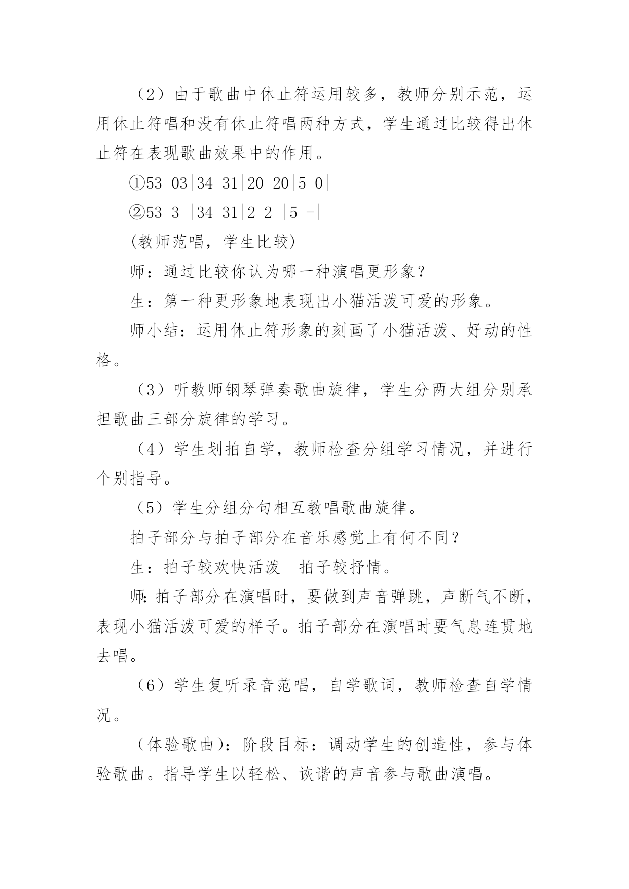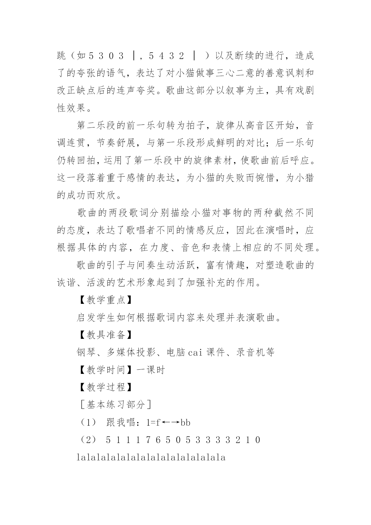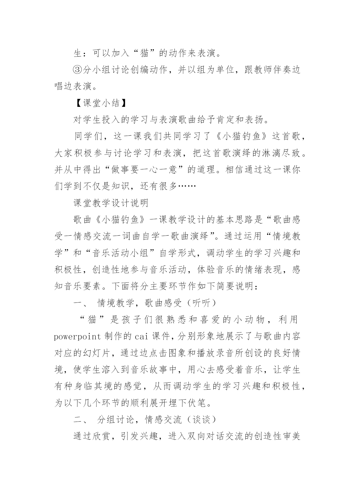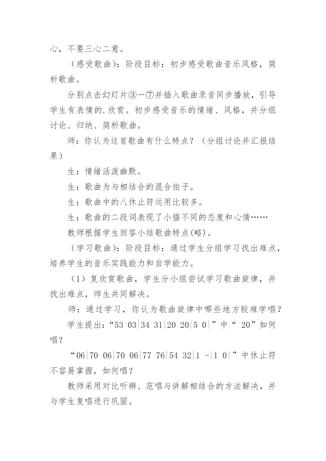 《小猫钓鱼》教学设计《小猫钓鱼》教学设计11篇作为一位杰出的教职工,时常需要用到教学设计,教学设计是对学业业绩问题的解决措施进行策划的过程。那么问题来了,教学设计应该怎么写?下面是小编精心整理的《小猫钓鱼》教学设计,欢迎阅读,希望大家能够喜欢。《小猫钓鱼》教学设计1教学内容:北师大教材一年级(上)P8—9。教学目标:1、知识技能:在预习活动中理解和体验“0”表示的意义,学会写“0”。在认识“0”的过程中,体会数学与生活的联系。2、情感态度:培养学生观察、思考以及与同伴交流的良好习惯。预习策略分析:本课时的主要内容是0的含义和0的书写。通过预习,让学生理解从有到无的变化过程,让学生自己动手,直观形象的体会到“没有”可以用0表示,从而提升学生对0的认识。学生在收集资料的同时,进行0的书写。预习设计:1、孩子跟家长玩“摘苹果的游戏”。家长说苹果数让孩子取,从而让孩子体验0的意义。2、通过找资料,了解“0”的发展史。3、让孩子在生活中找什么地方用到0,让孩子感受0不仅表示一个数,还可以表示起点和分界线等不同的含义。4、统计数量,让孩子自己尝试书写0。教学预案:一、创设情境,兴趣导入。师:前面我们已经认识了1——5这几个数了,下面老师出示卡片,请看卡片上是几就拍几下手掌。二、探究新知,发现问题。1、初步感知“0”的含义。师:昨天跟父母玩摘苹果游戏时,树上一个苹果也没有了,怎么表示呢?请你自己想一个表示的方法,然后小组交流。生:(鼓励多种表示方法,各抒己见。)师:我请字体最漂亮的孩子展示你的统计图表,汇报你统计的结果。生:师:在数学上,一个也没有我们用“0”这个数字来表示。2、丰富“0”的含义。师:小组讨论,交流,全班汇报,你在生活中还找到哪些地方遇见过0。生:温度计上遇到了0。师:0在温度计上表示什么?生:气温是0度。师:还有那些同学想汇报?生:尺子上看到0刻度。师:0表示开始,是起点。(了解0在直尺上的`作用)3、0的书写。师:0有这么多用处,我们应该学好0,写好0。小朋友看一看,想一想,这个“0”的形状像什么?生:像鸡蛋......师:《写0儿歌》数字0,像鸡蛋,上下长,左右扁;要想把它写得好,封口之处是关键。4、“0”的发展史。师:谁愿意分享你找的关于“0”的发展史?生:三、联系实际,运用新知。1、填一填。出示课本“小猫钓鱼”主题图,依次填写每只猫钓了几条鱼?用数字几来表示?2、一笔画。(从0出发。)3、游戏:排一排。(1)拿出0——5的数字卡片,按一定的顺序排一排。(2)小组汇报排名结果。4、练习拓展。做P9“练一练”。四、总结课堂师:通过这节课的学习,你知道了什么?《小猫钓鱼》教学设计2【教学目的】(1)指导学生以轻松、诙谐的歌声表现小猫钓鱼的有趣情景,并使他们懂得做事必须“一心一意”的道理。(2)通过教学,调动学生的学习兴趣和积极性,创造性的参与音乐活动,并在学习中引导学生体验音乐的情绪表现,感知音乐要素。【教材分析】歌曲《小猫钓鱼》是一首诙谐的叙事性歌曲,通过对小猫钓鱼的前后两种态度的描绘,使学生懂得:做任何事情都应该认认真真、专心致志,三心二意必将一事无成。深刻的道理、善意的嘲讽,都溶入活泼风趣的艺术形象之中,达到了寓庄于谐、寓教于乐的目的。歌曲为大调式,采用二段体结构。第一乐段由四个乐句组成。前三个乐句各4小节,第四乐句由弱拍进入,扩充为6小节。这一个段落中以短时值的音符和频繁的休止符组成的节奏刻画了小猫活泼、好动的神态和性格,旋律的上行大跳(如5303│,5432│)以及断续的进行,造成了的夸张的语气,表达了对小猫做事三心二意的善意讽刺和改正缺点后的连声夸奖。歌曲这部分以叙事为主,具有戏剧性效果。第二乐段的前一乐句转为拍子,旋律从高音区开始,音调连贯,节奏舒展,与第一乐段形成鲜明的对比;后一乐句仍转回拍,运用了第一乐段中的旋律素材,使歌曲前后呼应。这一段落着重于感情的表达,为小猫的失败而惋惜,为小猎的成功而欢欣。歌曲的两段歌词分别描绘小猫对事物的两种截然不同的态度,表达了歌唱者不同的情感反应,因此在演唱时,应根据具体的内容,在力度、音色和表情上相应的不同处理。歌曲的引子与间奏生动活跃,富有情趣,对塑造歌曲的诙谐、活泼的艺术形象起到了加强补充的作用。【教学重点】启发学生如何根据歌词内容来处理并表演歌曲。【教具准备】钢琴、多媒体投影、电脑cai课件、录音机等【教学时间】一课时【教学过程】[基本练习部分](1)跟我唱:1=f←→bb(2)5111765053333210lalalalalalalalalalalalalalala教师在练习过程中提出要求:身体坐平稳,嘴巴自然张开,跳跃地跟老师唱。(2)跟我拍:xxox|xxx|xxxx|x–||xxxx|xxx|xxxx|xo||教师组织学生评价自己拍击的节奏与老师有没