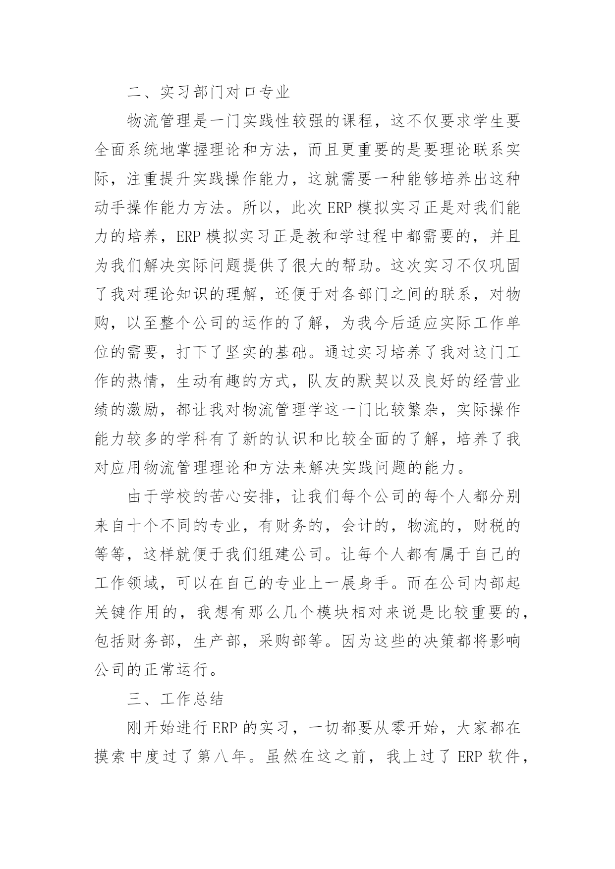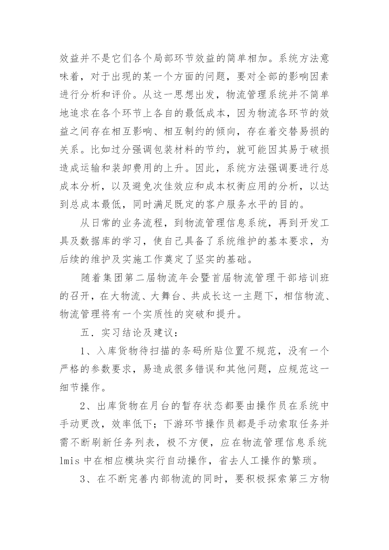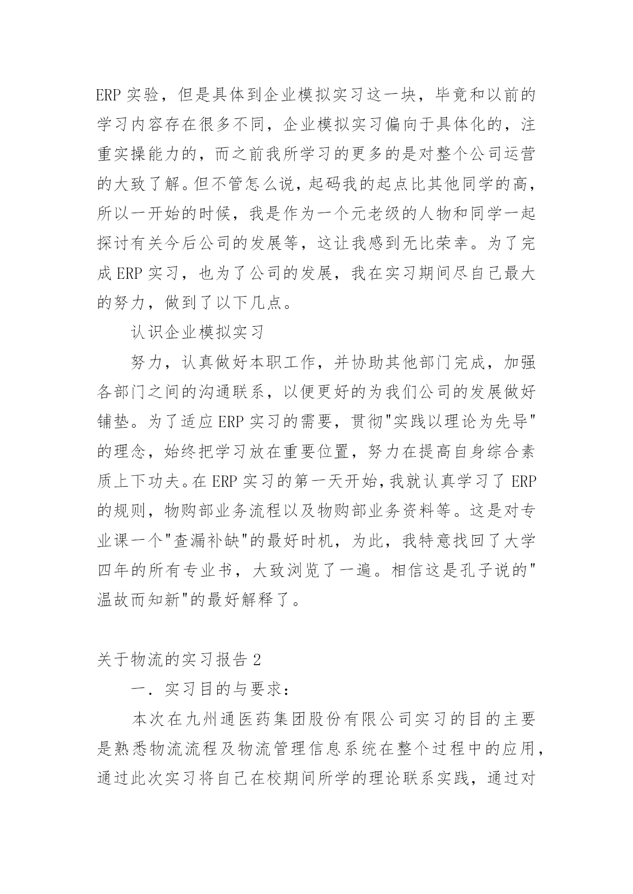 物流的实习报告关于物流的实习报告(15篇)在生活中,报告使用的次数愈发增长,其在写作上有一定的技巧。写起报告来就毫无头绪?以下是小编为大家收集的关于物流的实习报告,仅供参考,希望能够帮助到大家。关于物流的实习报告1一、实习背景一个多月的实习已过去了,还记得参加ERP校内实习的第一天,我选择了做我们公司的物流和采购这两个部门。这是综合考虑到了我的专业以及其他同学因从未接触到这方面的原因,我主动承担了下来,并在另外两名外专业的同学一起合作,组成了我们的物购小组。自从我做了物流部兼采购部的经理(以下简称物购)以来,在ERP实习老师的指导下,在公司各位成员的密切配合下,努力做到爱岗敬业,恪尽职守,以务实的工作作风,坚定的思想信念和饱满的工作热情,较好地完成了自己的本职工作和领导交办的各项工作。广东商学院ERP实验中心是广东商学院适应社会对综合型,应用型,复合型管理人才需要,结合企业和社会信息化发展,面向管理学科的综合性ERP应用典型案例和电子数据和多媒体资源,开展ERP技术及应用研究和我校经济管理学科专业学生进行ERP技术及应用实验和模拟企业实习。二、实习部门对口专业物流管理是一门实践性较强的课程,这不仅要求学生要全面系统地掌握理论和方法,而且更重要的是要理论联系实际,注重提升实践操作能力,这就需要一种能够培养出这种动手操作能力方法。所以,此次ERP模拟实习正是对我们能力的培养,ERP模拟实习正是教和学过程中都需要的,并且为我们解决实际问题提供了很大的帮助。这次实习不仅巩固了我对理论知识的理解,还便于对各部门之间的联系,对物购,以至整个公司的运作的了解,为我今后适应实际工作单位的需要,打下了坚实的基础。通过实习培养了我对这门工作的热情,生动有趣的方式,队友的默契以及良好的经营业绩的激励,都让我对物流管理学这一门比较繁杂,实际操作能力较多的学科有了新的认识和比较全面的了解,培养了我对应用物流管理理论和方法来解决实践问题的能力。由于学校的苦心安排,让我们每个公司的每个人都分别来自十个不同的专业,有财务的,会计的,物流的,财税的等等,这样就便于我们组建公司。让每个人都有属于自己的工作领域,可以在自己的专业上一展身手。而在公司内部起关键作用的,我想有那么几个模块相对来说是比较重要的,包括财务部,生产部,采购部等。因为这些的决策都将影响公司的正常运行。三、工作总结刚开始进行ERP的实习,一切都要从零开始,大家都在摸索中度过了第八年。虽然在这之前,我上过了ERP软件,ERP实验,但是具体到企业模拟实习这一块,毕竟和以前的学习内容存在很多不同,企业模拟实习偏向于具体化的,注重实操能力的,而之前我所学习的更多的是对整个公司运营的大致了解。但不管怎么说,起码我的起点比其他同学的高,所以一开始的时候,我是作为一个元老级的人物和同学一起探讨有关今后公司的发展等,这让我感到无比荣幸。为了完成ERP实习,也为了公司的发展,我在实习期间尽自己最大的努力,做到了以下几点。认识企业模拟实习努力,认真做好本职工作,并协助其他部门完成,加强各部门之间的沟通联系,以便更好的为我们公司的发展做好铺垫。为了适应ERP实习的需要,贯彻"实践以理论为先导"的理念,始终把学习放在重要位置,努力在提高自身综合素质上下功夫。在ERP实习的第一天开始,我就认真学习了ERP的规则,物购部业务流程以及物购部业务资料等。这是对专业课一个"查漏补缺"的最好时机,为此,我特意找回了大学四年的所有专业书,大致浏览了一遍。相信这是孔子说的"温故而知新"的最好解释了。关于物流的实习报告2一.实习目的与要求:本次在九州通医药集团股份有限公司实习的目的主要是熟悉物流流程及物流管理信息系统在整个过程中的应用,通过此次实习将自己在校期间所学的理论联系实践,通过对日常业务流程、物流管理信息系统(lmis)运行以及开发工具与数据库的学习,达到系统维护与实施的基本要求,以及为将来的系统开发积累基础。实习期间集团要求严格按照实习计划组织学习,保质保量完成实习任务,并顺利通过实习考核。二:实习单位简介:九州通医药集团股份有限公司发轫于改革开放之初的1985年,是一家以药品和医疗器械批发、物流配送、零售连锁以及电子商务为核心业务的股份制企业。九州通在国内开创的“低成本、高效率”的医药商业模式被中国医药界誉为“九州通模式”,并成为中国医药物流发展的主流模式,铸就了享誉中国医药行业的九州通品牌。九州通在行业内率先建立了电子商务平台——九州通医药网,实现了供货—销售—银行结算的网上一条龙服务,网上年销售额达10亿元,位居国内同类型网站第一名。九州通目前已是国内唯一具备整合物流规划、物流实施、系统集成能力的大型现代医药物流企业,物流、信息等技术处于国内一流、国际领先的地位。三.实习安排与过程从4月1日起,我们开始了一个月的实习