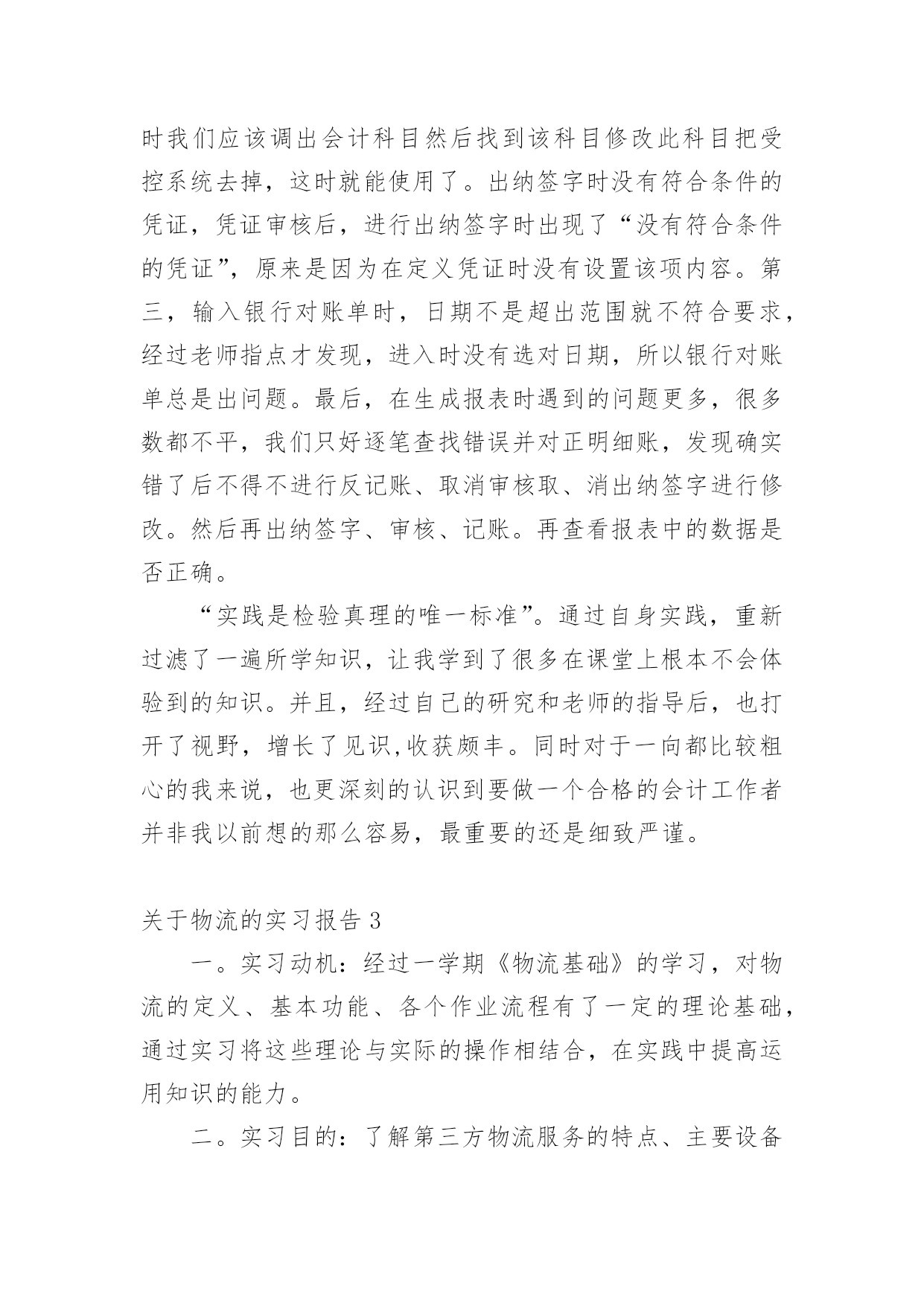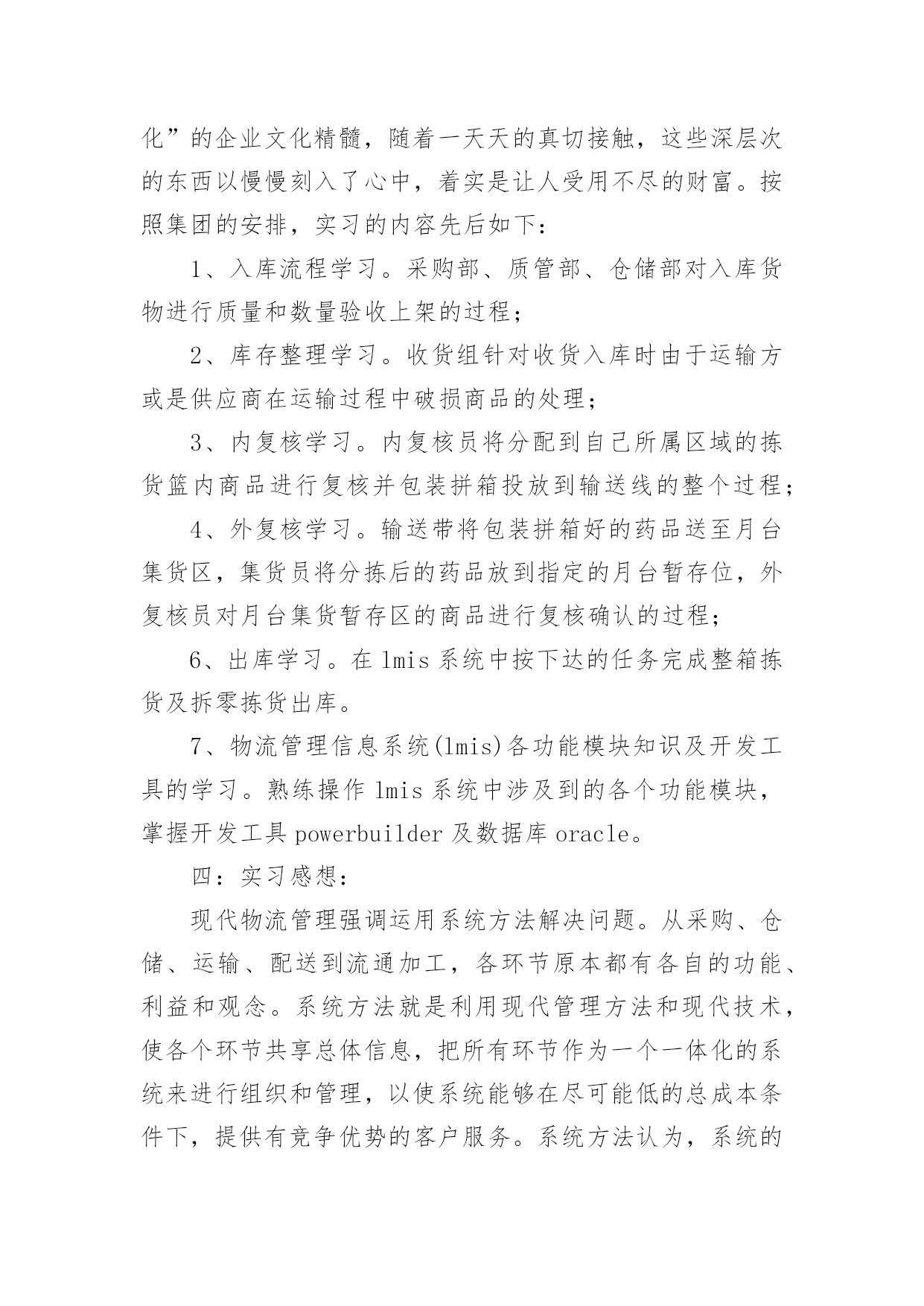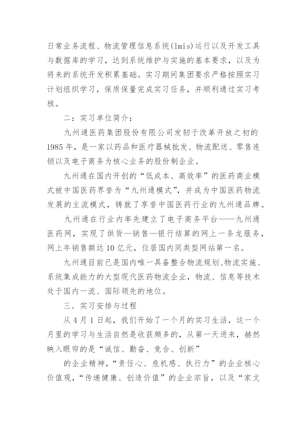 物流的实习报告关于物流的实习报告(15篇)在生活中,报告使用的次数愈发增长,其在写作上有一定的技巧。写起报告来就毫无头绪?以下是小编为大家收集的关于物流的实习报告,仅供参考,希望能够帮助到大家。关于物流的实习报告1一、实习背景一个多月的实习已过去了,还记得参加ERP校内实习的第一天,我选择了做我们公司的物流和采购这两个部门。这是综合考虑到了我的专业以及其他同学因从未接触到这方面的原因,我主动承担了下来,并在另外两名外专业的同学一起合作,组成了我们的物购小组。自从我做了物流部兼采购部的经理(以下简称物购)以来,在ERP实习老师的指导下,在公司各位成员的密切配合下,努力做到爱岗敬业,恪尽职守,以务实的工作作风,坚定的思想信念和饱满的工作热情,较好地完成了自己的本职工作和领导交办的各项工作。广东商学院ERP实验中心是广东商学院适应社会对综合型,应用型,复合型管理人才需要,结合企业和社会信息化发展,面向管理学科的综合性ERP应用典型案例和电子数据和多媒体资源,开展ERP技术及应用研究和我校经济管理学科专业学生进行ERP技术及应用实验和模拟企业实习。二、实习部门对口专业物流管理是一门实践性较强的课程,这不仅要求学生要全面系统地掌握理论和方法,而且更重要的是要理论联系实际,注重提升实践操作能力,这就需要一种能够培养出这种动手操作能力方法。所以,此次ERP模拟实习正是对我们能力的培养,ERP模拟实习正是教和学过程中都需要的,并且为我们解决实际问题提供了很大的帮助。这次实习不仅巩固了我对理论知识的理解,还便于对各部门之间的联系,对物购,以至整个公司的运作的了解,为我今后适应实际工作单位的需要,打下了坚实的基础。通过实习培养了我对这门工作的热情,生动有趣的方式,队友的默契以及良好的经营业绩的激励,都让我对物流管理学这一门比较繁杂,实际操作能力较多的学科有了新的认识和比较全面的了解,培养了我对应用物流管理理论和方法来解决实践问题的能力。由于学校的苦心安排,让我们每个公司的每个人都分别来自十个不同的专业,有财务的,会计的,物流的,财税的等等,这样就便于我们组建公司。让每个人都有属于自己的工作领域,可以在自己的专业上一展身手。而在公司内部起关键作用的,我想有那么几个模块相对来说是比较重要的,包括财务部,生产部,采购部等。因为这些的决策都将影响公司的正常运行。三、工作总结刚开始进行ERP的实习,一切都要从零开始,大家都在摸索中度过了第八年。虽然在这之前,我上过了ERP软件,ERP实验,但是具体到企业模拟实习这一块,毕竟和以前的学习内容存在很多不同,企业模拟实习偏向于具体化的,注重实操能力的,而之前我所学习的更多的是对整个公司运营的大致了解。但不管怎么说,起码我的起点比其他同学的高,所以一开始的时候,我是作为一个元老级的人物和同学一起探讨有关今后公司的发展等,这让我感到无比荣幸。为了完成ERP实习,也为了公司的发展,我在实习期间尽自己最大的努力,做到了以下几点。认识企业模拟实习努力,认真做好本职工作,并协助其他部门完成,加强各部门之间的沟通联系,以便更好的为我们公司的发展做好铺垫。为了适应ERP实习的需要,贯彻"实践以理论为先导"的理念,始终把学习放在重要位置,努力在提高自身综合素质上下功夫。在ERP实习的第一天开始,我就认真学习了ERP的规则,物购部业务流程以及物购部业务资料等。这是对专业课一个"查漏补缺"的最好时机,为此,我特意找回了大学四年的所有专业书,大致浏览了一遍。相信这是孔子说的"温故而知新"的最好解释了。关于物流的实习报告2一.实习目的与要求:本次在九州通医药集团股份有限公司实习的目的主要是熟悉物流流程及物流管理信息系统在整个过程中的应用,通过此次实习将自己在校期间所学的理论联系实践,通过对日常业务流程、物流管理信息系统(lmis)运行以及开发工具与数据库的学习,达到系统维护与实施的基本要求,以及为将来的系统开发积累基础。实习期间集团要求严格按照实习计划组织学习,保质保量完成实习任务,并顺利通过实习考核。二:实习单位简介:九州通医药集团股份有限公司发轫于改革开放之初的1985年,是一家以药品和医疗器械批发、物流配送、零售连锁以及电子商务为核心业务的股份制企业。九州通在国内开创的“低成本、高效率”的医药商业模式被中国医药界誉为“九州通模式”,并成为中国医药物流发展的主流模式,铸就了享誉中国医药行业的九州通品牌。九州通在行业内率先建立了电子商务平台——九州通医药网,实现了供货—销售—银行结算的网上一条龙服务,网上年销售额达10亿元,位居国内同类型网站第一名。九州通目前已是国内唯一具备整合物流规划、物流实施、系统集成能力的大型现代医药物流企业,物流、信息等技术处于国内一流、国际领先的地位。三.实习安排与过程从4月1日起,我们开始了一个月的实习