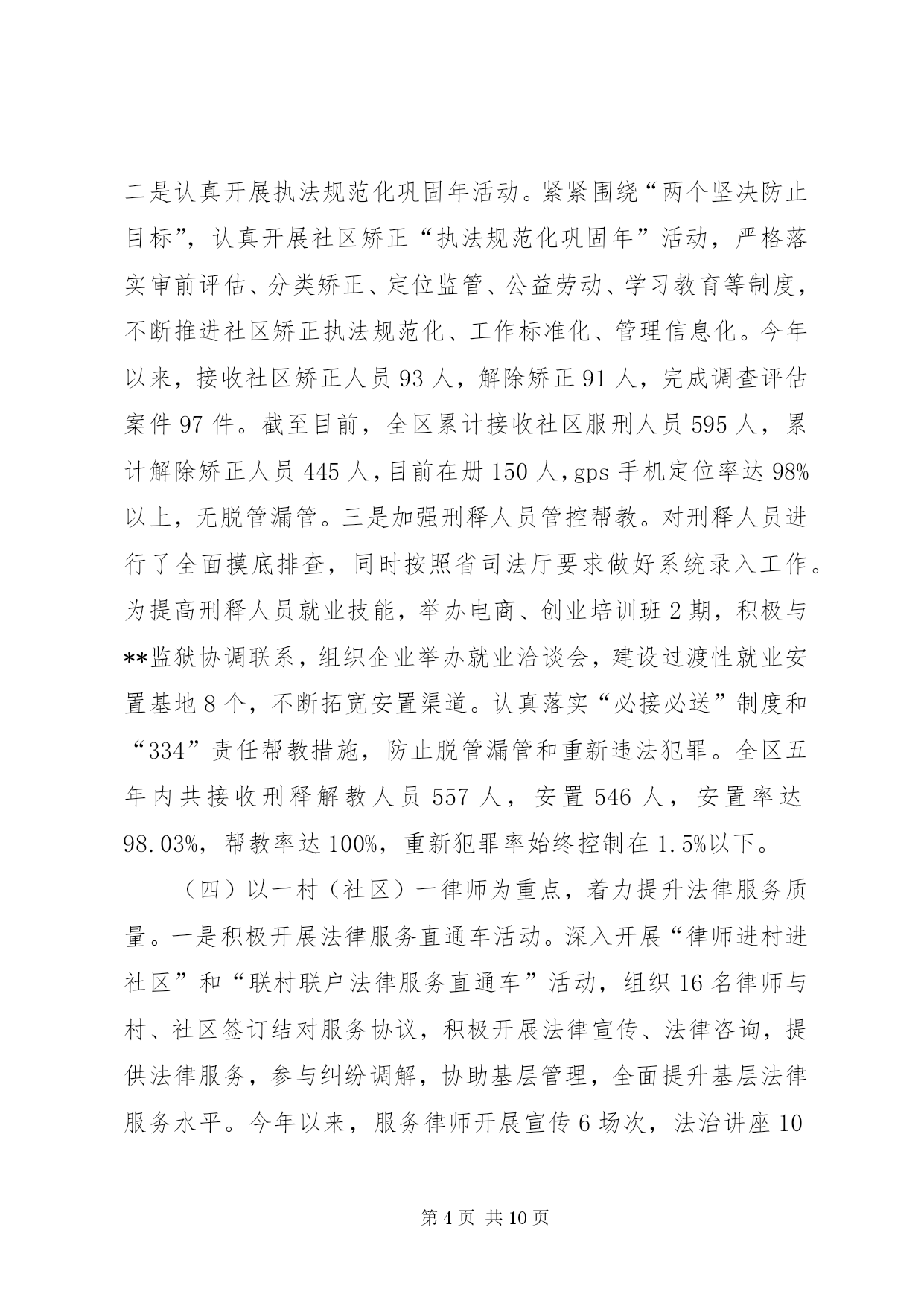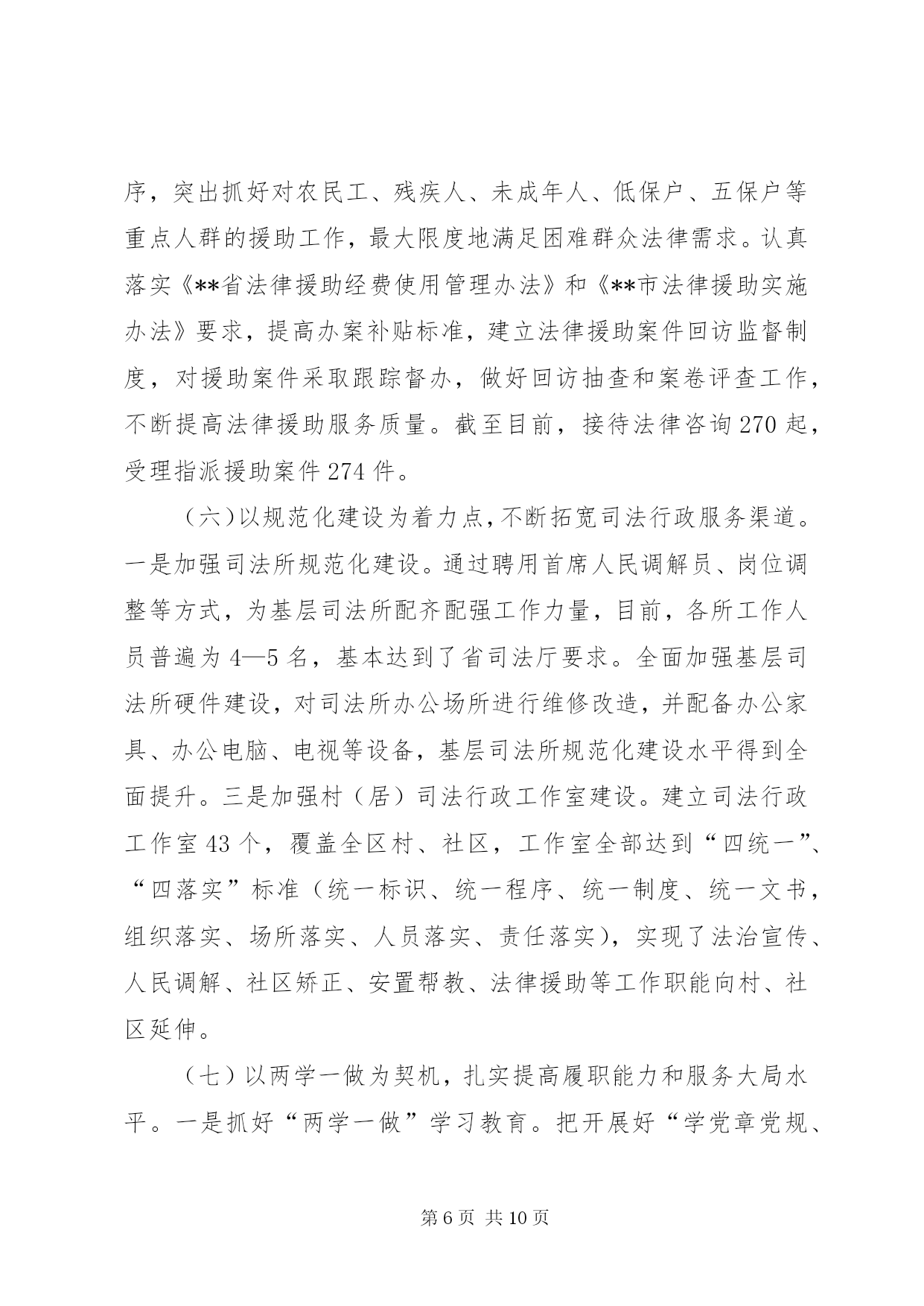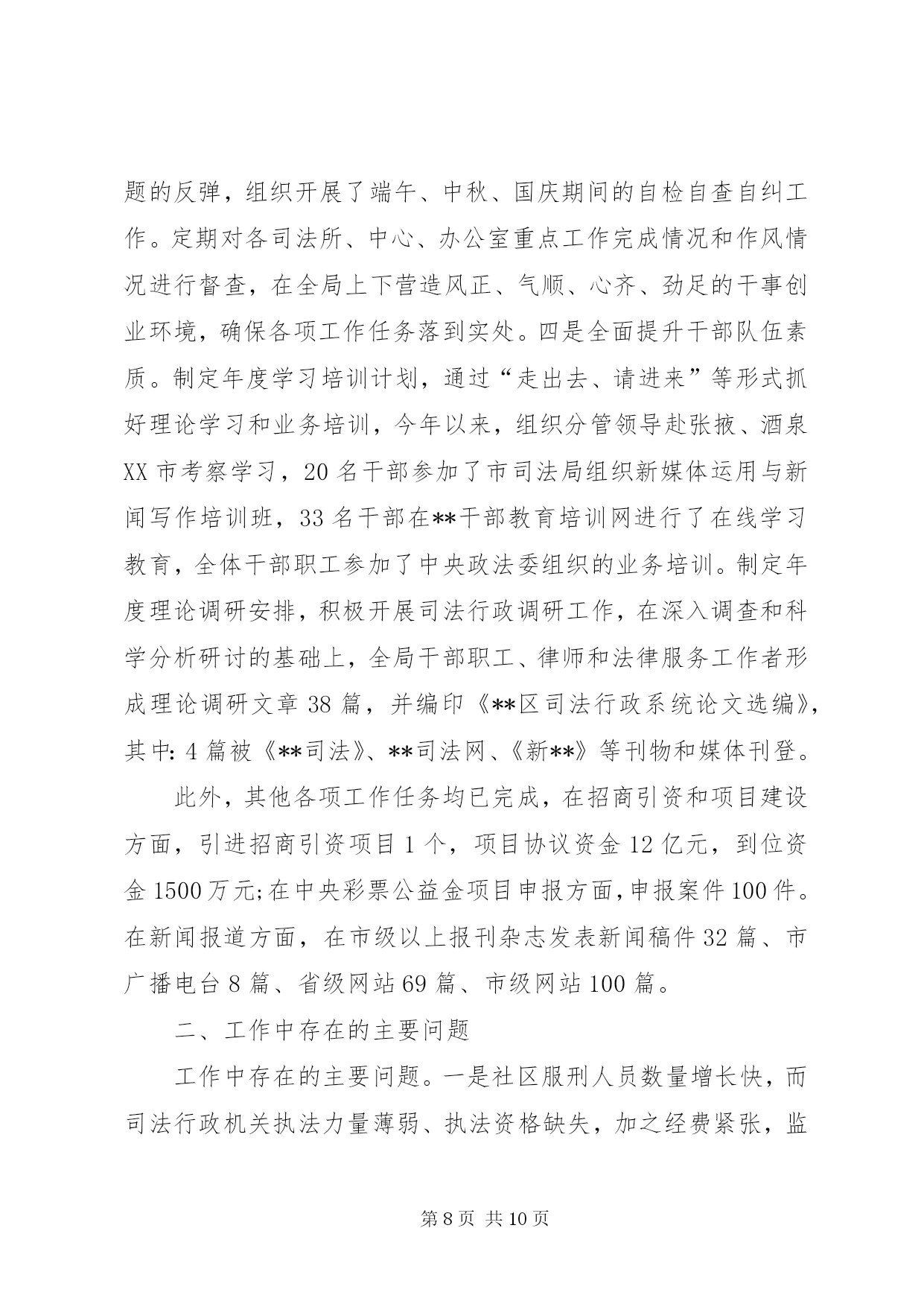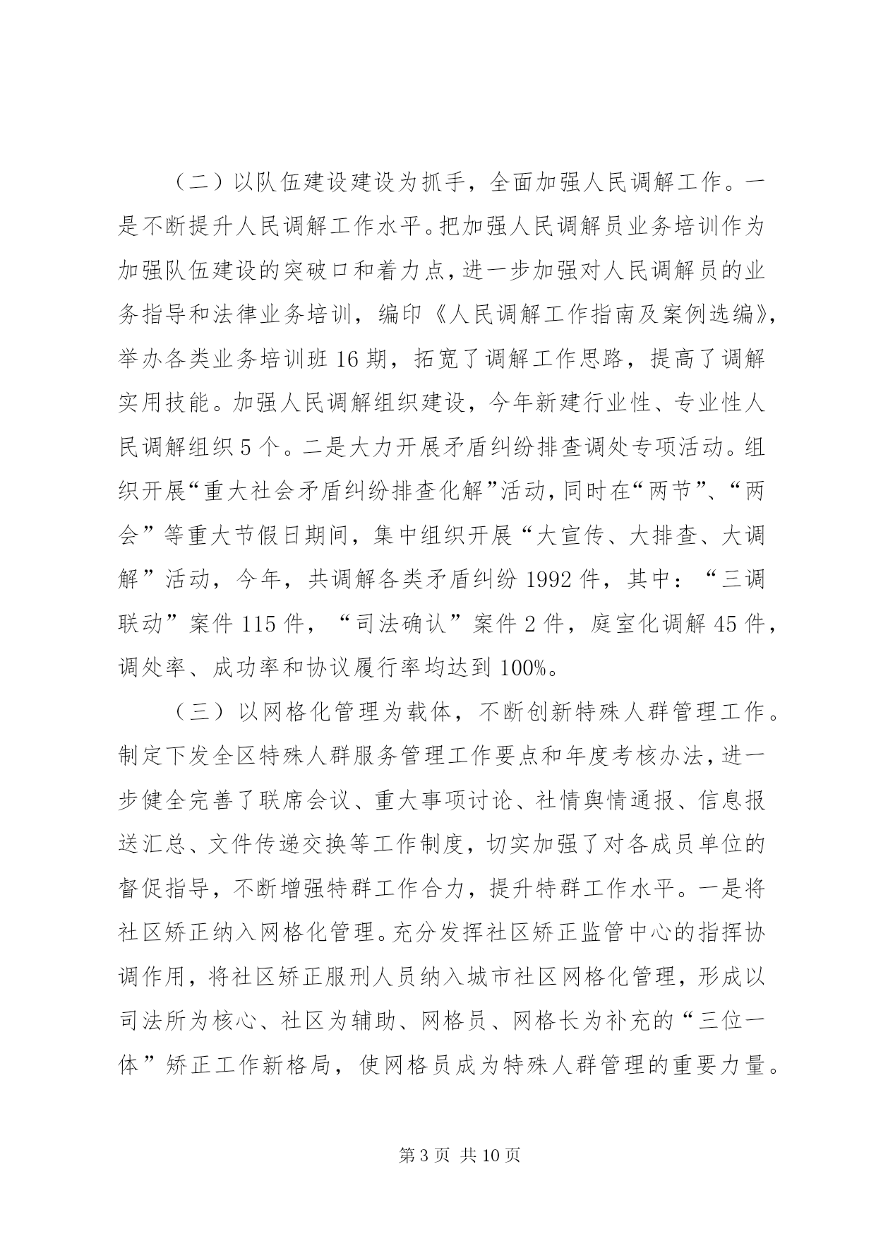 第PAGE\*Arabic\*MERGEFORMAT10页共NUMPAGES\*MERGEFORMAT10页区司法局XX年工作总结今年以来,**区司法局在区委、区政府的正确领导和市司法局的精心指导下,充分发挥法律宣传、法律保障、法律服务职能作用,切实做好服务发展、服务民生、服务稳定的各项工作,为全区经济社会发展营造了和谐稳定的社会环境、优质高效的服务环境和公平正义的法治环境。现将一年来工作进展情况总结如下:一、2016年各项工作完成情况(一)以法治**建设为目标,全面加强普法依法治理工作。一是认真做好“七五”普法规划编制工作。为确保“七五”普法开好头,起好步,认真总结“六五”普法中的经验做法,紧紧围绕国家、省、市“七五”规划要求,从机制制度、方式方法、社会发动、载体形式上进一步探索,精心编制全区“七五”普法规划,同时,全面推动落实“谁执法谁普法”普法责任制,制定普法责任清单,督促落实“七五”普法规划各项目标任务。二是认真抓好“法律八进”。开展机关干部法律知识培训和考试,组织全区领导干部参观**区人民检察院警示教育基地,促进提升领导干部依法依纪履职能力;利用青少年法治教育基地宣传教育作用,组织青少年开展模拟法庭等法治实践活动;利用乡镇物资交流会等活动,将法治宣传教育融入活动之中;各社区充分利用3.8、5.12、民族团结进步月等节点,开展多种形式的法治宣传教育。在**文化旅游节、**路立交桥征地拆迁、金阿铁路征地拆迁维稳执勤活动中,向群众发放法治宣传资料,宣讲法律知识。此外,集中开展了以“双联法律服务直通车”为主题的农村法治宣传周,以“珍爱生命、拒绝毒品”为主题的6.26禁毒宣传日,国家宪法日系列宣传等活动,广大群众学法、尊法、守法、用法意识不断增强,法律素质明显提高。今年以来,共编辑、征订、发放各类普法资料12000余册,举行大型法治宣传活动5次,解答群众法律咨询300余人次。三是深入开展法治文化建设。充分发挥法治公园,法治广场,法治长廊,法治基地示范引领作用,营造浓厚的法治生活氛围。依托qq、微信、**司法网、**司法行政网等新媒体,开通普法宣传群和公众号,发布普法信息,打造“内容共分享、普法多形式、宣传零距离”的法治**宣传新平台。在创新新媒体普法作用的同时,积极发挥电视、报刊等传统媒体的作用,《**区普法专刊》影响力持续扩大,《**法制报》等媒体对我区普法依法治理工作进行了专题报道。四是扎实开展法治创建活动。坚持把普法依法治理工作与法治城市建设一体推进,通过层层动员部署,层层分解任务,层层督促落实,明确各级各部门工作责任,推动各层次、各行业、各系统法治建设深入推进。目前,全区已建成全国民主法治示范村(社区)2个,省级民主法治示范村(社区)9个,“民主法治示范村(社区)”创建率已达80%,为进一步深化“法治**”建设奠定了坚实基础。**区今年被省司法厅推荐为“全国‘六五’普法先进县(市、区)”。(二)以队伍建设建设为抓手,全面加强人民调解工作。一是不断提升人民调解工作水平。把加强人民调解员业务培训作为加强队伍建设的突破口和着力点,进一步加强对人民调解员的业务指导和法律业务培训,编印《人民调解工作指南及案例选编》,举办各类业务培训班16期,拓宽了调解工作思路,提高了调解实用技能。加强人民调解组织建设,今年新建行业性、专业性人民调解组织5个。二是大力开展矛盾纠纷排查调处专项活动。组织开展“重大社会矛盾纠纷排查化解”活动,同时在“两节”、“两会”等重大节假日期间,集中组织开展“大宣传、大排查、大调解”活动,今年,共调解各类矛盾纠纷1992件,其中:“三调联动”案件115件,“司法确认”案件2件,庭室化调解45件,调处率、成功率和协议履行率均达到100%。(三)以网格化管理为载体,不断创新特殊人群管理工作。制定下发全区特殊人群服务管理工作要点和年度考核办法,进一步健全完善了联席会议、重大事项讨论、社情舆情通报、信息报送汇总、文件传递交换等工作制度,切实加强了对各成员单位的督促指导,不断增强特群工作合力,提升特群工作水平。一是将社区矫正纳入网格化管理。充分发挥社区矫正监管中心的指挥协调作用,将社区矫正服刑人员纳入城市社区网格化管理,形成以司法所为核心、社区为辅助、网格员、网格长为补充的“三位一体”矫正工作新格局,使网格员成为特殊人群管理的重要力量。二是认真开展执法规范化巩固年活动。紧紧围绕“两个坚决防止目标”,认真开展社区矫正“执法规范化巩固年”活动,严格落实审前评估、分类矫正、定位监管、公益劳动、学习教育等制度,不断推进社区矫正执法规范化、工作标准化、管理信息化。今年以来,接收社区矫正人员93人,解除矫正91人,完成调查评估案件97件。截至目前,全区累计接收社区服刑人员595人,累计解除矫正人员445人,目