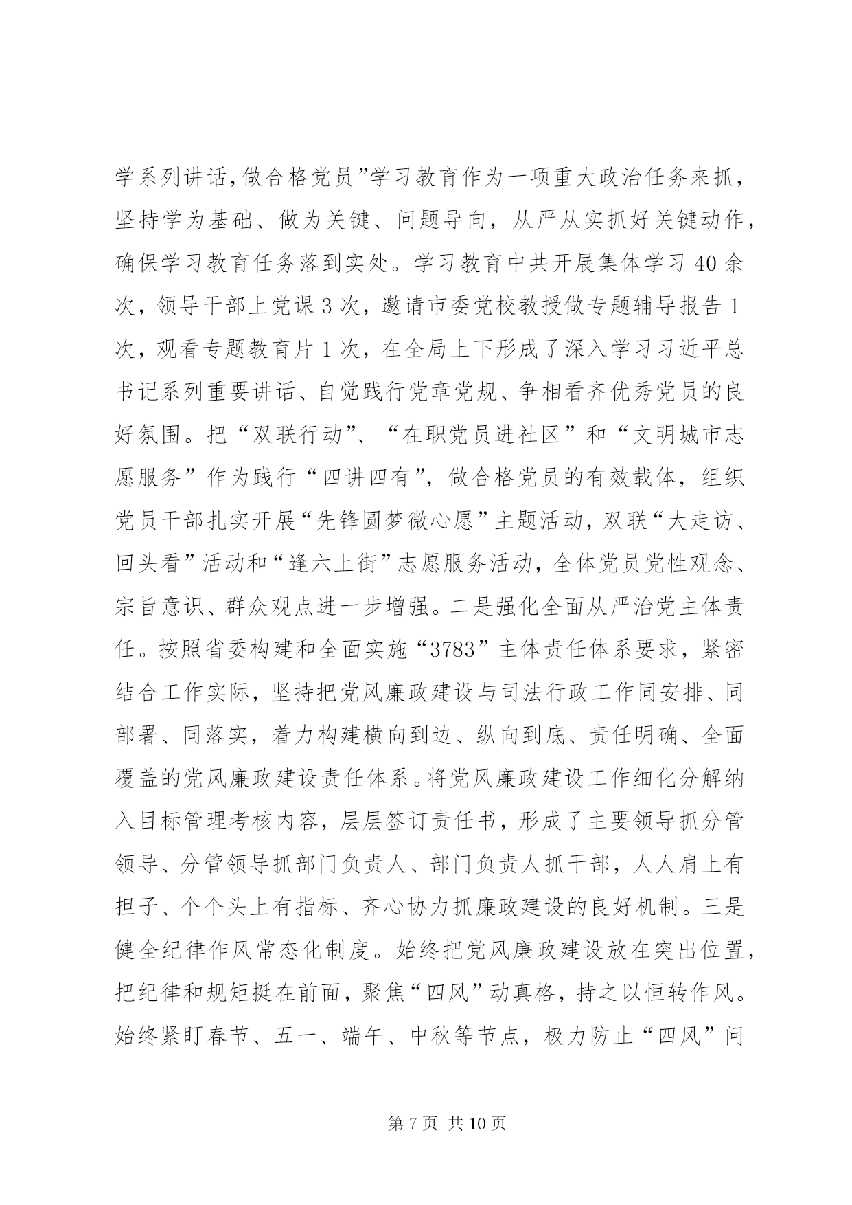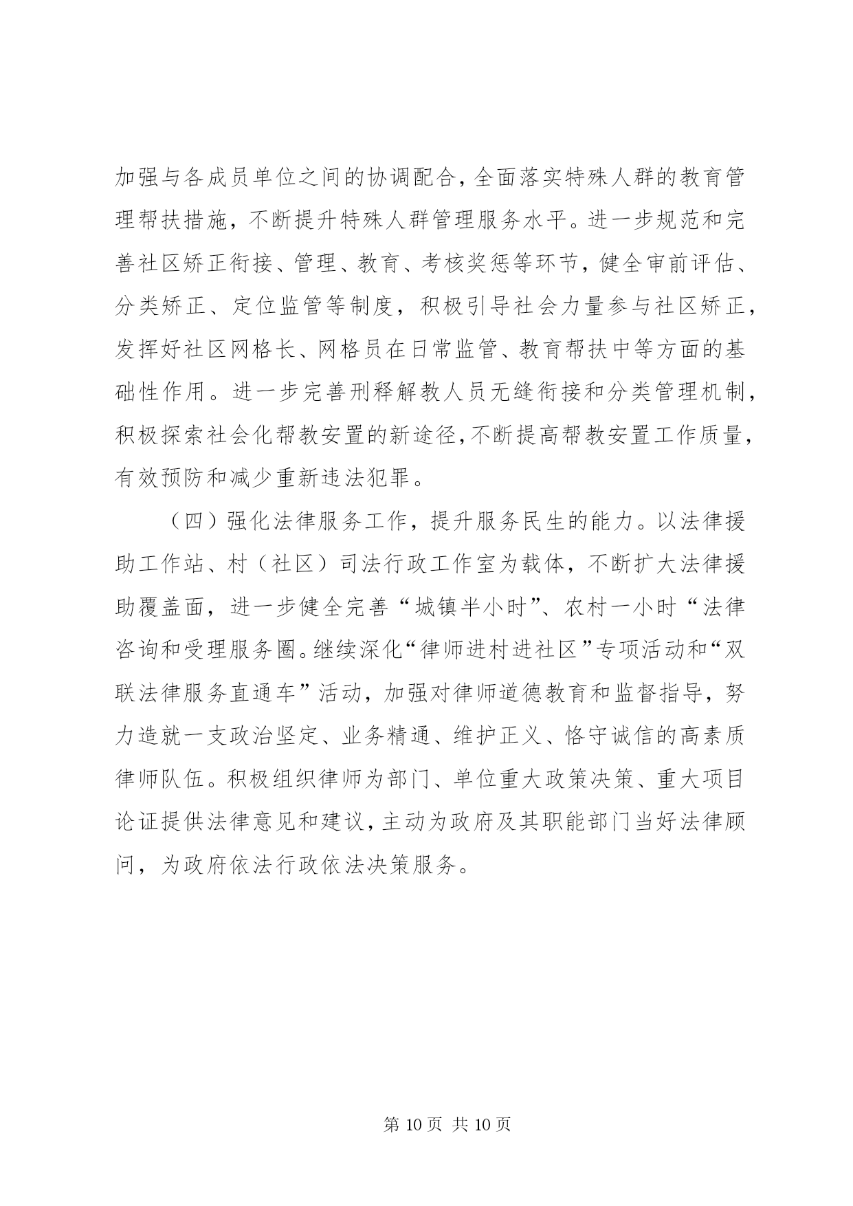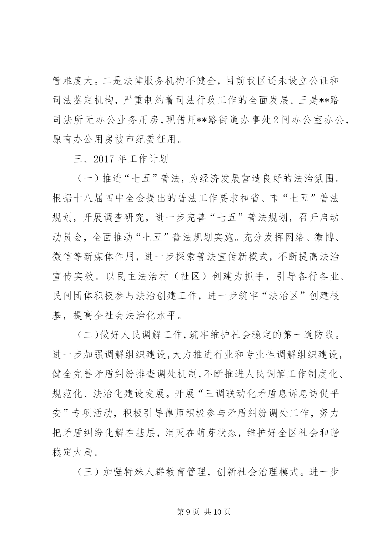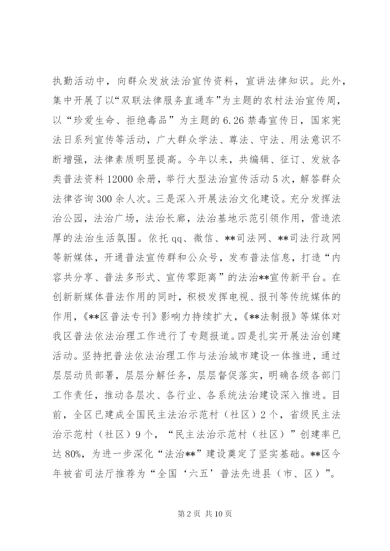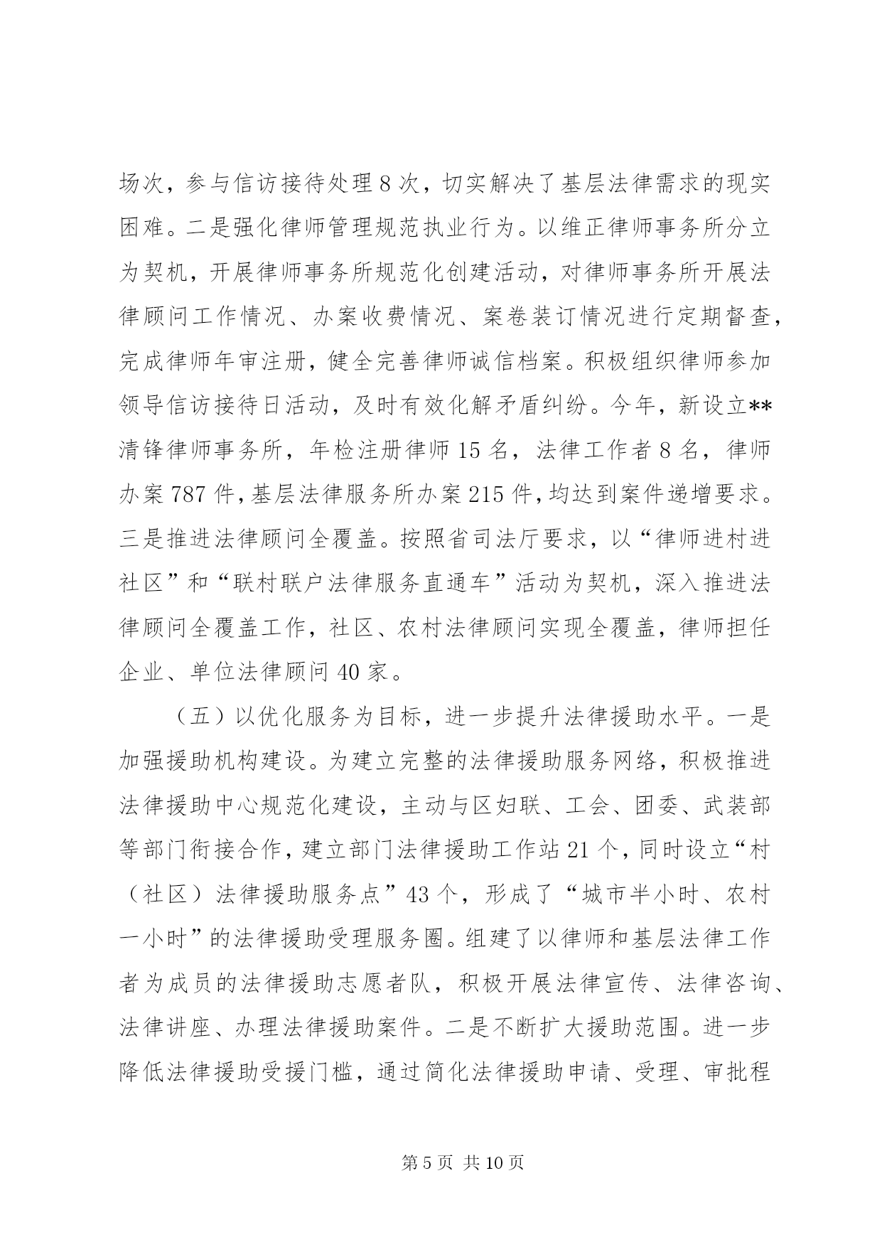 第PAGE\*Arabic\*MERGEFORMAT10页共NUMPAGES\*MERGEFORMAT10页区司法局XX年工作总结今年以来,**区司法局在区委、区政府的正确领导和市司法局的精心指导下,充分发挥法律宣传、法律保障、法律服务职能作用,切实做好服务发展、服务民生、服务稳定的各项工作,为全区经济社会发展营造了和谐稳定的社会环境、优质高效的服务环境和公平正义的法治环境。现将一年来工作进展情况总结如下:一、2016年各项工作完成情况(一)以法治**建设为目标,全面加强普法依法治理工作。一是认真做好“七五”普法规划编制工作。为确保“七五”普法开好头,起好步,认真总结“六五”普法中的经验做法,紧紧围绕国家、省、市“七五”规划要求,从机制制度、方式方法、社会发动、载体形式上进一步探索,精心编制全区“七五”普法规划,同时,全面推动落实“谁执法谁普法”普法责任制,制定普法责任清单,督促落实“七五”普法规划各项目标任务。二是认真抓好“法律八进”。开展机关干部法律知识培训和考试,组织全区领导干部参观**区人民检察院警示教育基地,促进提升领导干部依法依纪履职能力;利用青少年法治教育基地宣传教育作用,组织青少年开展模拟法庭等法治实践活动;利用乡镇物资交流会等活动,将法治宣传教育融入活动之中;各社区充分利用3.8、5.12、民族团结进步月等节点,开展多种形式的法治宣传教育。在**文化旅游节、**路立交桥征地拆迁、金阿铁路征地拆迁维稳执勤活动中,向群众发放法治宣传资料,宣讲法律知识。此外,集中开展了以“双联法律服务直通车”为主题的农村法治宣传周,以“珍爱生命、拒绝毒品”为主题的6.26禁毒宣传日,国家宪法日系列宣传等活动,广大群众学法、尊法、守法、用法意识不断增强,法律素质明显提高。今年以来,共编辑、征订、发放各类普法资料12000余册,举行大型法治宣传活动5次,解答群众法律咨询300余人次。三是深入开展法治文化建设。充分发挥法治公园,法治广场,法治长廊,法治基地示范引领作用,营造浓厚的法治生活氛围。依托qq、微信、**司法网、**司法行政网等新媒体,开通普法宣传群和公众号,发布普法信息,打造“内容共分享、普法多形式、宣传零距离”的法治**宣传新平台。在创新新媒体普法作用的同时,积极发挥电视、报刊等传统媒体的作用,《**区普法专刊》影响力持续扩大,《**法制报》等媒体对我区普法依法治理工作进行了专题报道。四是扎实开展法治创建活动。坚持把普法依法治理工作与法治城市建设一体推进,通过层层动员部署,层层分解任务,层层督促落实,明确各级各部门工作责任,推动各层次、各行业、各系统法治建设深入推进。目前,全区已建成全国民主法治示范村(社区)2个,省级民主法治示范村(社区)9个,“民主法治示范村(社区)”创建率已达80%,为进一步深化“法治**”建设奠定了坚实基础。**区今年被省司法厅推荐为“全国‘六五’普法先进县(市、区)”。(二)以队伍建设建设为抓手,全面加强人民调解工作。一是不断提升人民调解工作水平。把加强人民调解员业务培训作为加强队伍建设的突破口和着力点,进一步加强对人民调解员的业务指导和法律业务培训,编印《人民调解工作指南及案例选编》,举办各类业务培训班16期,拓宽了调解工作思路,提高了调解实用技能。加强人民调解组织建设,今年新建行业性、专业性人民调解组织5个。二是大力开展矛盾纠纷排查调处专项活动。组织开展“重大社会矛盾纠纷排查化解”活动,同时在“两节”、“两会”等重大节假日期间,集中组织开展“大宣传、大排查、大调解”活动,今年,共调解各类矛盾纠纷1992件,其中:“三调联动”案件115件,“司法确认”案件2件,庭室化调解45件,调处率、成功率和协议履行率均达到100%。(三)以网格化管理为载体,不断创新特殊人群管理工作。制定下发全区特殊人群服务管理工作要点和年度考核办法,进一步健全完善了联席会议、重大事项讨论、社情舆情通报、信息报送汇总、文件传递交换等工作制度,切实加强了对各成员单位的督促指导,不断增强特群工作合力,提升特群工作水平。一是将社区矫正纳入网格化管理。充分发挥社区矫正监管中心的指挥协调作用,将社区矫正服刑人员纳入城市社区网格化管理,形成以司法所为核心、社区为辅助、网格员、网格长为补充的“三位一体”矫正工作新格局,使网格员成为特殊人群管理的重要力量。二是认真开展执法规范化巩固年活动。紧紧围绕“两个坚决防止目标”,认真开展社区矫正“执法规范化巩固年”活动,严格落实审前评估、分类矫正、定位监管、公益劳动、学习教育等制度,不断推进社区矫正执法规范化、工作标准化、管理信息化。今年以来,接收社区矫正人员93人,解除矫正91人,完成调查评估案件97件。截至目前,全区累计接收社区服刑人员595人,累计解除矫正人员445人,目