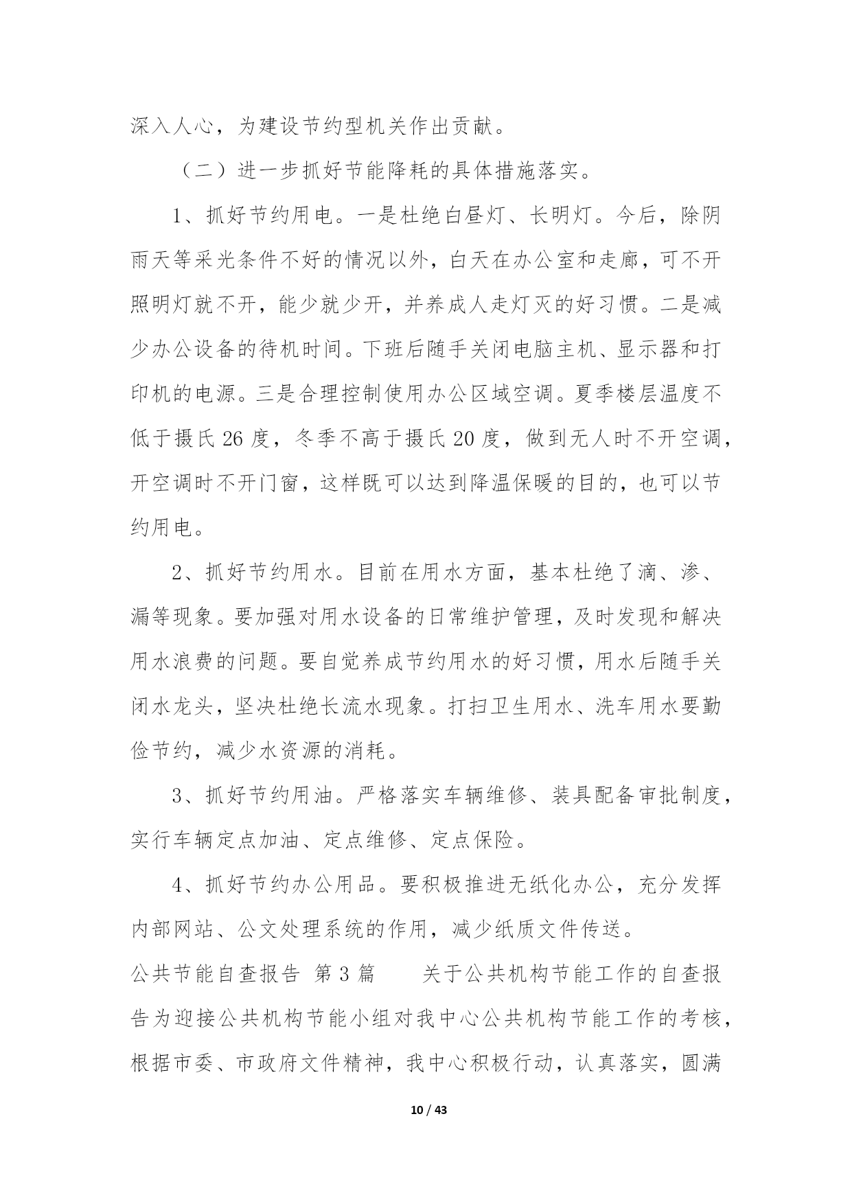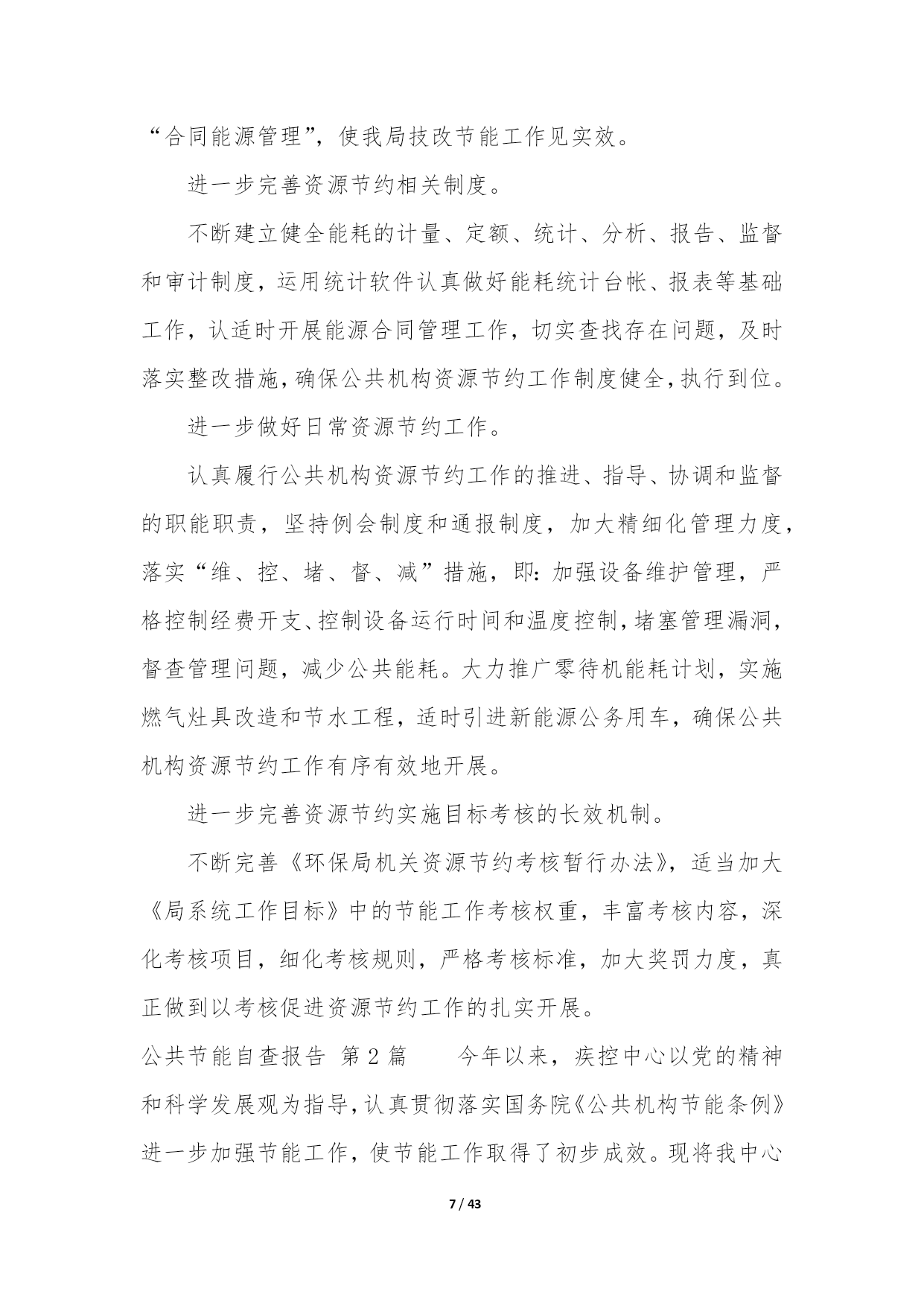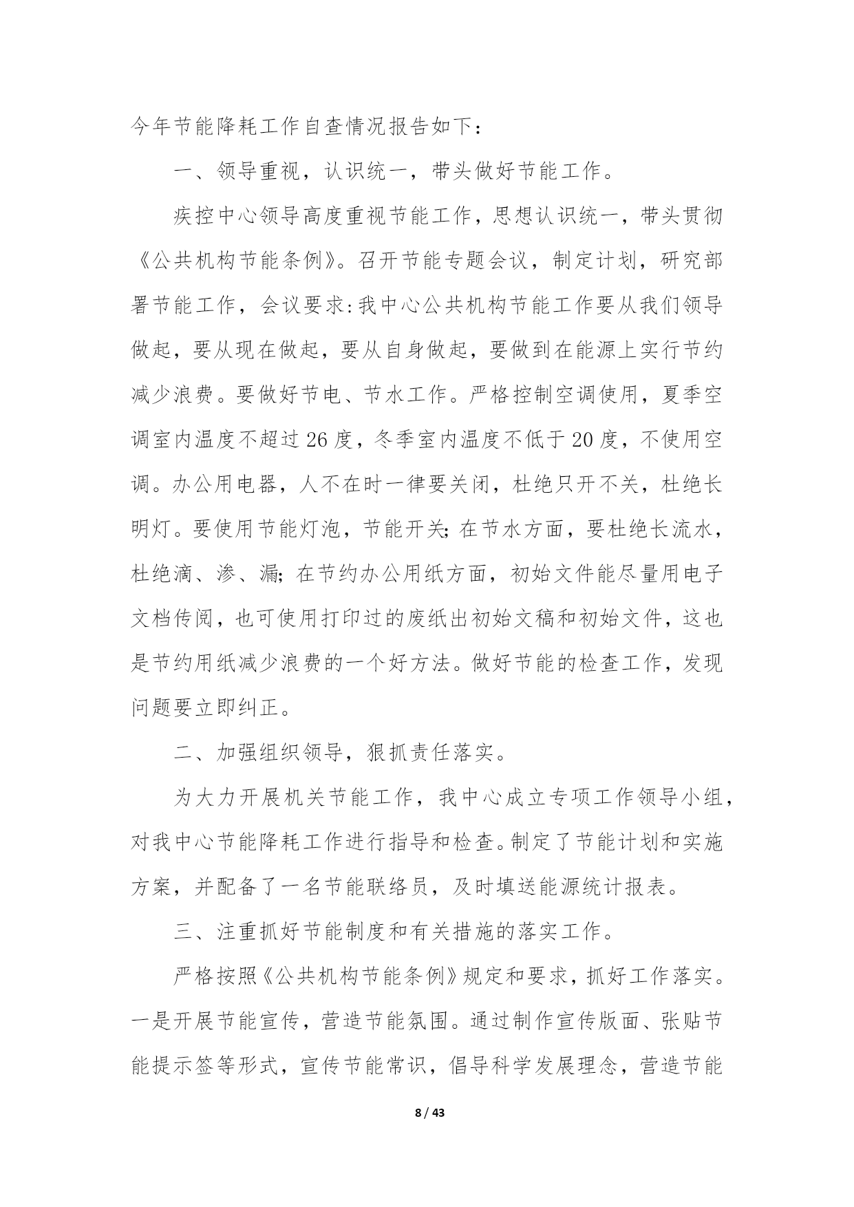 PAGE43/NUMPAGES43公共节能自查报告(必备12篇)公共节能自查报告第1篇20xx年,是实施“十二五”规划的关键之年。一年来,我局认真贯彻落实《公共机构节能条例》和《xx市公共机构节能办法》文件精神,按照《xx市市级机关20xx年公共机构节能工作目标考核办法》。通知要求,紧紧围绕资源节约工作重点,周密部署、精心组织、扎实推进,圆满地完成了资源节约工作既定目标任务,现将20xx年公共机构节能工作情况汇报如下:一、20xx年工作回顾高度重视、周密部署,资源节约机制不断完善我局资源节约工作,在总结去年工作的基础上,结合资源节约工作目标和重点,强化组织领导,完善工作机制,积极推进资源节约工作。下发了《xx市环境保护局办公室关于印发20xx年公共机构节能工作计划的通知》和《xx市环境保护局办公室关于印发xx市环境保护局20xx年节能工作实施方案的通知》等文件,继续把资源节约工作纳入局系统目标中一并实施考核。局党组分别在年初、年中和年末召开会议3次,局领导先后4次在局务会上,亲自研究、部署、推进、考核、验收节能工作,使节能目标责任在组织和领导上得到了落实。我们认为,抓资源节约工作,必须坚持常抓不懈、持之以恒的原则,年初有部署、季度有推进、年终有考核。首先将各处室、各部门负责人均纳入资源节约工作领导小组之中,形成主要领导亲自抓,分管领导具体抓,职能部门认真抓的格局;二是将资源节约工作纳入各处室年终目标考核范围,各处室负责人责任在肩,赏罚分明,只有平时抓好落实,才能在考核时取得好的成绩;三是把资源节约工作与环保系统工作同部署、同落实、同考核,形成了良性运行机制,在处理好资源节约工作与环保系统工作的关系上,真正做到“两不误、两促进”;四是发挥领导班子在资源节约工作中的引领和示范作用,通过带头厉行节约、控制开支、乘组合车和集体乘座大车参加市里组织的公务活动等实际行动,增强资源节约工作的感召力和影响力。强化意识、开展活动,资源节约氛围不断浓厚资源节约是一项基础性、经常性、群众性的工作,仅靠组织和领导干部关注是有限的,广泛开展资源节约宣传教育工作,增强广大职工的主人翁意识,促使人们把公共节约像自家过日子一样,精打细算,才能取得良好的效果。一是强化意识,营造氛围。一年来,我们紧紧抓住《公共机构节能条例》的贯彻落实,专题进行了节约型机关建设的动员教育,要求大家把单位当家来爱、当家来建、当家来管,从一滴水、一度电、一张纸、一粒米抓起,积沙成塔,聚少成多。先后4次在公共区域和局办公楼悬挂宣传横幅4条,张贴宣传画20余张,布置展板10余幅,努力增强大家的节约意识。借助局域网开设专栏、大厅显示屏、信息触摸屏等传媒方式进行宣传,营造了资源节约的浓厚氛围;二是采取措施,节能降耗。我们注重学习先进的节能经验,积极引进先进成熟的节能成果,全面推广了高效照明产品;加强对网络机房、食堂、实验室等部位的用能情况实施重点监控;不断开展能源诊断,完成了能源管理系统的安装;对办公楼洗手间不合理水龙头进行改造更换,和控制阀门,达到了节水效果。三是开展活动,正向引导。我们积极响应市机关事务管理局的号召,在局系统精心组织了“能源紧缺体验日”活动,厉行“四个停开”,派专人督促检查,体验能源短缺带来的不便,引导广大职工增强节能意识。积极配合机关事务局组织开展“节能巡展”等工作。一年来,按时、准确向市级机关事务管理局报送资源节约相关信息稿件3篇,月报表、季报表和半年、年度总结等共计18份。四是监督检查,警钟长鸣。我们在采取一系列正向引导措施的同时,还修改完善了一整套检查、检修、运行管理等制度,加大了公示、曝光、通报、处罚和考核力度,每月对机关节能情况在上报机关事务管理局的同时进行公示,对浪费现象在局域网上和大厅显示屏上进行曝光,对物业公司巡查不到位造成浪费现象进行了3次处罚,有效的杜绝了浪费现象发生。五是参加培训,交流经验。“十二五”期间,节能降耗任务更加繁重,相关指标,也是考核的重要内容,机关如何推进工作,在群众中起到引领示范作用更显得重要。今年以来,在机关事务管理的强力推动下,外出调研节能工作,参加“节能知识培训”和公共机构节能经验交流。对废旧办公用品进行了清理,为回收处理做好了前期准备工作。六是资源节约,环境友好。“十二五”期间,党中央国务院高度重视“资源节约型、环境友好型”社会建设,节能减排和优美环境任务更加繁重,相关指标,也是我市创建全国环保模范城市和创建森林城市的重要考核内容,机关如何为社会、为企业在节能减排和优美环境建设工作中起到引领示范作用更显得重要。宣传推动“创模”、“创森”进机关活动深入人心。目前“创森”工作虽然通过国家验收,但是加大森林覆盖率,深得机关人员和广大市民的推崇;“创模”工作已经接受国家专家组技术评估,12月中旬,国家验收考核组将