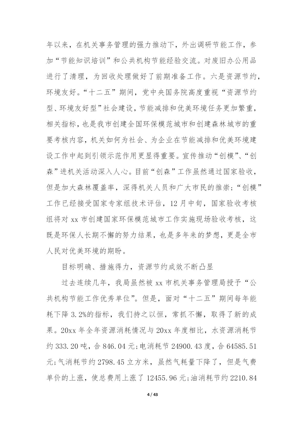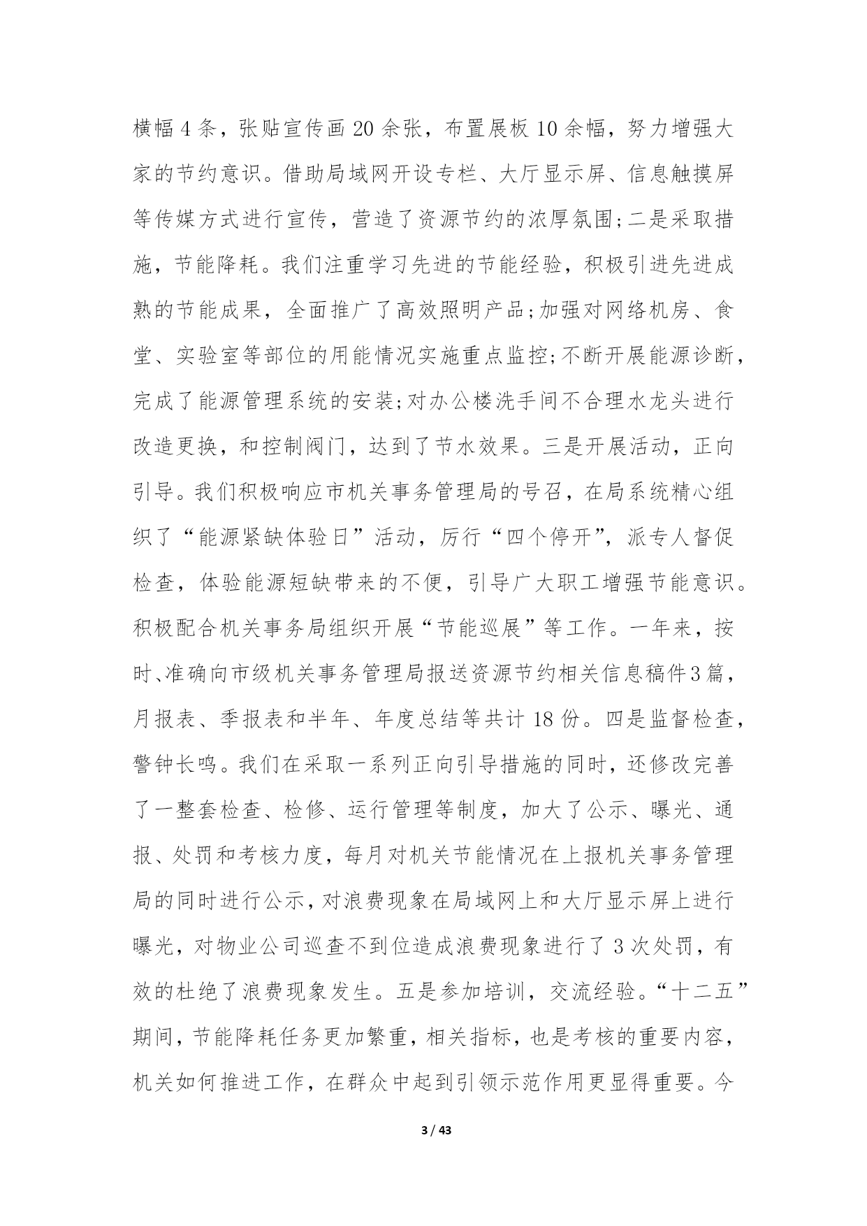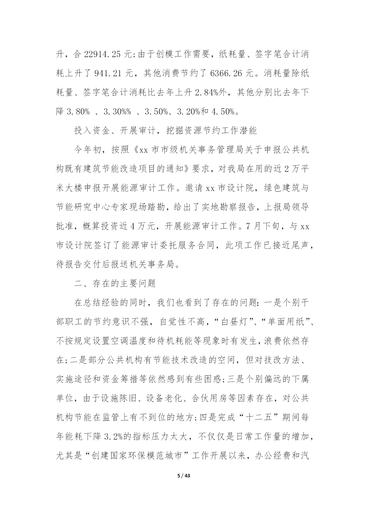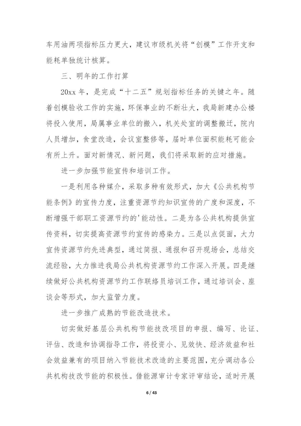 PAGE43/NUMPAGES43公共节能自查报告(必备12篇)公共节能自查报告第1篇20xx年,是实施“十二五”规划的关键之年。一年来,我局认真贯彻落实《公共机构节能条例》和《xx市公共机构节能办法》文件精神,按照《xx市市级机关20xx年公共机构节能工作目标考核办法》。通知要求,紧紧围绕资源节约工作重点,周密部署、精心组织、扎实推进,圆满地完成了资源节约工作既定目标任务,现将20xx年公共机构节能工作情况汇报如下:一、20xx年工作回顾高度重视、周密部署,资源节约机制不断完善我局资源节约工作,在总结去年工作的基础上,结合资源节约工作目标和重点,强化组织领导,完善工作机制,积极推进资源节约工作。下发了《xx市环境保护局办公室关于印发20xx年公共机构节能工作计划的通知》和《xx市环境保护局办公室关于印发xx市环境保护局20xx年节能工作实施方案的通知》等文件,继续把资源节约工作纳入局系统目标中一并实施考核。局党组分别在年初、年中和年末召开会议3次,局领导先后4次在局务会上,亲自研究、部署、推进、考核、验收节能工作,使节能目标责任在组织和领导上得到了落实。我们认为,抓资源节约工作,必须坚持常抓不懈、持之以恒的原则,年初有部署、季度有推进、年终有考核。首先将各处室、各部门负责人均纳入资源节约工作领导小组之中,形成主要领导亲自抓,分管领导具体抓,职能部门认真抓的格局;二是将资源节约工作纳入各处室年终目标考核范围,各处室负责人责任在肩,赏罚分明,只有平时抓好落实,才能在考核时取得好的成绩;三是把资源节约工作与环保系统工作同部署、同落实、同考核,形成了良性运行机制,在处理好资源节约工作与环保系统工作的关系上,真正做到“两不误、两促进”;四是发挥领导班子在资源节约工作中的引领和示范作用,通过带头厉行节约、控制开支、乘组合车和集体乘座大车参加市里组织的公务活动等实际行动,增强资源节约工作的感召力和影响力。强化意识、开展活动,资源节约氛围不断浓厚资源节约是一项基础性、经常性、群众性的工作,仅靠组织和领导干部关注是有限的,广泛开展资源节约宣传教育工作,增强广大职工的主人翁意识,促使人们把公共节约像自家过日子一样,精打细算,才能取得良好的效果。一是强化意识,营造氛围。一年来,我们紧紧抓住《公共机构节能条例》的贯彻落实,专题进行了节约型机关建设的动员教育,要求大家把单位当家来爱、当家来建、当家来管,从一滴水、一度电、一张纸、一粒米抓起,积沙成塔,聚少成多。先后4次在公共区域和局办公楼悬挂宣传横幅4条,张贴宣传画20余张,布置展板10余幅,努力增强大家的节约意识。借助局域网开设专栏、大厅显示屏、信息触摸屏等传媒方式进行宣传,营造了资源节约的浓厚氛围;二是采取措施,节能降耗。我们注重学习先进的节能经验,积极引进先进成熟的节能成果,全面推广了高效照明产品;加强对网络机房、食堂、实验室等部位的用能情况实施重点监控;不断开展能源诊断,完成了能源管理系统的安装;对办公楼洗手间不合理水龙头进行改造更换,和控制阀门,达到了节水效果。三是开展活动,正向引导。我们积极响应市机关事务管理局的号召,在局系统精心组织了“能源紧缺体验日”活动,厉行“四个停开”,派专人督促检查,体验能源短缺带来的不便,引导广大职工增强节能意识。积极配合机关事务局组织开展“节能巡展”等工作。一年来,按时、准确向市级机关事务管理局报送资源节约相关信息稿件3篇,月报表、季报表和半年、年度总结等共计18份。四是监督检查,警钟长鸣。我们在采取一系列正向引导措施的同时,还修改完善了一整套检查、检修、运行管理等制度,加大了公示、曝光、通报、处罚和考核力度,每月对机关节能情况在上报机关事务管理局的同时进行公示,对浪费现象在局域网上和大厅显示屏上进行曝光,对物业公司巡查不到位造成浪费现象进行了3次处罚,有效的杜绝了浪费现象发生。五是参加培训,交流经验。“十二五”期间,节能降耗任务更加繁重,相关指标,也是考核的重要内容,机关如何推进工作,在群众中起到引领示范作用更显得重要。今年以来,在机关事务管理的强力推动下,外出调研节能工作,参加“节能知识培训”和公共机构节能经验交流。对废旧办公用品进行了清理,为回收处理做好了前期准备工作。六是资源节约,环境友好。“十二五”期间,党中央国务院高度重视“资源节约型、环境友好型”社会建设,节能减排和优美环境任务更加繁重,相关指标,也是我市创建全国环保模范城市和创建森林城市的重要考核内容,机关如何为社会、为企业在节能减排和优美环境建设工作中起到引领示范作用更显得重要。宣传推动“创模”、“创森”进机关活动深入人心。目前“创森”工作虽然通过国家验收,但是加大森林覆盖率,深得机关人员和广大市民的推崇;“创模”工作已经接受国家专家组技术评估,12月中旬,国家验收考核组将
