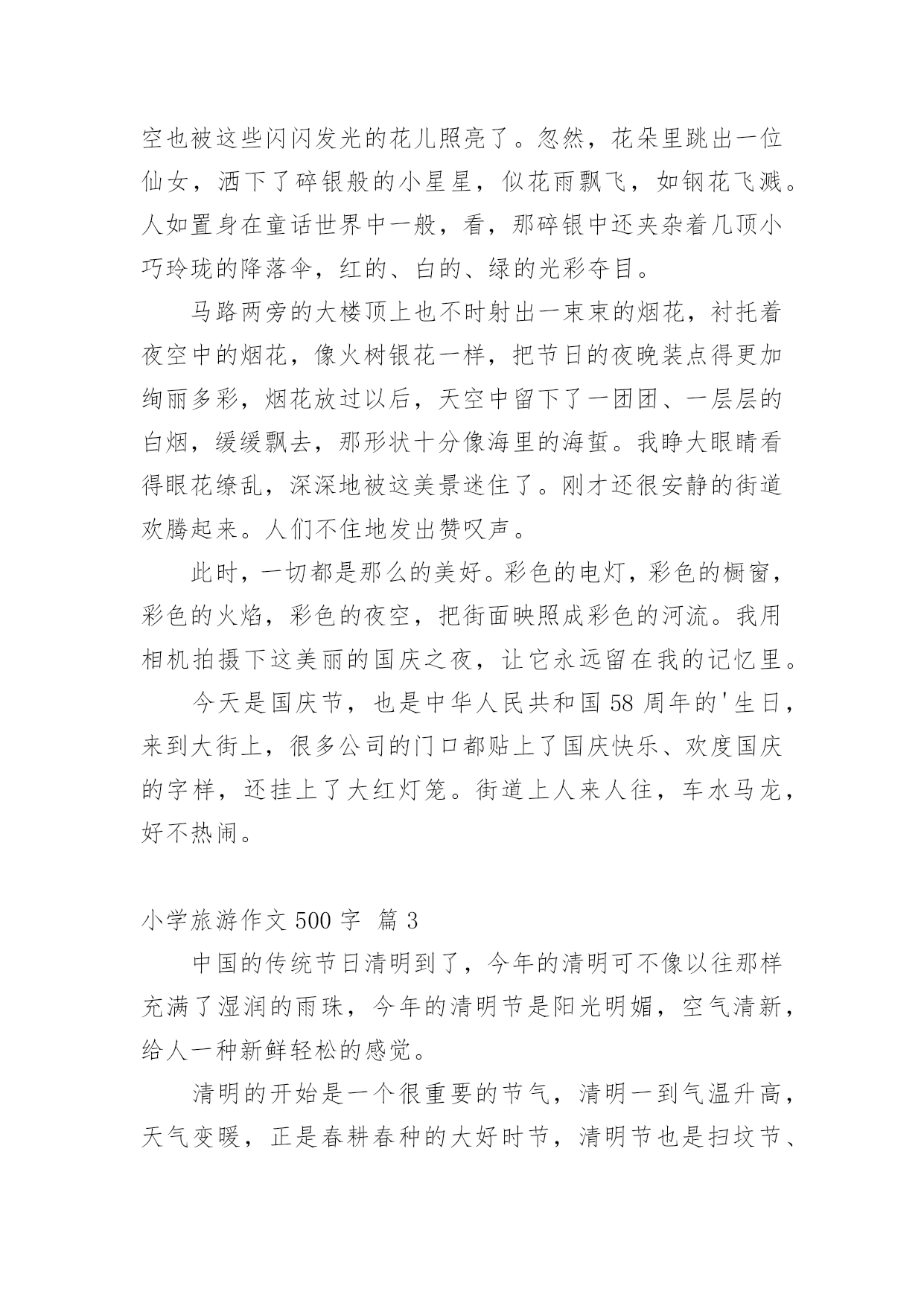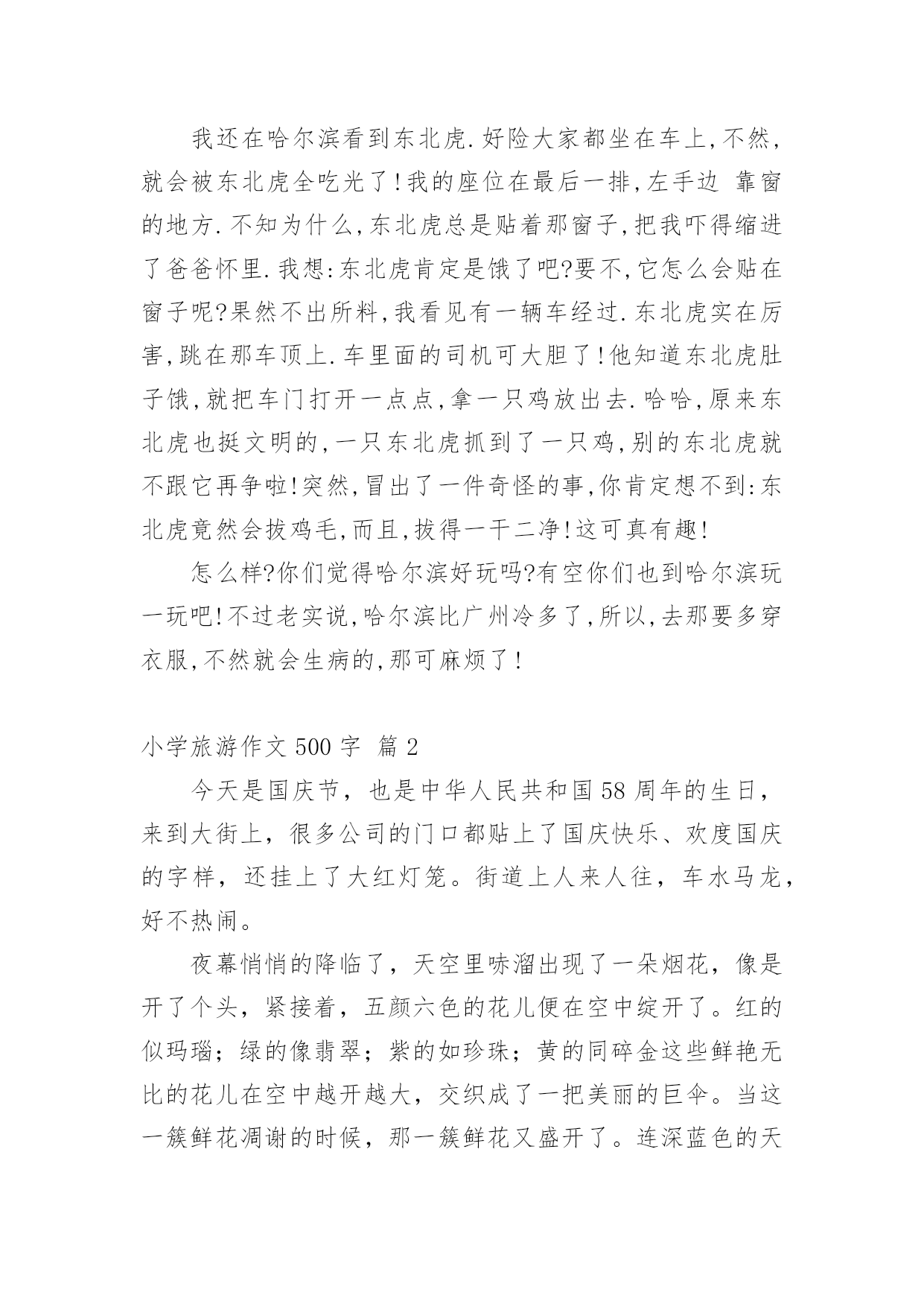 小学旅游作文500字关于小学旅游作文500字3篇在日常学习、工作和生活中,大家都经常接触到作文吧,作文是经过人的思想考虑和语言组织,通过文字来表达一个主题意义的记叙方法。一篇什么样的作文才能称之为优秀作文呢?下面是小编帮大家整理的小学旅游作文500字3篇,仅供参考,大家一起来看看吧。小学旅游作文500字篇1前几天,我们去了哈尔滨看雪景,感受一下北方的大自然.那里没有我想象的那么丰富多彩,我以为哈尔滨到处是一片白茫茫,谁知道,马路上一点雪也没有,人行道最多就这么一点点雪.不过,正常情况下是没有的,因为那些雪大部分都被清洁阿姨扫走了,真令我失望!我在哈尔滨也滑了雪,非常刺激.第一次滑还真让人有点害怕,别看那座山很高,滑下来的时候却是十分好玩的!我第一次滑雪的时候特别特别地害怕,嘴里总是唠叨着:"我怕,我怕,我怕``````"但是,没有办法,怕也要滑.我只好做准备,心紧张得怦怦跳,"好了,一,二,三,滑!"风一直往我的脸上吹,仿佛自己要飞起来似的.滑啊,滑,终于停下来了."耶!我一次也没摔跤,太好了!"我欢呼着,同时认识到:做什么事情都要先试一下,不要没做就说怕,这是不对的,我们应该勇敢面对任何事情.我还在哈尔滨看到东北虎.好险大家都坐在车上,不然,就会被东北虎全吃光了!我的座位在最后一排,左手边靠窗的地方.不知为什么,东北虎总是贴着那窗子,把我吓得缩进了爸爸怀里.我想:东北虎肯定是饿了吧?要不,它怎么会贴在窗子呢?果然不出所料,我看见有一辆车经过.东北虎实在厉害,跳在那车顶上.车里面的司机可大胆了!他知道东北虎肚子饿,就把车门打开一点点,拿一只鸡放出去.哈哈,原来东北虎也挺文明的,一只东北虎抓到了一只鸡,别的东北虎就不跟它再争啦!突然,冒出了一件奇怪的事,你肯定想不到:东北虎竟然会拔鸡毛,而且,拔得一干二净!这可真有趣!怎么样?你们觉得哈尔滨好玩吗?有空你们也到哈尔滨玩一玩吧!不过老实说,哈尔滨比广州冷多了,所以,去那要多穿衣服,不然就会生病的,那可麻烦了!小学旅游作文500字篇2今天是国庆节,也是中华人民共和国58周年的生日,来到大街上,很多公司的门口都贴上了国庆快乐、欢度国庆的字样,还挂上了大红灯笼。街道上人来人往,车水马龙,好不热闹。夜幕悄悄的降临了,天空里哧溜出现了一朵烟花,像是开了个头,紧接着,五颜六色的花儿便在空中绽开了。红的似玛瑙;绿的像翡翠;紫的如珍珠;黄的同碎金这些鲜艳无比的花儿在空中越开越大,交织成了一把美丽的巨伞。当这一簇鲜花凋谢的时候,那一簇鲜花又盛开了。连深蓝色的天空也被这些闪闪发光的花儿照亮了。忽然,花朵里跳出一位仙女,洒下了碎银般的小星星,似花雨飘飞,如钢花飞溅。人如置身在童话世界中一般,看,那碎银中还夹杂着几顶小巧玲珑的降落伞,红的、白的、绿的光彩夺目。马路两旁的大楼顶上也不时射出一束束的烟花,衬托着夜空中的烟花,像火树银花一样,把节日的夜晚装点得更加绚丽多彩,烟花放过以后,天空中留下了一团团、一层层的白烟,缓缓飘去,那形状十分像海里的海蜇。我睁大眼睛看得眼花缭乱,深深地被这美景迷住了。刚才还很安静的街道欢腾起来。人们不住地发出赞叹声。此时,一切都是那么的美好。彩色的电灯,彩色的橱窗,彩色的火焰,彩色的夜空,把街面映照成彩色的河流。我用相机拍摄下这美丽的国庆之夜,让它永远留在我的记忆里。今天是国庆节,也是中华人民共和国58周年的'生日,来到大街上,很多公司的门口都贴上了国庆快乐、欢度国庆的字样,还挂上了大红灯笼。街道上人来人往,车水马龙,好不热闹。小学旅游作文500字篇3中国的传统节日清明到了,今年的清明可不像以往那样充满了湿润的雨珠,今年的清明节是阳光明媚,空气清新,给人一种新鲜轻松的感觉。清明的开始是一个很重要的节气,清明一到气温升高,天气变暖,正是春耕春种的大好时节,清明节也是扫坟节、鬼节、也是我们缅怀先辈的节日。早上我和爸爸妈妈,来到商店买了许多水果和香烛纸钱,买完后爸爸开车拉着我和妈妈来到奶奶家,这时姑姑们也拿了许多水果和食品来了,我问你们也拿来这么多好吃的干什么?奶奶对我说:这些都是贡品,给太爷吃的,纸钱是给太爷用的,表示我们后辈的孝心。一会妈妈和姑姑还有我拿着那些贡品上了爸爸的车,爸爸开车来到一片树林中停下车,我们下了车,我看到林中有很多小土包,我就问妈妈这些干什么用的,这些都是房子,太爷就在那里住着呢,我又问他们为什么住在那啊|为什么不住在房子里,妈妈说:因为他们去世了,必须要住在坟里面。这时姑姑和妈妈把准备好的贡品,摆放在了太爷坟前,我们就分头忙开了,有的除草、有的填土,不一会就把杂草丛生的坟头整理干净了,完后爸爸妈妈姑姑还有我,都跪在坟前,烧起那些纸钱磕头祭拜,表示我们的孝心。姑姑还念念有传说了些什么,我也没听懂,这时妈妈也说话了,妈妈说让太爷保佑我将来能考上名牌大学,妈妈说