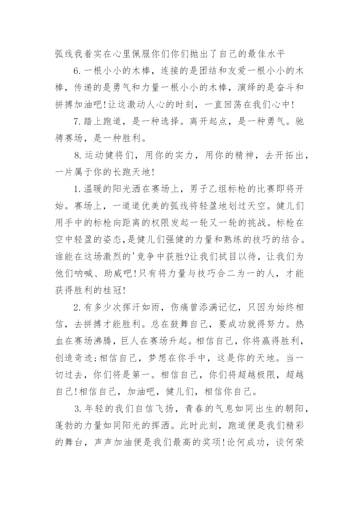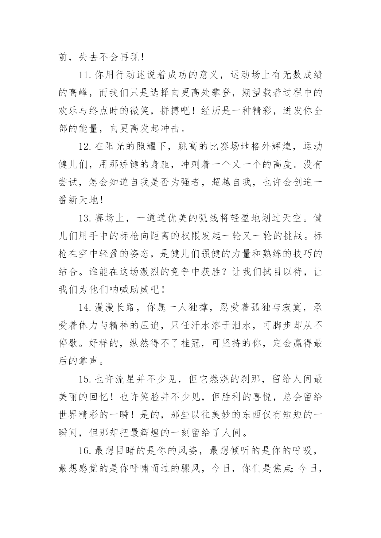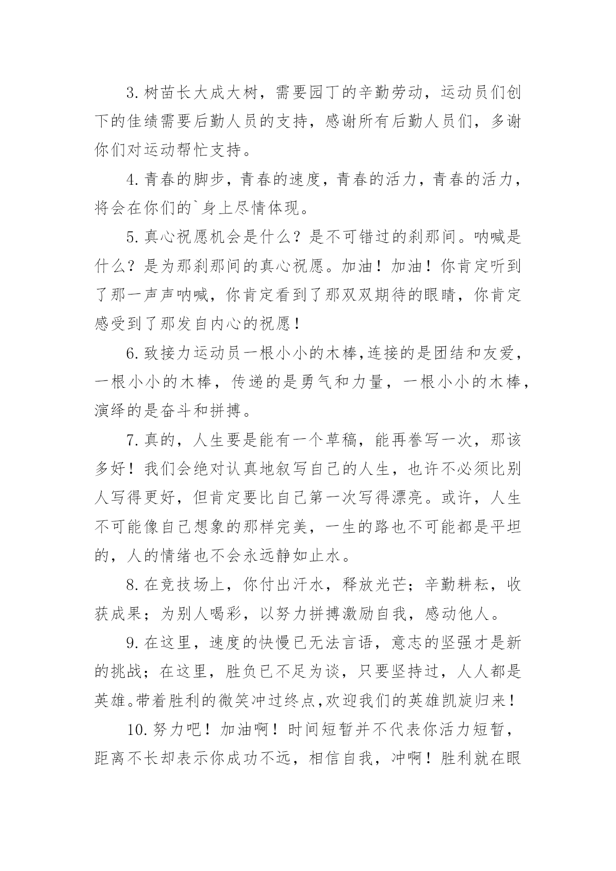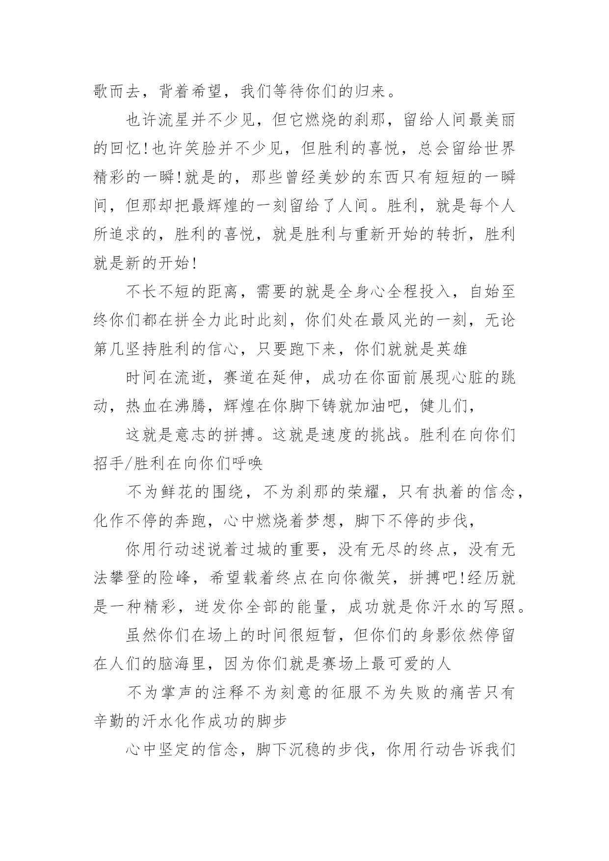 优秀运动会加油稿在社会一步步向前发展的今天,我们都跟加油稿有着直接或间接的联系,借助加油稿往往可以提升对方的气势。为了让您在写加油稿时更加简单方便,以下是小编为大家整理的优秀运动会加油稿,欢迎阅读与收藏。优秀运动会加油稿1你们挥舞着充满力量的双臂看着实心球化成美丽的弧线我在心里佩服你们你们抛出了自己的最佳水平一根小小的木棒,连接的就是团结和友爱一根小小的木棒,传递的就是勇气和力量一根小小的木棒,演绎的就是奋斗和拼搏加油吧!让这激动人心的时刻,一直回荡在我们心中!踏上跑道,就是一种选择。离开起点,就是一种勇气。驰骋赛场,就是一种胜利。运动健将们,用你的实力,用你的精神,去开拓出,一片属于你的长跑天地!温暖的阳光洒在赛场上,男子乙组标枪的比赛即将开始。赛场上,一道道优美的弧线将轻盈地划过天空。健儿们用手中的标枪向距离的权限发起一轮又一轮的挑战。标枪在空中轻盈的姿态,就是健儿们强健的力量和熟练的技巧的结合。谁能在这场激烈的竞争中获胜?让我们拭目以待,让我们为他们呐喊、助威吧!只有将力量与技巧合二为一的人,才能获得胜利的桂冠!有多少次挥汗如雨,伤痛曾添满记忆,只因为始终相信,去拼搏才能胜利。总在鼓舞自己,要成功就得努力。热血在赛场沸腾,巨人在赛场升起。相信自己,你将赢得胜利,创造奇迹;相信自己,梦想在你手中,这就是你的天地。当一切过去,你们将就是第一。相信自己,你们将超越极限,超越自己!相信自己,加油吧,健儿们,相信你自己。年轻的我们自信飞扬,青春的气息如同出生的朝阳,蓬勃的力量如同阳光的挥洒。此时此刻,跑道便就是我们精彩的舞台,声声加油便就是我们最高的奖项!论何成功,谈何荣辱,心中的信念只有一个:拼搏!8萧瑟的秋风,挡不住你们破竹的锐气,广阔的绿茵场,就是为你们搭建的舞台。张扬吧,年轻的心,我们将为你永远喝彩!泰戈尔在诗中说,天空没有翅膀的影子,但我已飞过;艾青对朋友说,也许有人到达不了彼岸,但我们共同拥有大海。也许你们没有显赫的成绩,但运动场上留下了你们的足迹。也许你们没有奖品,但我们心中留下了你们拼搏的身影。所有的努力都就是为了迎接这一刹那,所有的.拼搏都就是为了这一声令下。就像花儿准备了春、秋、冬,就就是为了红透整个盛夏。就像雪花经历了春、夏、秋就就是为了洁白整个严冬。蹲下,昂首,出发……轻轻的一抬脚,便牵动了全场的目光潇洒的迫挥挥手,便满足了那一份无言的等待。迎着朝阳,你们踏歌而去,背着希望,我们等待你们的归来。也许流星并不少见,但它燃烧的刹那,留给人间最美丽的回忆!也许笑脸并不少见,但胜利的喜悦,总会留给世界精彩的一瞬!就是的,那些曾经美妙的东西只有短短的一瞬间,但那却把最辉煌的一刻留给了人间。胜利,就是每个人所追求的,胜利的喜悦,就是胜利与重新开始的转折,胜利就是新的开始!不长不短的距离,需要的就是全身心全程投入,自始至终你们都在拼全力此时此刻,你们处在最风光的一刻,无论第几坚持胜利的信心,只要跑下来,你们就就是英雄时间在流逝,赛道在延伸,成功在你面前展现心脏的跳动,热血在沸腾,辉煌在你脚下铸就加油吧,健儿们,这就是意志的拼搏。这就是速度的挑战。胜利在向你们招手/胜利在向你们呼唤不为鲜花的围绕,不为刹那的荣耀,只有执着的信念,化作不停的奔跑,心中燃烧着梦想,脚下不停的步伐,你用行动述说着过城的重要,没有无尽的终点,没有无法攀登的险峰,希望载着终点在向你微笑,拼搏吧!经历就是一种精彩,迸发你全部的能量,成功就是你汗水的写照。虽然你们在场上的时间很短暂,但你们的身影依然停留在人们的脑海里,因为你们就是赛场上最可爱的人不为掌声的注释不为刻意的征服不为失败的痛苦只有辛勤的汗水化作成功的脚步心中坚定的信念,脚下沉稳的步伐,你用行动告诉我们一个不变之理,没有走不完的路,没有过不了的山,成功正在终点冲着你高高的招手,用你那顽强的意志去努力,去迎接终点的鲜花与掌声,相信成功一定就是属于你,坚定,执着,耐力与希望,在延伸的白色跑道中点点凝聚!力量,信念,拼搏与奋斗,在遥远的终点线上渐渐明亮!时代的强音正在你的脚下踏响。踏着春天的气息,迈着轻盈的脚步,我们迎来了心仪已久的运动会。这里就就是展示自我的舞台。我们向往高山的坚忍不拔,我们渴望大海的博大精深,还有,我们更痴迷于你们的速度激情。来吧,尽情释放你的活力。你的每一次冲刺,都叩动着我们的心弦;你的每一次跨越,都吸引着我们的视线;你的每一次起跳,都绷紧我们的神经。我们为你呐喊,我们为你自豪,我们为你疯狂。青春的脚步,青春的速度,青春的活力,青春的激情,将会在你们的身上尽情体现。迎接自我,挑战自我,战胜自我!我们相信你们一定能行,加油吧,运动员!终点就在眼前!汗水,泪水;笑声,歌声;我们尽情挥洒。开幕式上,运动场上,我们尽情展现,多少艰辛,多少困苦,我们勇敢承担。因为年轻,因为张扬,因为我
