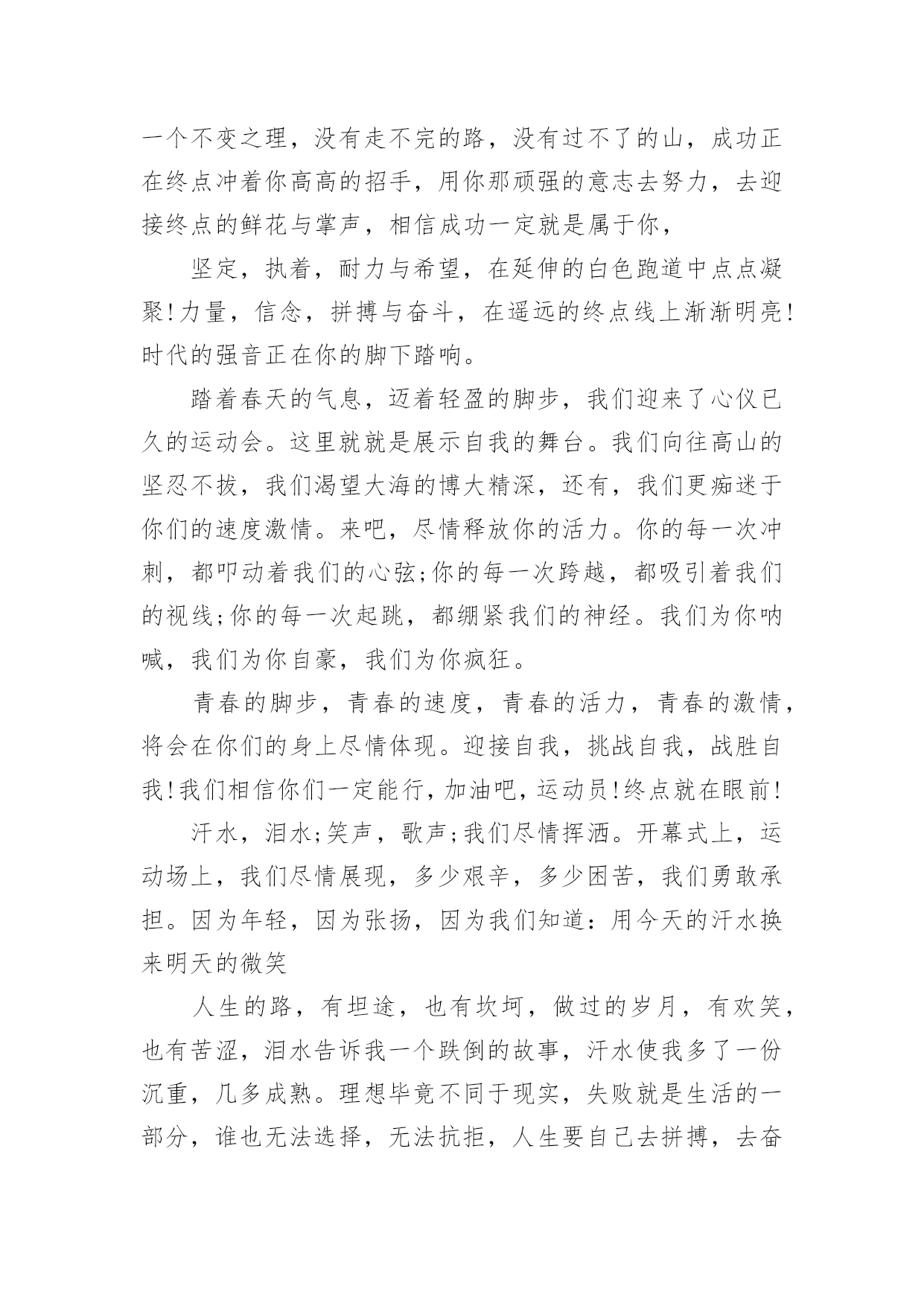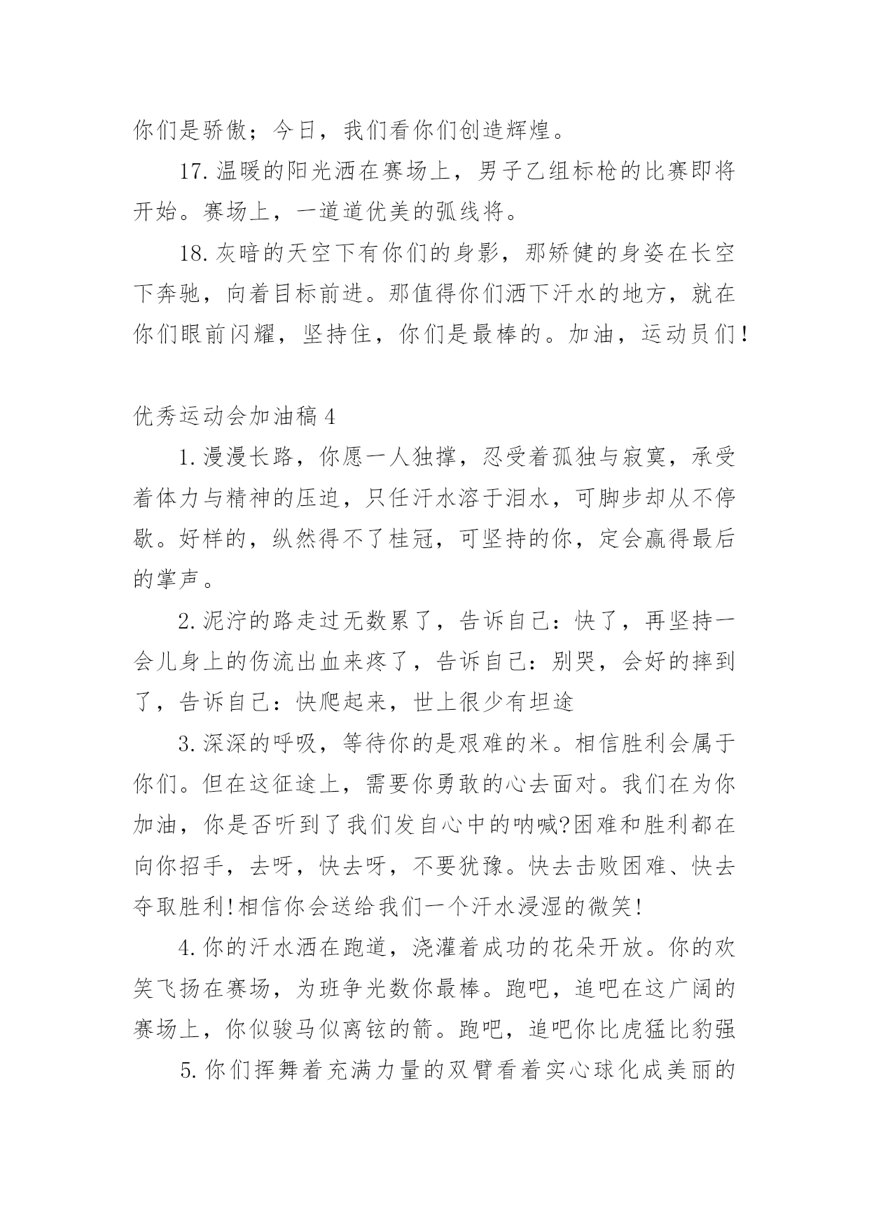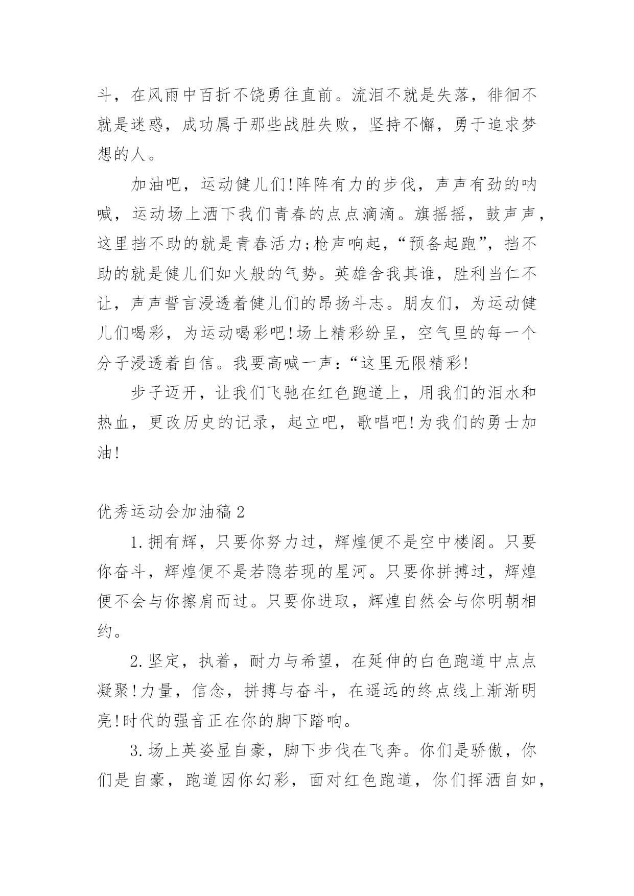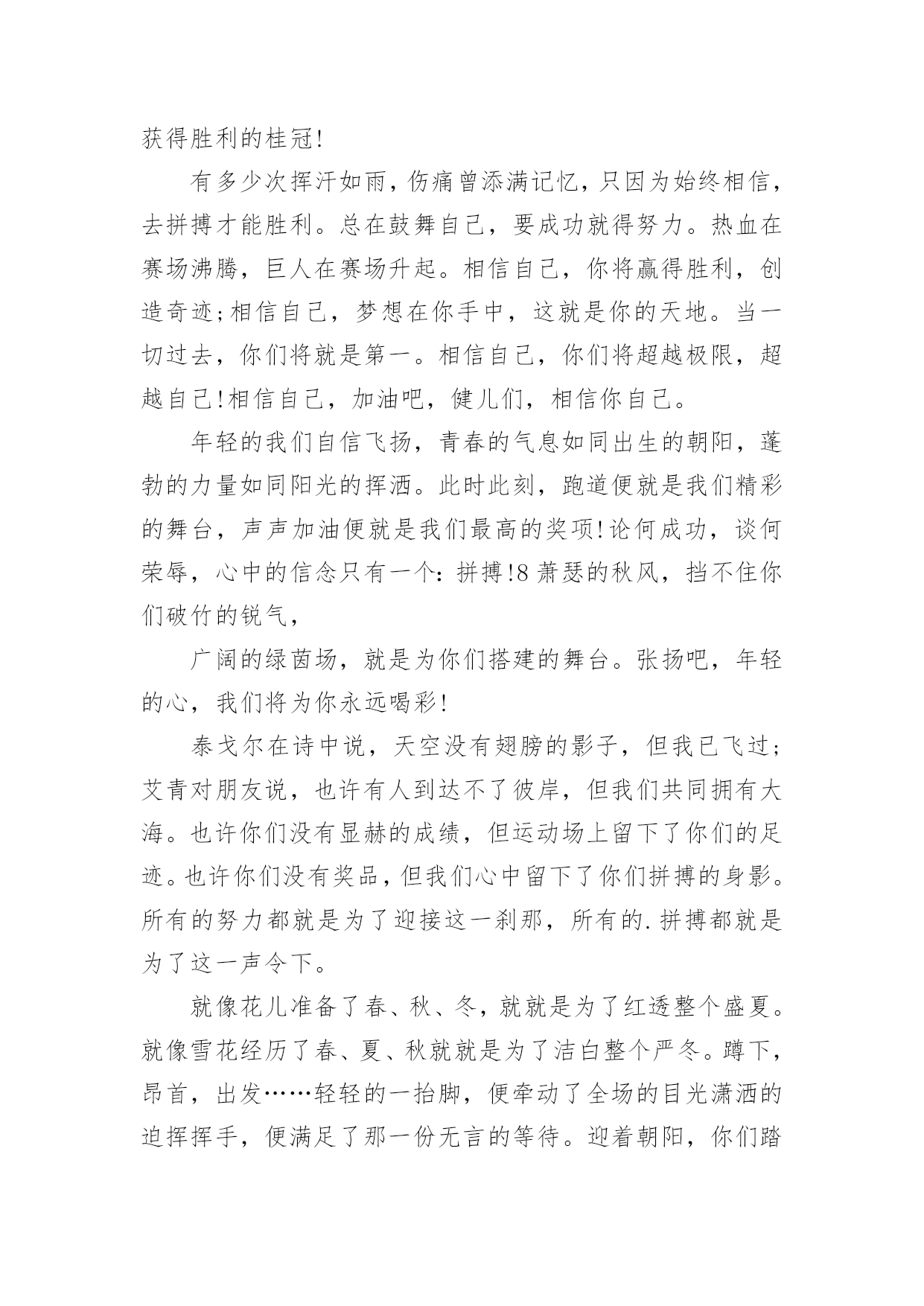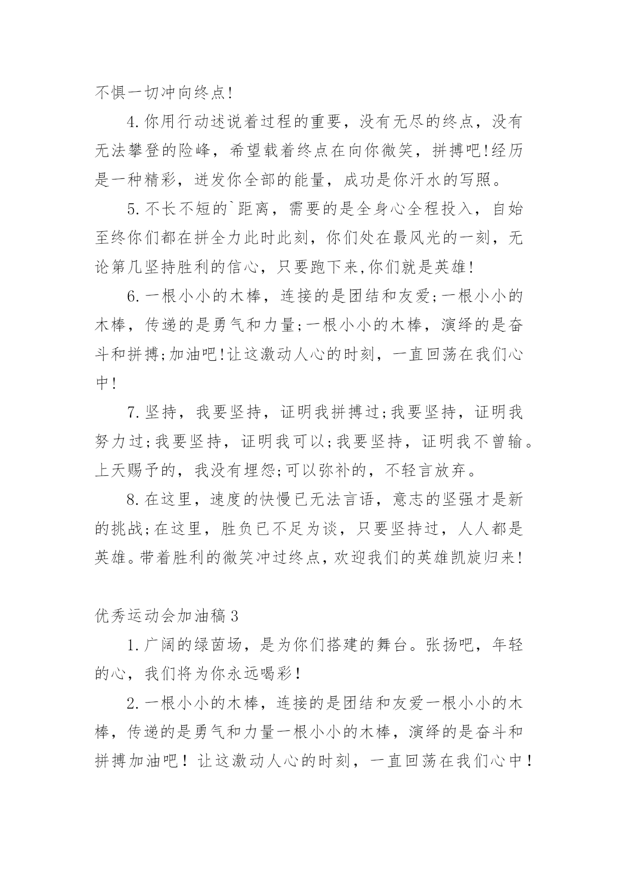 优秀运动会加油稿在社会一步步向前发展的今天,我们都跟加油稿有着直接或间接的联系,借助加油稿往往可以提升对方的气势。为了让您在写加油稿时更加简单方便,以下是小编为大家整理的优秀运动会加油稿,欢迎阅读与收藏。优秀运动会加油稿1你们挥舞着充满力量的双臂看着实心球化成美丽的弧线我在心里佩服你们你们抛出了自己的最佳水平一根小小的木棒,连接的就是团结和友爱一根小小的木棒,传递的就是勇气和力量一根小小的木棒,演绎的就是奋斗和拼搏加油吧!让这激动人心的时刻,一直回荡在我们心中!踏上跑道,就是一种选择。离开起点,就是一种勇气。驰骋赛场,就是一种胜利。运动健将们,用你的实力,用你的精神,去开拓出,一片属于你的长跑天地!温暖的阳光洒在赛场上,男子乙组标枪的比赛即将开始。赛场上,一道道优美的弧线将轻盈地划过天空。健儿们用手中的标枪向距离的权限发起一轮又一轮的挑战。标枪在空中轻盈的姿态,就是健儿们强健的力量和熟练的技巧的结合。谁能在这场激烈的竞争中获胜?让我们拭目以待,让我们为他们呐喊、助威吧!只有将力量与技巧合二为一的人,才能获得胜利的桂冠!有多少次挥汗如雨,伤痛曾添满记忆,只因为始终相信,去拼搏才能胜利。总在鼓舞自己,要成功就得努力。热血在赛场沸腾,巨人在赛场升起。相信自己,你将赢得胜利,创造奇迹;相信自己,梦想在你手中,这就是你的天地。当一切过去,你们将就是第一。相信自己,你们将超越极限,超越自己!相信自己,加油吧,健儿们,相信你自己。年轻的我们自信飞扬,青春的气息如同出生的朝阳,蓬勃的力量如同阳光的挥洒。此时此刻,跑道便就是我们精彩的舞台,声声加油便就是我们最高的奖项!论何成功,谈何荣辱,心中的信念只有一个:拼搏!8萧瑟的秋风,挡不住你们破竹的锐气,广阔的绿茵场,就是为你们搭建的舞台。张扬吧,年轻的心,我们将为你永远喝彩!泰戈尔在诗中说,天空没有翅膀的影子,但我已飞过;艾青对朋友说,也许有人到达不了彼岸,但我们共同拥有大海。也许你们没有显赫的成绩,但运动场上留下了你们的足迹。也许你们没有奖品,但我们心中留下了你们拼搏的身影。所有的努力都就是为了迎接这一刹那,所有的.拼搏都就是为了这一声令下。就像花儿准备了春、秋、冬,就就是为了红透整个盛夏。就像雪花经历了春、夏、秋就就是为了洁白整个严冬。蹲下,昂首,出发……轻轻的一抬脚,便牵动了全场的目光潇洒的迫挥挥手,便满足了那一份无言的等待。迎着朝阳,你们踏歌而去,背着希望,我们等待你们的归来。也许流星并不少见,但它燃烧的刹那,留给人间最美丽的回忆!也许笑脸并不少见,但胜利的喜悦,总会留给世界精彩的一瞬!就是的,那些曾经美妙的东西只有短短的一瞬间,但那却把最辉煌的一刻留给了人间。胜利,就是每个人所追求的,胜利的喜悦,就是胜利与重新开始的转折,胜利就是新的开始!不长不短的距离,需要的就是全身心全程投入,自始至终你们都在拼全力此时此刻,你们处在最风光的一刻,无论第几坚持胜利的信心,只要跑下来,你们就就是英雄时间在流逝,赛道在延伸,成功在你面前展现心脏的跳动,热血在沸腾,辉煌在你脚下铸就加油吧,健儿们,这就是意志的拼搏。这就是速度的挑战。胜利在向你们招手/胜利在向你们呼唤不为鲜花的围绕,不为刹那的荣耀,只有执着的信念,化作不停的奔跑,心中燃烧着梦想,脚下不停的步伐,你用行动述说着过城的重要,没有无尽的终点,没有无法攀登的险峰,希望载着终点在向你微笑,拼搏吧!经历就是一种精彩,迸发你全部的能量,成功就是你汗水的写照。虽然你们在场上的时间很短暂,但你们的身影依然停留在人们的脑海里,因为你们就是赛场上最可爱的人不为掌声的注释不为刻意的征服不为失败的痛苦只有辛勤的汗水化作成功的脚步心中坚定的信念,脚下沉稳的步伐,你用行动告诉我们一个不变之理,没有走不完的路,没有过不了的山,成功正在终点冲着你高高的招手,用你那顽强的意志去努力,去迎接终点的鲜花与掌声,相信成功一定就是属于你,坚定,执着,耐力与希望,在延伸的白色跑道中点点凝聚!力量,信念,拼搏与奋斗,在遥远的终点线上渐渐明亮!时代的强音正在你的脚下踏响。踏着春天的气息,迈着轻盈的脚步,我们迎来了心仪已久的运动会。这里就就是展示自我的舞台。我们向往高山的坚忍不拔,我们渴望大海的博大精深,还有,我们更痴迷于你们的速度激情。来吧,尽情释放你的活力。你的每一次冲刺,都叩动着我们的心弦;你的每一次跨越,都吸引着我们的视线;你的每一次起跳,都绷紧我们的神经。我们为你呐喊,我们为你自豪,我们为你疯狂。青春的脚步,青春的速度,青春的活力,青春的激情,将会在你们的身上尽情体现。迎接自我,挑战自我,战胜自我!我们相信你们一定能行,加油吧,运动员!终点就在眼前!汗水,泪水;笑声,歌声;我们尽情挥洒。开幕式上,运动场上,我们尽情展现,多少艰辛,多少困苦,我们勇敢承担。因为年轻,因为张扬,因为我