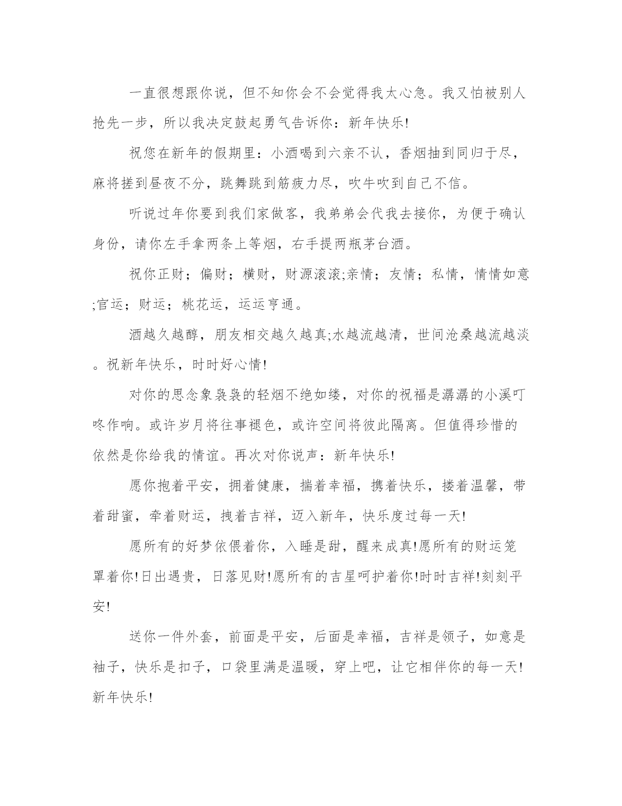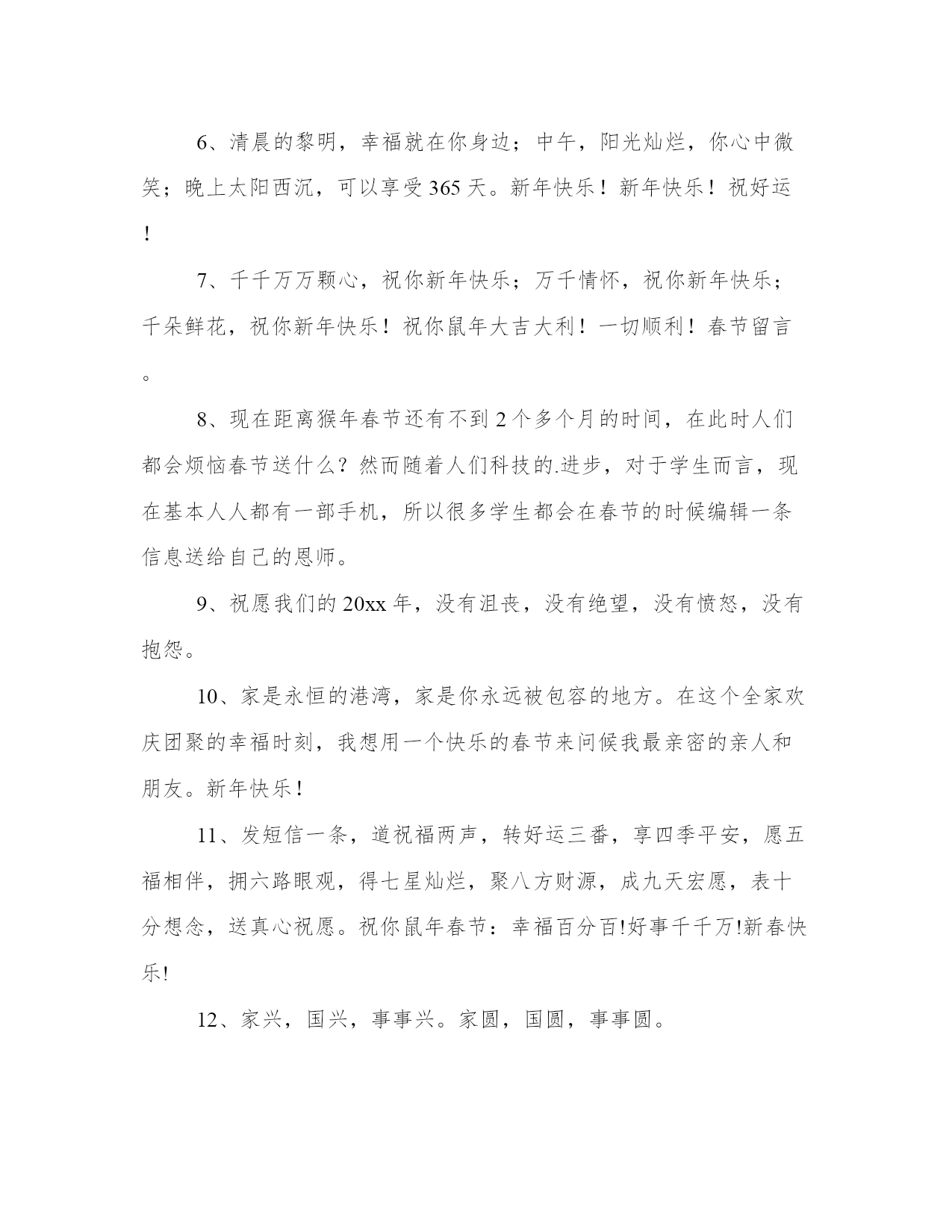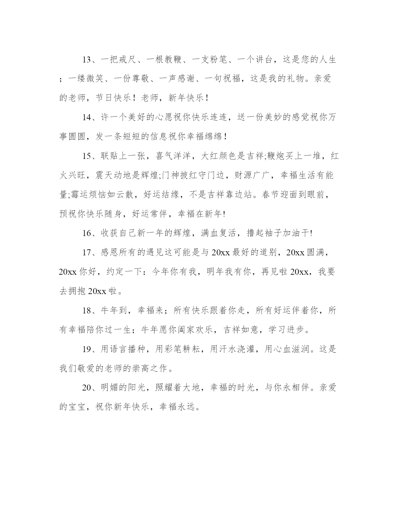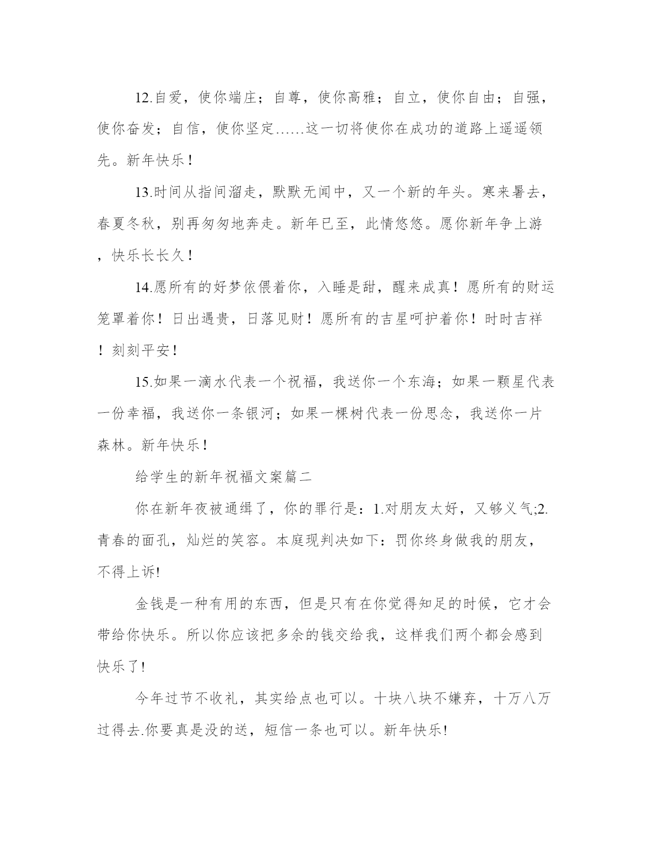 给学生的新年祝福文案(优质18篇)总结是对过去一段时间内的经验和成果进行回顾和总结的重要方式之一。完美的总结需要我们对自己的成长和发展进行深入思考和总结。下面是一些优秀的总结范文,供大家参考和学习。给学生的新年祝福文案篇一1.撕下旧年的日历,删除烦恼,把快乐刷新。送来新年的祝福,复制好运,让幸福更新。祝你新年新气象,新年交好运。春节快乐。2.新年扶贫行动开始了,如果是睡眠特困户,奖励你睡个懒觉;如果是缺钱特困户,奖励你免费提货卡;如果是郁闷特困户,奖励你辅天盖地的祝福:新年快乐!出自fanWeN.chaziDiAN.com3.跨进新年的门槛,延续着幸福的主线,红火的日子翻天,熟悉的笑脸灿烂,吉祥的色彩斑斓,欢乐的颂歌不断,久违的问候温暖,新春佳节,愿你宏图大展!4.回首过去的一年,老师们呕心沥血,播撒音乐的种子,而我们可爱的同学们挥洒智慧,放飞音乐的梦想,收获自信与快乐。愿我们在新的一年里,扬起音乐的风帆,荡起智慧的双桨,迎着春风朝阳,团结一心,起航破浪!5.郎咯里咯朗,春运开始第一天,发个短信问问安;春节长假将到来,归家团聚心期待;车票争取提前买,贵重物品随身带;祝你春运旅途愉快!6.春节来临百花香,一香送你摇钱树,二香送你贵人扶,三香送你心情好,四香送你没烦恼。五香送你钱满箱。六香送你永健康!新年快乐!7.微风轻拂,白云远逝,在我心中永恒的是友情,祝新年快乐,万事如意。请你把这最诚挚的祝福带在身边,让幸福永远伴随你。8.思念中我千万次地问鸿雁问明月问春风,愿鸿雁将我的眷恋捎给你;愿明月将我的问候带给你;愿春风将我的关切送给你!9.微笑是团火,快乐是干柴,生活是排骨,幸福是口锅。用微笑的火点燃快乐的柴,烧红幸福的锅熬出喷香的排骨汤,这就是我送给你的新年祝福。春节快乐!10.倚梅赏雪心悠闲,轻嗅春风情绵绵。马蹄奋起平安道,新春到来人欢笑。祝福声声润心田,幸福团圆在眼前。愿友xx年身康健,吉祥如意伴身边。xx年快乐!11.捧一束鲜花,抓两把阳光,到法国购四瓶浪漫,美国买六箱快乐,联合国拿八盒祝福,从心深处切下十许关怀,作为礼物给你。朋友,新年好!12.自爱,使你端庄;自尊,使你高雅;自立,使你自由;自强,使你奋发;自信,使你坚定……这一切将使你在成功的道路上遥遥领先。新年快乐!13.时间从指间溜走,默默无闻中,又一个新的年头。寒来暑去,春夏冬秋,别再匆匆地奔走。新年已至,此情悠悠。愿你新年争上游,快乐长长久!14.愿所有的好梦依偎着你,入睡是甜,醒来成真!愿所有的财运笼罩着你!日出遇贵,日落见财!愿所有的吉星呵护着你!时时吉祥!刻刻平安!15.如果一滴水代表一个祝福,我送你一个东海;如果一颗星代表一份幸福,我送你一条银河;如果一棵树代表一份思念,我送你一片森林。新年快乐!给学生的新年祝福文案篇二你在新年夜被通缉了,你的罪行是:1.对朋友太好,又够义气;2.青春的面孔,灿烂的笑容。本庭现判决如下:罚你终身做我的朋友,不得上诉!金钱是一种有用的东西,但是只有在你觉得知足的时候,它才会带给你快乐。所以你应该把多余的钱交给我,这样我们两个都会感到快乐了!今年过节不收礼,其实给点也可以。十块八块不嫌弃,十万八万过得去.你要真是没的送,短信一条也可以。新年快乐!一直很想跟你说,但不知你会不会觉得我太心急。我又怕被别人抢先一步,所以我决定鼓起勇气告诉你:新年快乐!祝您在新年的假期里:小酒喝到六亲不认,香烟抽到同归于尽,麻将搓到昼夜不分,跳舞跳到筋疲力尽,吹牛吹到自己不信。听说过年你要到我们家做客,我弟弟会代我去接你,为便于确认身份,请你左手拿两条上等烟,右手提两瓶茅台酒。祝你正财;偏财;横财,财源滚滚;亲情;友情;私情,情情如意;官运;财运;桃花运,运运亨通。酒越久越醇,朋友相交越久越真;水越流越清,世间沧桑越流越淡。祝新年快乐,时时好心情!对你的思念象袅袅的轻烟不绝如缕,对你的祝福是潺潺的小溪叮咚作响。或许岁月将往事褪色,或许空间将彼此隔离。但值得珍惜的依然是你给我的情谊。再次对你说声:新年快乐!愿你抱着平安,拥着健康,揣着幸福,携着快乐,搂着温馨,带着甜蜜,牵着财运,拽着吉祥,迈入新年,快乐度过每一天!愿所有的好梦依偎着你,入睡是甜,醒来成真!愿所有的财运笼罩着你!日出遇贵,日落见财!愿所有的吉星呵护着你!时时吉祥!刻刻平安!送你一件外套,前面是平安,后面是幸福,吉祥是领子,如意是袖子,快乐是扣子,口袋里满是温暖,穿上吧,让它相伴你的每一天!新年快乐!零时的钟声响彻天涯,新年的列车准时出发.它驮去难忘的岁月,迎来了又一轮火红的年华.祝你新年快乐,鹏程万里!层层往事在岁月沉淀,留下无尽回忆,亲情让我感到幸福无限。谢谢爸妈给我生命,给我快乐,给了我又一个崭新的一年。爱人,你