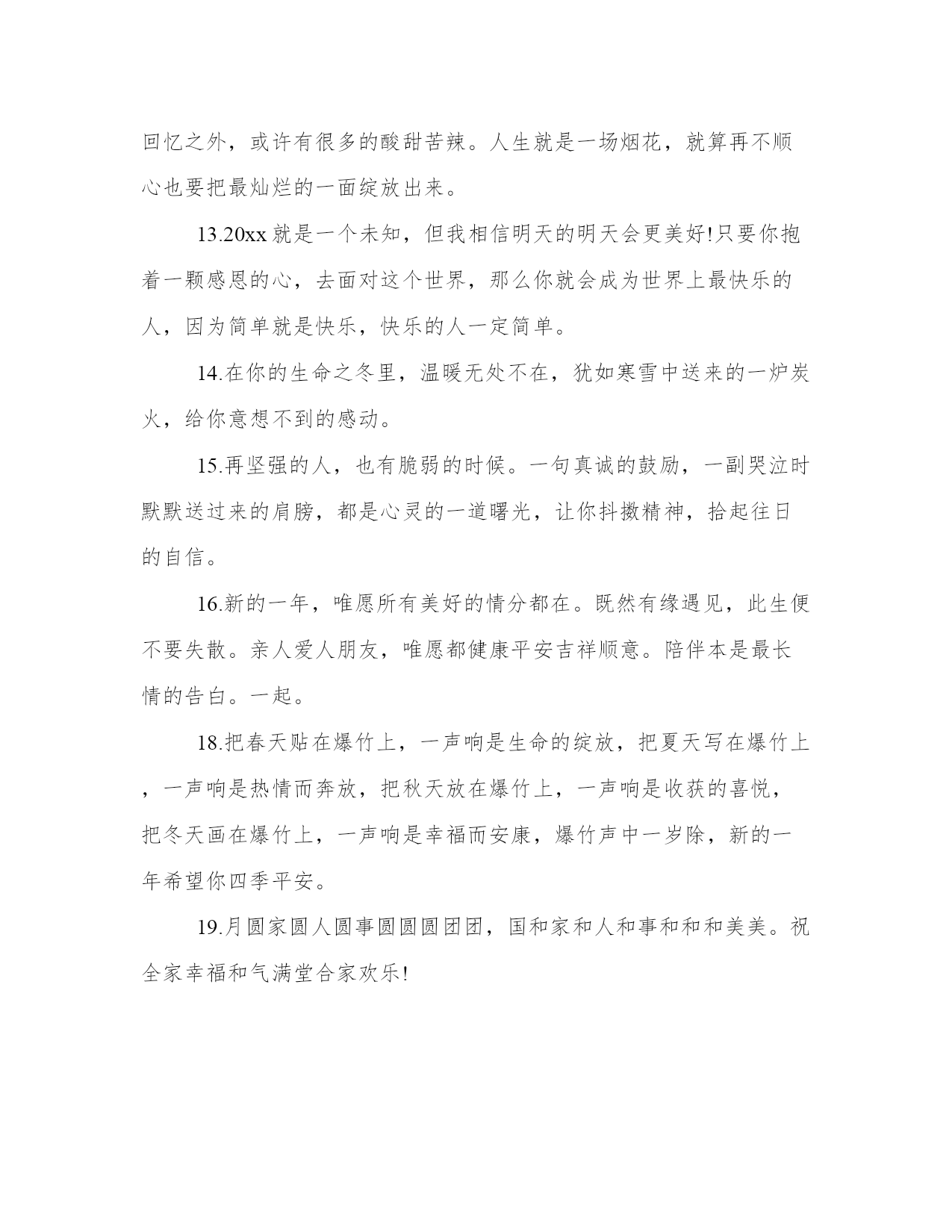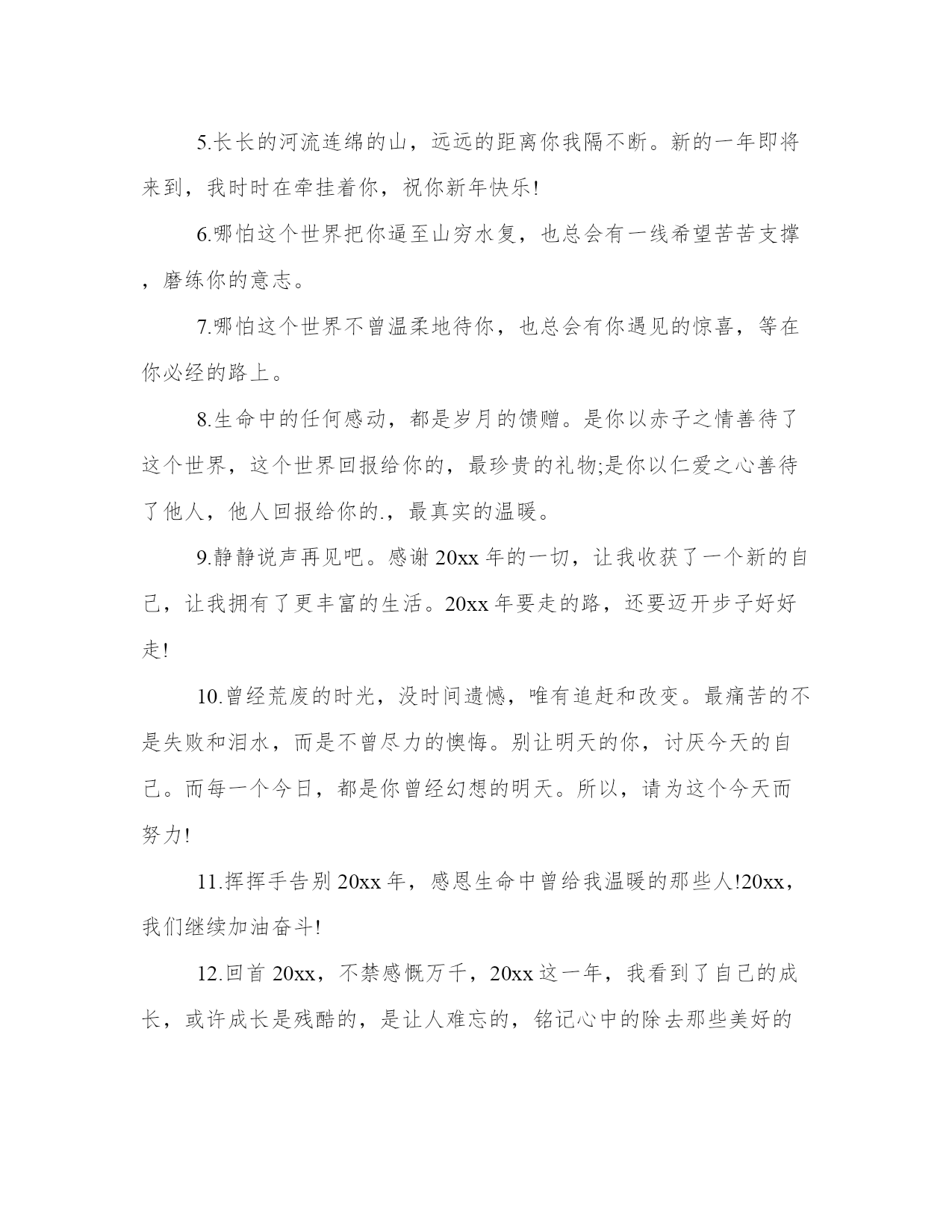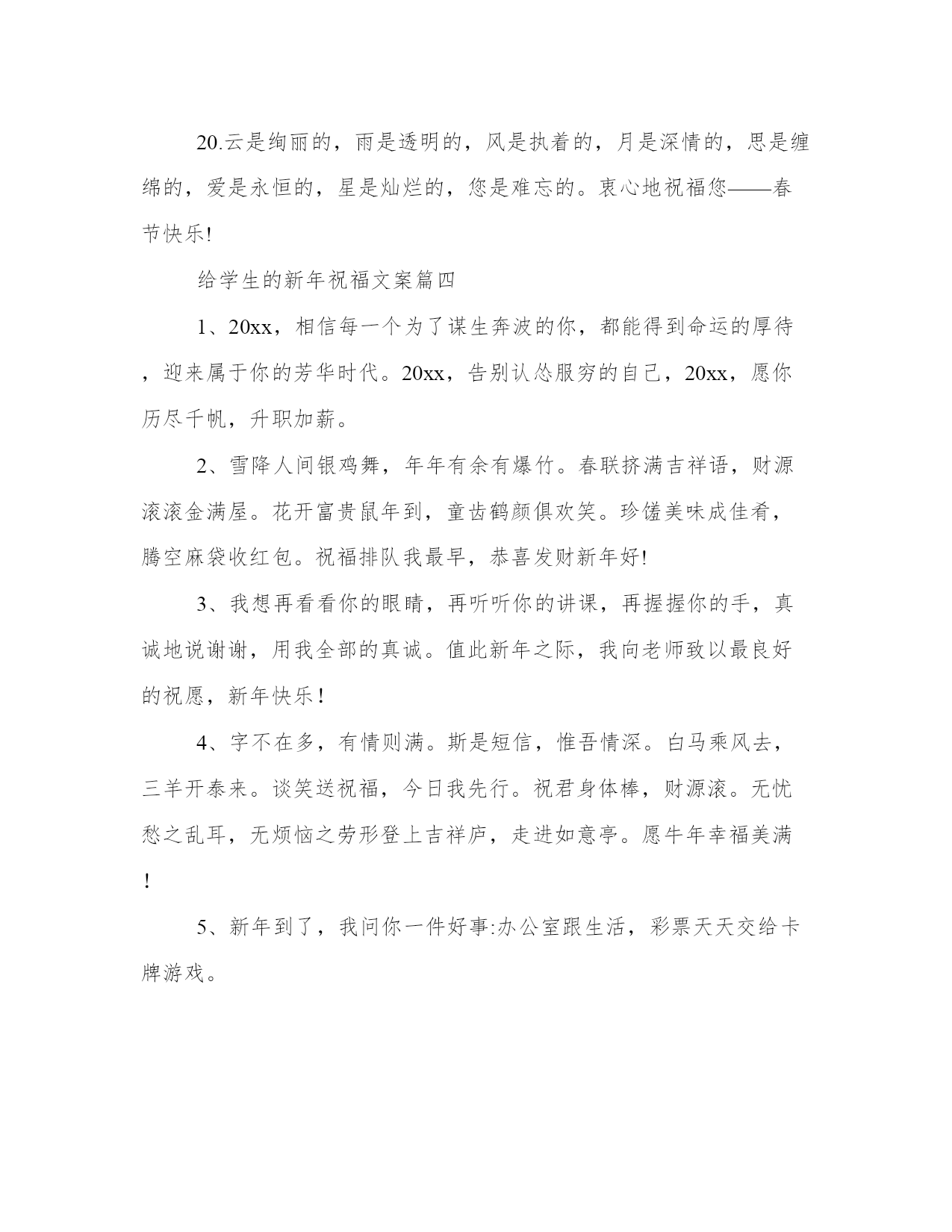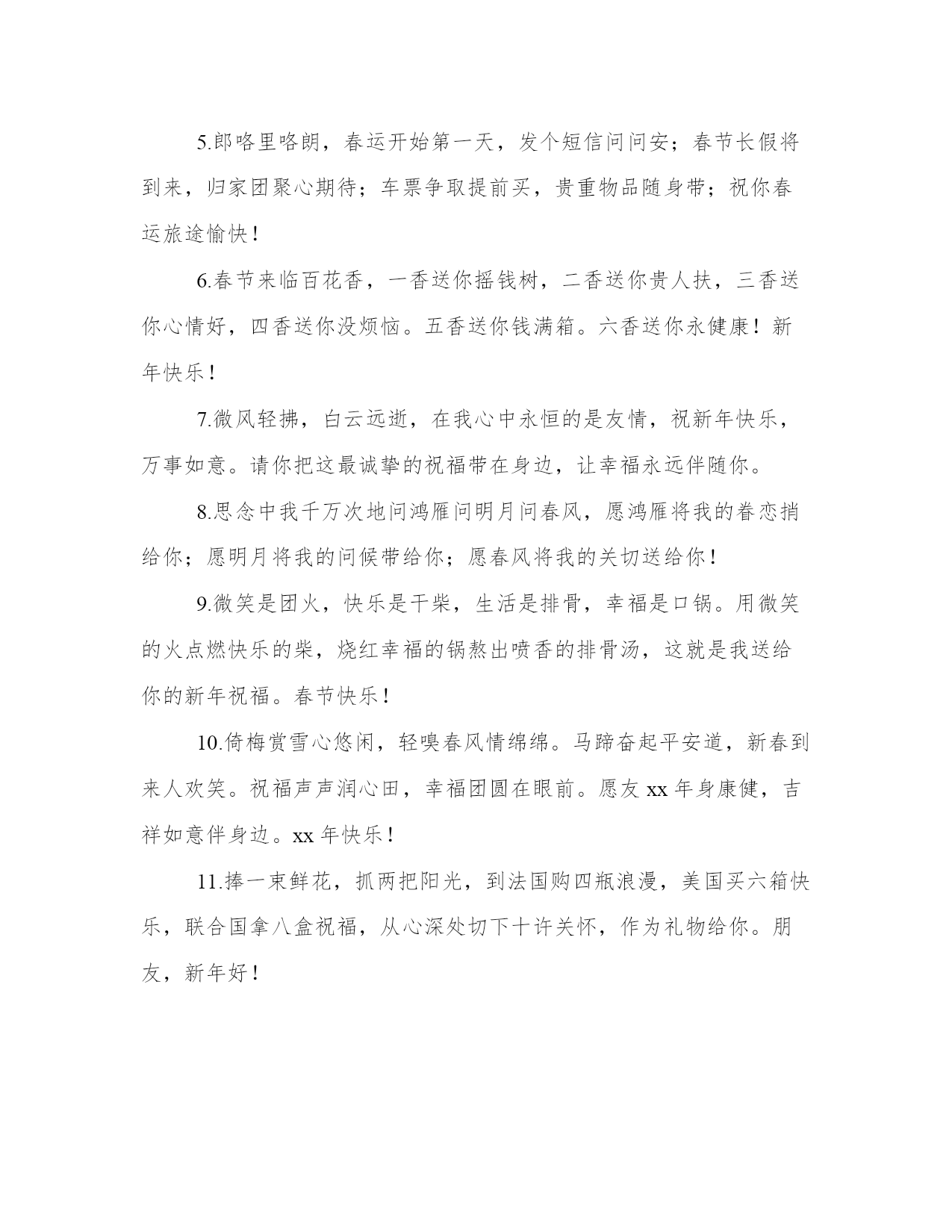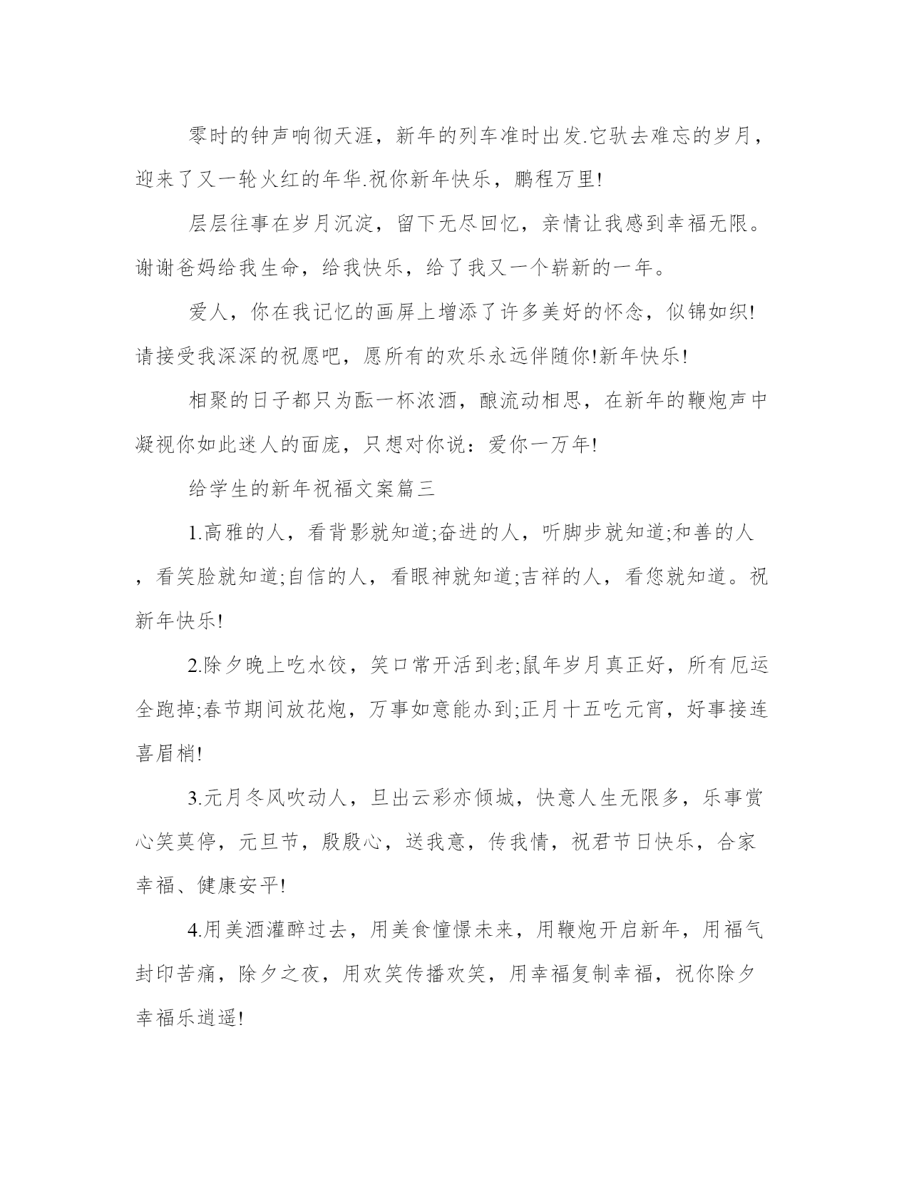 给学生的新年祝福文案(优质18篇)总结是对过去一段时间内的经验和成果进行回顾和总结的重要方式之一。完美的总结需要我们对自己的成长和发展进行深入思考和总结。下面是一些优秀的总结范文,供大家参考和学习。给学生的新年祝福文案篇一1.撕下旧年的日历,删除烦恼,把快乐刷新。送来新年的祝福,复制好运,让幸福更新。祝你新年新气象,新年交好运。春节快乐。2.新年扶贫行动开始了,如果是睡眠特困户,奖励你睡个懒觉;如果是缺钱特困户,奖励你免费提货卡;如果是郁闷特困户,奖励你辅天盖地的祝福:新年快乐!出自fanWeN.chaziDiAN.com3.跨进新年的门槛,延续着幸福的主线,红火的日子翻天,熟悉的笑脸灿烂,吉祥的色彩斑斓,欢乐的颂歌不断,久违的问候温暖,新春佳节,愿你宏图大展!4.回首过去的一年,老师们呕心沥血,播撒音乐的种子,而我们可爱的同学们挥洒智慧,放飞音乐的梦想,收获自信与快乐。愿我们在新的一年里,扬起音乐的风帆,荡起智慧的双桨,迎着春风朝阳,团结一心,起航破浪!5.郎咯里咯朗,春运开始第一天,发个短信问问安;春节长假将到来,归家团聚心期待;车票争取提前买,贵重物品随身带;祝你春运旅途愉快!6.春节来临百花香,一香送你摇钱树,二香送你贵人扶,三香送你心情好,四香送你没烦恼。五香送你钱满箱。六香送你永健康!新年快乐!7.微风轻拂,白云远逝,在我心中永恒的是友情,祝新年快乐,万事如意。请你把这最诚挚的祝福带在身边,让幸福永远伴随你。8.思念中我千万次地问鸿雁问明月问春风,愿鸿雁将我的眷恋捎给你;愿明月将我的问候带给你;愿春风将我的关切送给你!9.微笑是团火,快乐是干柴,生活是排骨,幸福是口锅。用微笑的火点燃快乐的柴,烧红幸福的锅熬出喷香的排骨汤,这就是我送给你的新年祝福。春节快乐!10.倚梅赏雪心悠闲,轻嗅春风情绵绵。马蹄奋起平安道,新春到来人欢笑。祝福声声润心田,幸福团圆在眼前。愿友xx年身康健,吉祥如意伴身边。xx年快乐!11.捧一束鲜花,抓两把阳光,到法国购四瓶浪漫,美国买六箱快乐,联合国拿八盒祝福,从心深处切下十许关怀,作为礼物给你。朋友,新年好!12.自爱,使你端庄;自尊,使你高雅;自立,使你自由;自强,使你奋发;自信,使你坚定……这一切将使你在成功的道路上遥遥领先。新年快乐!13.时间从指间溜走,默默无闻中,又一个新的年头。寒来暑去,春夏冬秋,别再匆匆地奔走。新年已至,此情悠悠。愿你新年争上游,快乐长长久!14.愿所有的好梦依偎着你,入睡是甜,醒来成真!愿所有的财运笼罩着你!日出遇贵,日落见财!愿所有的吉星呵护着你!时时吉祥!刻刻平安!15.如果一滴水代表一个祝福,我送你一个东海;如果一颗星代表一份幸福,我送你一条银河;如果一棵树代表一份思念,我送你一片森林。新年快乐!给学生的新年祝福文案篇二你在新年夜被通缉了,你的罪行是:1.对朋友太好,又够义气;2.青春的面孔,灿烂的笑容。本庭现判决如下:罚你终身做我的朋友,不得上诉!金钱是一种有用的东西,但是只有在你觉得知足的时候,它才会带给你快乐。所以你应该把多余的钱交给我,这样我们两个都会感到快乐了!今年过节不收礼,其实给点也可以。十块八块不嫌弃,十万八万过得去.你要真是没的送,短信一条也可以。新年快乐!一直很想跟你说,但不知你会不会觉得我太心急。我又怕被别人抢先一步,所以我决定鼓起勇气告诉你:新年快乐!祝您在新年的假期里:小酒喝到六亲不认,香烟抽到同归于尽,麻将搓到昼夜不分,跳舞跳到筋疲力尽,吹牛吹到自己不信。听说过年你要到我们家做客,我弟弟会代我去接你,为便于确认身份,请你左手拿两条上等烟,右手提两瓶茅台酒。祝你正财;偏财;横财,财源滚滚;亲情;友情;私情,情情如意;官运;财运;桃花运,运运亨通。酒越久越醇,朋友相交越久越真;水越流越清,世间沧桑越流越淡。祝新年快乐,时时好心情!对你的思念象袅袅的轻烟不绝如缕,对你的祝福是潺潺的小溪叮咚作响。或许岁月将往事褪色,或许空间将彼此隔离。但值得珍惜的依然是你给我的情谊。再次对你说声:新年快乐!愿你抱着平安,拥着健康,揣着幸福,携着快乐,搂着温馨,带着甜蜜,牵着财运,拽着吉祥,迈入新年,快乐度过每一天!愿所有的好梦依偎着你,入睡是甜,醒来成真!愿所有的财运笼罩着你!日出遇贵,日落见财!愿所有的吉星呵护着你!时时吉祥!刻刻平安!送你一件外套,前面是平安,后面是幸福,吉祥是领子,如意是袖子,快乐是扣子,口袋里满是温暖,穿上吧,让它相伴你的每一天!新年快乐!零时的钟声响彻天涯,新年的列车准时出发.它驮去难忘的岁月,迎来了又一轮火红的年华.祝你新年快乐,鹏程万里!层层往事在岁月沉淀,留下无尽回忆,亲情让我感到幸福无限。谢谢爸妈给我生命,给我快乐,给了我又一个崭新的一年。爱人,你