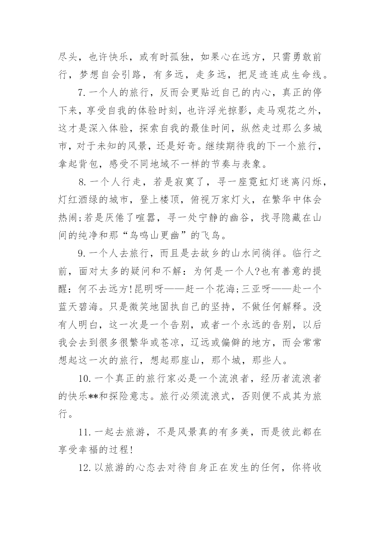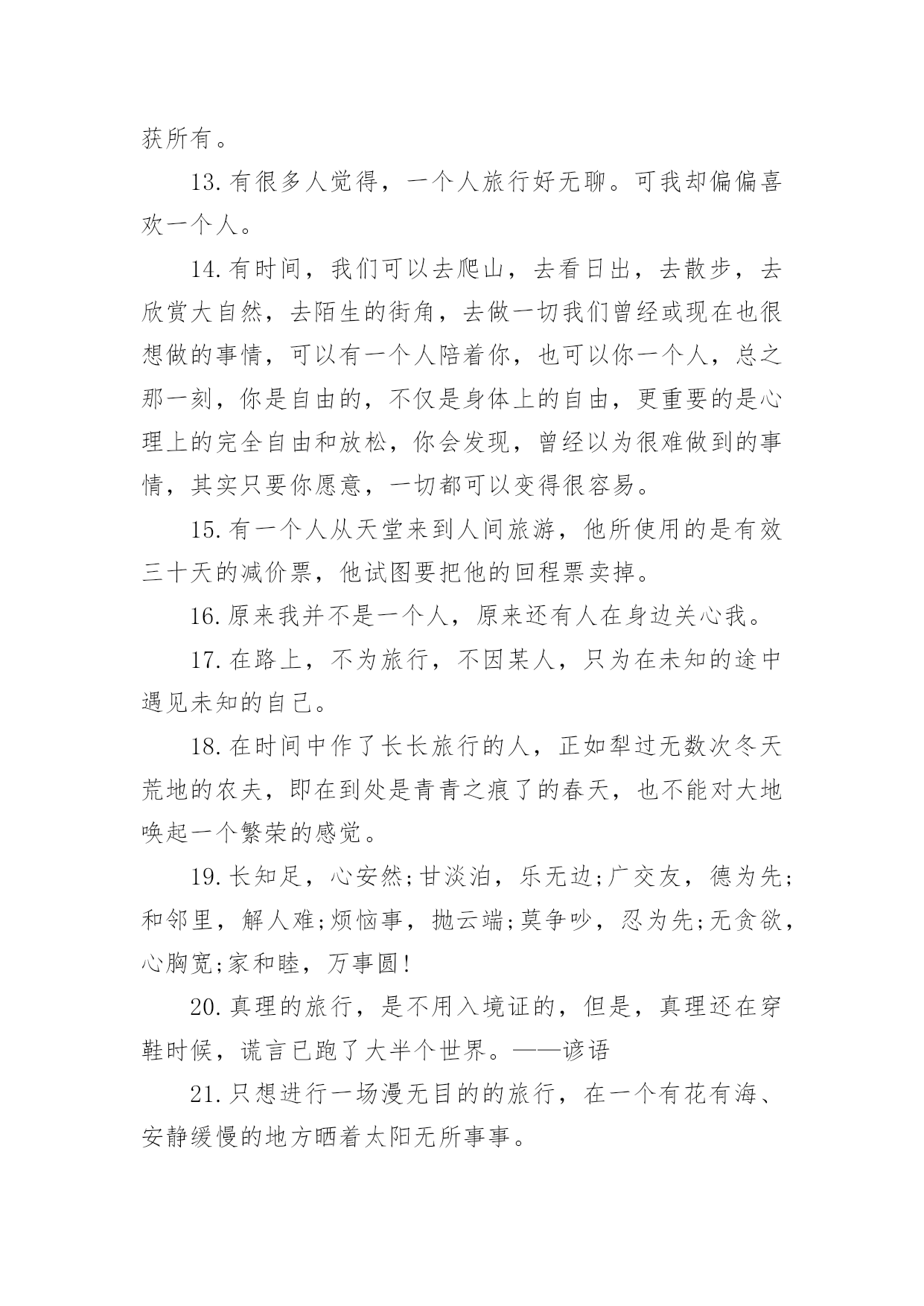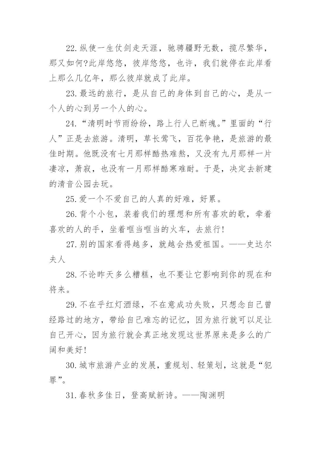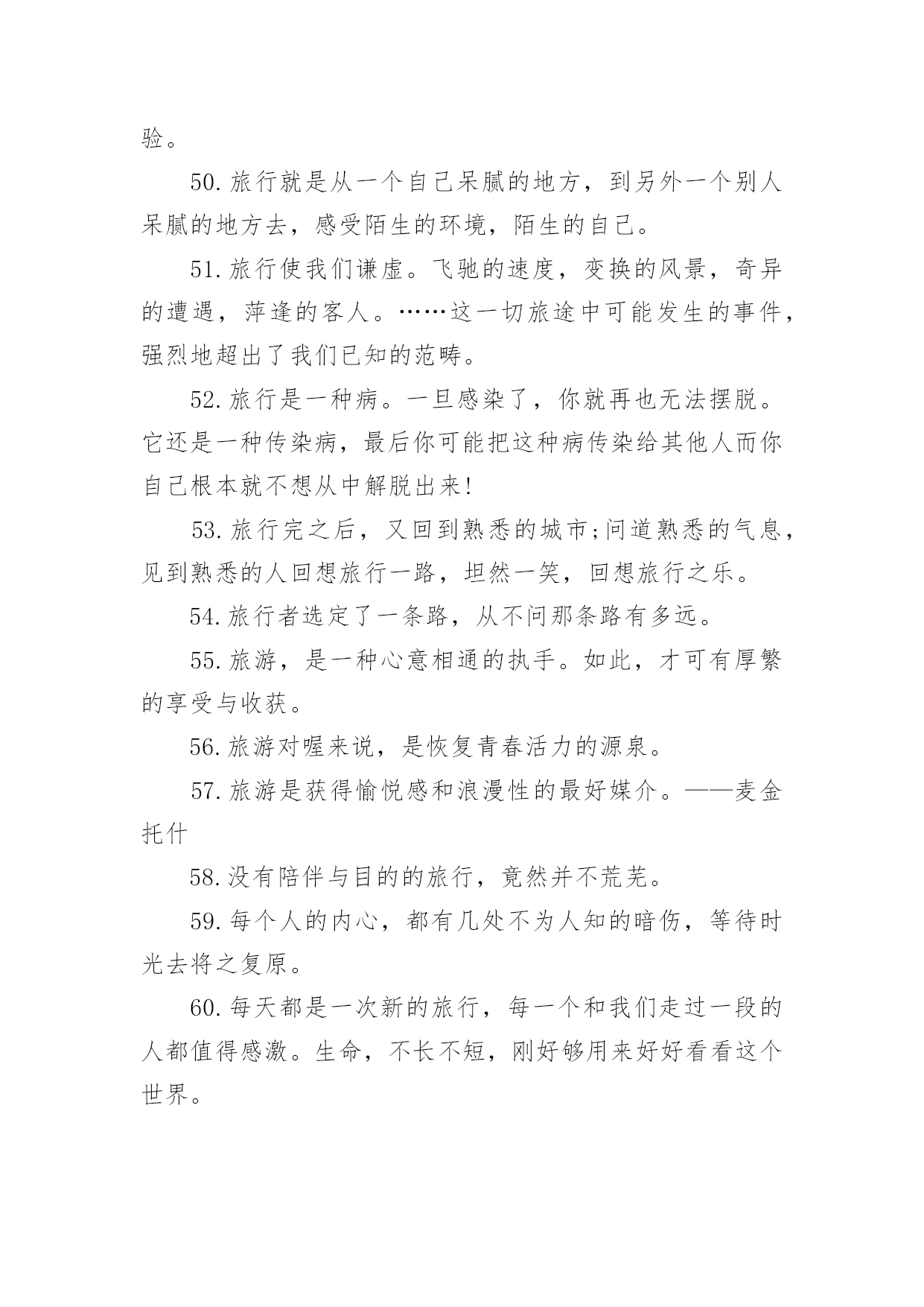 旅游感言语录在我们平凡的日常里,大家都听说过或者使用过一些比较经典的语录吧,语录现指能引起共鸣的、发人深省,有一定传播力的名人之言、网民言论、社会事件所产生的新词条。你知道什么样的语录才能算得上是走心的语录吗?以下是小编精心整理的旅游感言语录,希望能够帮助到大家。旅游感言语录11.相信我,虽然你们相爱,但还是完整的个体,所以让他自己决定吧。就算你不赞同,也不要在他一脸兴奋的时候告诉他,鼓励他吧!之后再委婉的给他一些意见。2.想在暖风醉人的季节里,去赴一场花宴。你若同行,愿与你一路畅聊这风花雪月。3.幸福,就是找一个温暖的人过一辈子。今请珍惜爱你的人吧,珍惜在你身边一直保护你,一直把你当宝贝的人。那个人真的很珍贵。他在你身边的时候,你并不知道你真的那么爱他。4.也许你现在正一个人勇敢背包行走着,对着那些陌生面孔微笑;温和从容,安然自在,唯独内心有份填补却一直空着。你要相信:在彼此相遇的路上,会有个人,与你咫尺天涯。5.一旦环境开始陌生,人在旅途的感觉就更强烈了。6.一个人,一条路,人在途中,心随景动,从起点,到尽头,也许快乐,或有时孤独,如果心在远方,只需勇敢前行,梦想自会引路,有多远,走多远,把足迹连成生命线。7.一个人的旅行,反而会更贴近自己的内心,真正的停下来,享受自我的体验时刻,也许浮光掠影,走马观花之外,这才是深入体验,探索自我的最佳时间,纵然走过那么多城市,对于未知的风景,还是好奇。继续期待我的下一个旅行,拿起背包,感受不同地域不一样的节奏与表象。8.一个人行走,若是寂寞了,寻一座霓虹灯迷离闪烁,灯红酒绿的城市,登上楼顶,俯视万家灯火,在繁华中体会热闹;若是厌倦了喧嚣,寻一处宁静的幽谷,找寻隐藏在山间的纯净和那“鸟鸣山更幽”的飞鸟。9.一个人去旅行,而且是去故乡的山水间徜徉。临行之前,面对太多的疑问和不解:为何是一个人?也有善意的提醒:何不去远方!昆明呀——赶一个花海;三亚呀——赴一个蓝天碧海。只是微笑地固执自己的坚持,不做任何解释。没有人明白,这一次是一个告别,或者一个永远的告别,以后我会去到很多很繁华或苍凉,辽远或偏僻的地方,而会常常想起这一次的旅行,想起那座山,那个城,那些人。10.一个真正的旅行家必是一个流浪者,经历者流浪者的快乐**和探险意志。旅行必须流浪式,否则便不成其为旅行。11.一起去旅游,不是风景真的有多美,而是彼此都在享受幸福的过程!12.以旅游的心态去对待自身正在发生的任何,你将收获所有。13.有很多人觉得,一个人旅行好无聊。可我却偏偏喜欢一个人。14.有时间,我们可以去爬山,去看日出,去散步,去欣赏大自然,去陌生的街角,去做一切我们曾经或现在也很想做的事情,可以有一个人陪着你,也可以你一个人,总之那一刻,你是自由的,不仅是身体上的自由,更重要的是心理上的完全自由和放松,你会发现,曾经以为很难做到的事情,其实只要你愿意,一切都可以变得很容易。15.有一个人从天堂来到人间旅游,他所使用的是有效三十天的减价票,他试图要把他的回程票卖掉。16.原来我并不是一个人,原来还有人在身边关心我。17.在路上,不为旅行,不因某人,只为在未知的途中遇见未知的自己。18.在时间中作了长长旅行的人,正如犁过无数次冬天荒地的农夫,即在到处是青青之痕了的春天,也不能对大地唤起一个繁荣的感觉。19.长知足,心安然;甘淡泊,乐无边;广交友,德为先;和邻里,解人难;烦恼事,抛云端;莫争吵,忍为先;无贪欲,心胸宽;家和睦,万事圆!20.真理的旅行,是不用入境证的,但是,真理还在穿鞋时候,谎言已跑了大半个世界。——谚语21.只想进行一场漫无目的的旅行,在一个有花有海、安静缓慢的地方晒着太阳无所事事。22.纵使一生仗剑走天涯,驰骋疆野无数,揽尽繁华,那又如何?此岸悠悠,彼岸悠悠,也许,我们就停在此岸看上那么几亿年,那么彼岸就成了此岸。23.最远的旅行,是从自己的身体到自己的心,是从一个人的心到另一个人的心。24.“清明时节雨纷纷,路上行人已断魂。”里面的“行人”正是去旅游。清明,草长莺飞,百花争艳,是旅游的最佳时期。他既没有七月那样酷热难熬,又没有九月那样一片凄凉,萧寂,也没有一月那样酷寒难耐。于是,决定去新建的清音公园去玩。25.爱一个不爱自己的人真的好难,好累。26.背个小包,装着我们的理想和所有喜欢的歌,牵着喜欢的人的手,坐着哐当哐当的火车,去旅行!27.别的国家看得越多,就越会热爱祖国。——史达尔夫人28.不论昨天多么糟糕,也不要让它影响到你的现在和将来。29.不在乎红灯酒绿,不在意成功失败,只想念自己曾经路过的地方,带给自己难忘的记忆,因为旅行就可以足让自己开心,因为旅行就会真正地发现这世界原来是多么的广阔和美好!30.城市旅游产业的发展,重规划、轻策划,这就是“犯罪”。31.春秋多佳日,登高赋新诗。——陶渊明32.当