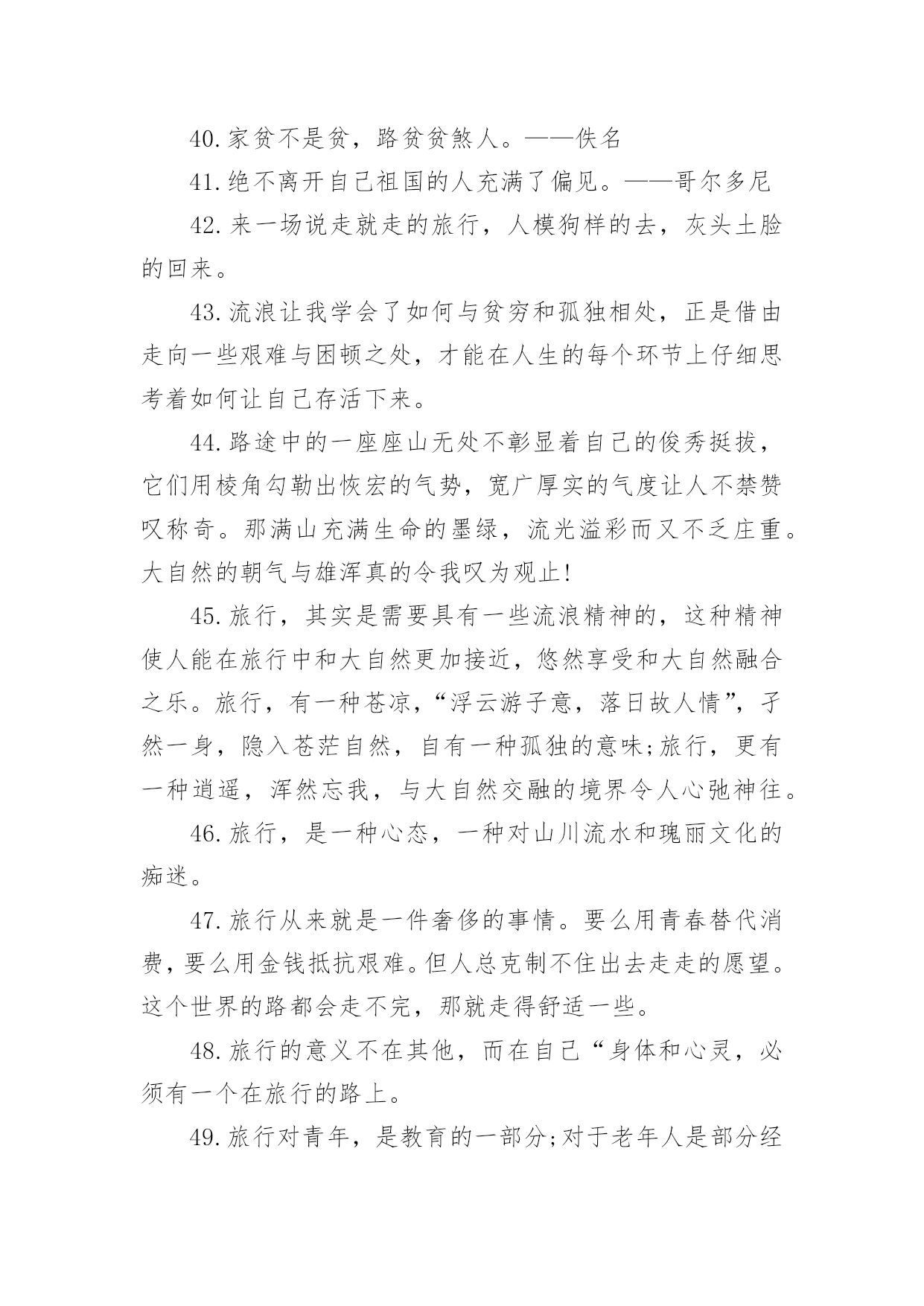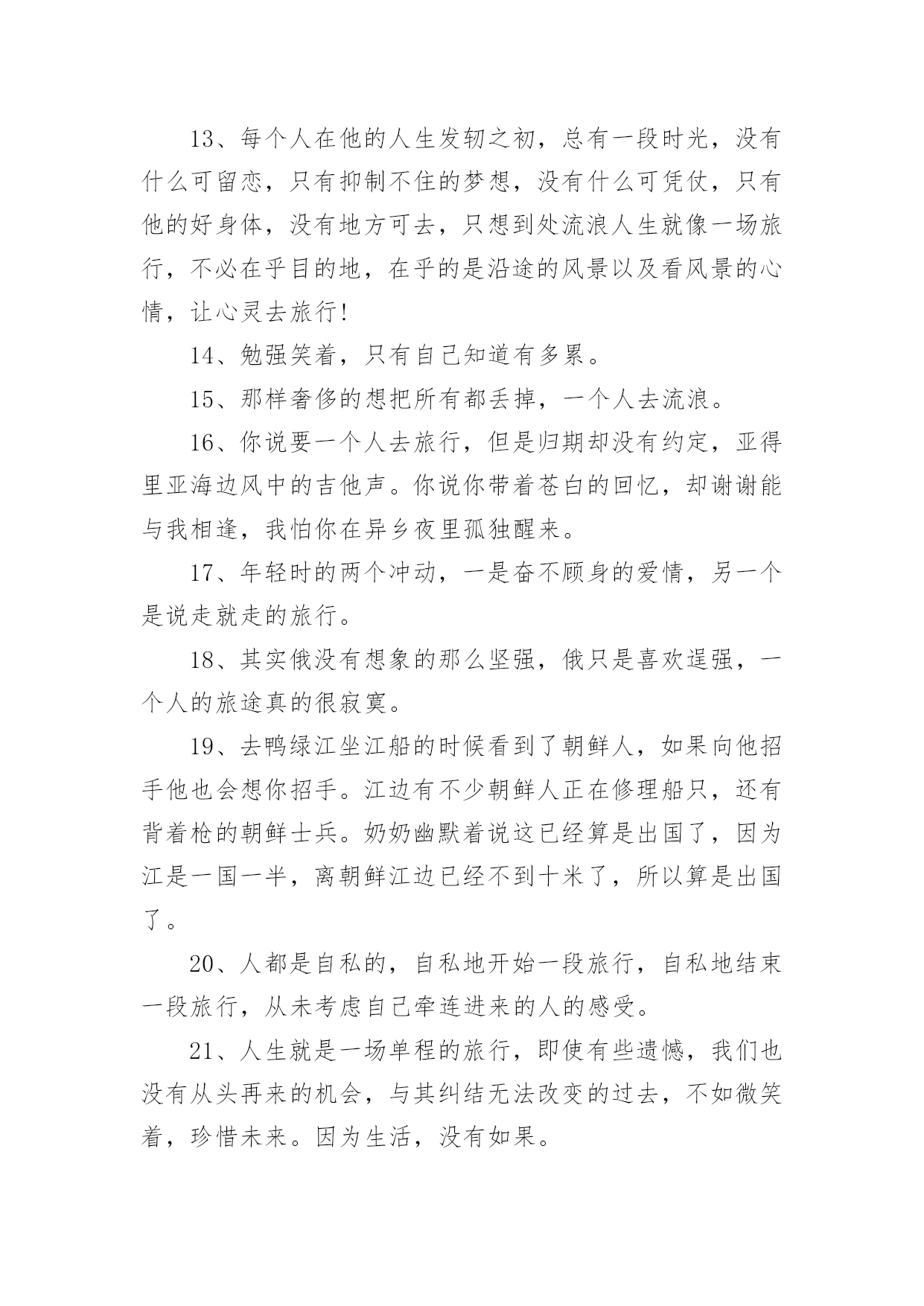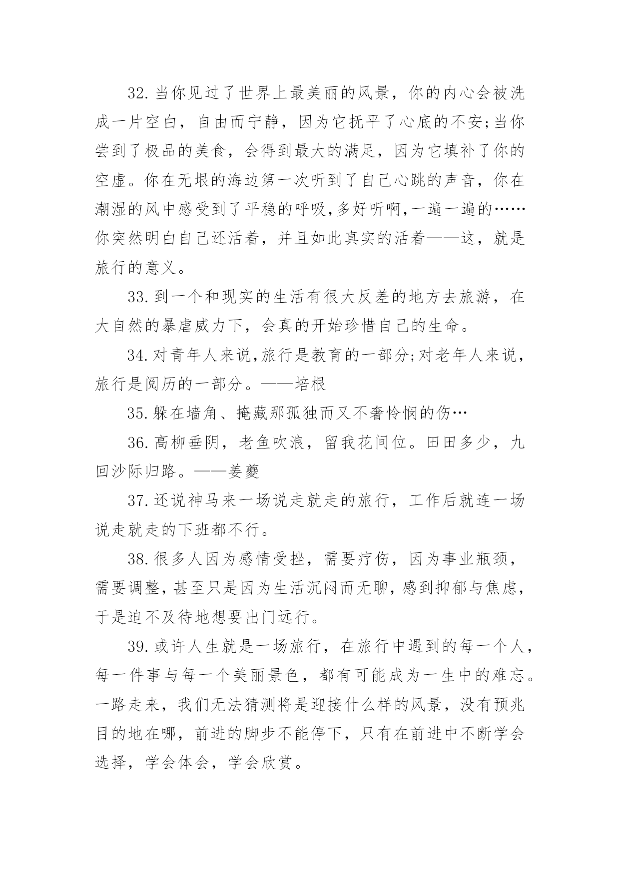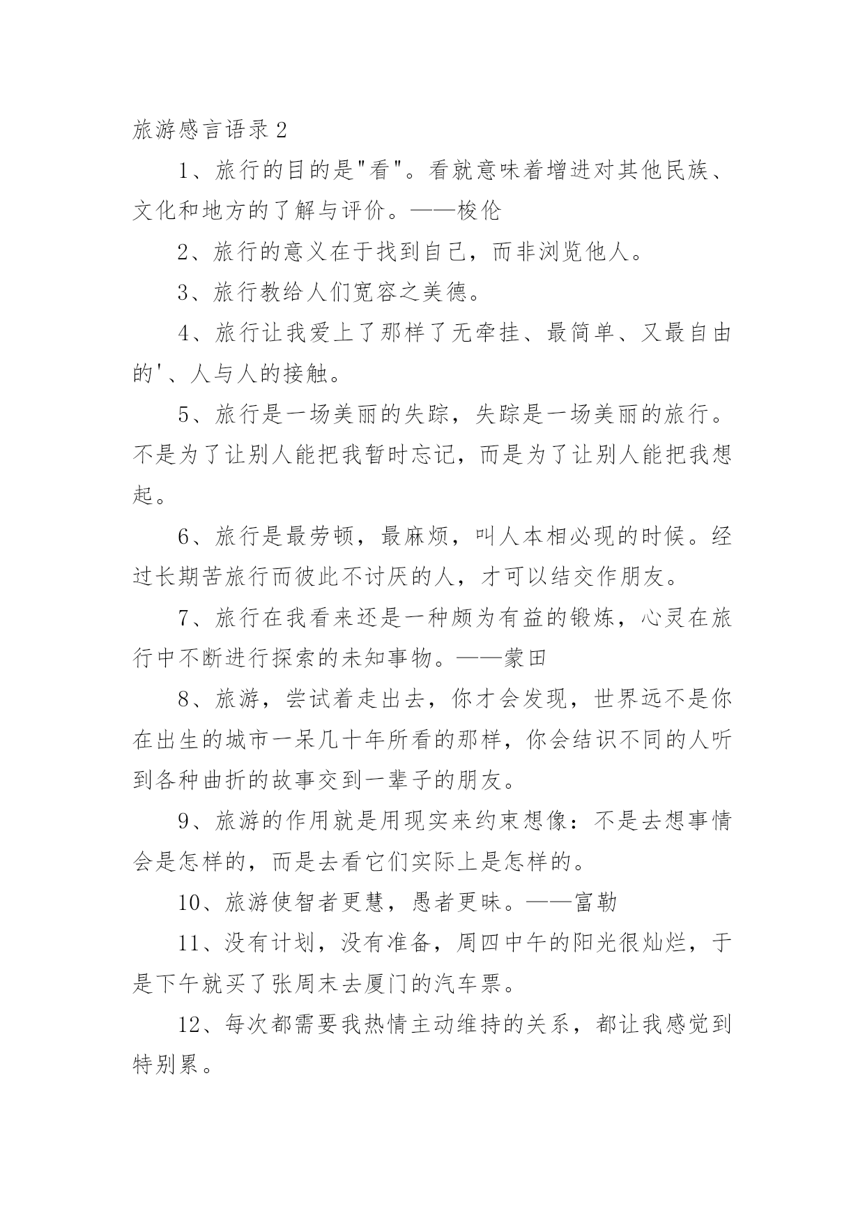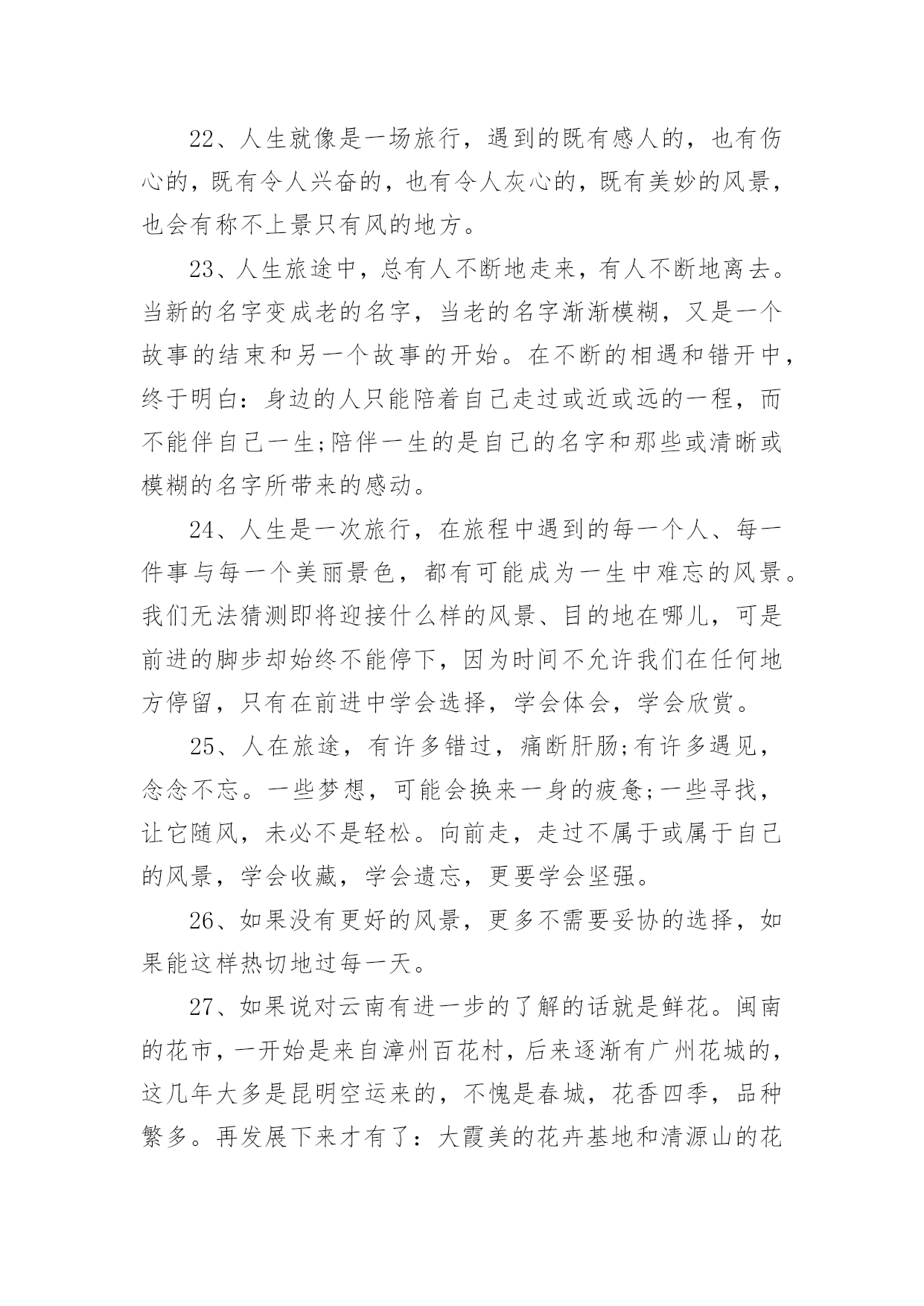 旅游感言语录在我们平凡的日常里,大家都听说过或者使用过一些比较经典的语录吧,语录现指能引起共鸣的、发人深省,有一定传播力的名人之言、网民言论、社会事件所产生的新词条。你知道什么样的语录才能算得上是走心的语录吗?以下是小编精心整理的旅游感言语录,希望能够帮助到大家。旅游感言语录11.相信我,虽然你们相爱,但还是完整的个体,所以让他自己决定吧。就算你不赞同,也不要在他一脸兴奋的时候告诉他,鼓励他吧!之后再委婉的给他一些意见。2.想在暖风醉人的季节里,去赴一场花宴。你若同行,愿与你一路畅聊这风花雪月。3.幸福,就是找一个温暖的人过一辈子。今请珍惜爱你的人吧,珍惜在你身边一直保护你,一直把你当宝贝的人。那个人真的很珍贵。他在你身边的时候,你并不知道你真的那么爱他。4.也许你现在正一个人勇敢背包行走着,对着那些陌生面孔微笑;温和从容,安然自在,唯独内心有份填补却一直空着。你要相信:在彼此相遇的路上,会有个人,与你咫尺天涯。5.一旦环境开始陌生,人在旅途的感觉就更强烈了。6.一个人,一条路,人在途中,心随景动,从起点,到尽头,也许快乐,或有时孤独,如果心在远方,只需勇敢前行,梦想自会引路,有多远,走多远,把足迹连成生命线。7.一个人的旅行,反而会更贴近自己的内心,真正的停下来,享受自我的体验时刻,也许浮光掠影,走马观花之外,这才是深入体验,探索自我的最佳时间,纵然走过那么多城市,对于未知的风景,还是好奇。继续期待我的下一个旅行,拿起背包,感受不同地域不一样的节奏与表象。8.一个人行走,若是寂寞了,寻一座霓虹灯迷离闪烁,灯红酒绿的城市,登上楼顶,俯视万家灯火,在繁华中体会热闹;若是厌倦了喧嚣,寻一处宁静的幽谷,找寻隐藏在山间的纯净和那“鸟鸣山更幽”的飞鸟。9.一个人去旅行,而且是去故乡的山水间徜徉。临行之前,面对太多的疑问和不解:为何是一个人?也有善意的提醒:何不去远方!昆明呀——赶一个花海;三亚呀——赴一个蓝天碧海。只是微笑地固执自己的坚持,不做任何解释。没有人明白,这一次是一个告别,或者一个永远的告别,以后我会去到很多很繁华或苍凉,辽远或偏僻的地方,而会常常想起这一次的旅行,想起那座山,那个城,那些人。10.一个真正的旅行家必是一个流浪者,经历者流浪者的快乐**和探险意志。旅行必须流浪式,否则便不成其为旅行。11.一起去旅游,不是风景真的有多美,而是彼此都在享受幸福的过程!12.以旅游的心态去对待自身正在发生的任何,你将收获所有。13.有很多人觉得,一个人旅行好无聊。可我却偏偏喜欢一个人。14.有时间,我们可以去爬山,去看日出,去散步,去欣赏大自然,去陌生的街角,去做一切我们曾经或现在也很想做的事情,可以有一个人陪着你,也可以你一个人,总之那一刻,你是自由的,不仅是身体上的自由,更重要的是心理上的完全自由和放松,你会发现,曾经以为很难做到的事情,其实只要你愿意,一切都可以变得很容易。15.有一个人从天堂来到人间旅游,他所使用的是有效三十天的减价票,他试图要把他的回程票卖掉。16.原来我并不是一个人,原来还有人在身边关心我。17.在路上,不为旅行,不因某人,只为在未知的途中遇见未知的自己。18.在时间中作了长长旅行的人,正如犁过无数次冬天荒地的农夫,即在到处是青青之痕了的春天,也不能对大地唤起一个繁荣的感觉。19.长知足,心安然;甘淡泊,乐无边;广交友,德为先;和邻里,解人难;烦恼事,抛云端;莫争吵,忍为先;无贪欲,心胸宽;家和睦,万事圆!20.真理的旅行,是不用入境证的,但是,真理还在穿鞋时候,谎言已跑了大半个世界。——谚语21.只想进行一场漫无目的的旅行,在一个有花有海、安静缓慢的地方晒着太阳无所事事。22.纵使一生仗剑走天涯,驰骋疆野无数,揽尽繁华,那又如何?此岸悠悠,彼岸悠悠,也许,我们就停在此岸看上那么几亿年,那么彼岸就成了此岸。23.最远的旅行,是从自己的身体到自己的心,是从一个人的心到另一个人的心。24.“清明时节雨纷纷,路上行人已断魂。”里面的“行人”正是去旅游。清明,草长莺飞,百花争艳,是旅游的最佳时期。他既没有七月那样酷热难熬,又没有九月那样一片凄凉,萧寂,也没有一月那样酷寒难耐。于是,决定去新建的清音公园去玩。25.爱一个不爱自己的人真的好难,好累。26.背个小包,装着我们的理想和所有喜欢的歌,牵着喜欢的人的手,坐着哐当哐当的火车,去旅行!27.别的国家看得越多,就越会热爱祖国。——史达尔夫人28.不论昨天多么糟糕,也不要让它影响到你的现在和将来。29.不在乎红灯酒绿,不在意成功失败,只想念自己曾经路过的地方,带给自己难忘的记忆,因为旅行就可以足让自己开心,因为旅行就会真正地发现这世界原来是多么的广阔和美好!30.城市旅游产业的发展,重规划、轻策划,这就是“犯罪”。31.春秋多佳日,登高赋新诗。——陶渊明32.当
