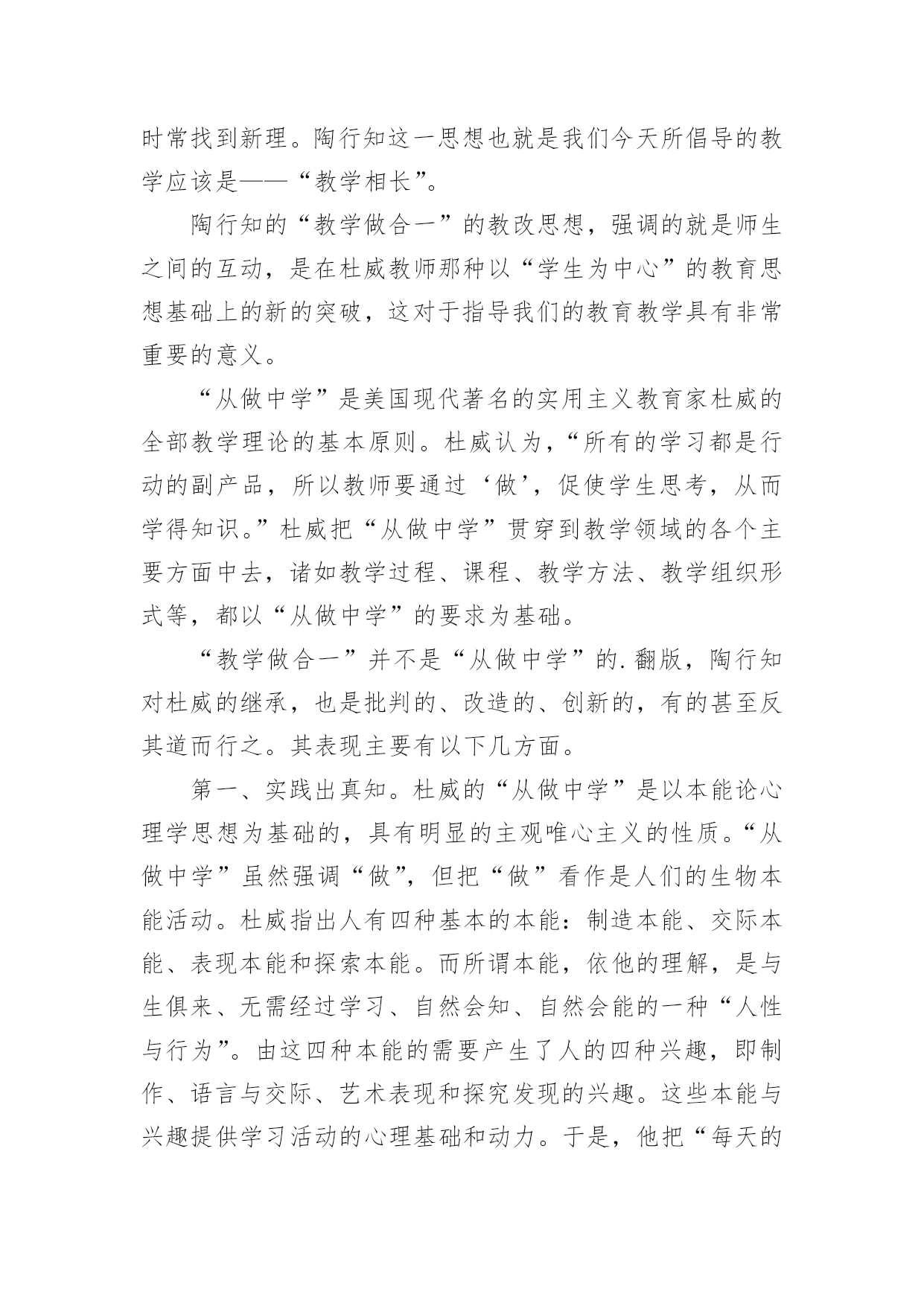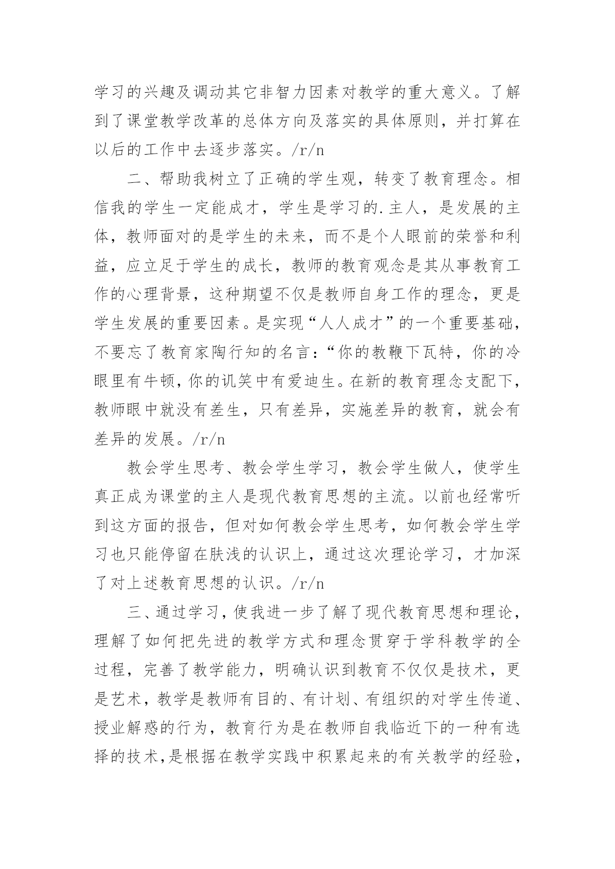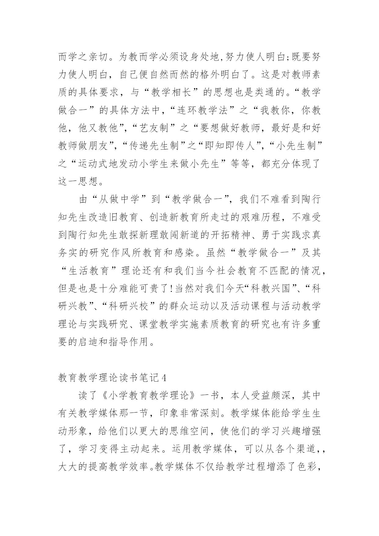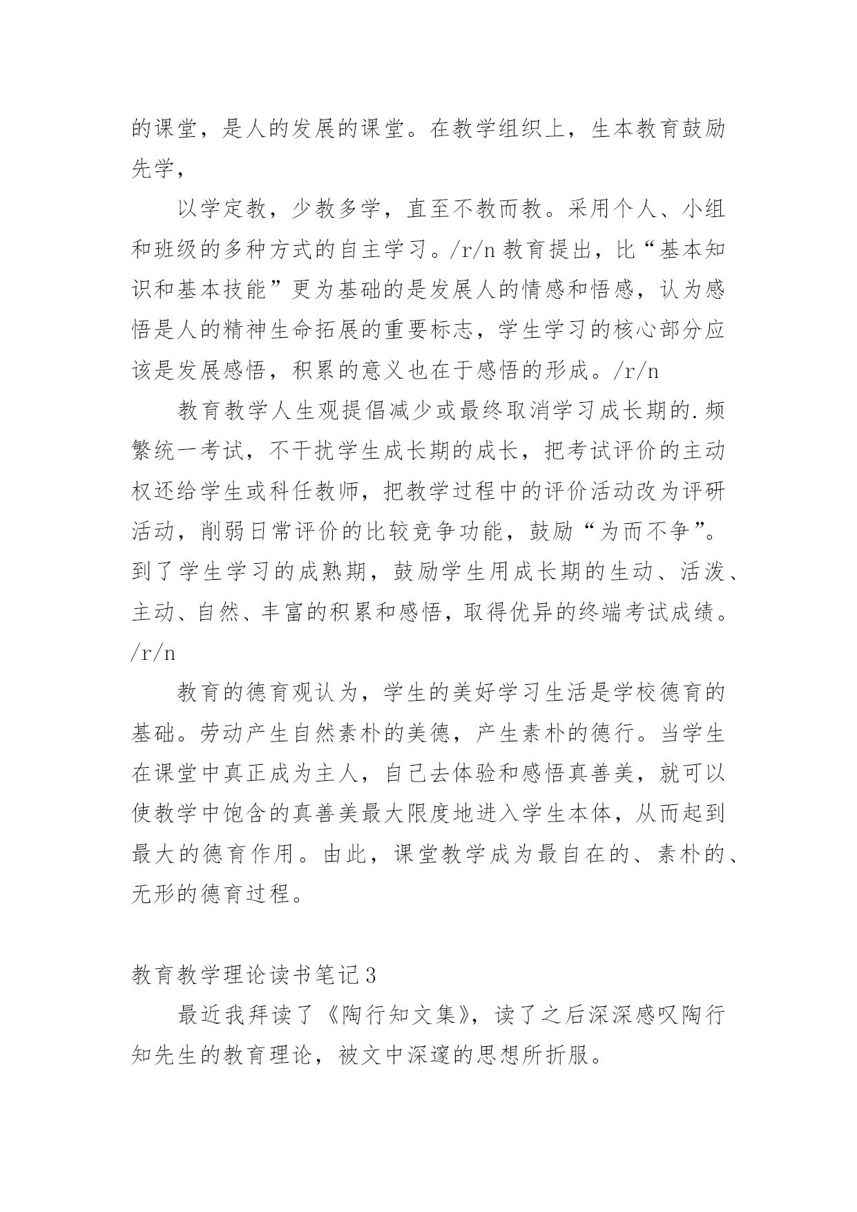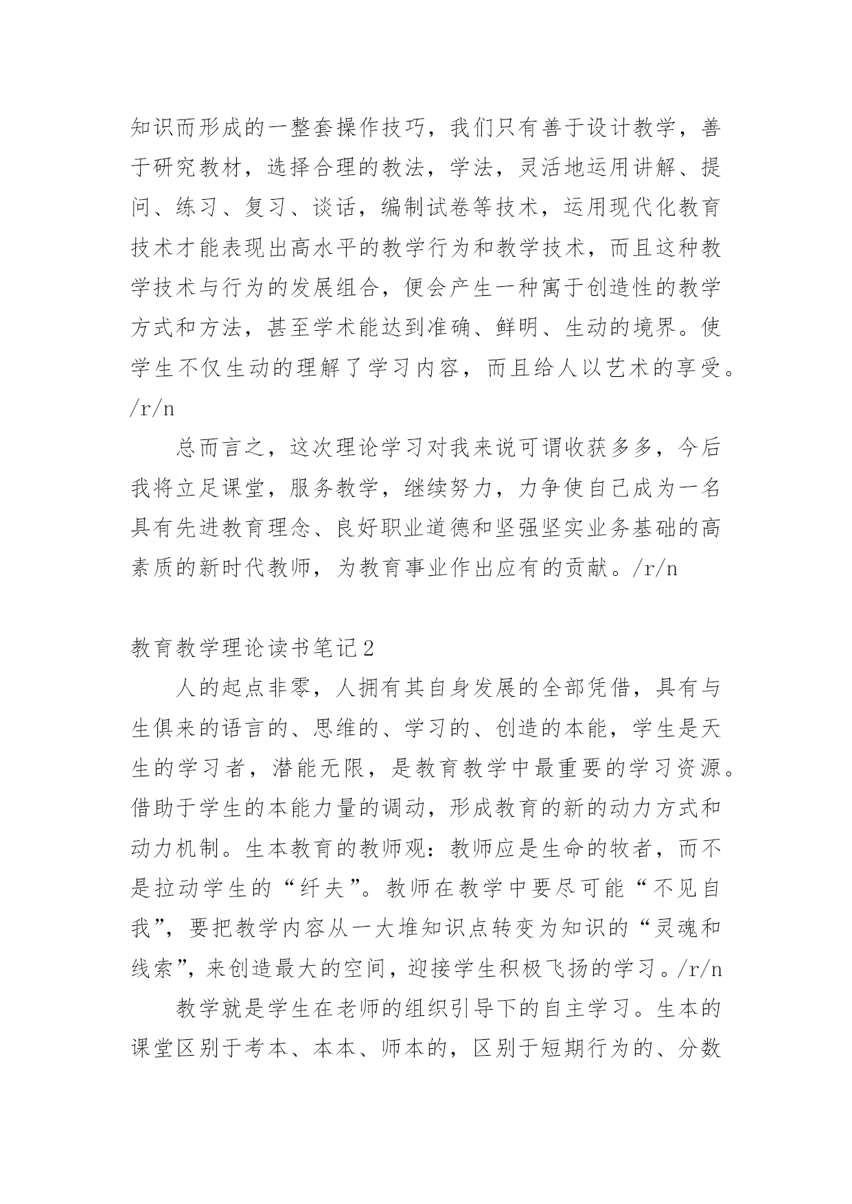 教育教学理论读书笔记读完某一作品后,相信大家的视野一定开拓了不少,需要回过头来写一写读书笔记了。你想好怎么写读书笔记了吗?下面是小编为大家整理的教育教学理论读书笔记,欢迎大家分享。教育教学理论读书笔记1通过两天紧张而充实的学习,我受益匪浅,特别是对教育教学理论有了较为深刻的理解和认识,从而有效地提高了自己的认识水平和理论水平,进一步增强了自己战胜困难,抓好教育教学和提高自身业务水平的信心和决心。下面我谈几点体会:/r/n一、通过学习,我首先是对自身有了正确的认识:对教师来说,学习、反思、成长、发展是同义词,通过学习,我对自己有了全面的认识,我要努力摆脱“已成的我”,努力研究自己,提高自己、发展自己、更新自己,促进自身教学素质的提高。回忆二十年来的教学工作,在对教材的把握方面,教学方法的运用方面及对学生能力培养方面,基本上是沿着别人的路走下来的,很少有自己的东西。通过学习扩大了自己的视野,对教材的分析有了自己的观点。教了几年高三,也只注重了对知识方法的挖掘、归类、整理。如何教会学生思考,如何培养学生能力也一直是个未知数。通过学习,理清了知识与能力的关系及其培养途径。认识到了培养学生学习的兴趣及调动其它非智力因素对教学的重大意义。了解到了课堂教学改革的总体方向及落实的具体原则,并打算在以后的工作中去逐步落实。/r/n二、帮助我树立了正确的学生观,转变了教育理念。相信我的学生一定能成才,学生是学习的.主人,是发展的主体,教师面对的是学生的未来,而不是个人眼前的荣誉和利益,应立足于学生的成长,教师的教育观念是其从事教育工作的心理背景,这种期望不仅是教师自身工作的理念,更是学生发展的重要因素。是实现“人人成才”的一个重要基础,不要忘了教育家陶行知的名言:“你的教鞭下瓦特,你的冷眼里有牛顿,你的讥笑中有爱迪生。在新的教育理念支配下,教师眼中就没有差生,只有差异,实施差异的教育,就会有差异的发展。/r/n教会学生思考、教会学生学习,教会学生做人,使学生真正成为课堂的主人是现代教育思想的主流。以前也经常听到这方面的报告,但对如何教会学生思考,如何教会学生学习也只能停留在肤浅的认识上,通过这次理论学习,才加深了对上述教育思想的认识。/r/n三、通过学习,使我进一步了解了现代教育思想和理论,理解了如何把先进的教学方式和理念贯穿于学科教学的全过程,完善了教学能力,明确认识到教育不仅仅是技术,更是艺术,教学是教师有目的、有计划、有组织的对学生传道、授业解惑的行为,教育行为是在教师自我临近下的一种有选择的技术,是根据在教学实践中积累起来的有关教学的经验,知识而形成的一整套操作技巧,我们只有善于设计教学,善于研究教材,选择合理的教法,学法,灵活地运用讲解、提问、练习、复习、谈话,编制试卷等技术,运用现代化教育技术才能表现出高水平的教学行为和教学技术,而且这种教学技术与行为的发展组合,便会产生一种寓于创造性的教学方式和方法,甚至学术能达到准确、鲜明、生动的境界。使学生不仅生动的理解了学习内容,而且给人以艺术的享受。/r/n总而言之,这次理论学习对我来说可谓收获多多,今后我将立足课堂,服务教学,继续努力,力争使自己成为一名具有先进教育理念、良好职业道德和坚强坚实业务基础的高素质的新时代教师,为教育事业作出应有的贡献。/r/n教育教学理论读书笔记2人的起点非零,人拥有其自身发展的全部凭借,具有与生俱来的语言的、思维的、学习的、创造的本能,学生是天生的学习者,潜能无限,是教育教学中最重要的学习资源。借助于学生的本能力量的调动,形成教育的新的动力方式和动力机制。生本教育的教师观:教师应是生命的牧者,而不是拉动学生的“纤夫”。教师在教学中要尽可能“不见自我”,要把教学内容从一大堆知识点转变为知识的“灵魂和线索”,来创造最大的空间,迎接学生积极飞扬的学习。/r/n教学就是学生在老师的组织引导下的自主学习。生本的课堂区别于考本、本本、师本的,区别于短期行为的、分数的课堂,是人的发展的课堂。在教学组织上,生本教育鼓励先学,以学定教,少教多学,直至不教而教。采用个人、小组和班级的多种方式的自主学习。/r/n教育提出,比“基本知识和基本技能”更为基础的是发展人的情感和悟感,认为感悟是人的精神生命拓展的重要标志,学生学习的核心部分应该是发展感悟,积累的意义也在于感悟的形成。/r/n教育教学人生观提倡减少或最终取消学习成长期的.频繁统一考试,不干扰学生成长期的成长,把考试评价的主动权还给学生或科任教师,把教学过程中的评价活动改为评研活动,削弱日常评价的比较竞争功能,鼓励“为而不争”。到了学生学习的成熟期,鼓励学生用成长期的生动、活泼、主动、自然、丰富的积累和感悟,取得优异的终端考试成绩。/r/n教育的德育观认为,学生的美好学习生活是学校德育的基础。劳动产生自然素朴的美德,产生