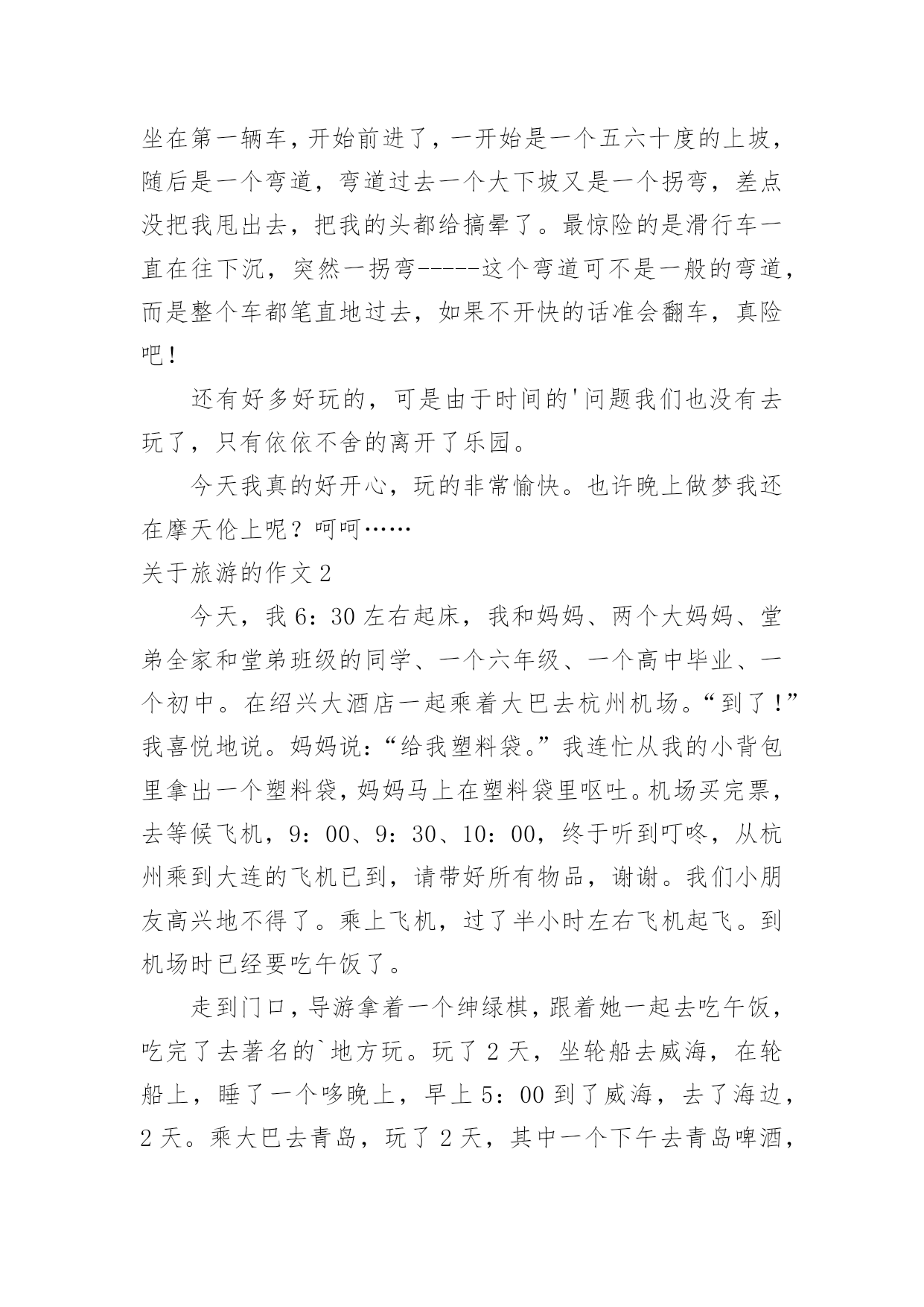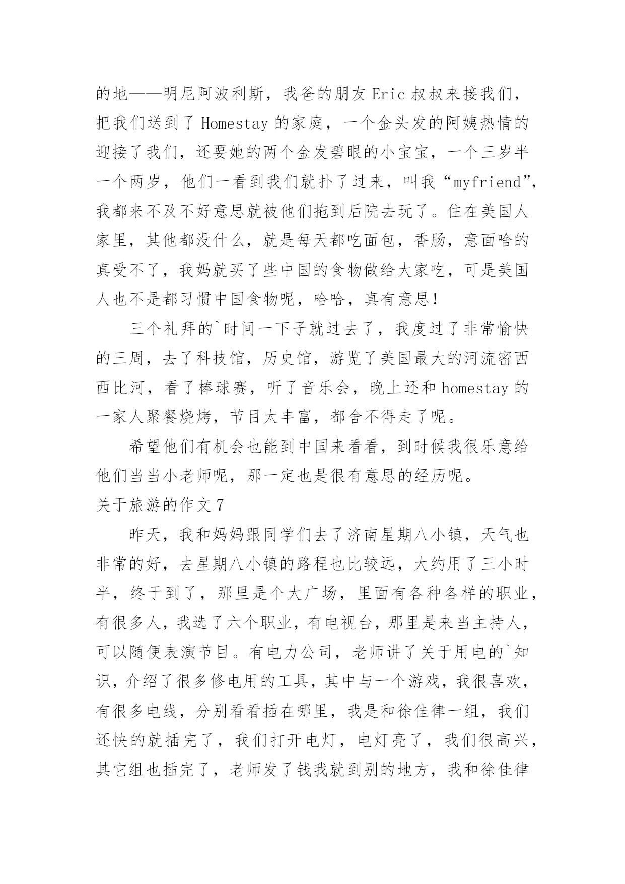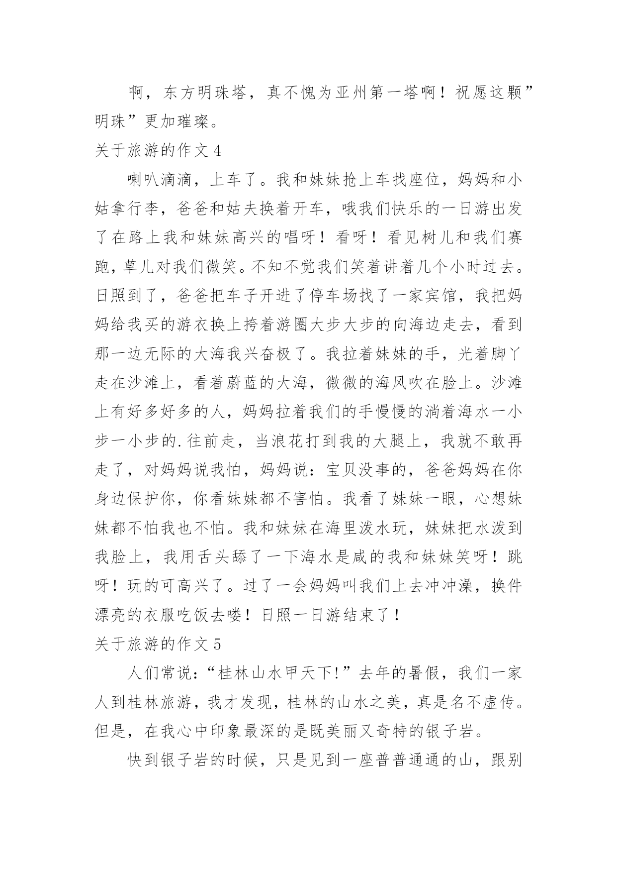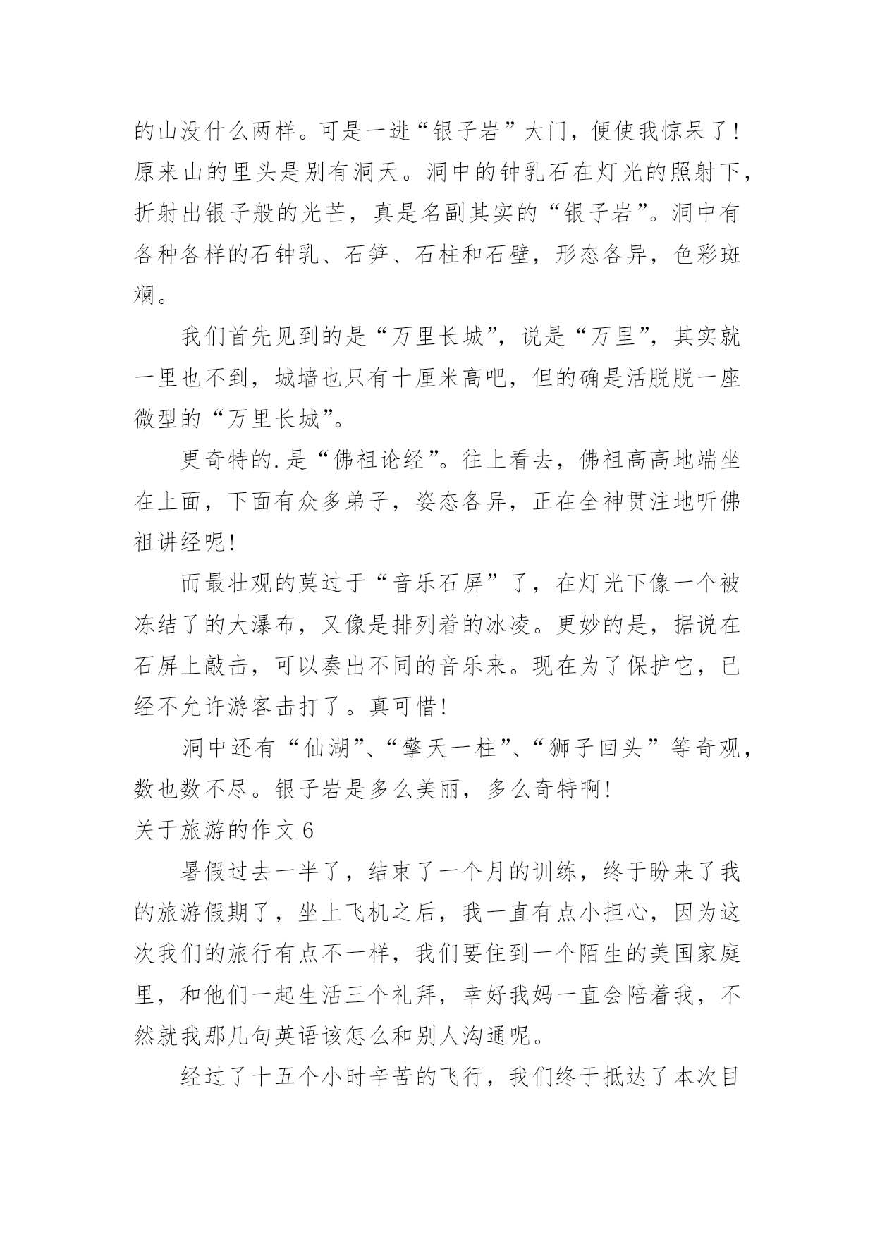旅游的作文关于旅游的作文(共15篇)无论是身处学校还是步入社会,大家都经常看到作文的身影吧,写作文是培养人们的观察力、联想力、想象力、思考力和记忆力的重要手段。写起作文来就毫无头绪?下面是小编精心整理的关于旅游的作文,供大家参考借鉴,希望可以帮助到有需要的朋友。关于旅游的作文1今天我随着老师同学们去滨海乐园了。来到滨海乐园,这里可真大啊!有碰碰车、激流、勇进、摩天轮、丛林飞鼠……摩天轮可是我最爱玩的项目,我迫不及待地让导游哥哥和汪汪姐姐带我们去玩,我和同学来到碰碰车入口,和几个人一起进了去,我选择了一头黄色的车子,把保护带绑好后,我真是既害怕又高兴,铃声一响我就猛踏加速板,“嗖”的一下车开始前进了,我看到别的人六神无主,把手打着方向盘转,我朝小明开去,一阵巨响声,我把小明碰的吓了一跳,他似已掌好了驾驶技术,向我撞来,我来了一个急转弯才避开了他的攻*,在碰碰车房里,大家撞来撞去,有些老师也认为好玩,也来玩了,似把教学的疲倦丢了,开始玩起来。脸上也露出了开心的笑容。玩完碰碰车,我们又来到丛林飞鼠,光看滑行车轨道,就让人告别刺激,我们坐上车后,车就一辆接着一辆,我们坐在第一辆车,开始前进了,一开始是一个五六十度的上坡,随后是一个弯道,弯道过去一个大下坡又是一个拐弯,差点没把我甩出去,把我的头都给搞晕了。最惊险的是滑行车一直在往下沉,突然一拐弯-----这个弯道可不是一般的弯道,而是整个车都笔直地过去,如果不开快的话准会翻车,真险吧!还有好多好玩的,可是由于时间的'问题我们也没有去玩了,只有依依不舍的离开了乐园。今天我真的好开心,玩的非常愉快。也许晚上做梦我还在摩天伦上呢?呵呵……关于旅游的作文2今天,我6:30左右起床,我和妈妈、两个大妈妈、堂弟全家和堂弟班级的同学、一个六年级、一个高中毕业、一个初中。在绍兴大酒店一起乘着大巴去杭州机场。“到了!”我喜悦地说。妈妈说:“给我塑料袋。”我连忙从我的小背包里拿出一个塑料袋,妈妈马上在塑料袋里呕吐。机场买完票,去等候飞机,9:00、9:30、10:00,终于听到叮咚,从杭州乘到大连的飞机已到,请带好所有物品,谢谢。我们小朋友高兴地不得了。乘上飞机,过了半小时左右飞机起飞。到机场时已经要吃午饭了。走到门口,导游拿着一个绅绿棋,跟着她一起去吃午饭,吃完了去著名的`地方玩。玩了2天,坐轮船去威海,在轮船上,睡了一个哆晚上,早上5:00到了威海,去了海边,2天。乘大巴去青岛,玩了2天,其中一个下午去青岛啤酒,走进去了,到最后一个地方,那就是喝啤酒,有一个小孩子喝了5大杯,脸像个小苹果,后来睡着了。最后一个晚上乘飞机回家了。旅游,真好玩!关于旅游的作文3大年初三到初六,我爸我妈带着我跨过雄伟的舟山跨海大桥和杭州湾跨海大桥,来到了美丽的大都市——上海。上海比我们舟山大多了,到处都是高楼林立,汽车川流不息,人来人往,让人看看都会眼花缭乱,真不愧是一座现代化的国际大都市。我们游览的第一站就是上海最著名的.景点——东方明珠电视塔。站在浦东和浦西的很多地方,一抬头就能仰望到它,真高啊!明珠塔有三个巨大无比的球串成,就像一串冰糖葫芦。夜晚,球体红光闪闪,犹如一颗颗巨大的红宝石晶莹夺目。走进东方明珠塔,哇!大厅真大呀,人真多呀,大家都非常有耐心,有秩序地排着队,我们也加入到人流中,经过将近二个小时的排队等待,终于乘上特快速电梯,来到了350米的太空舱,放眼望去,黄浦江两岸的美景尽收眼底,整个大上海就在我们脚下,马路上灯火通明,就像是光的海洋。黄浦江上亮晶晶的观光船在慢悠悠地行驶着,就像蜗牛在爬行,让我大饱眼福。参观完太空舱,我们又分别下到263米、90米的大球体观光,尽情地饱览了大上海的美景。啊,东方明珠塔,真不愧为亚州第一塔啊!祝愿这颗”明珠”更加璀璨。关于旅游的作文4喇叭滴滴,上车了。我和妹妹抢上车找座位,妈妈和小姑拿行李,爸爸和姑夫换着开车,哦我们快乐的一日游出发了在路上我和妹妹高兴的唱呀!看呀!看见树儿和我们赛跑,草儿对我们微笑。不知不觉我们笑着讲着几个小时过去。日照到了,爸爸把车子开进了停车场找了一家宾馆,我把妈妈给我买的游衣换上挎着游圈大步大步的向海边走去,看到那一边无际的大海我兴奋极了。我拉着妹妹的手,光着脚丫走在沙滩上,看着蔚蓝的大海,微微的海风吹在脸上。沙滩上有好多好多的人,妈妈拉着我们的手慢慢的淌着海水一小步一小步的.往前走,当浪花打到我的大腿上,我就不敢再走了,对妈妈说我怕,妈妈说:宝贝没事的,爸爸妈妈在你身边保护你,你看妹妹都不害怕。我看了妹妹一眼,心想妹妹都不怕我也不怕。我和妹妹在海里泼水玩,妹妹把水泼到我脸上,我用舌头舔了一下海水是咸的我和妹妹笑呀!跳呀!玩的可高兴了。过了一会妈妈叫我们上去冲冲澡,换件漂亮的衣服吃饭去喽!日照一日游结束了!关于旅游的作文5人们常说:“桂林山水甲天下