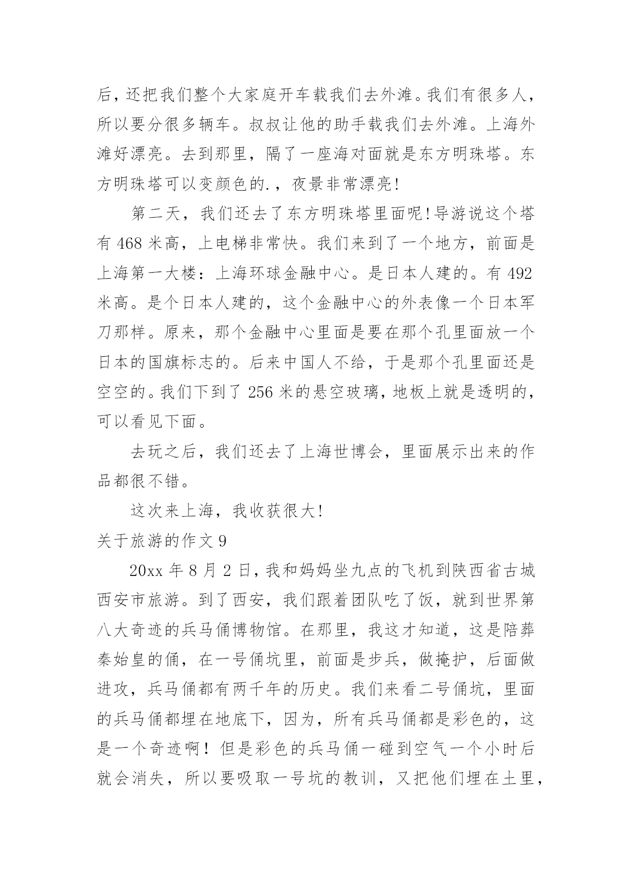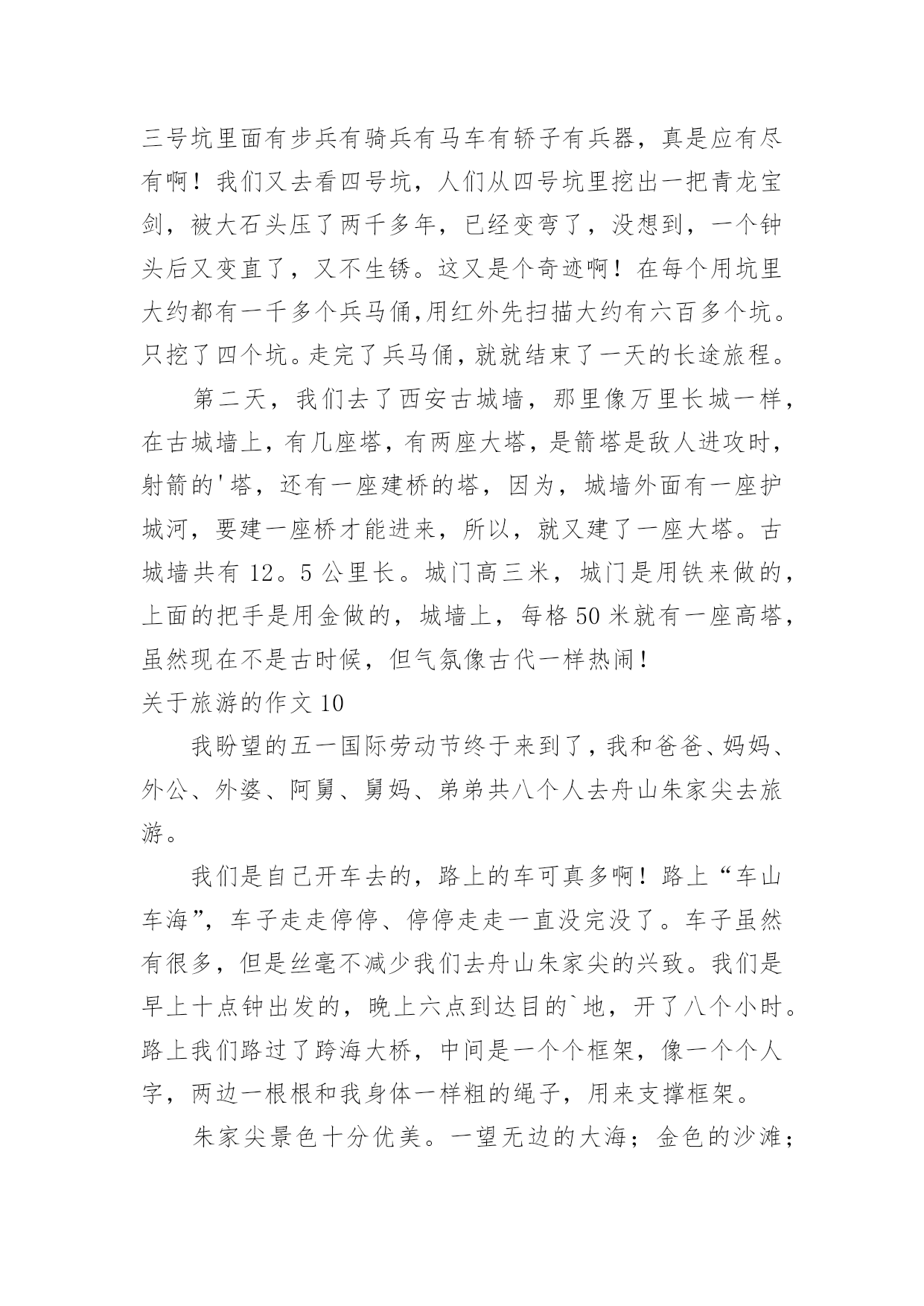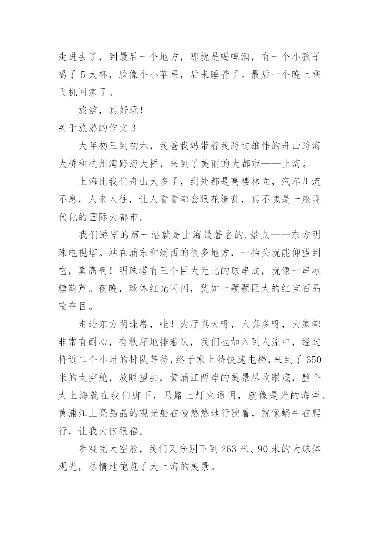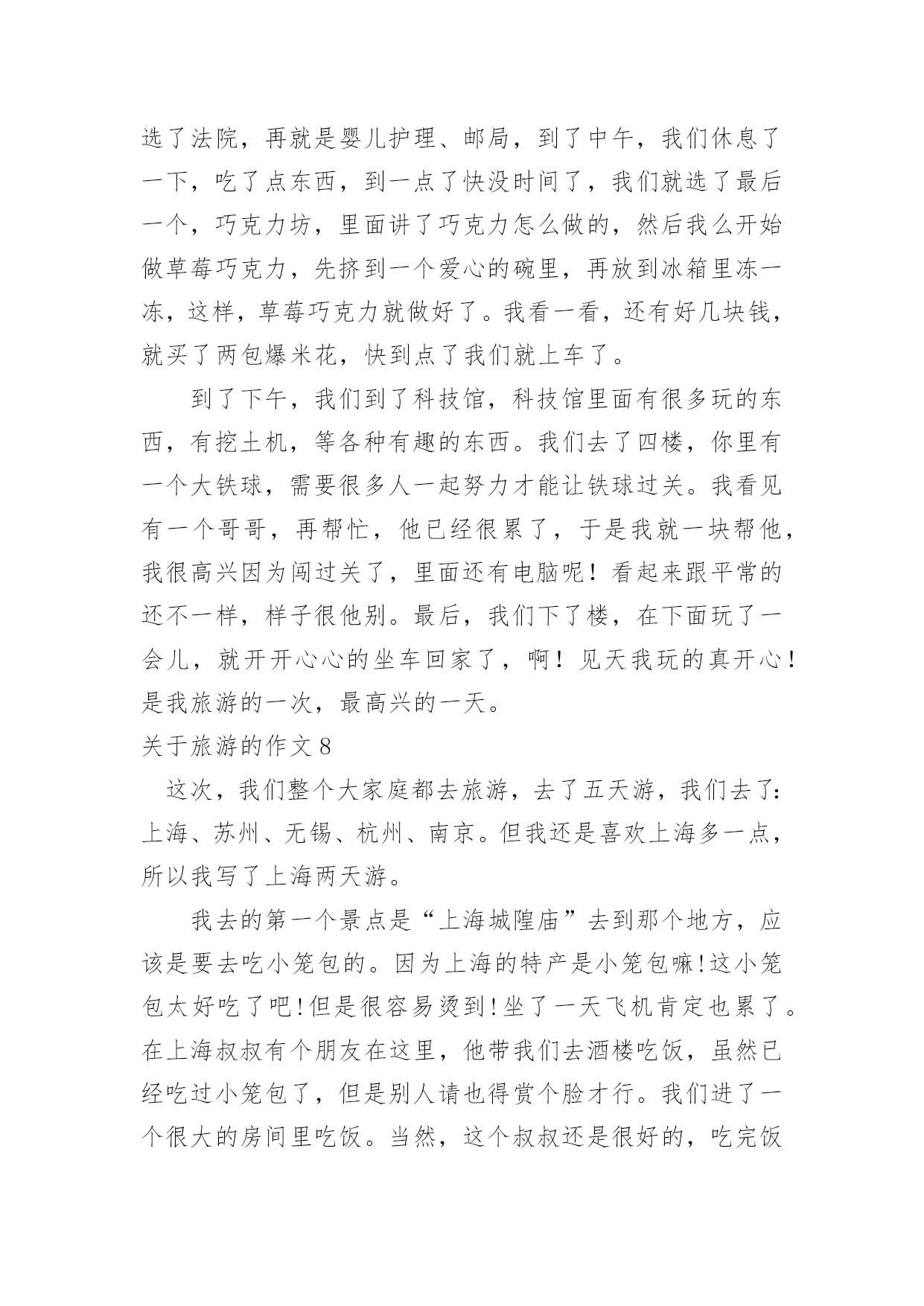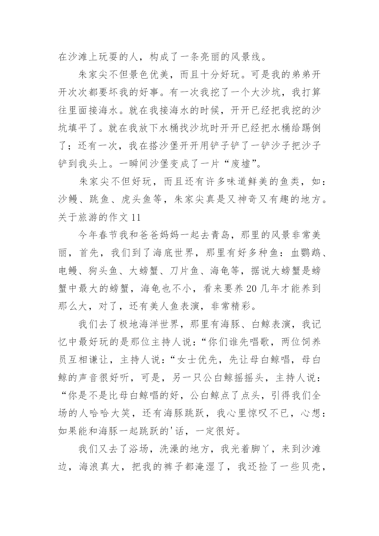 旅游的作文关于旅游的作文(共15篇)无论是身处学校还是步入社会,大家都经常看到作文的身影吧,写作文是培养人们的观察力、联想力、想象力、思考力和记忆力的重要手段。写起作文来就毫无头绪?下面是小编精心整理的关于旅游的作文,供大家参考借鉴,希望可以帮助到有需要的朋友。关于旅游的作文1今天我随着老师同学们去滨海乐园了。来到滨海乐园,这里可真大啊!有碰碰车、激流、勇进、摩天轮、丛林飞鼠……摩天轮可是我最爱玩的项目,我迫不及待地让导游哥哥和汪汪姐姐带我们去玩,我和同学来到碰碰车入口,和几个人一起进了去,我选择了一头黄色的车子,把保护带绑好后,我真是既害怕又高兴,铃声一响我就猛踏加速板,“嗖”的一下车开始前进了,我看到别的人六神无主,把手打着方向盘转,我朝小明开去,一阵巨响声,我把小明碰的吓了一跳,他似已掌好了驾驶技术,向我撞来,我来了一个急转弯才避开了他的攻*,在碰碰车房里,大家撞来撞去,有些老师也认为好玩,也来玩了,似把教学的疲倦丢了,开始玩起来。脸上也露出了开心的笑容。玩完碰碰车,我们又来到丛林飞鼠,光看滑行车轨道,就让人告别刺激,我们坐上车后,车就一辆接着一辆,我们坐在第一辆车,开始前进了,一开始是一个五六十度的上坡,随后是一个弯道,弯道过去一个大下坡又是一个拐弯,差点没把我甩出去,把我的头都给搞晕了。最惊险的是滑行车一直在往下沉,突然一拐弯-----这个弯道可不是一般的弯道,而是整个车都笔直地过去,如果不开快的话准会翻车,真险吧!还有好多好玩的,可是由于时间的'问题我们也没有去玩了,只有依依不舍的离开了乐园。今天我真的好开心,玩的非常愉快。也许晚上做梦我还在摩天伦上呢?呵呵……关于旅游的作文2今天,我6:30左右起床,我和妈妈、两个大妈妈、堂弟全家和堂弟班级的同学、一个六年级、一个高中毕业、一个初中。在绍兴大酒店一起乘着大巴去杭州机场。“到了!”我喜悦地说。妈妈说:“给我塑料袋。”我连忙从我的小背包里拿出一个塑料袋,妈妈马上在塑料袋里呕吐。机场买完票,去等候飞机,9:00、9:30、10:00,终于听到叮咚,从杭州乘到大连的飞机已到,请带好所有物品,谢谢。我们小朋友高兴地不得了。乘上飞机,过了半小时左右飞机起飞。到机场时已经要吃午饭了。走到门口,导游拿着一个绅绿棋,跟着她一起去吃午饭,吃完了去著名的`地方玩。玩了2天,坐轮船去威海,在轮船上,睡了一个哆晚上,早上5:00到了威海,去了海边,2天。乘大巴去青岛,玩了2天,其中一个下午去青岛啤酒,走进去了,到最后一个地方,那就是喝啤酒,有一个小孩子喝了5大杯,脸像个小苹果,后来睡着了。最后一个晚上乘飞机回家了。旅游,真好玩!关于旅游的作文3大年初三到初六,我爸我妈带着我跨过雄伟的舟山跨海大桥和杭州湾跨海大桥,来到了美丽的大都市——上海。上海比我们舟山大多了,到处都是高楼林立,汽车川流不息,人来人往,让人看看都会眼花缭乱,真不愧是一座现代化的国际大都市。我们游览的第一站就是上海最著名的.景点——东方明珠电视塔。站在浦东和浦西的很多地方,一抬头就能仰望到它,真高啊!明珠塔有三个巨大无比的球串成,就像一串冰糖葫芦。夜晚,球体红光闪闪,犹如一颗颗巨大的红宝石晶莹夺目。走进东方明珠塔,哇!大厅真大呀,人真多呀,大家都非常有耐心,有秩序地排着队,我们也加入到人流中,经过将近二个小时的排队等待,终于乘上特快速电梯,来到了350米的太空舱,放眼望去,黄浦江两岸的美景尽收眼底,整个大上海就在我们脚下,马路上灯火通明,就像是光的海洋。黄浦江上亮晶晶的观光船在慢悠悠地行驶着,就像蜗牛在爬行,让我大饱眼福。参观完太空舱,我们又分别下到263米、90米的大球体观光,尽情地饱览了大上海的美景。啊,东方明珠塔,真不愧为亚州第一塔啊!祝愿这颗”明珠”更加璀璨。关于旅游的作文4喇叭滴滴,上车了。我和妹妹抢上车找座位,妈妈和小姑拿行李,爸爸和姑夫换着开车,哦我们快乐的一日游出发了在路上我和妹妹高兴的唱呀!看呀!看见树儿和我们赛跑,草儿对我们微笑。不知不觉我们笑着讲着几个小时过去。日照到了,爸爸把车子开进了停车场找了一家宾馆,我把妈妈给我买的游衣换上挎着游圈大步大步的向海边走去,看到那一边无际的大海我兴奋极了。我拉着妹妹的手,光着脚丫走在沙滩上,看着蔚蓝的大海,微微的海风吹在脸上。沙滩上有好多好多的人,妈妈拉着我们的手慢慢的淌着海水一小步一小步的.往前走,当浪花打到我的大腿上,我就不敢再走了,对妈妈说我怕,妈妈说:宝贝没事的,爸爸妈妈在你身边保护你,你看妹妹都不害怕。我看了妹妹一眼,心想妹妹都不怕我也不怕。我和妹妹在海里泼水玩,妹妹把水泼到我脸上,我用舌头舔了一下海水是咸的我和妹妹笑呀!跳呀!玩的可高兴了。过了一会妈妈叫我们上去冲冲澡,换件漂亮的衣服吃饭去喽!日照一日游结束了!关于旅游的作文5人们常说:“桂林山水甲天下