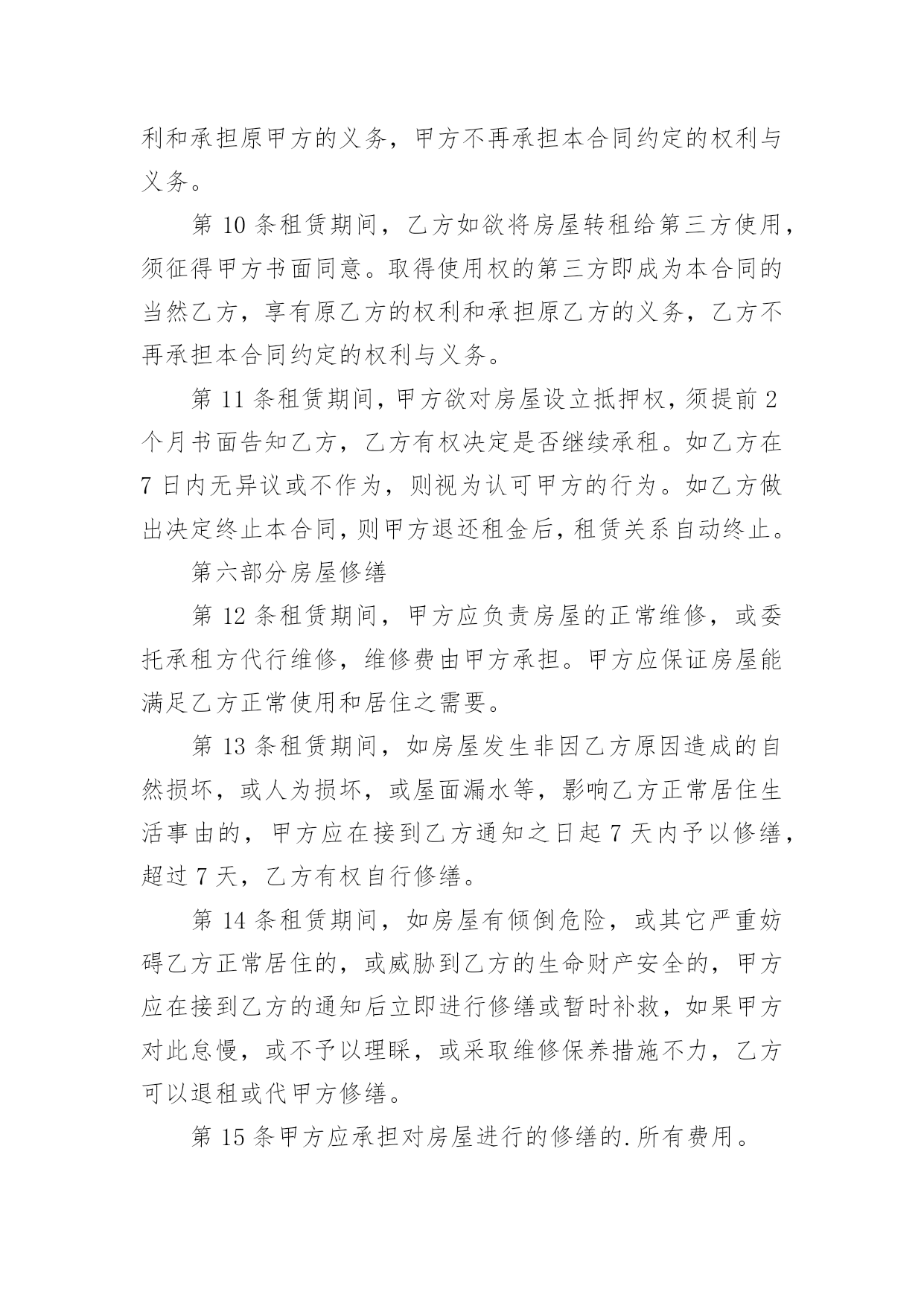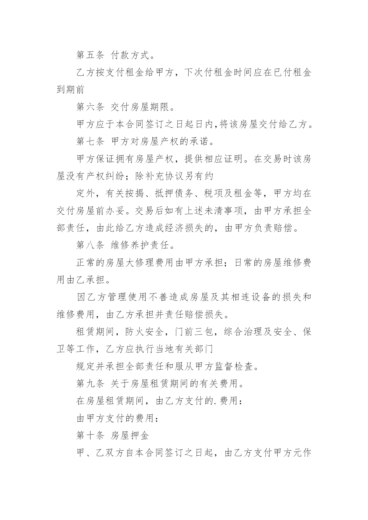 房屋租赁合同房屋租赁合同随着时间的推移,合同的用途越来越广泛,签订合同能平衡双方当事人的平等地位。那么相关的合同到底怎么写呢?以下是小编精心整理的房屋租赁合同,欢迎大家借鉴与参考,希望对大家有所帮助。房屋租赁合同1出租方(以下简称甲方):承租方(以下简称乙方):甲、乙双方就下列房屋的租赁达成如下协议:第一条房屋基本情况。甲方房屋(以下简称该房屋)坐落于房屋面积为;第层共层;出租包含附属建筑物.第二条房屋用途。该房屋用途为.除双方另有约定外,乙方不得任意改变房屋用途。第三条租赁期限。租赁期限自第四条租金。该房屋月租金为(人民币大写)整。租赁期间,出租方不得以任何理由任意调整租金。第五条付款方式。乙方按支付租金给甲方,下次付租金时间应在已付租金到期前第六条交付房屋期限。甲方应于本合同签订之日起日内,将该房屋交付给乙方。第七条甲方对房屋产权的承诺。甲方保证拥有房屋产权,提供相应证明。在交易时该房屋没有产权纠纷;除补充协议另有约定外,有关按揭、抵押债务、税项及租金等,甲方均在交付房屋前办妥。交易后如有上述未清事项,由甲方承担全部责任,由此给乙方造成经济损失的,由甲方负责赔偿。第八条维修养护责任。正常的房屋大修理费用由甲方承担;日常的房屋维修费用由乙承担。因乙方管理使用不善造成房屋及其相连设备的损失和维修费用,由乙方承担并责任赔偿损失。租赁期间,防火安全,门前三包,综合治理及安全、保卫等工作,乙方应执行当地有关部门规定并承担全部责任和服从甲方监督检查。第九条关于房屋租赁期间的有关费用。在房屋租赁期间,由乙方支付的.费用:由甲方支付的费用:第十条房屋押金甲、乙双方自本合同签订之日起,由乙方支付甲方元作为押金。第十一条租赁期满。1、租赁期满后,如乙方要求继续租赁,甲方则优先同意继续租赁;2、租赁期满后,如甲方未明确表示不续租的,则视为同意乙方继续承租;第十二条违约责任。租赁期间双方必须信守合同,任何一方违反本合同的规定,按年度须向对方交纳一个月租金作为违约金。第十三条因不可抗力原因导致该房屋毁损和造成损失的,双方互不承担责任。第十四条本合同未尽事项,由甲、乙双方另行议定,并签订补充协议。补充协议与本合同不一致的,以补充协议为准。第十五条本合同之附件均为本合同不可分割之一部分。本合同及其附件内,空格部分填写的文字与印刷文字具有同等效力。本合同及其附件和补充协议中未规定的事项,均遵照中华人民共和国有关法律、法规和政策执行。第十六条其他约定(一)出租方为已提供物品见附件(二)当前的水、电等表状况:(1)水表现为:度;(2)电表现为:度;(3)煤气表现为:度。(三)附加第十七条本合同在履行中发生争议,由甲、乙双方协商解决。协商不成时,甲乙双方可向人民法院起诉。第十八条本合同自甲、乙双方签字之日起生效,一式两份,甲、乙双方各执一份,具有同等效力。甲方(签章):_____乙方(签章):_____身份证号:身份证号码:电话:电话:账号:___年___月___日___年___月___日合同附件:家私电器清单出租房价中包括以下物品:甲方签署:乙方签署:房屋租赁合同2出租人:_________________承租人:_________________证件编号:_______________________联系地址:_______________________联系电话:_______________________房屋坐落:_______________________依据《中华人民共和国合同法》及有关法律、法规的规定,甲乙双方在平等、自愿的基础上,就房屋租赁的有关事宜达成协议如下:第一条租赁期限房屋租赁期自_________年_________月_________日至_________年_________月_________日,共计_________年_________个月。甲方应于_________年_________月_________日前将房屋按约定条件交付给乙方。房经甲乙双方交验签字盖章并移交房门钥匙及后视为交付完成。租赁期满或合同解除后,甲方有权收回房屋,乙方应按照原状返还房屋及其附属物品、设备设施。甲乙双方应对房屋和附属物品、设备设施及水电使用等情况进行验收人力资源派遣公司,结清各自应当承担的费用。乙方继续承租的,应提前日向甲方提出续租要求,协商一致后双方重新签订房屋租赁合同。第二条租金及押金租金标准及支付方式:,房屋押金待合同期满或特殊情况导致的.合同结束,乙方退租后返还。支付方式:现金_____,每月日前支付。第三条房屋维护及维修甲方应保证房屋的建筑结构和设备设施符合建筑、消防、治安、卫生等方面的安全条件,不得危及人身安全;承租人保证遵守国家、的法律法规规定以及房屋所在小区的物业管理规约。租赁期内,甲乙双方应共同保障房屋及其附属物品、设