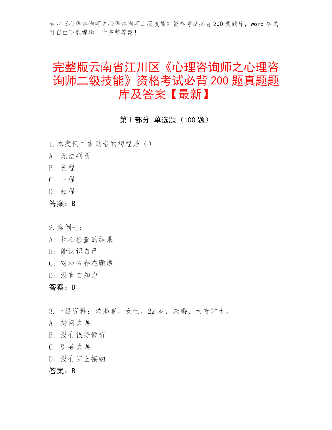 完整版云南省江川区《心理咨询师之心理咨询师二级技能》资格考试必背200题真题题库及答案【最新】