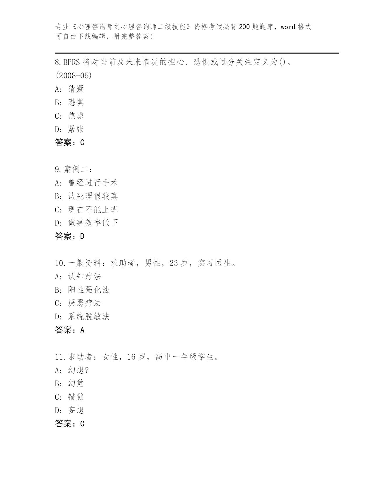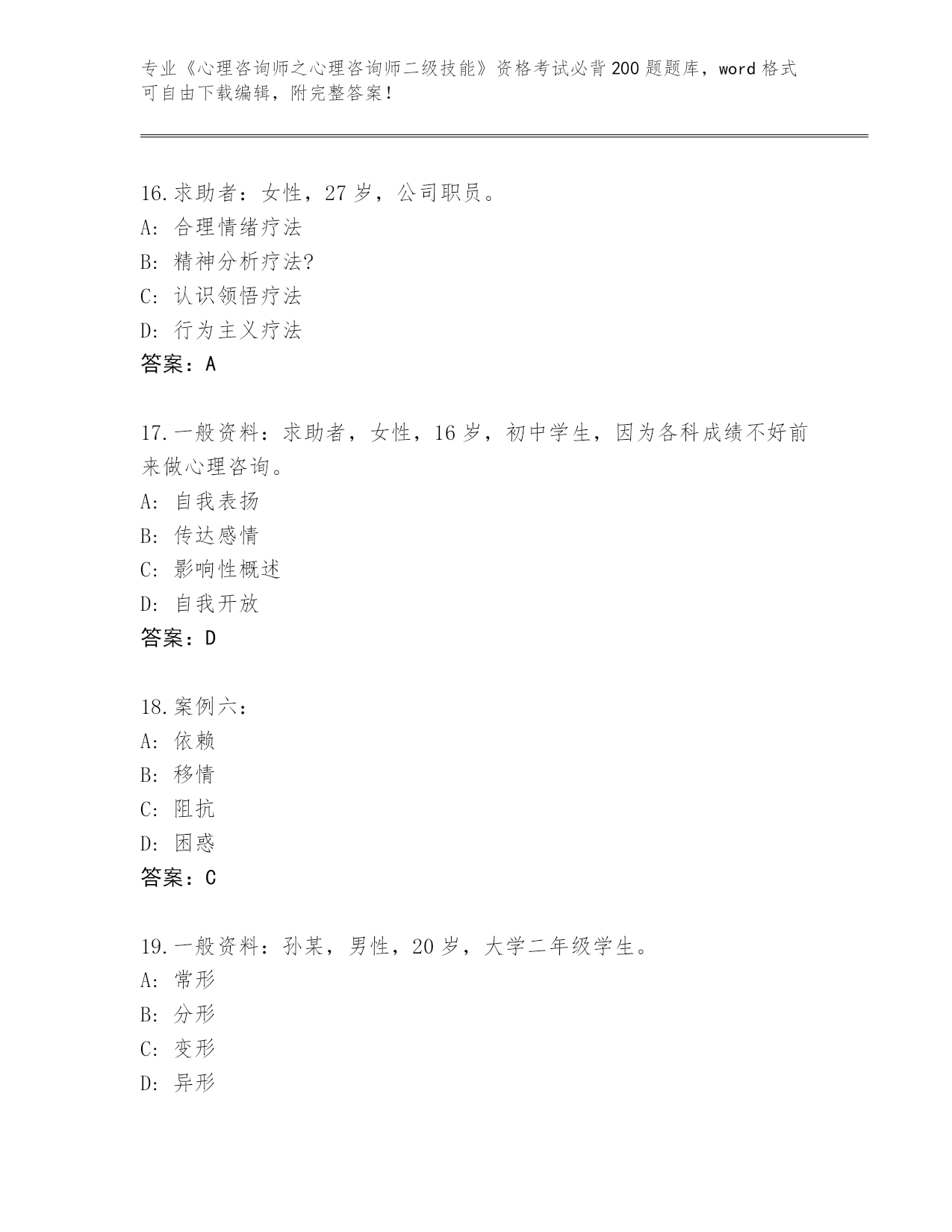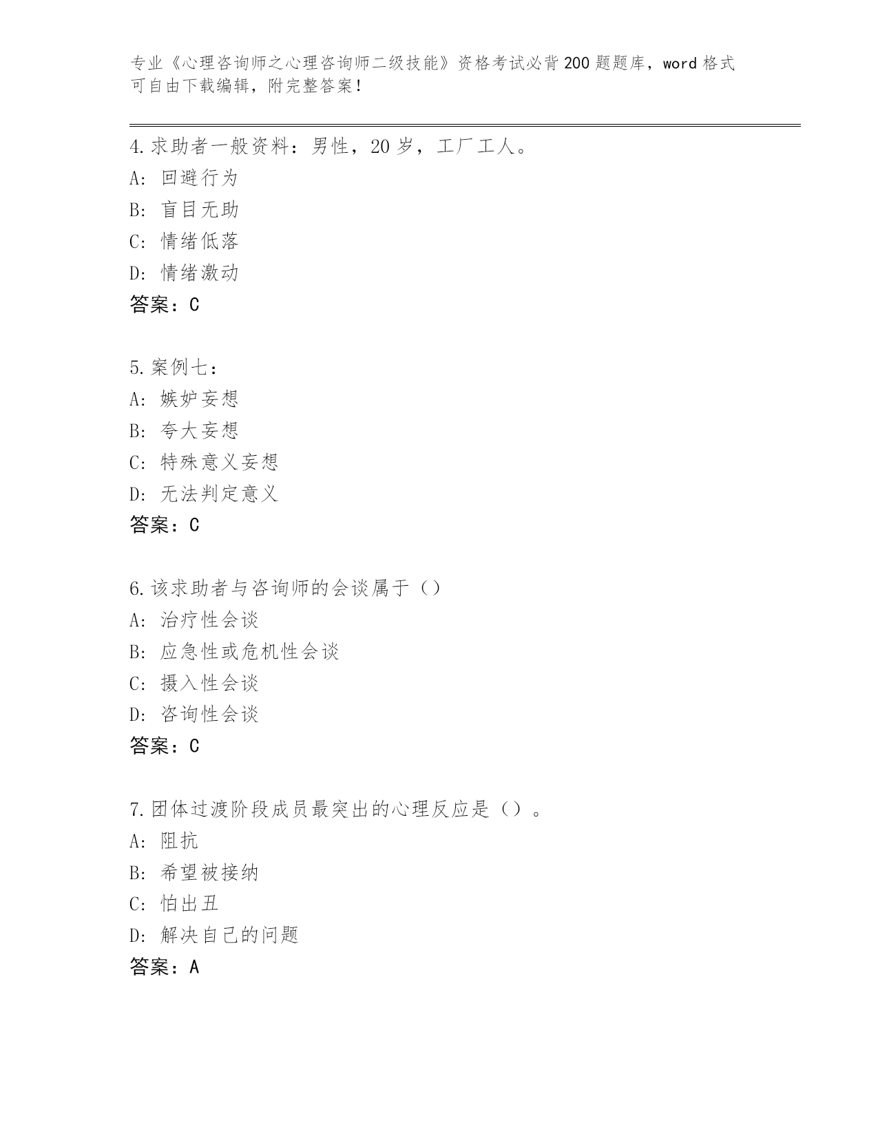 云南省永德县完整版《心理咨询师之心理咨询师二级技能》资格考试必背200题真题题库及答案
