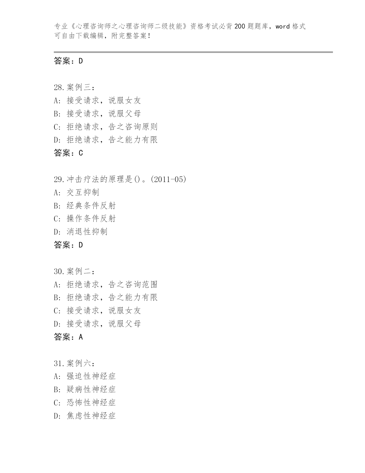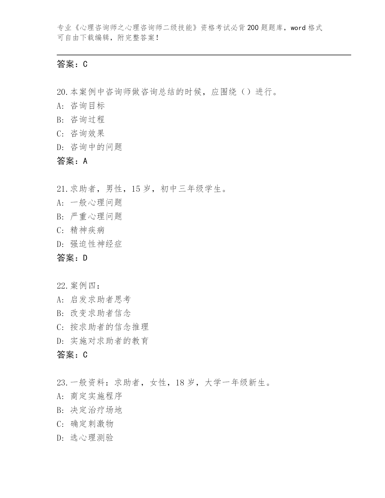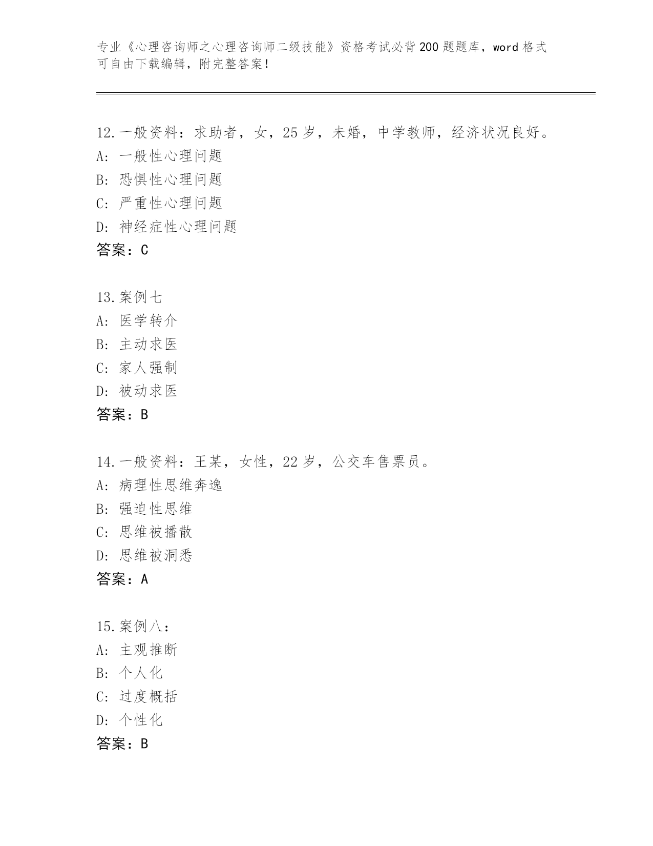 云南省永德县完整版《心理咨询师之心理咨询师二级技能》资格考试必背200题真题题库及答案
