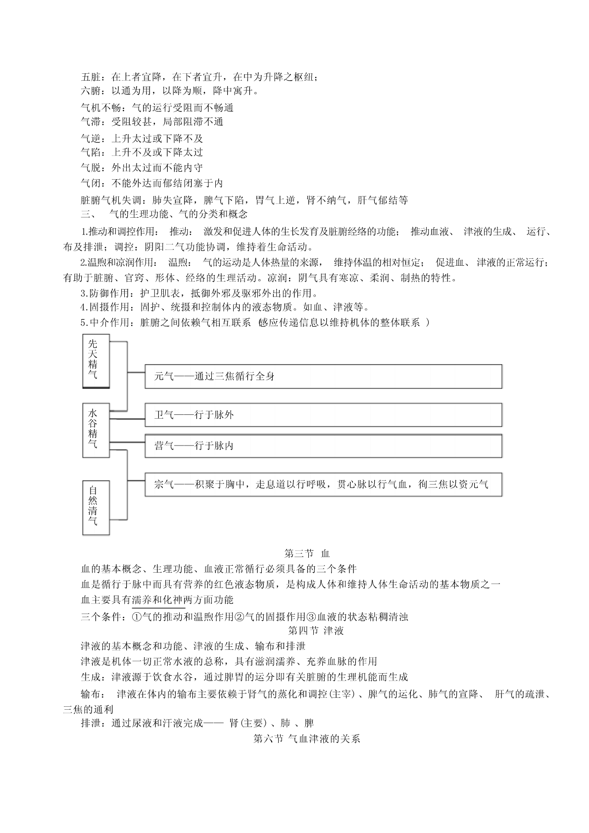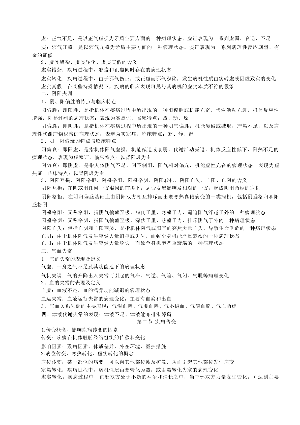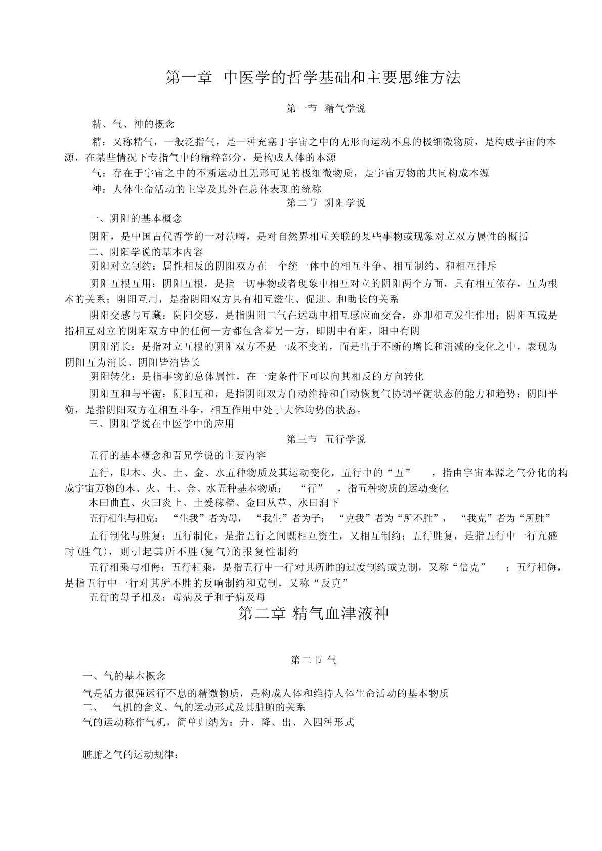 《中医基础理论》复习提纲绪论中医学和中医基础理论的基本概念中医学是发祥于中国古代的研究人体生命、健康、疾病的科学。中医基础理论是关于中医学的基础理论、基本知识和基本思维方法的学科,也是阐述和介绍中医学的基本理论、基本知识和基本思维方法的课程一、中医基础理论的体系的形成和发展(历代名医和代表著作)(一)先秦、秦、秦汉时期——形成时期《黄帝内经》、《难经》、《伤寒杂病论》、《神农本草经》(二)隋唐时期——充实、系统化时期《针灸甲乙经》、《脉经》、《诸病源候论》(三)宋、金、元时期——争鸣、突破时期《三因记忆病证方论》宋陈无择“三因学说”、《小儿药证直诀》刘完素(刘河间)——寒凉派张从正(张子河)——攻邪派金元四大家李杲(东垣老人)——补土派朱震亨(朱丹溪)——滋阴派(四)明清时期——集大成时期温病四大家:叶桂(叶天士)、薛雪(薛生白)、吴瑭(吴鞠通)、王士雄另有吴有性著《瘟疫论》创“戾气说”二、中医理论体系的主要特点——整体观念、辨证论治(一)整体观念——人体自身的整体性和人与自然、社会环境的统一性两个方面(二)辨证论治——辨析疾病资料以确立症候,论证其治则治法方药并付诸实施的思维和实践过程1、病、症、证的概念病:即疾病,是致病邪气作用于人体,人体正气与之抗争而引起的机体阴阳失调、脏腑功能损伤、生理机能失常或心理活动障碍的一个完整生命过程(重点在全过程)症:即症状和体征的总称,是疾病过程中表现出的个别、孤立的现象可以是病人异常的主观感觉或行为表现,也可以是医生检查病人时发现的异常征象(是病和证的基本要素)证:即证候,是疾病过程中某一阶段或某一类型的病理概括,一般由一组相对固定的有内在联系的、能揭示疾病某一阶段或某一类型病变本质的症状和体征构成(重点在现阶段)2、辩证与辨病辩证与辨病都是认识疾病的思维过程。辩证是对证候的辨析,以确定证候为目的;辨病是对疾病的辨析,以确定疾病的诊断为目的。辨明疾病的病因、病位、病性、病势,即辨明疾病从发展到转归的总体病机辨病论治:辨析疾病资料以确立疾病的诊断,论证其治则治法方药并付诸实施的思维和实践过程同病异治:同一种疾病,由于发病时间、地域不同或所处的疾病阶段或类型不同,或病人的体质不同,故反映的证候也不同,因而治疗也就有差异异病同治:几种不同的疾病,在其发展过程中出现了大致相同的病机,大致相同的证,故可用大致相同的治法和方药来治疗第一章中医学的哲学基础和主要思维方法第一节精气学说精、气、神的概念精:又称精气,一般泛指气,是一种充塞于宇宙之中的无形而运动不息的极细微物质,是构成宇宙的本源,在某些情况下专指气中的精粹部分,是构成人体的本源气:存在于宇宙之中的不断运动且无形可见的极细微物质,是宇宙万物的共同构成本源神:人体生命活动的主宰及其外在总体表现的统称第二节阴阳学说一、阴阳的基本概念阴阳,是中国古代哲学的一对范畴,是对自然界相互关联的某些事物或现象对立双方属性的概括二、阴阳学说的基本内容阴阳对立制约:属性相反的阴阳双方在一个统一体中的相互斗争、相互制约、和相互排斥阴阳互根互用:阴阳互根,是指一切事物或者现象中相互对立的阴阳两个方面,具有相互依存,互为根本的关系;阴阳互用,是指阴阳双方具有相互滋生、促进、和助长的关系阴阳交感与互藏:阴阳交感,是指阴阳二气在运动中相互感应而交合,亦即相互发生作用;阴阳互藏是指相互对立的阴阳双方中的任何一方都包含着另一方,即阴中有阳,阳中有阴阴阳消长:是指对立互根的阴阳双方不是一成不变的,而是出于不断的增长和消减的变化之中,表现为阴阳互为消长、阴阳皆消皆长阴阳转化:是指事物的总体属性,在一定条件下可以向其相反的方向转化阴阳互和与平衡:阴阳互和,是指阴阳双方自动维持和自动恢复气协调平衡状态的能力和趋势;阴阳平衡,是指阴阳双方在相互斗争,相互作用中处于大体均势的状态。三、阴阳学说在中医学中的应用第三节五行学说五行的基本概念和吾兄学说的主要内容五行,即木、火、土、金、水五种物质及其运动变化。五行中的“五”,指由宇宙本源之气分化的构成宇宙万物的木、火、土、金、水五种基本物质;“行”,指五种物质的运动变化木曰曲直、火曰炎上、土爰稼穑、金曰从革、水曰润下五行相生与相克:“生我”者为母,“我生”者为子;“克我”者为“所不胜”,“我克”者为“所胜”五行制化与胜复:五行制化,是指五行之间既相互资生,又相互制约;五行胜复,是指五行中一行亢盛时(胜气),则引起其所不胜(复气)的报复性制约五行相乘与相侮:五行相乘,是指五行中一行对其所胜的过度制约或克制,又称“倍克”;五行相侮,是指五行中一行对其所不胜的反响制约和克制,又称“反克”五行的母子相及:
