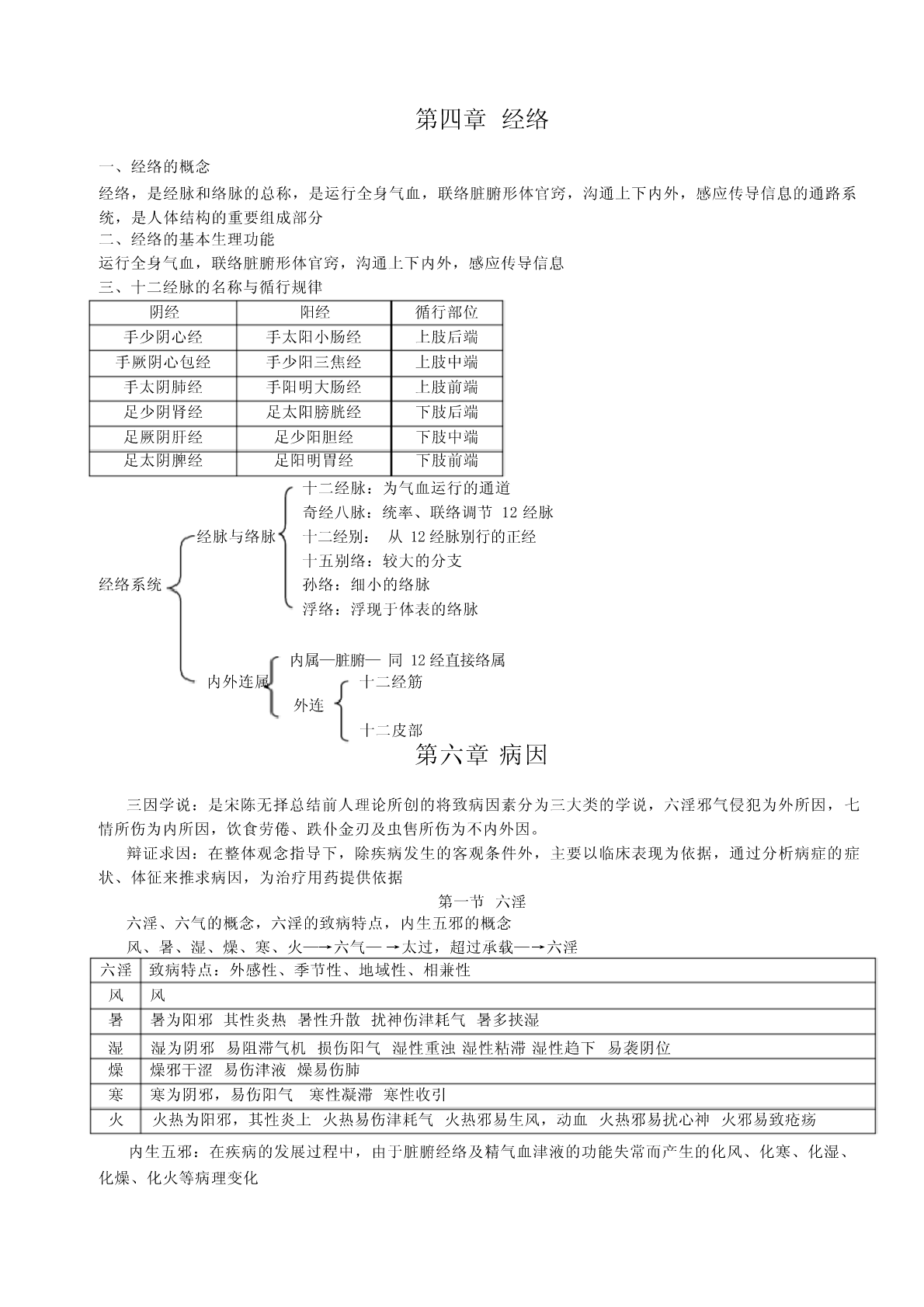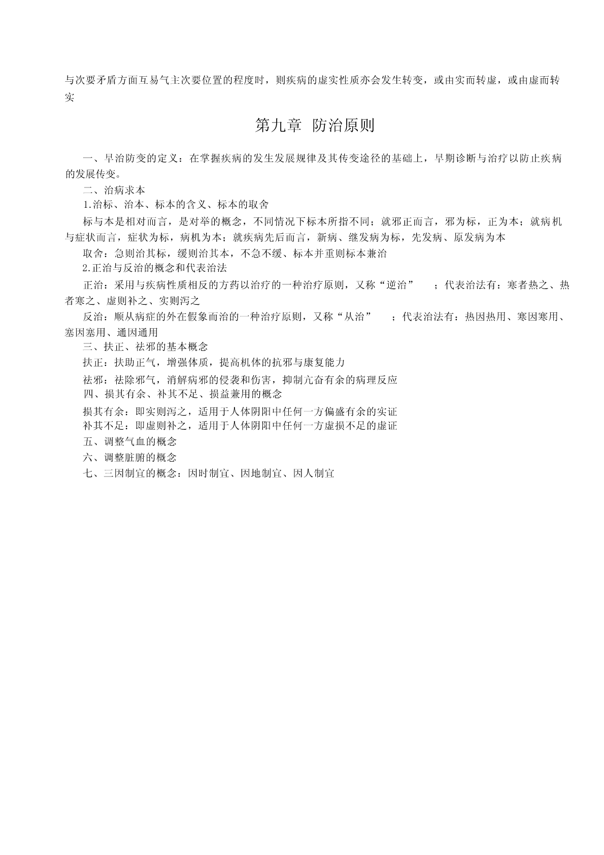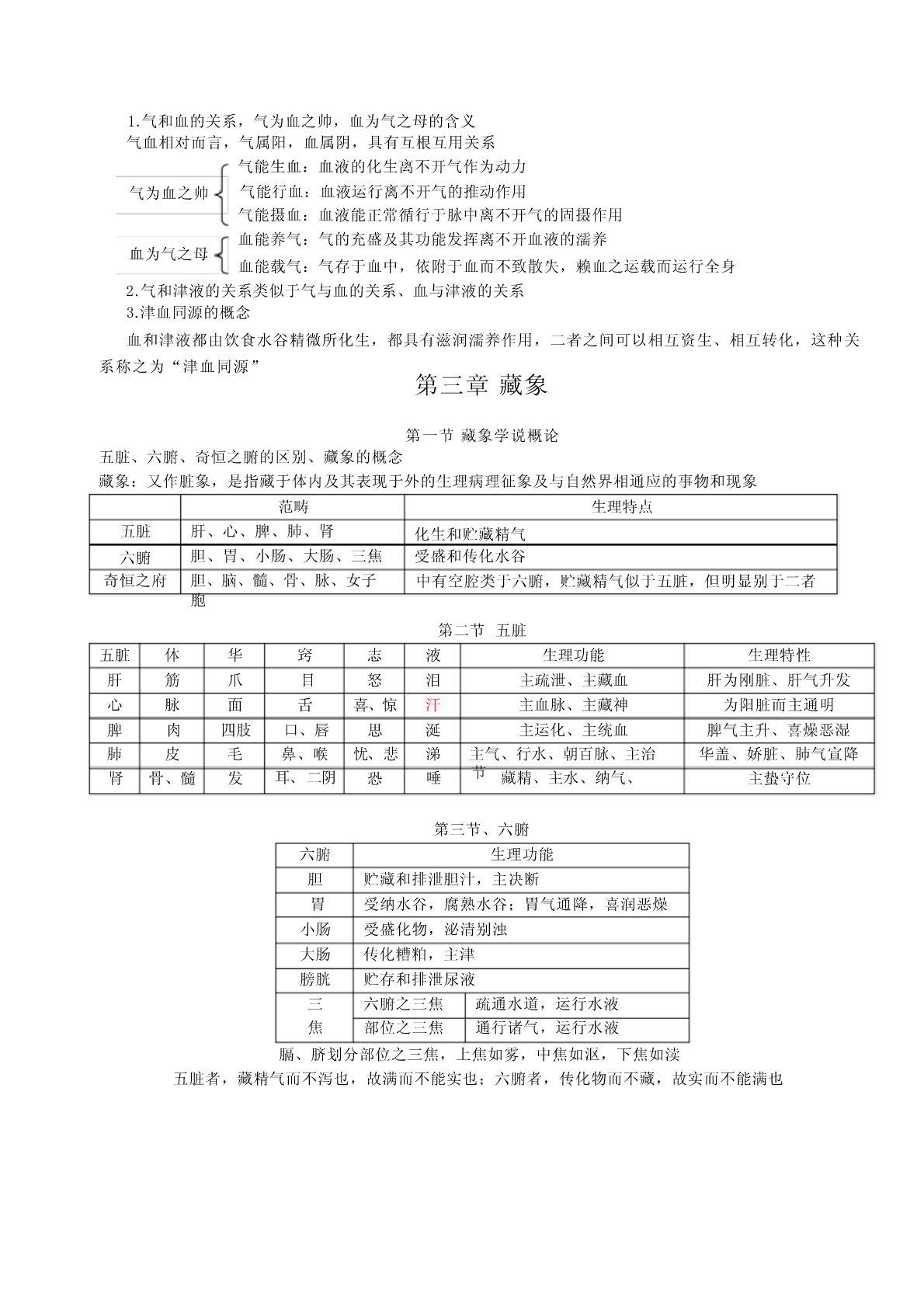 《中医基础理论》复习提纲绪论中医学和中医基础理论的基本概念中医学是发祥于中国古代的研究人体生命、健康、疾病的科学。中医基础理论是关于中医学的基础理论、基本知识和基本思维方法的学科,也是阐述和介绍中医学的基本理论、基本知识和基本思维方法的课程一、中医基础理论的体系的形成和发展(历代名医和代表著作)(一)先秦、秦、秦汉时期——形成时期《黄帝内经》、《难经》、《伤寒杂病论》、《神农本草经》(二)隋唐时期——充实、系统化时期《针灸甲乙经》、《脉经》、《诸病源候论》(三)宋、金、元时期——争鸣、突破时期《三因记忆病证方论》宋陈无择“三因学说”、《小儿药证直诀》刘完素(刘河间)——寒凉派张从正(张子河)——攻邪派金元四大家李杲(东垣老人)——补土派朱震亨(朱丹溪)——滋阴派(四)明清时期——集大成时期温病四大家:叶桂(叶天士)、薛雪(薛生白)、吴瑭(吴鞠通)、王士雄另有吴有性著《瘟疫论》创“戾气说”二、中医理论体系的主要特点——整体观念、辨证论治(一)整体观念——人体自身的整体性和人与自然、社会环境的统一性两个方面(二)辨证论治——辨析疾病资料以确立症候,论证其治则治法方药并付诸实施的思维和实践过程1、病、症、证的概念病:即疾病,是致病邪气作用于人体,人体正气与之抗争而引起的机体阴阳失调、脏腑功能损伤、生理机能失常或心理活动障碍的一个完整生命过程(重点在全过程)症:即症状和体征的总称,是疾病过程中表现出的个别、孤立的现象可以是病人异常的主观感觉或行为表现,也可以是医生检查病人时发现的异常征象(是病和证的基本要素)证:即证候,是疾病过程中某一阶段或某一类型的病理概括,一般由一组相对固定的有内在联系的、能揭示疾病某一阶段或某一类型病变本质的症状和体征构成(重点在现阶段)2、辩证与辨病辩证与辨病都是认识疾病的思维过程。辩证是对证候的辨析,以确定证候为目的;辨病是对疾病的辨析,以确定疾病的诊断为目的。辨明疾病的病因、病位、病性、病势,即辨明疾病从发展到转归的总体病机辨病论治:辨析疾病资料以确立疾病的诊断,论证其治则治法方药并付诸实施的思维和实践过程同病异治:同一种疾病,由于发病时间、地域不同或所处的疾病阶段或类型不同,或病人的体质不同,故反映的证候也不同,因而治疗也就有差异异病同治:几种不同的疾病,在其发展过程中出现了大致相同的病机,大致相同的证,故可用大致相同的治法和方药来治疗第一章中医学的哲学基础和主要思维方法第一节精气学说精、气、神的概念精:又称精气,一般泛指气,是一种充塞于宇宙之中的无形而运动不息的极细微物质,是构成宇宙的本源,在某些情况下专指气中的精粹部分,是构成人体的本源气:存在于宇宙之中的不断运动且无形可见的极细微物质,是宇宙万物的共同构成本源神:人体生命活动的主宰及其外在总体表现的统称第二节阴阳学说一、阴阳的基本概念阴阳,是中国古代哲学的一对范畴,是对自然界相互关联的某些事物或现象对立双方属性的概括二、阴阳学说的基本内容阴阳对立制约:属性相反的阴阳双方在一个统一体中的相互斗争、相互制约、和相互排斥阴阳互根互用:阴阳互根,是指一切事物或者现象中相互对立的阴阳两个方面,具有相互依存,互为根本的关系;阴阳互用,是指阴阳双方具有相互滋生、促进、和助长的关系阴阳交感与互藏:阴阳交感,是指阴阳二气在运动中相互感应而交合,亦即相互发生作用;阴阳互藏是指相互对立的阴阳双方中的任何一方都包含着另一方,即阴中有阳,阳中有阴阴阳消长:是指对立互根的阴阳双方不是一成不变的,而是出于不断的增长和消减的变化之中,表现为阴阳互为消长、阴阳皆消皆长阴阳转化:是指事物的总体属性,在一定条件下可以向其相反的方向转化阴阳互和与平衡:阴阳互和,是指阴阳双方自动维持和自动恢复气协调平衡状态的能力和趋势;阴阳平衡,是指阴阳双方在相互斗争,相互作用中处于大体均势的状态。三、阴阳学说在中医学中的应用第三节五行学说五行的基本概念和吾兄学说的主要内容五行,即木、火、土、金、水五种物质及其运动变化。五行中的“五”,指由宇宙本源之气分化的构成宇宙万物的木、火、土、金、水五种基本物质;“行”,指五种物质的运动变化木曰曲直、火曰炎上、土爰稼穑、金曰从革、水曰润下五行相生与相克:“生我”者为母,“我生”者为子;“克我”者为“所不胜”,“我克”者为“所胜”五行制化与胜复:五行制化,是指五行之间既相互资生,又相互制约;五行胜复,是指五行中一行亢盛时(胜气),则引起其所不胜(复气)的报复性制约五行相乘与相侮:五行相乘,是指五行中一行对其所胜的过度制约或克制,又称“倍克”;五行相侮,是指五行中一行对其所不胜的反响制约和克制,又称“反克”五行的母子相及: